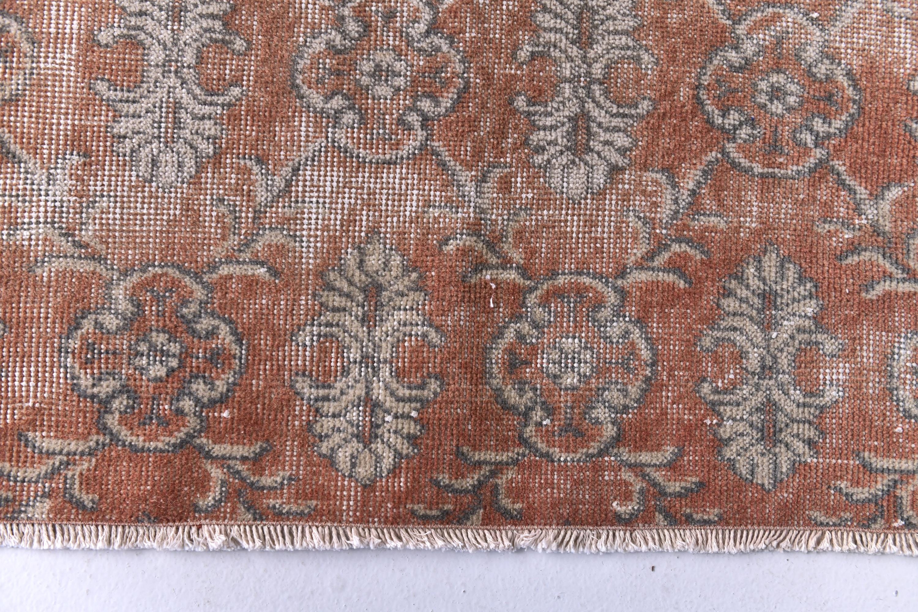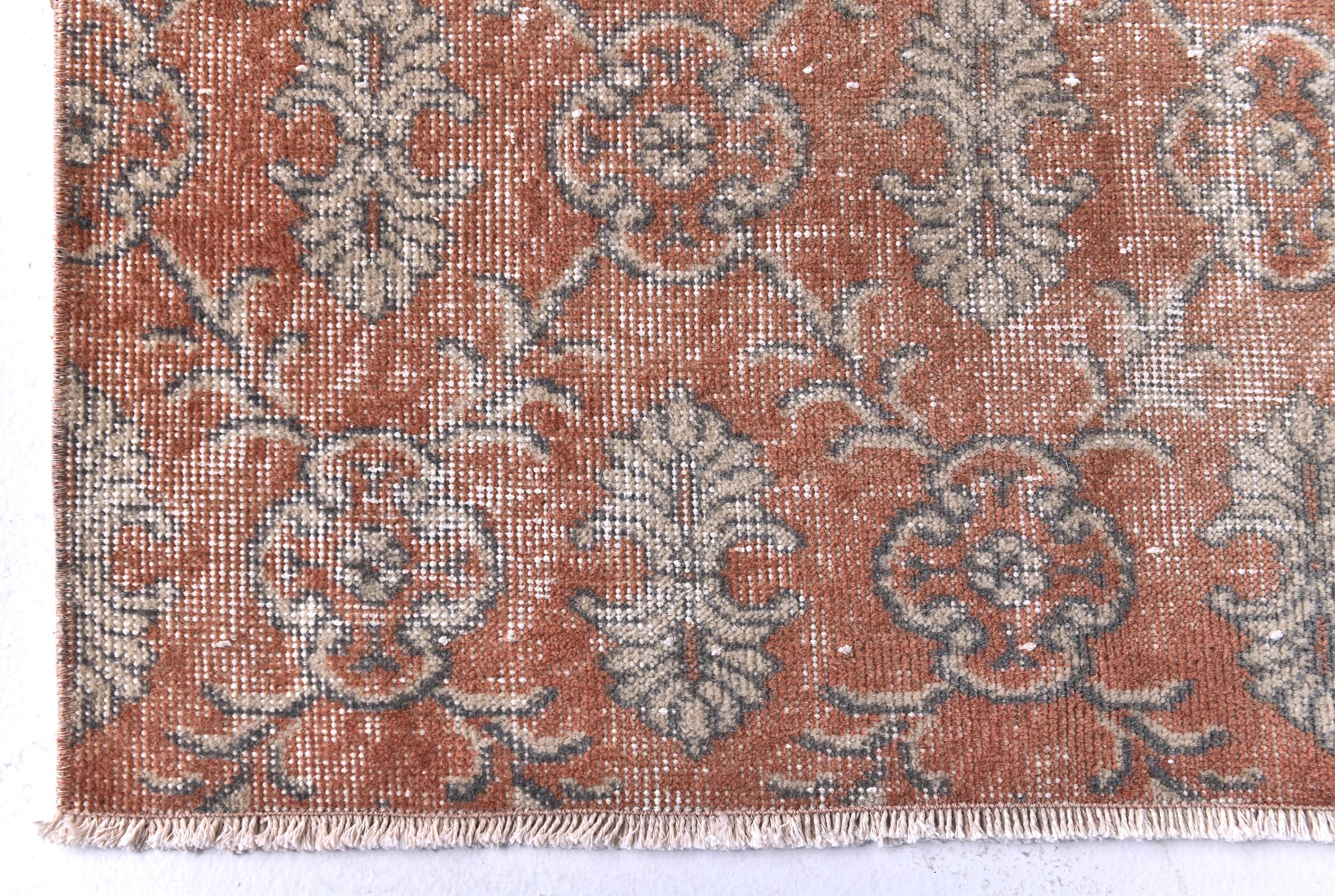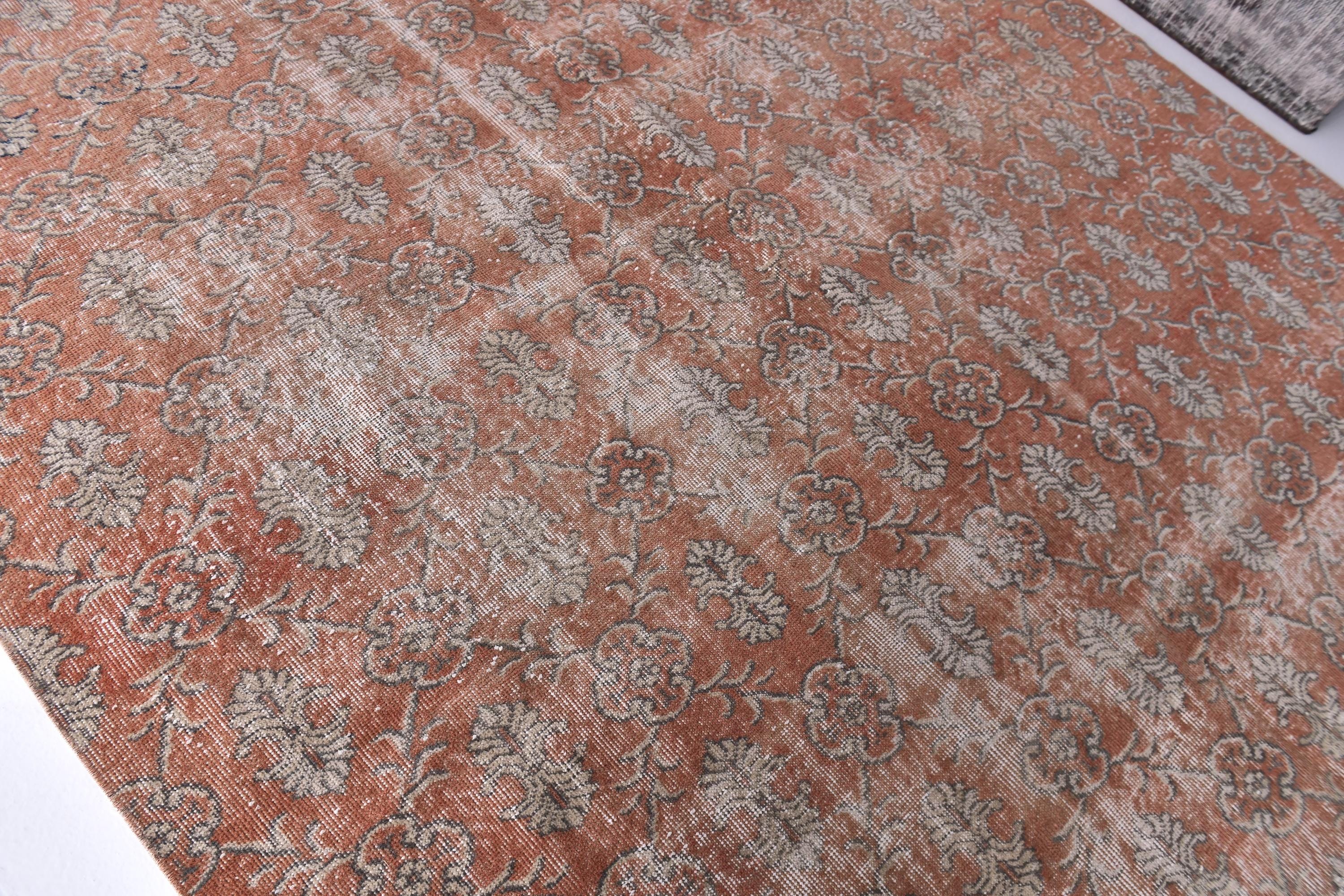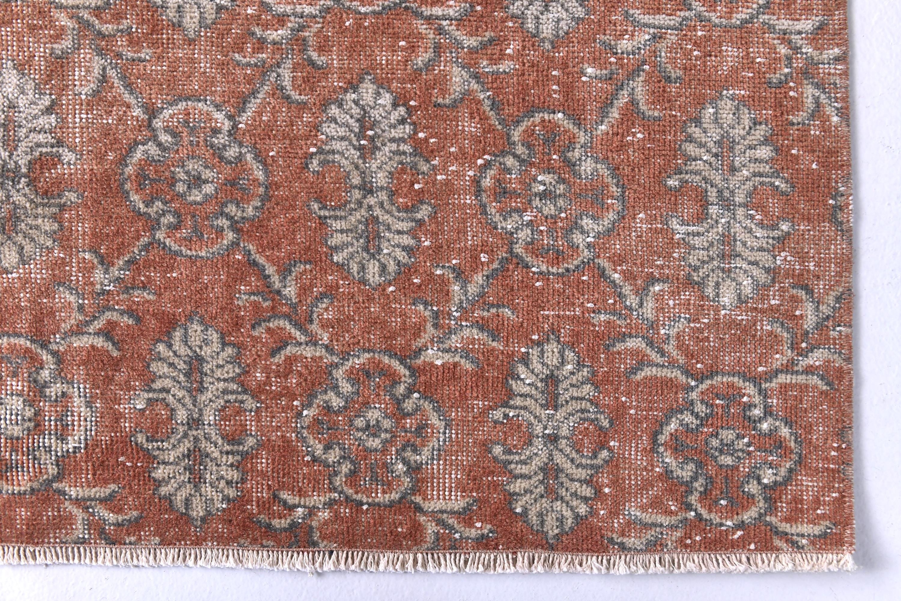📜📌 Vintage hand-knotted Turkish area rug featuring distressed coral red and terracotta base with sage green and beige floral medallion patterns. The worn, faded appearance showcases authentic age and character with visible warp threads creating a textured, time-worn aesthetic perfect for bohemian or eclectic interiors.