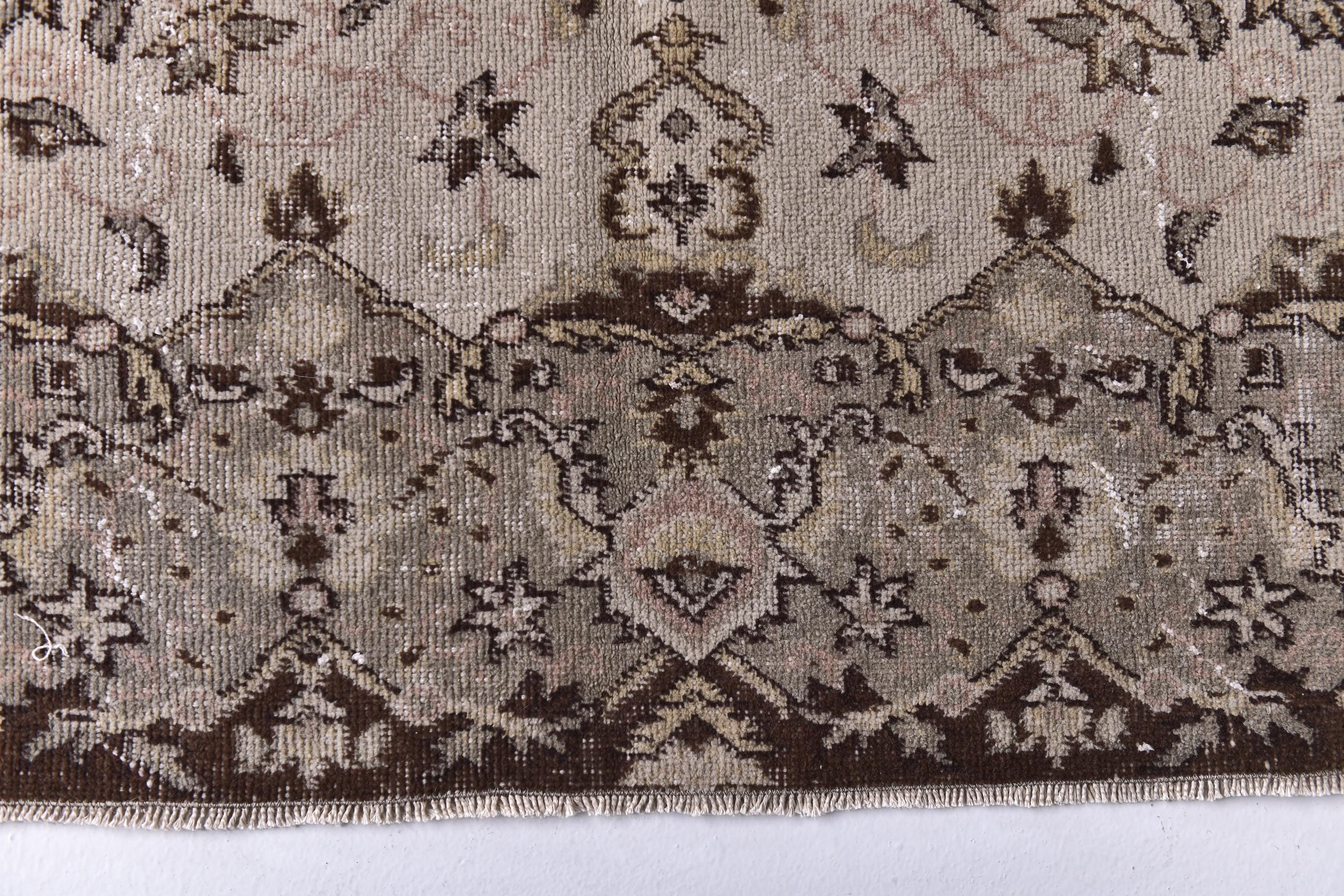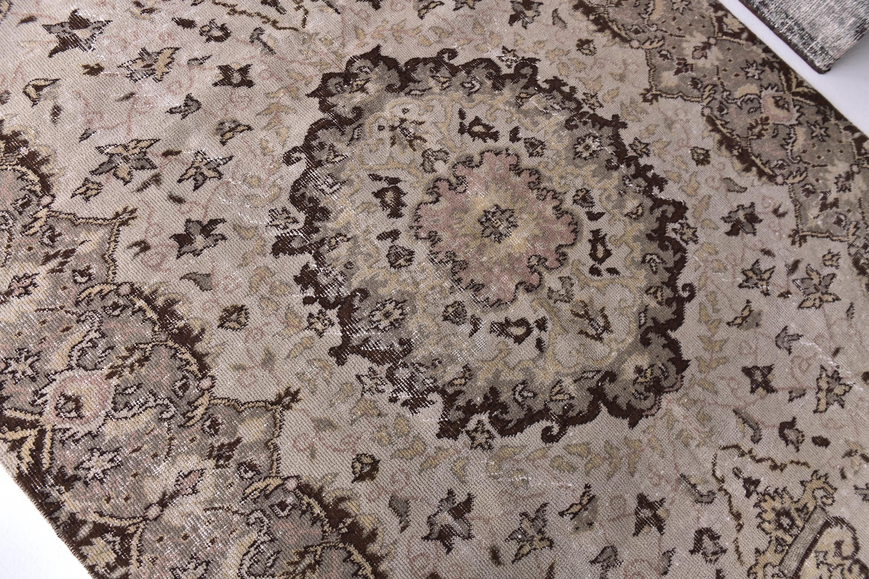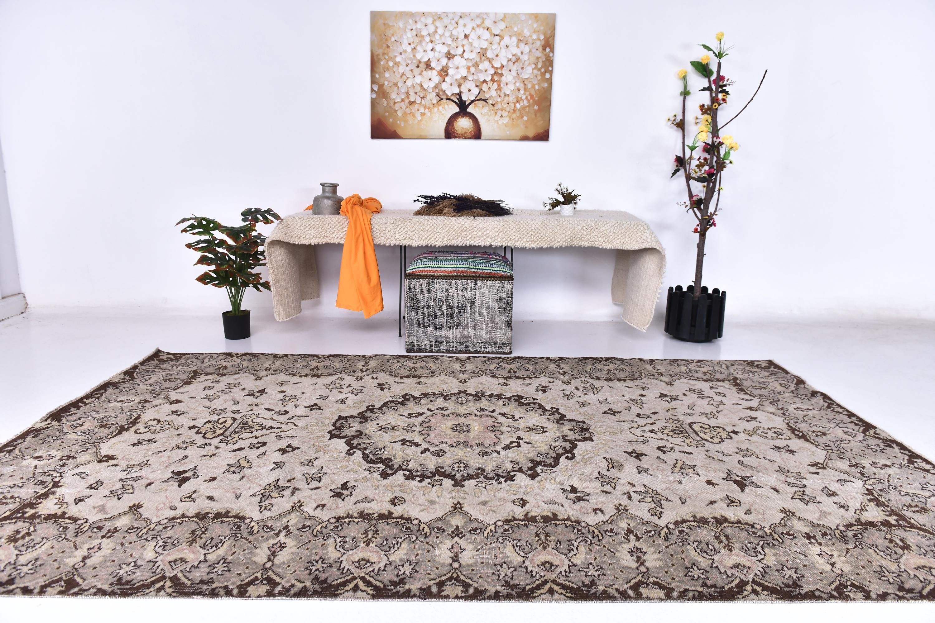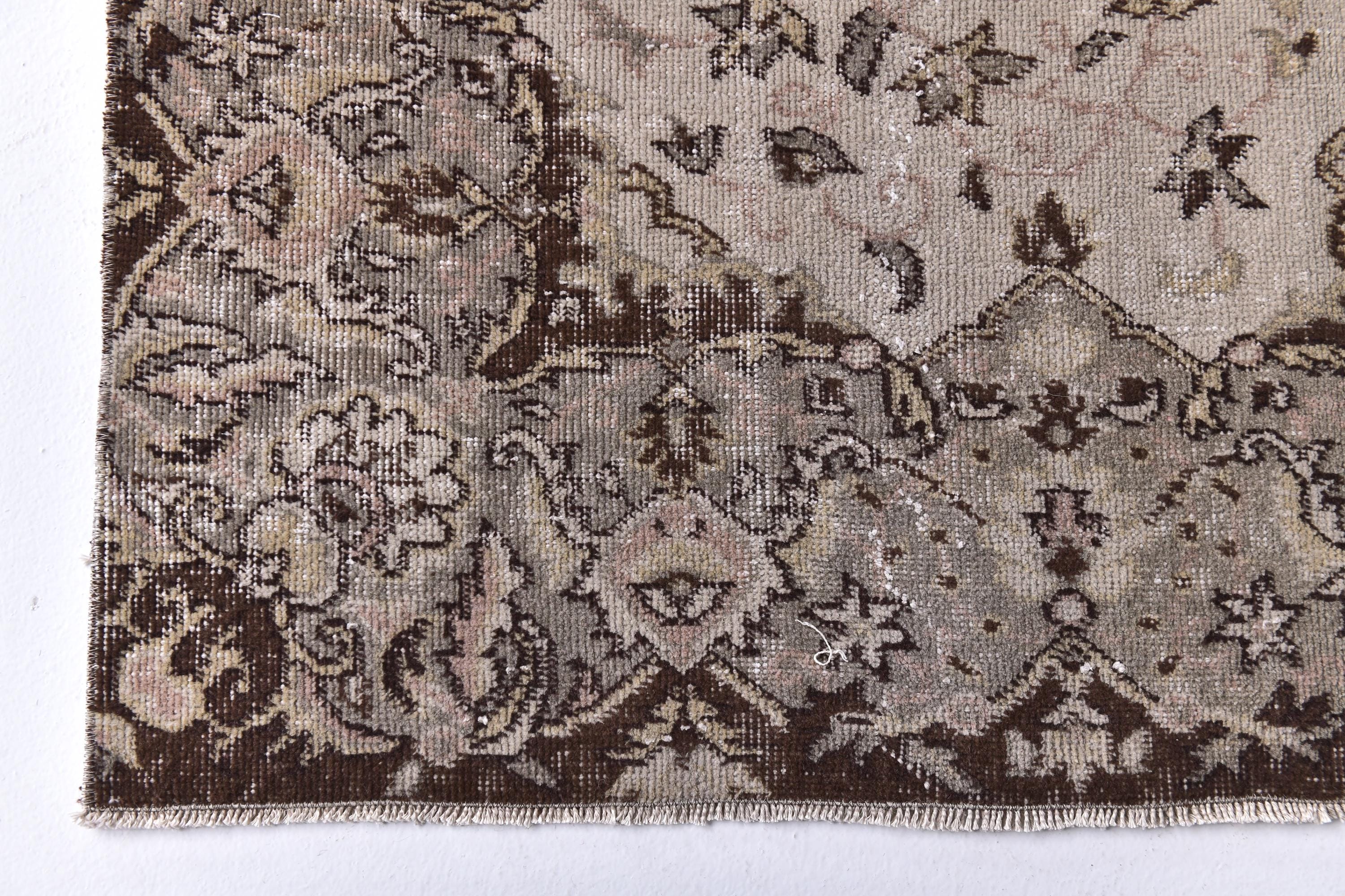 📜📌 Vintage hand-knotted Turkish area rug featuring neutral beige and taupe color palette with brown floral medallion centerpiece and ornate border design. The distressed, faded appearance showcases authentic patina with gray, cream, and brown botanical motifs creating an elegant vintage aesthetic ideal for neutral and transitional interior designs.