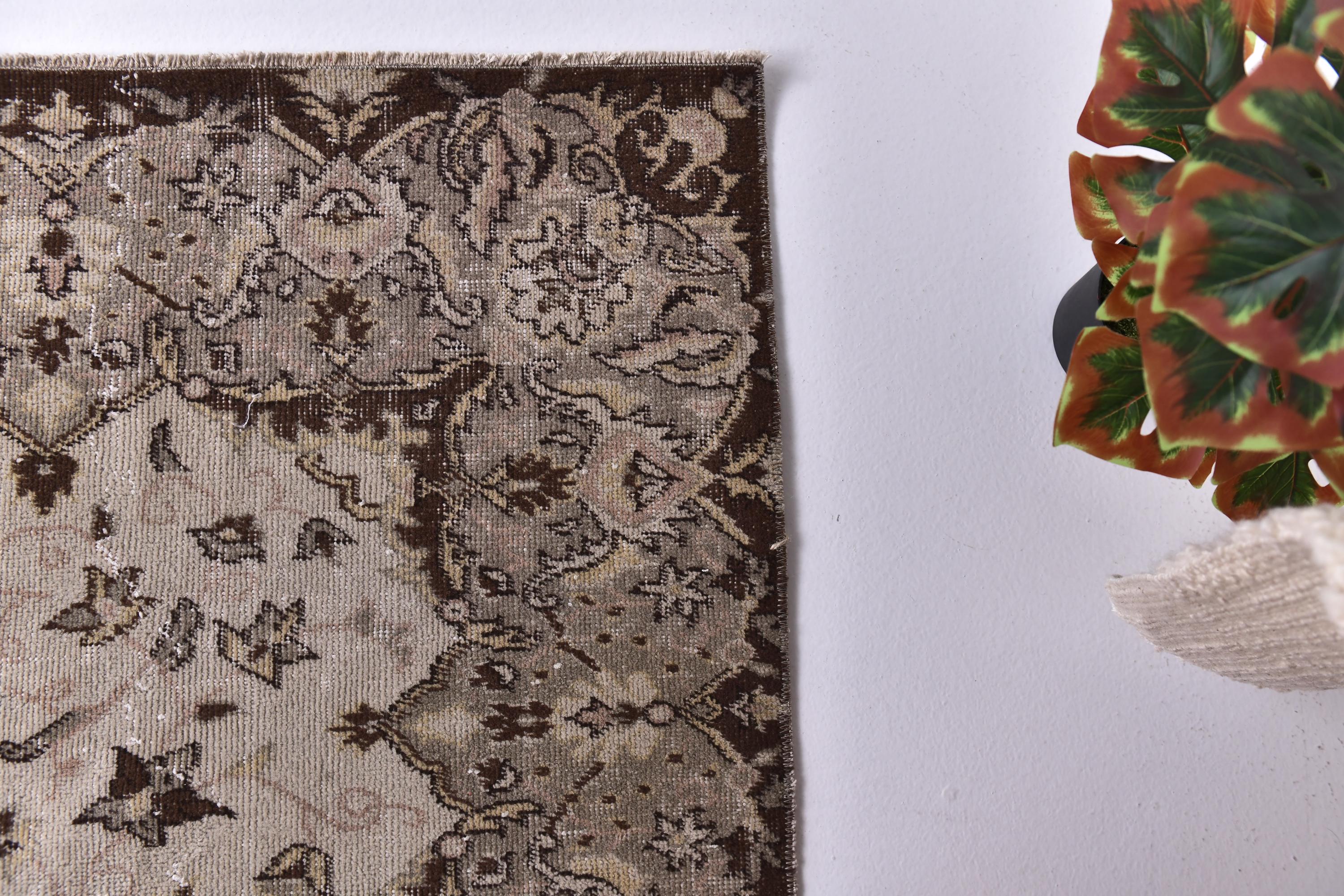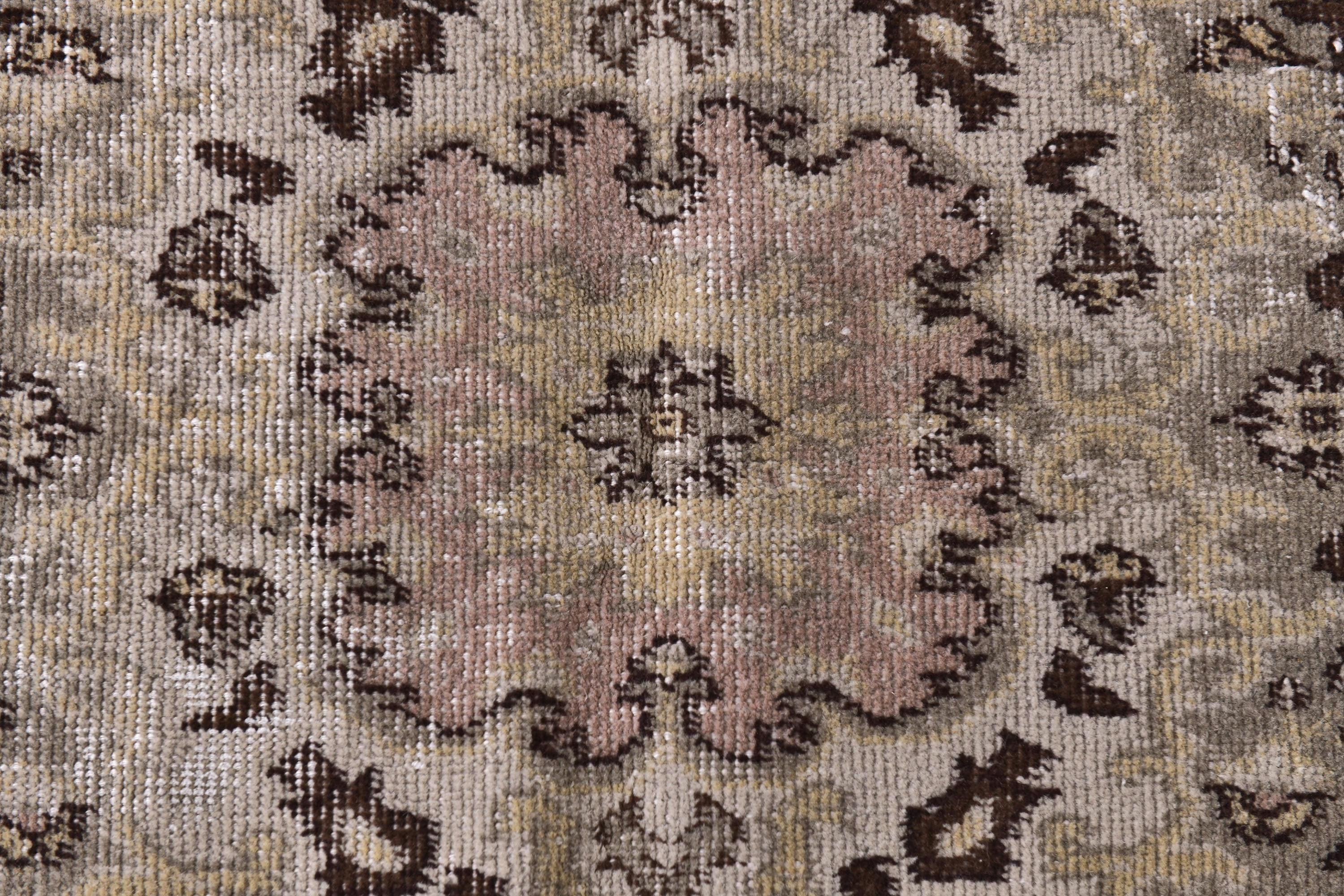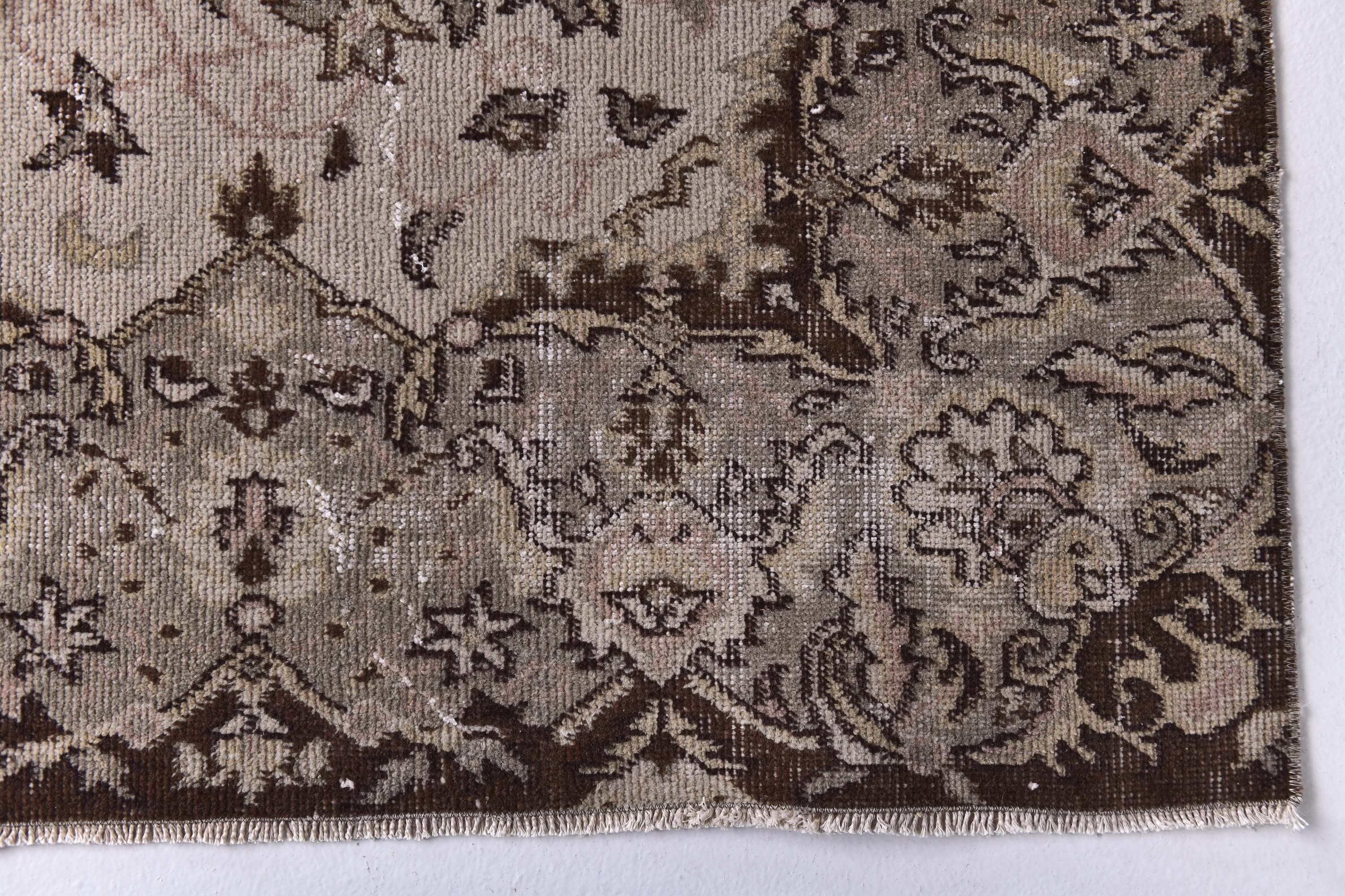 📜📌 Vintage hand-knotted Turkish area rug featuring neutral beige and taupe color palette with brown floral medallion centerpiece and ornate border design. The distressed, faded appearance showcases authentic patina with gray, cream, and brown botanical motifs creating an elegant vintage aesthetic ideal for neutral and transitional interior designs.