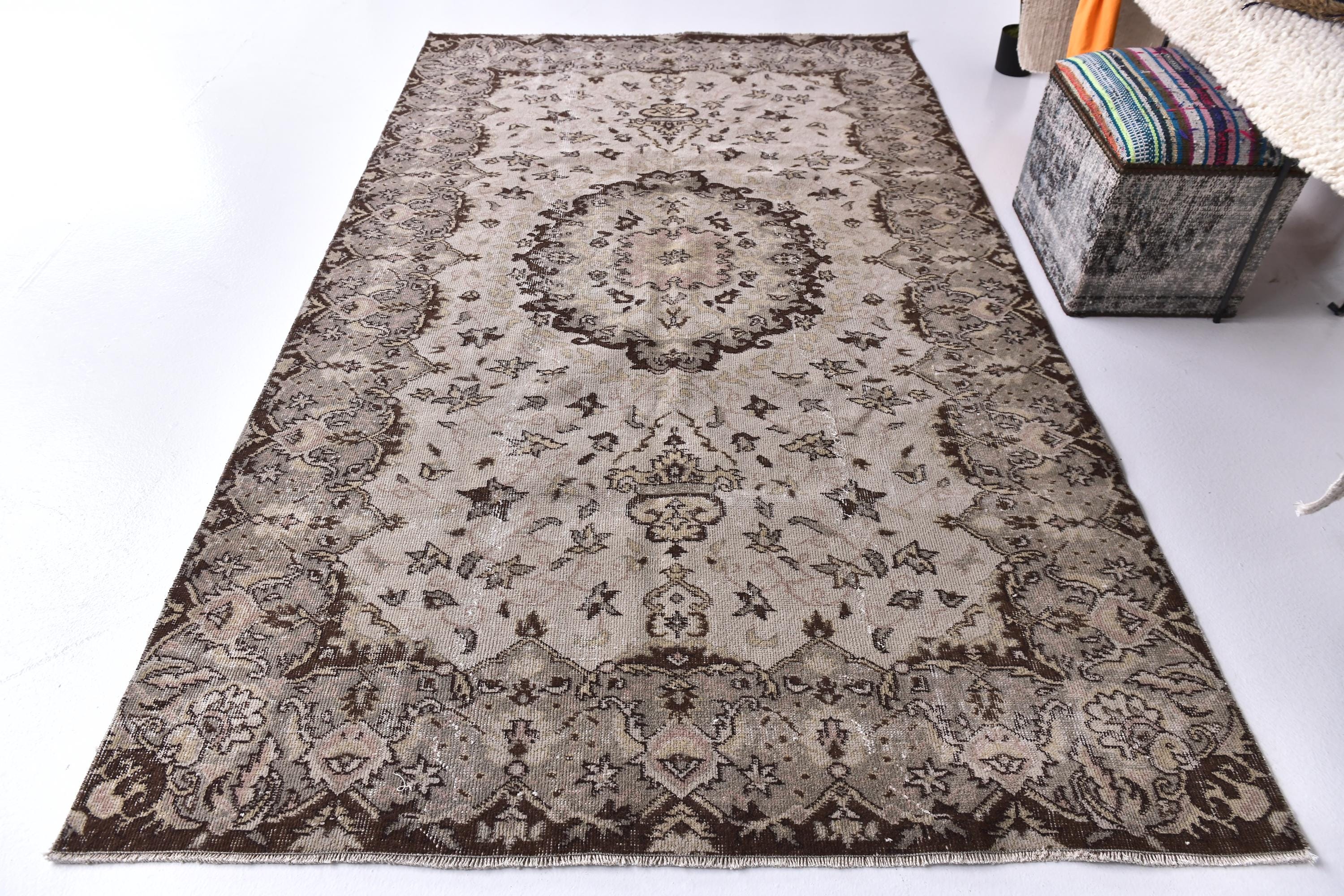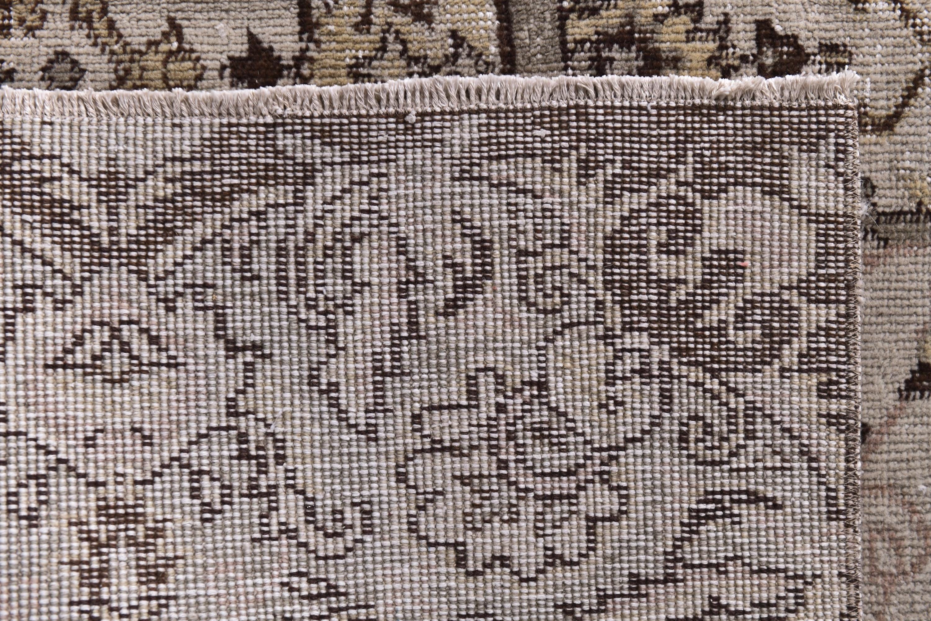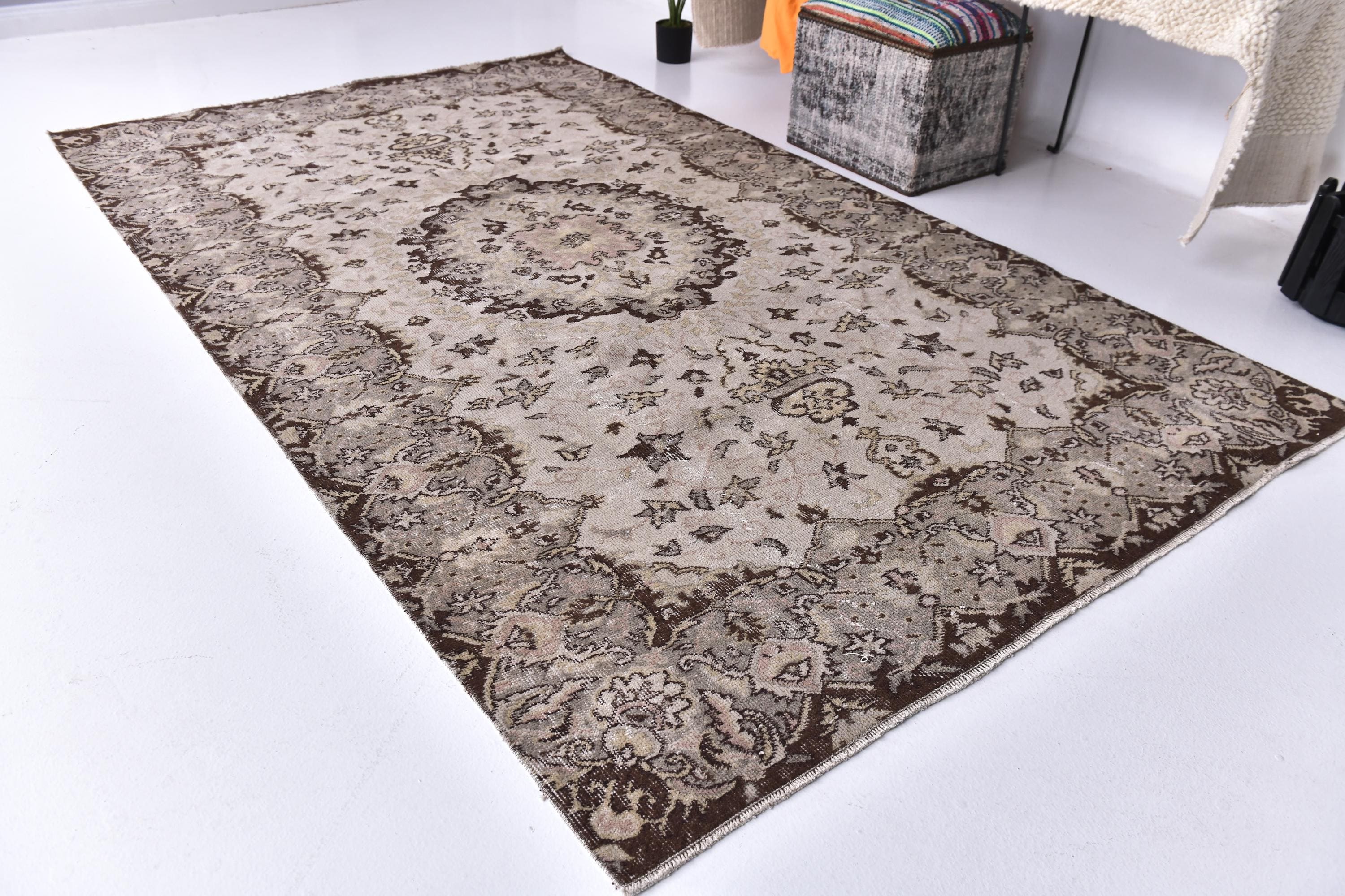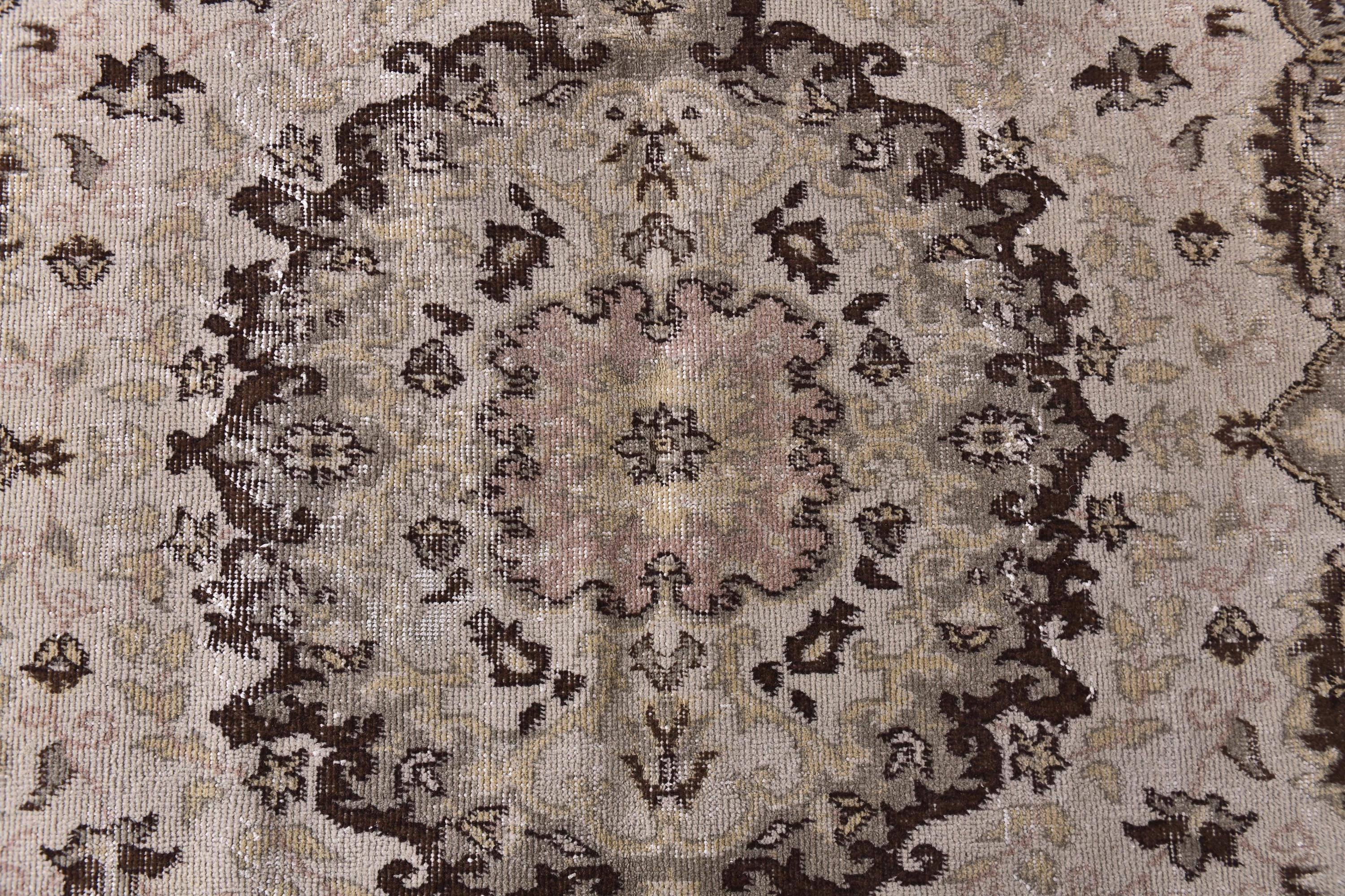 📜📌 Vintage hand-knotted Turkish area rug featuring neutral beige and taupe color palette with brown floral medallion centerpiece and ornate border design. The distressed, faded appearance showcases authentic patina with gray, cream, and brown botanical motifs creating an elegant vintage aesthetic ideal for neutral and transitional interior designs.
