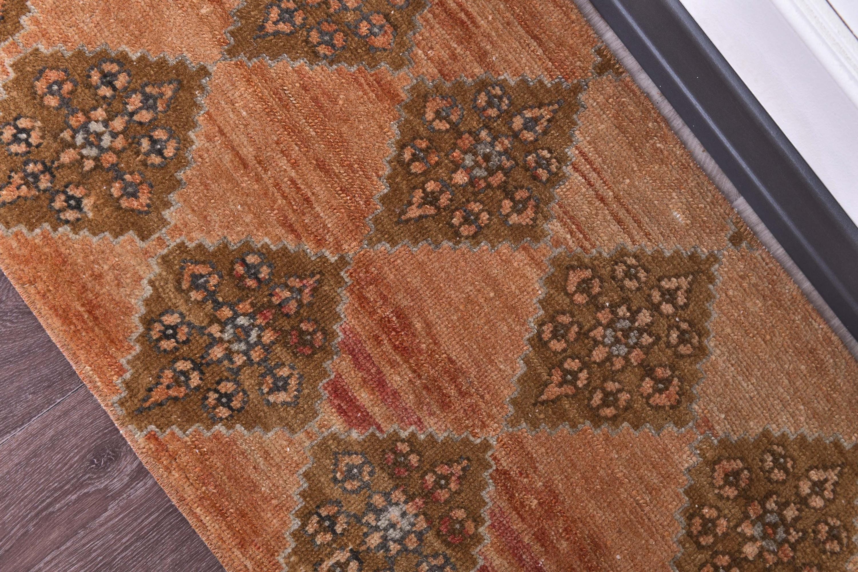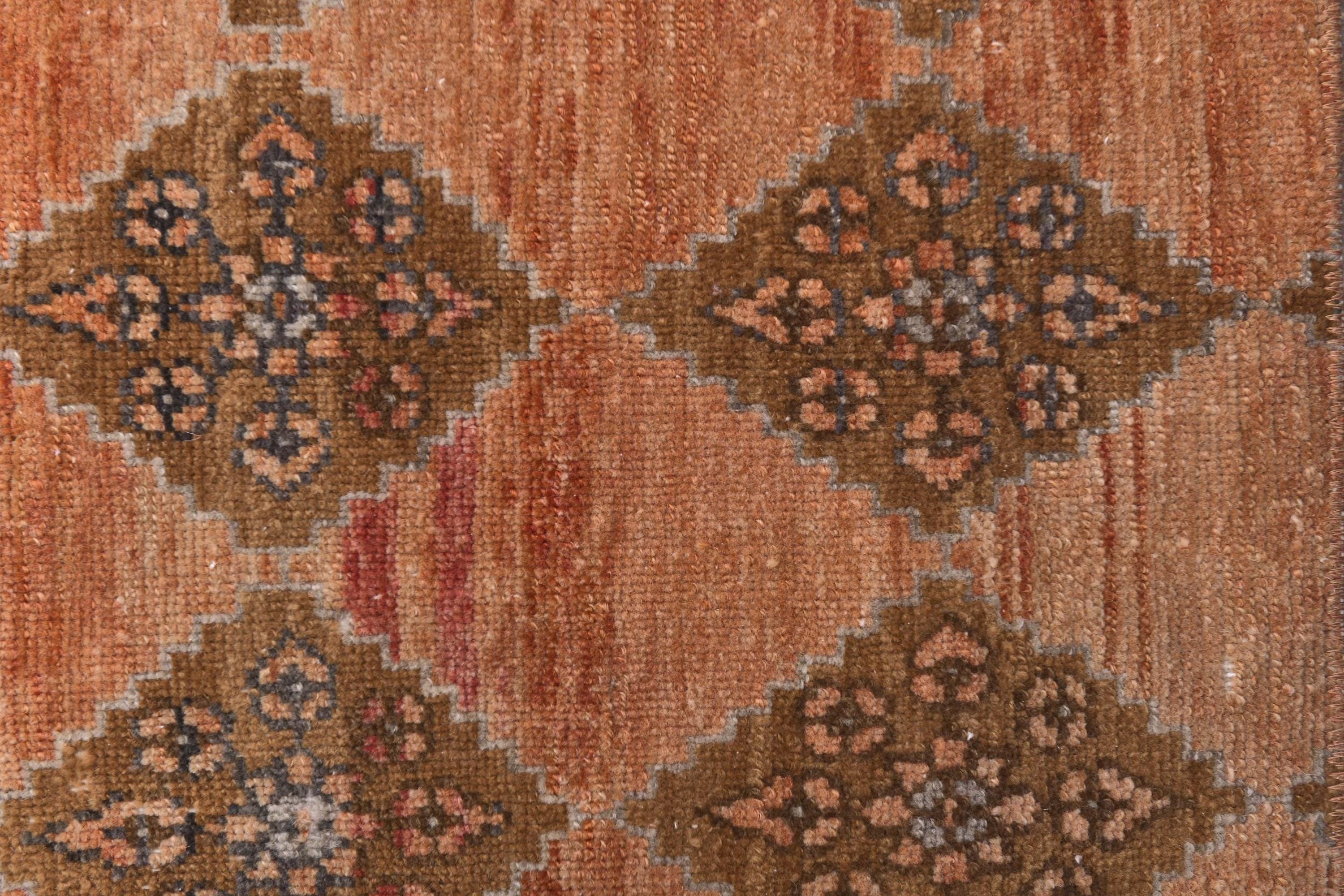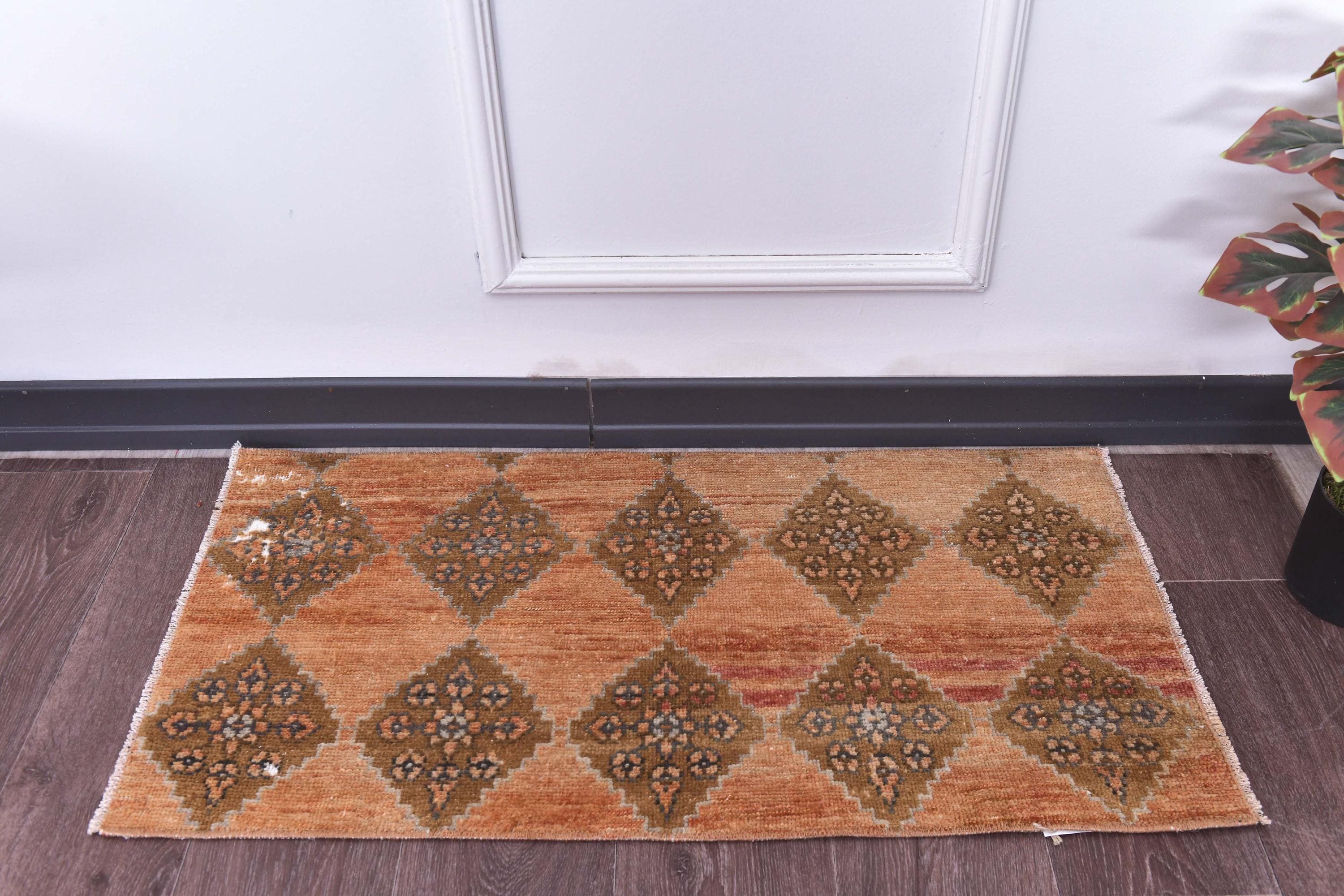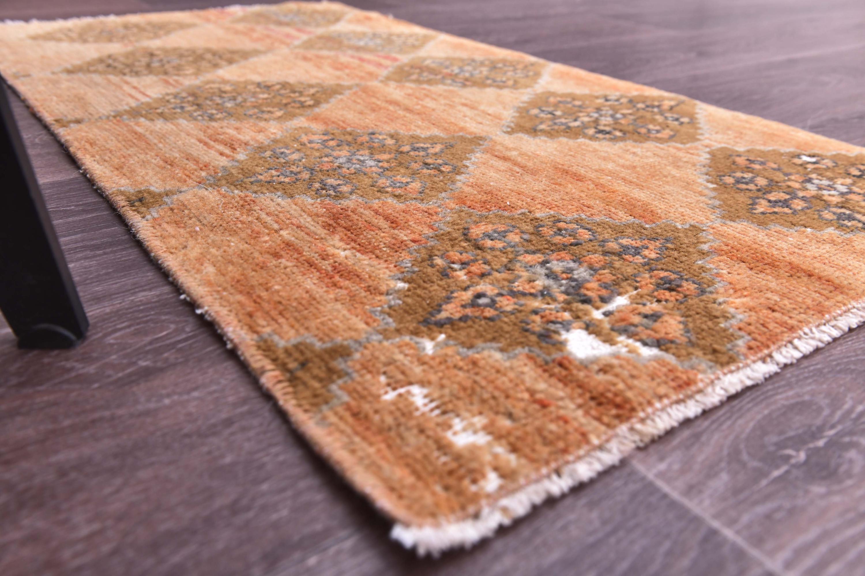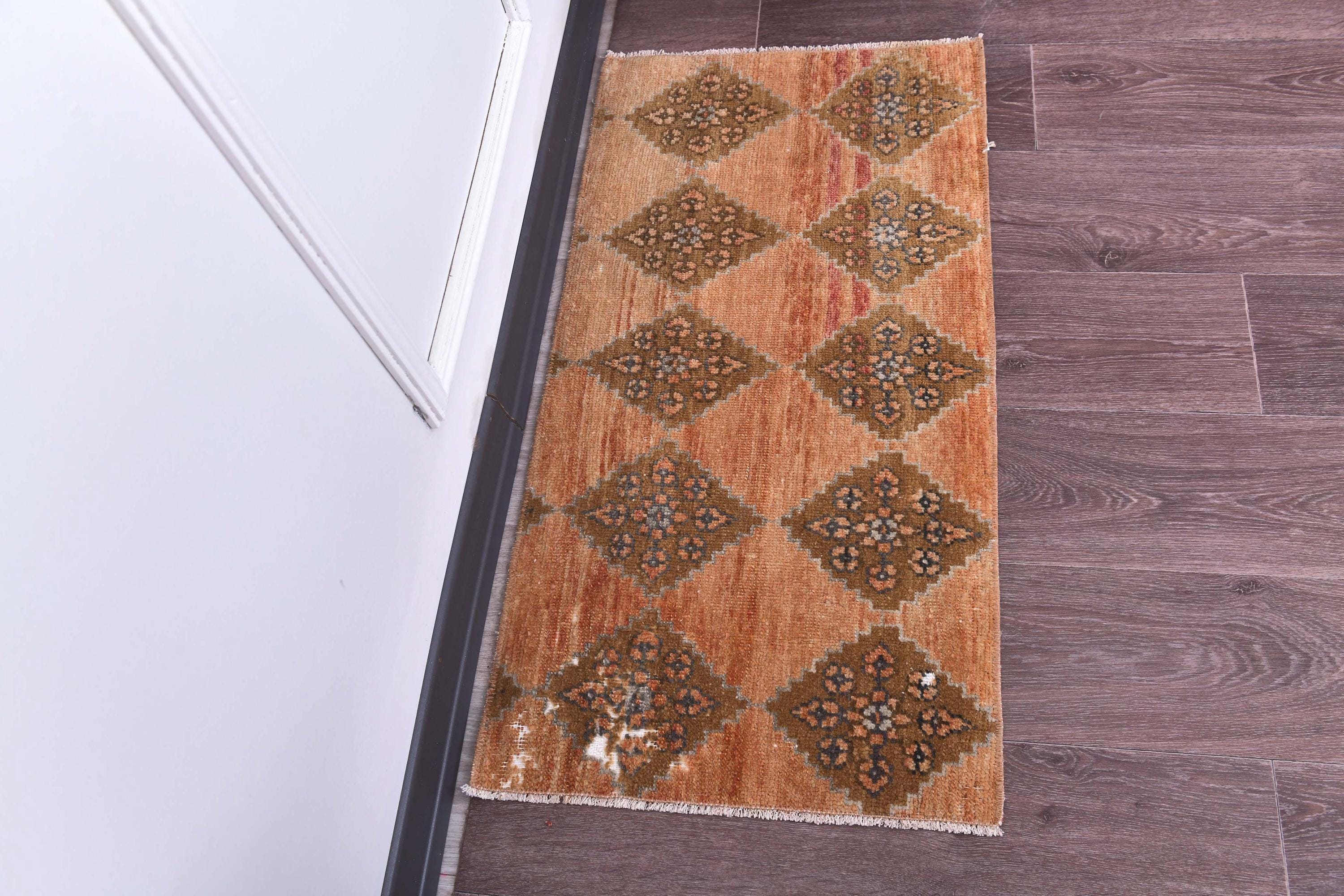📜📌 Antique Turkish wool doormat displaying geometric diamond grid design in moss green and brown tones on faded terracotta orange field with visible age-related wear adding rustic character
