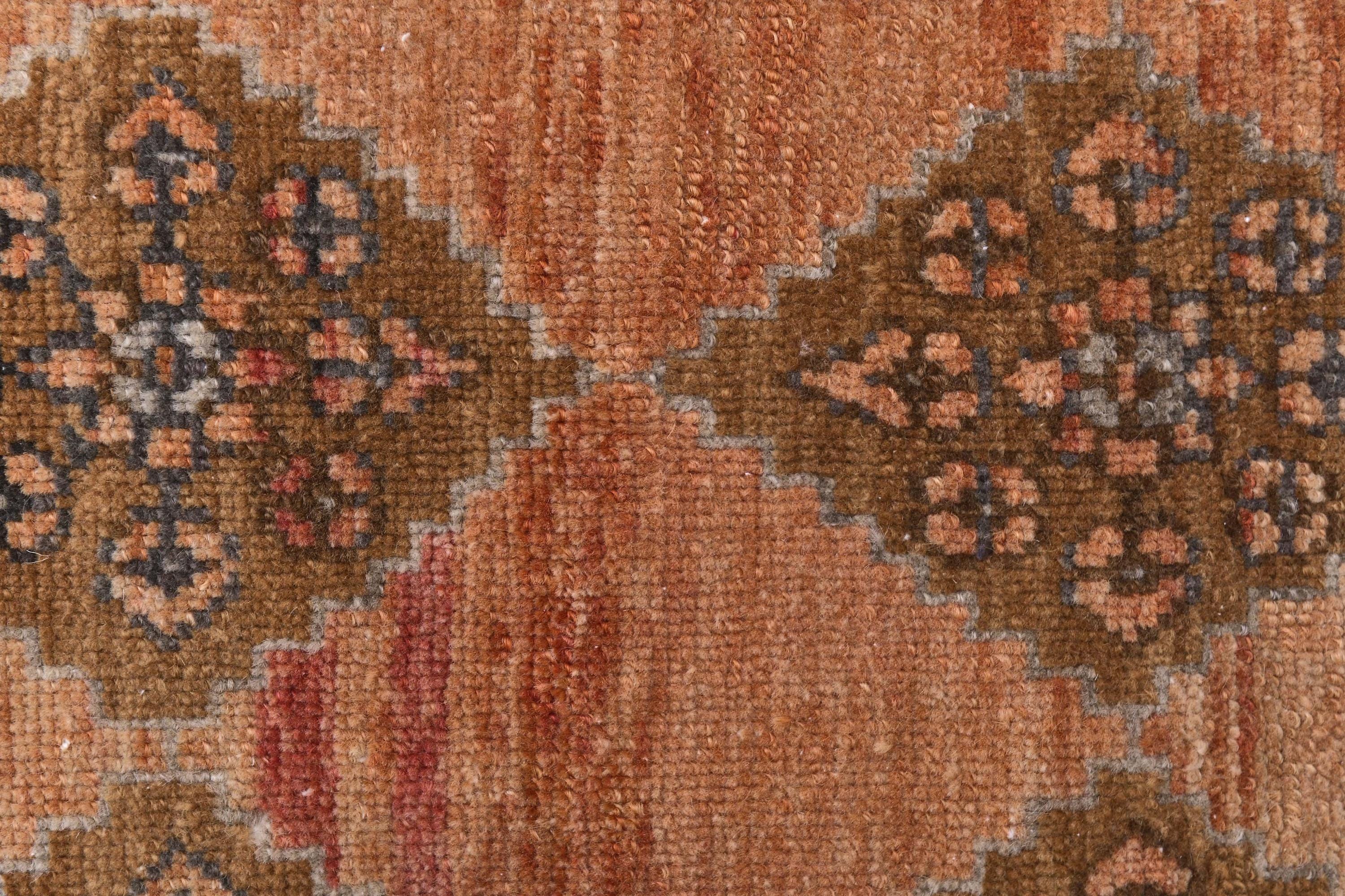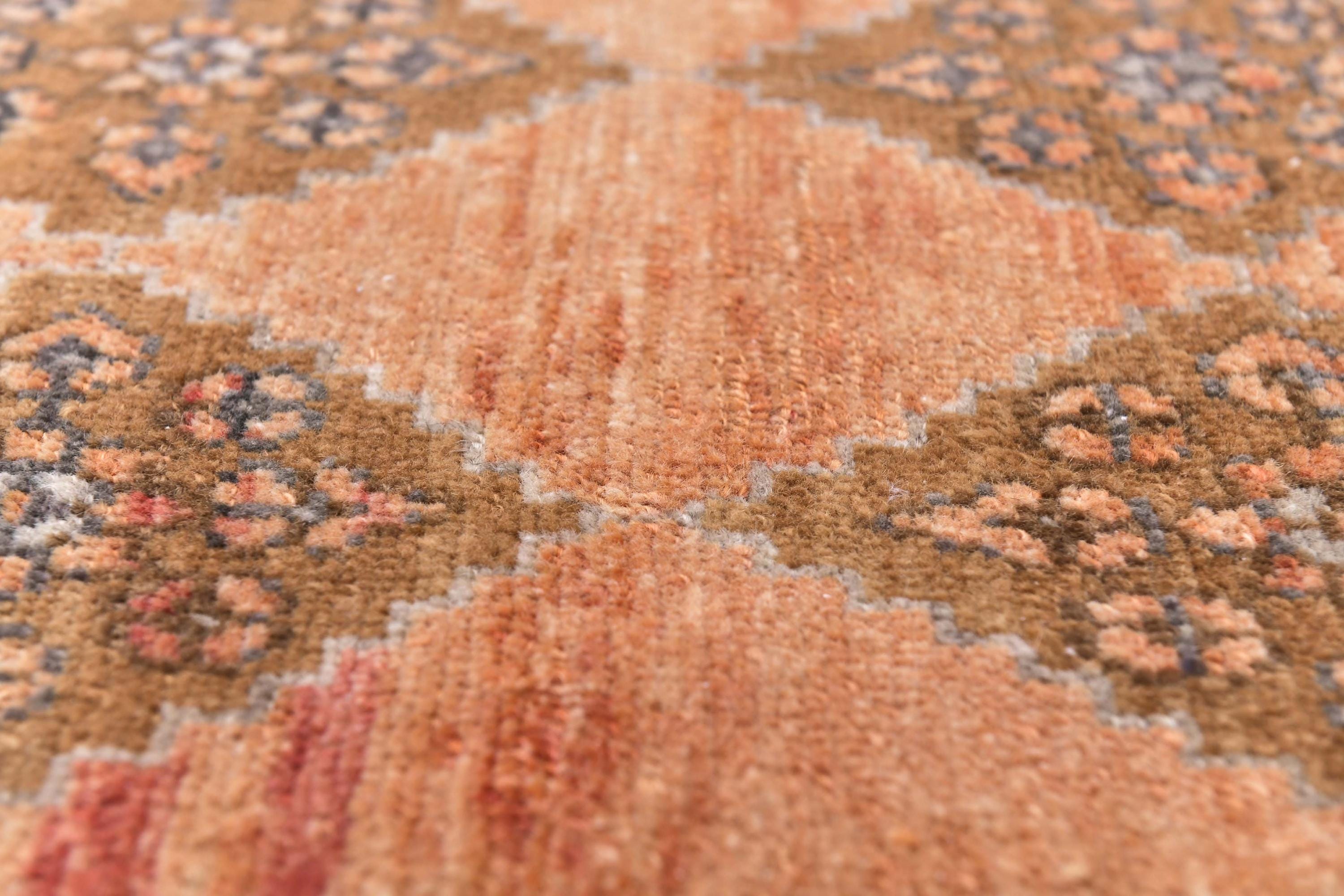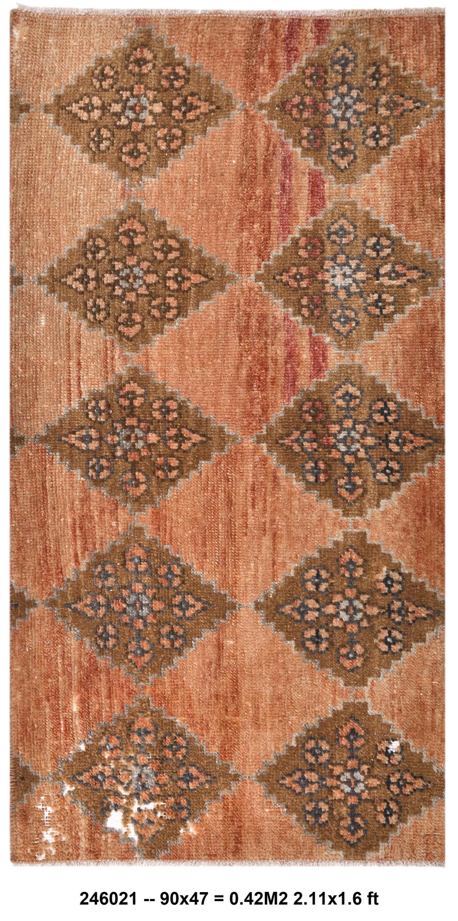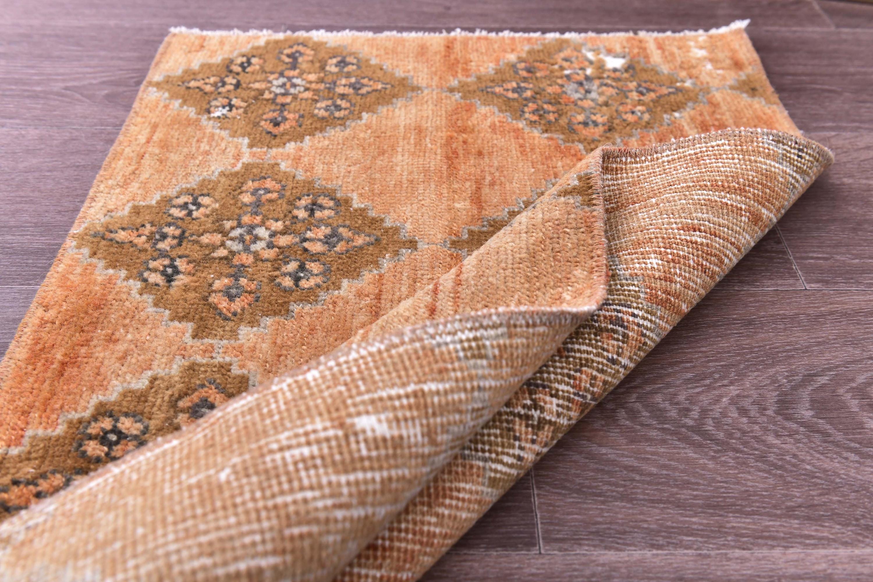 📜📌 Antique Turkish wool doormat displaying geometric diamond grid design in moss green and brown tones on faded terracotta orange field with visible age-related wear adding rustic character