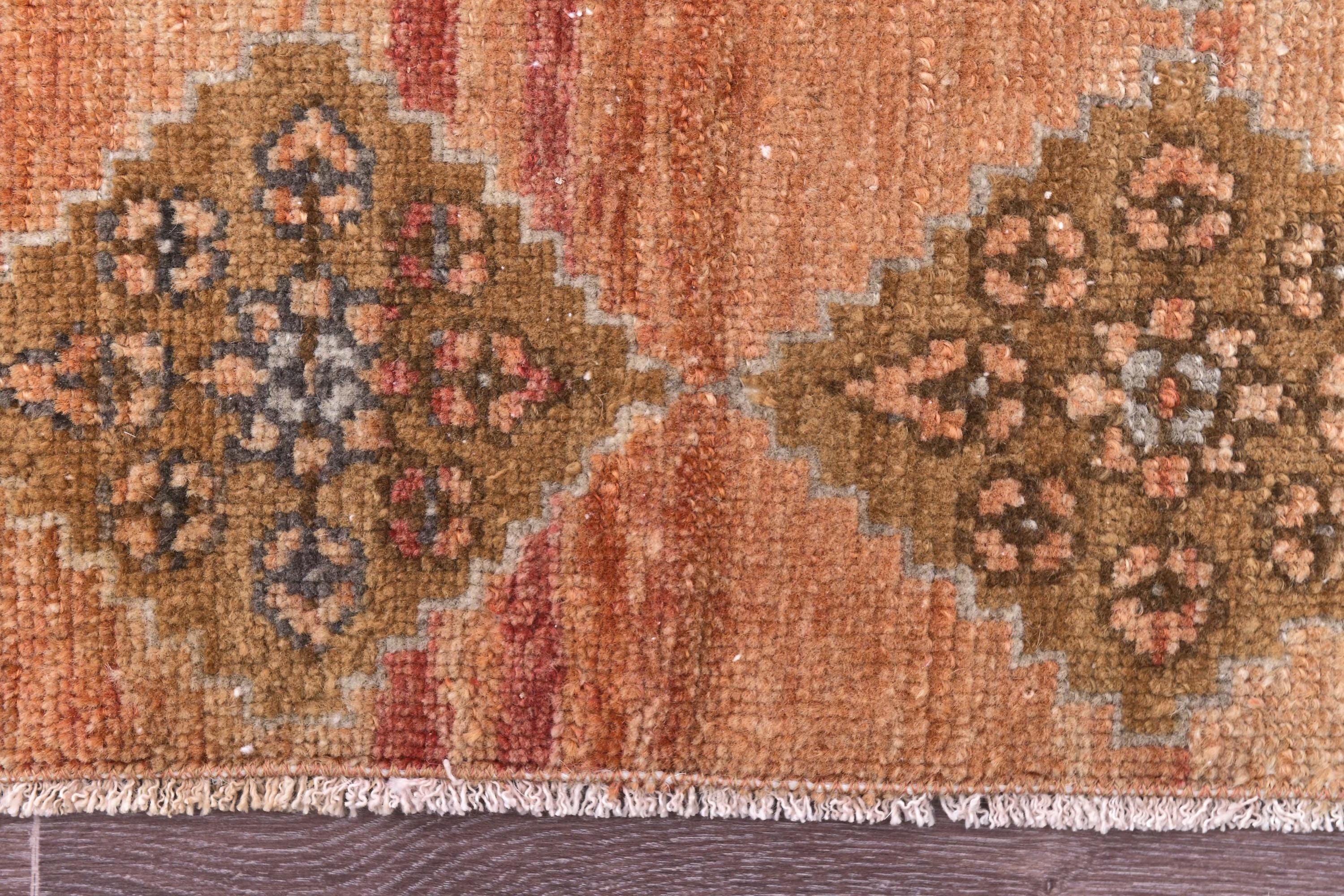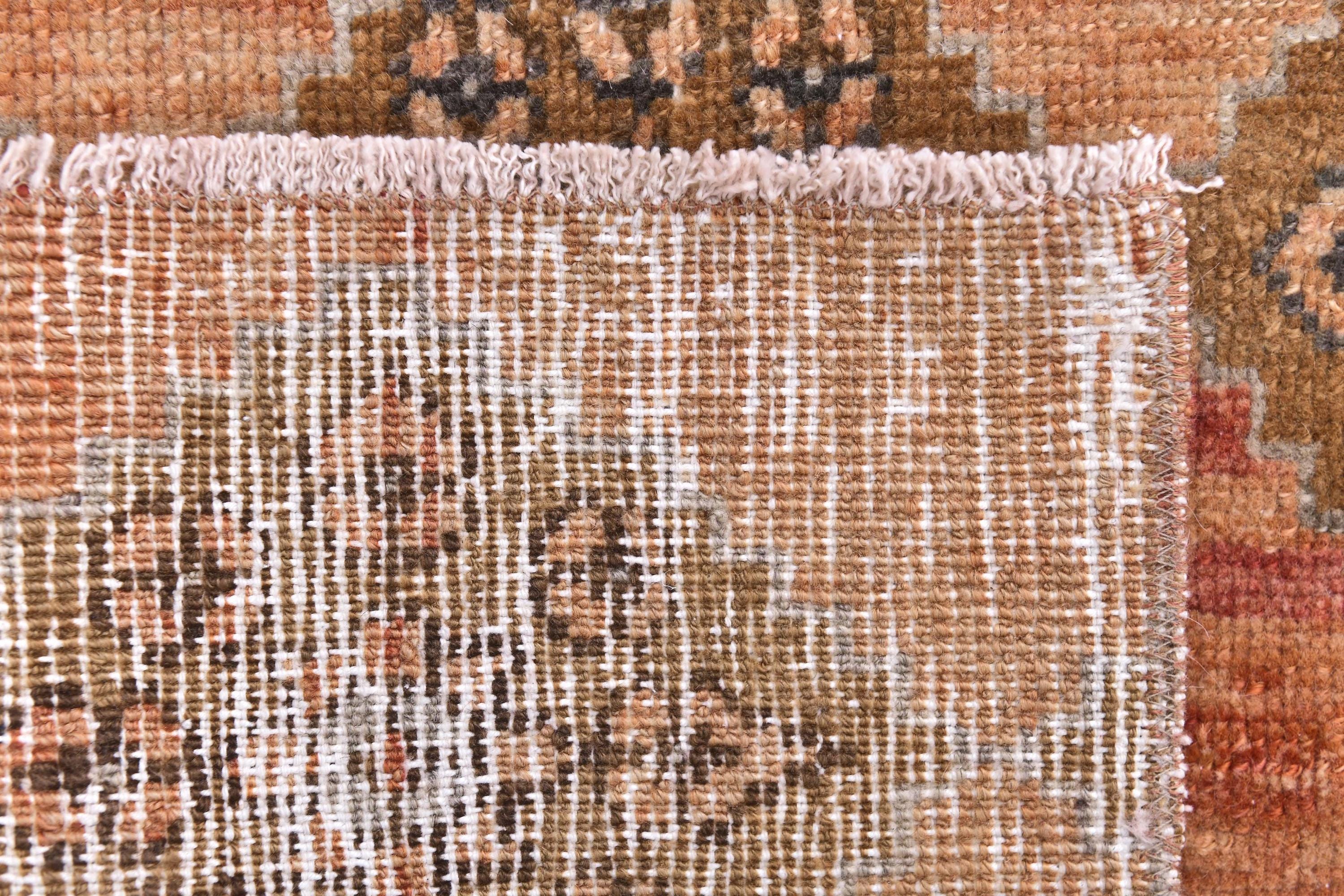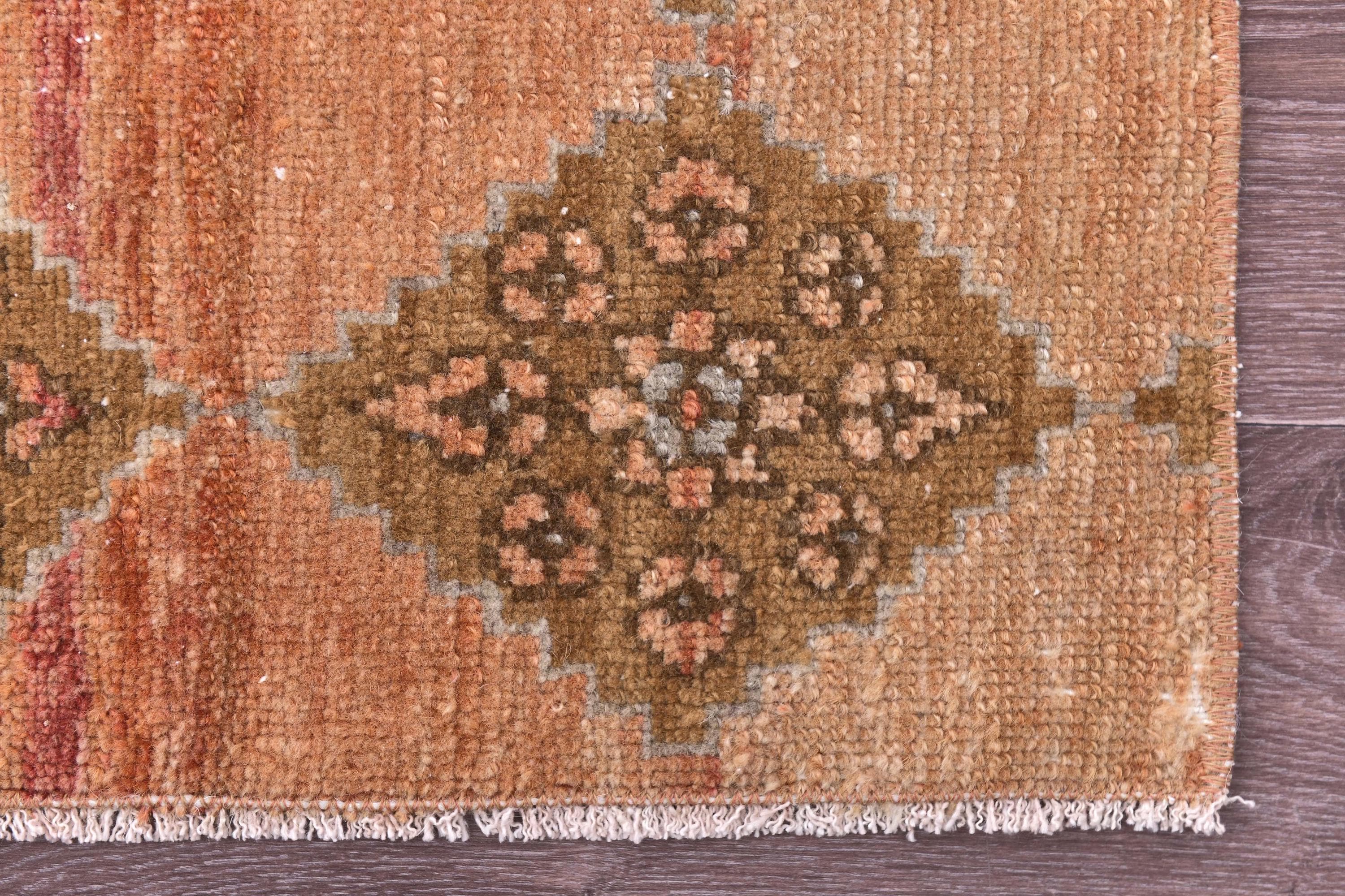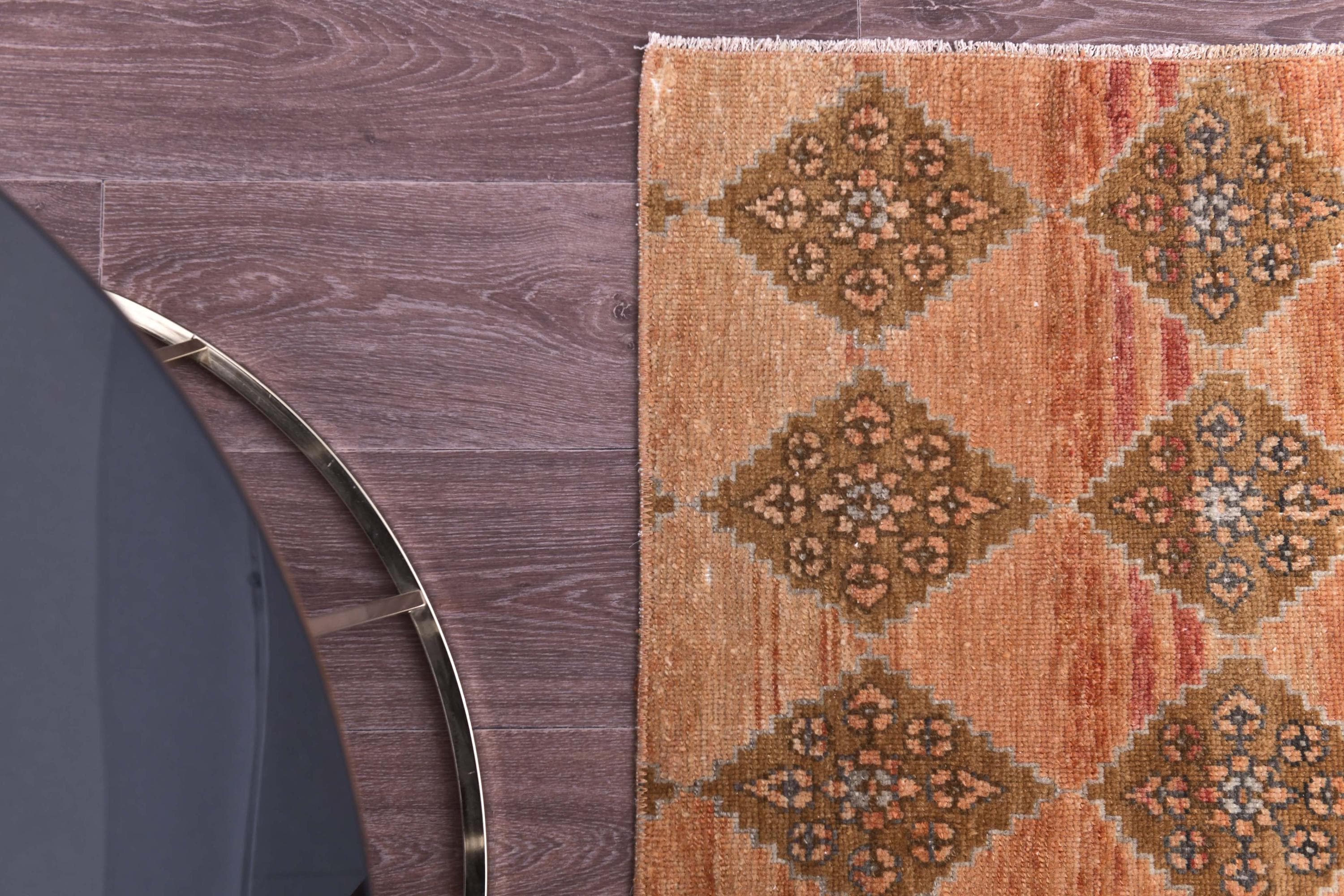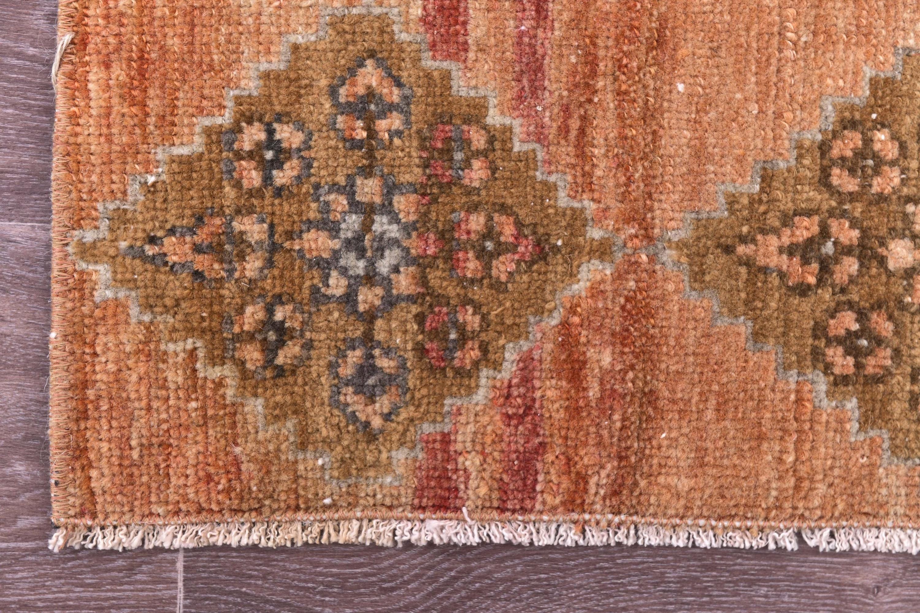 📜📌 Antique Turkish wool doormat displaying geometric diamond grid design in moss green and brown tones on faded terracotta orange field with visible age-related wear adding rustic character