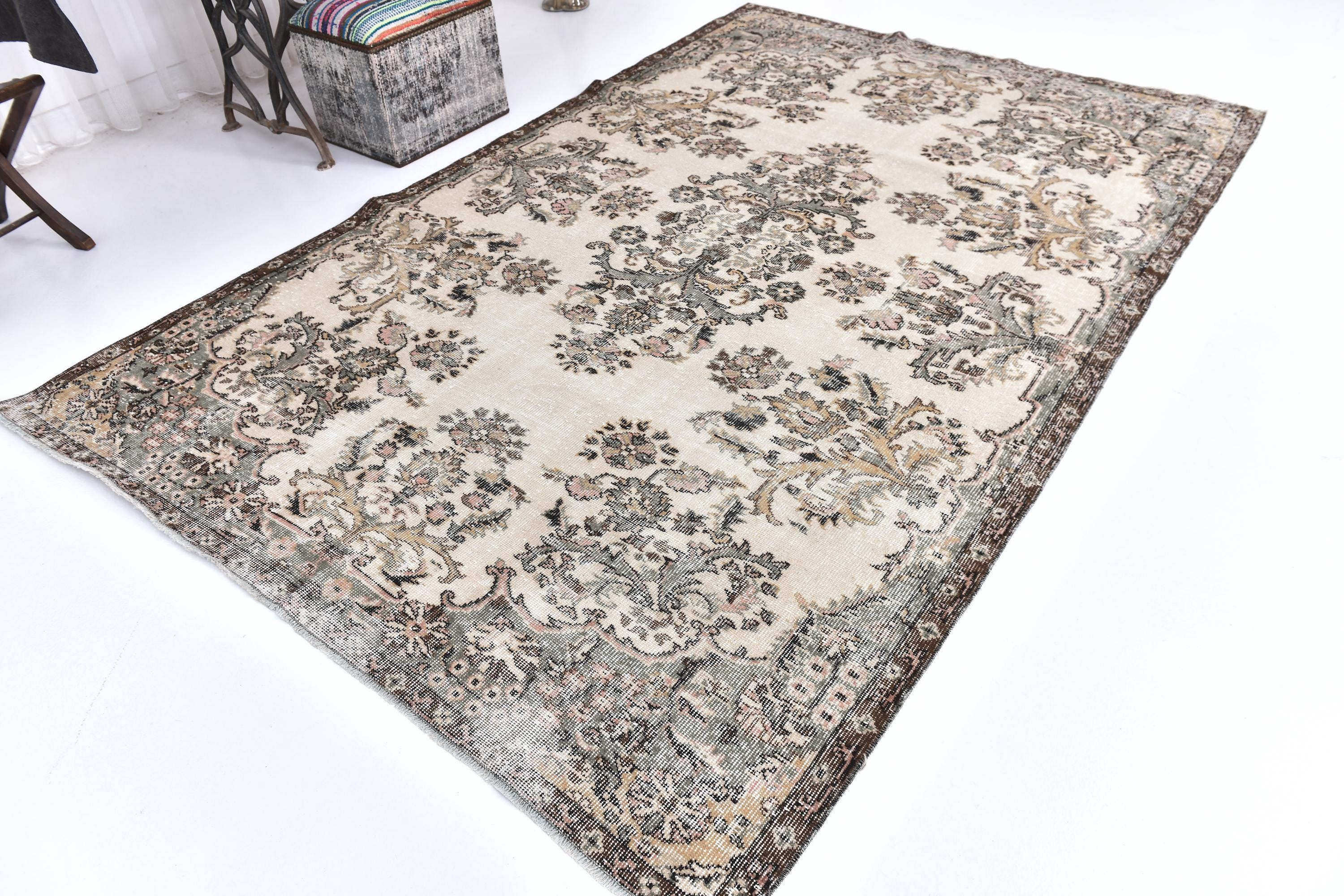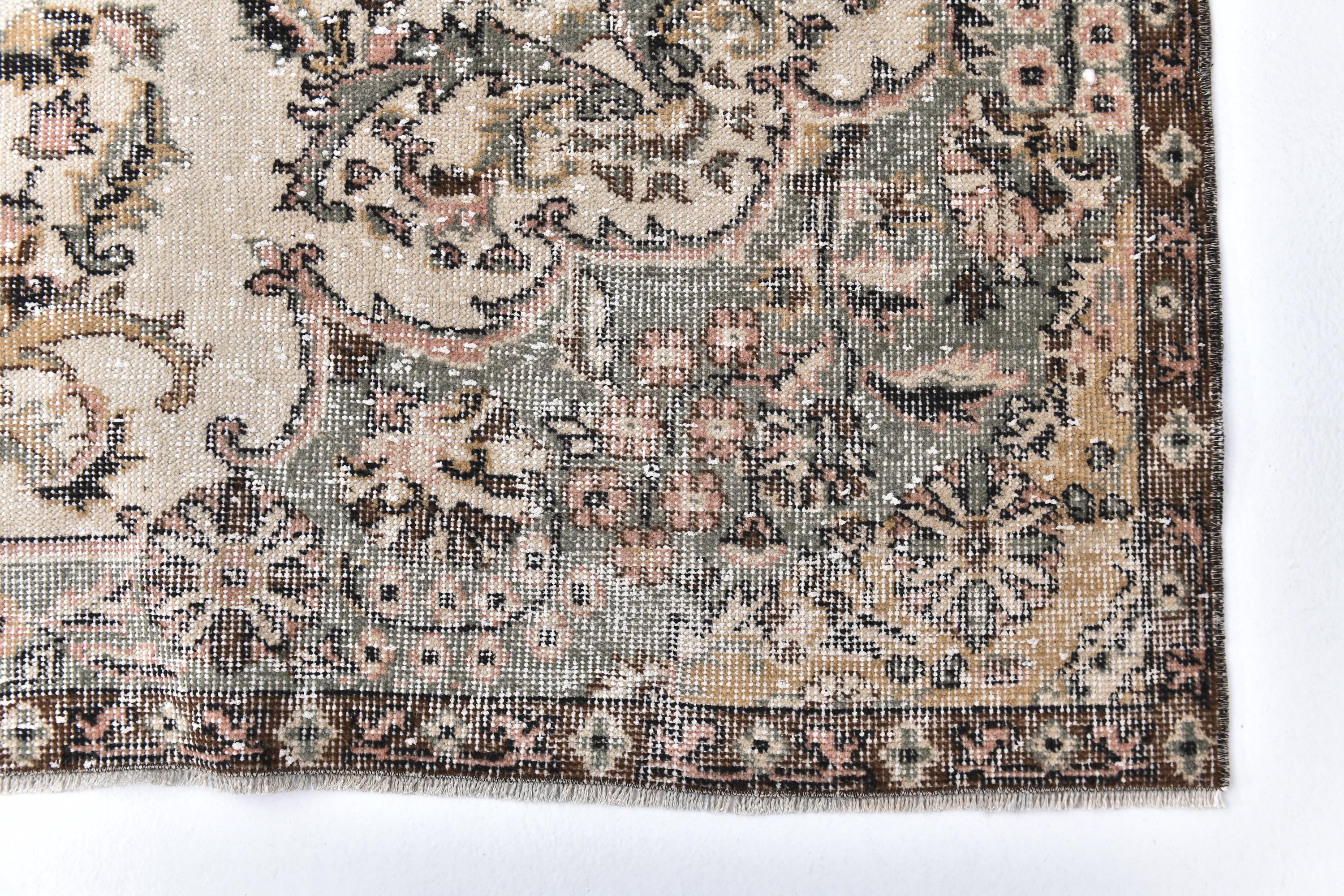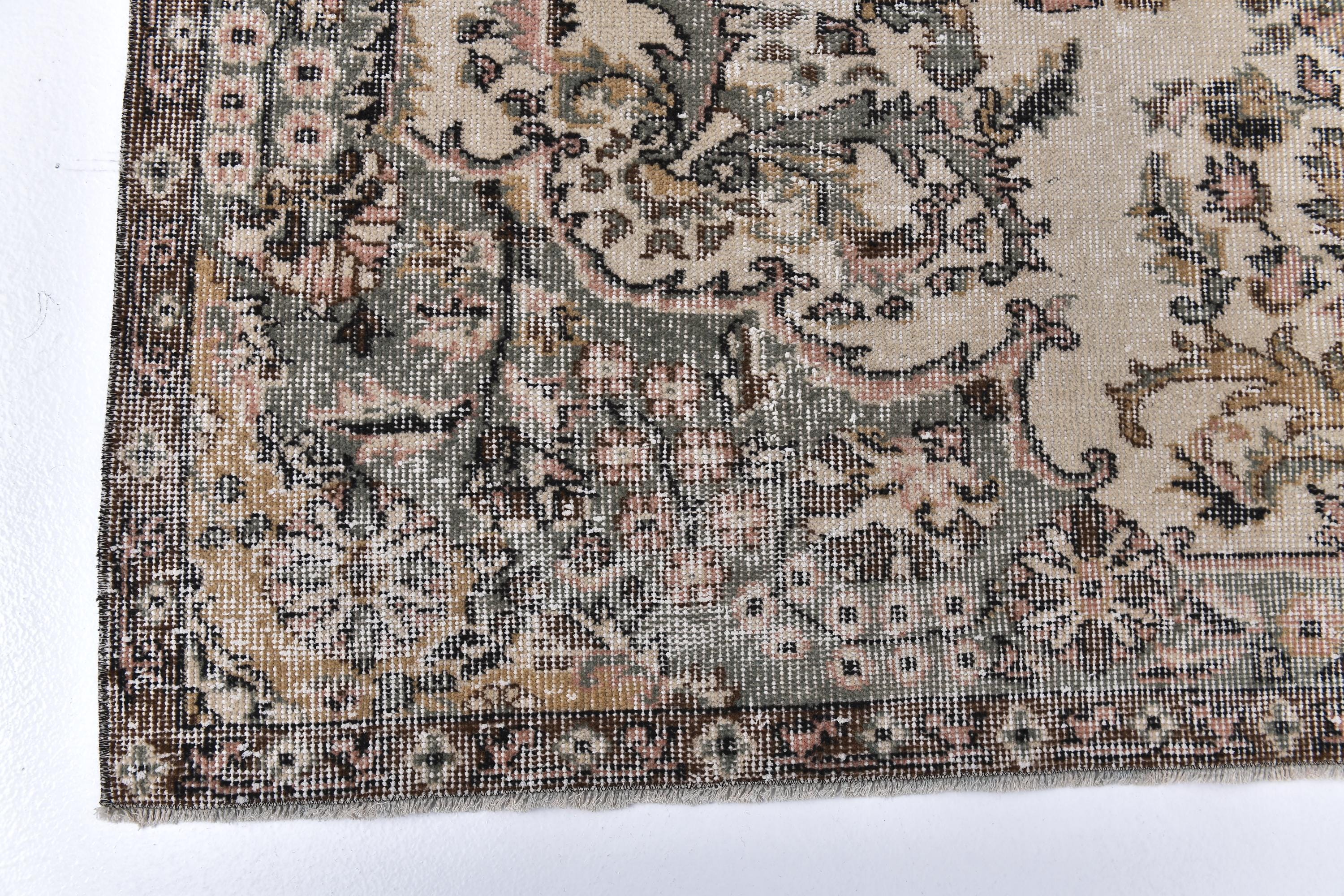 📜📌 Vintage Turkish area rug featuring brown and sage green colors with traditional floral medallion center and ornate border design. Hand-knotted distressed wool carpet with faded antique appearance and ivory cream accents, perfect for bohemian, vintage or eclectic interior decor