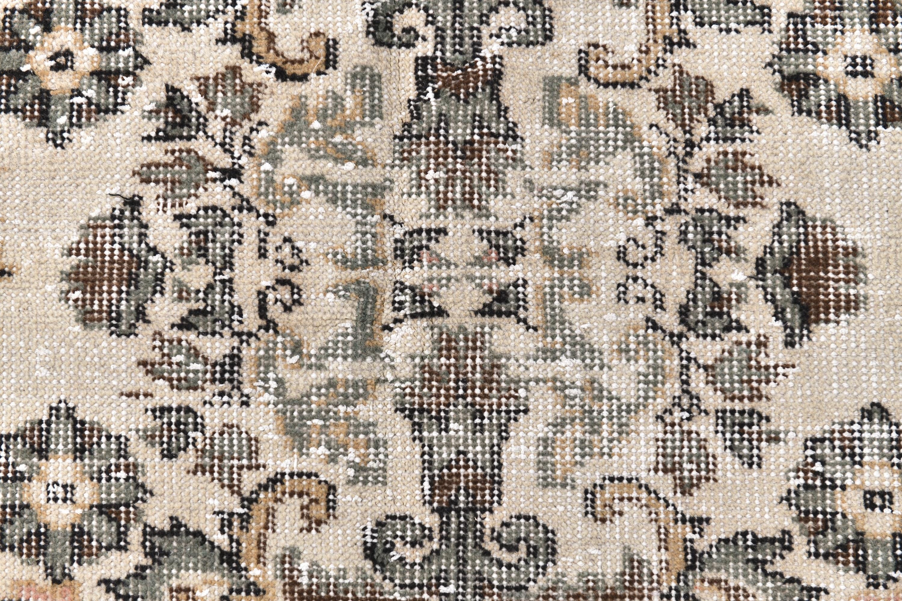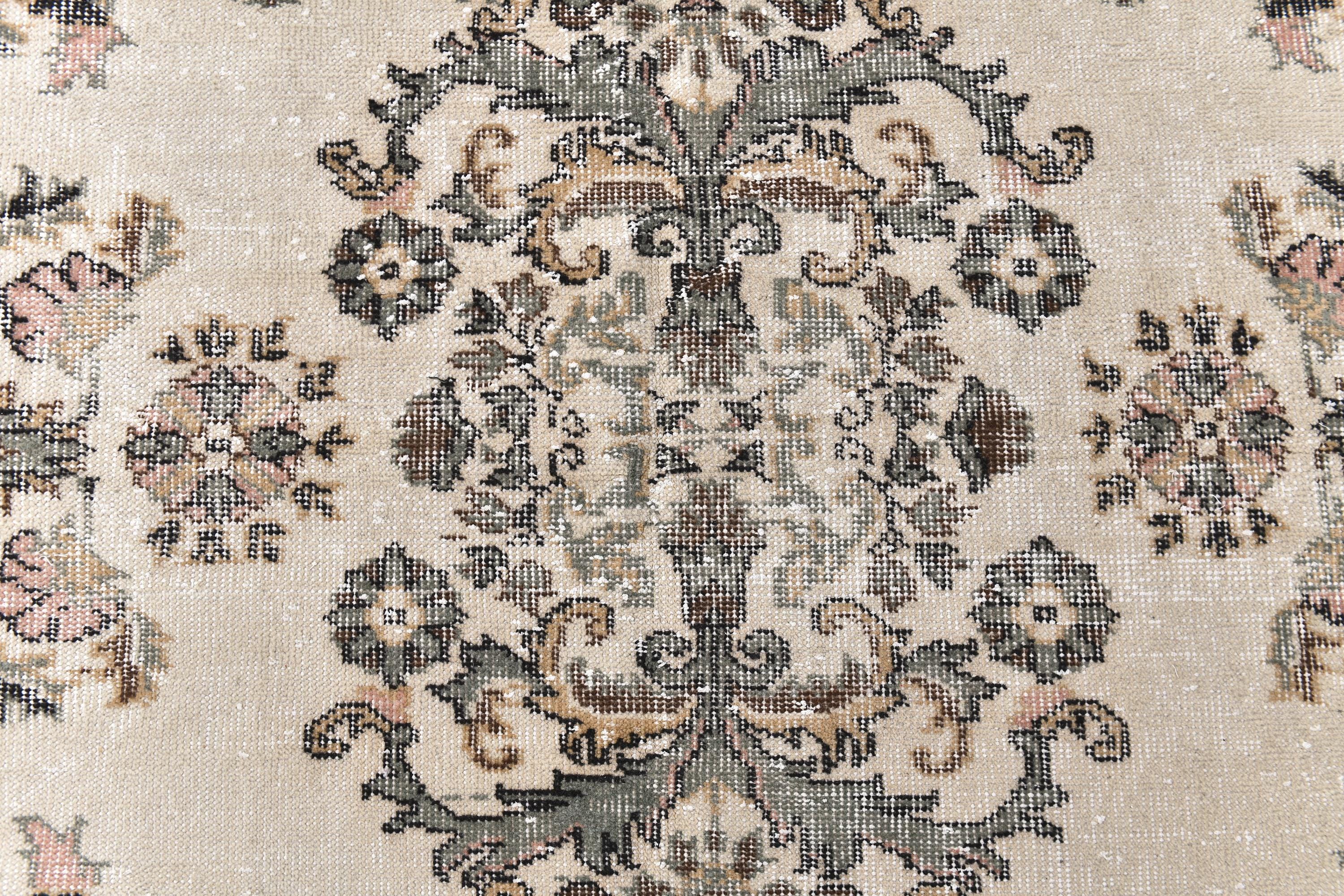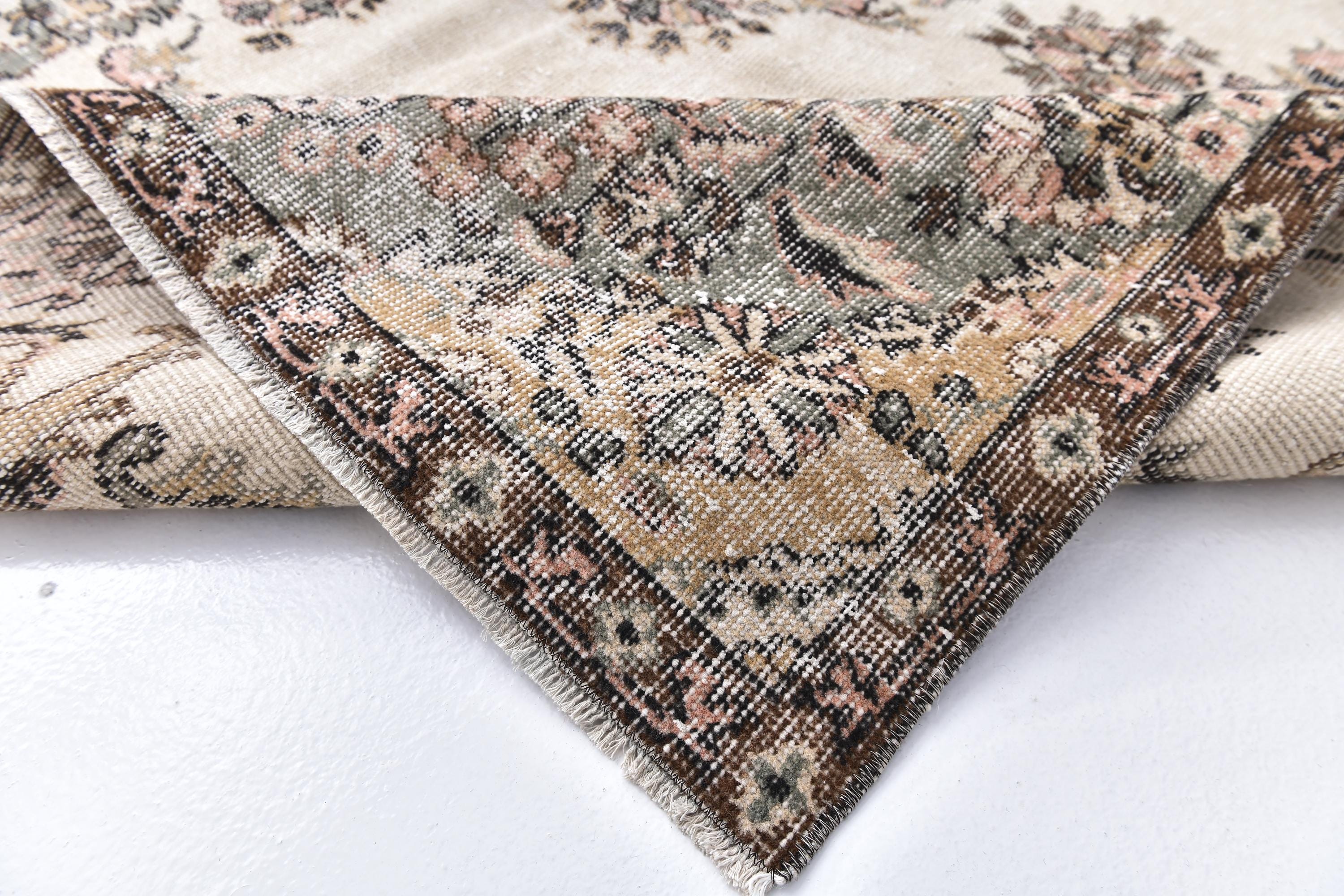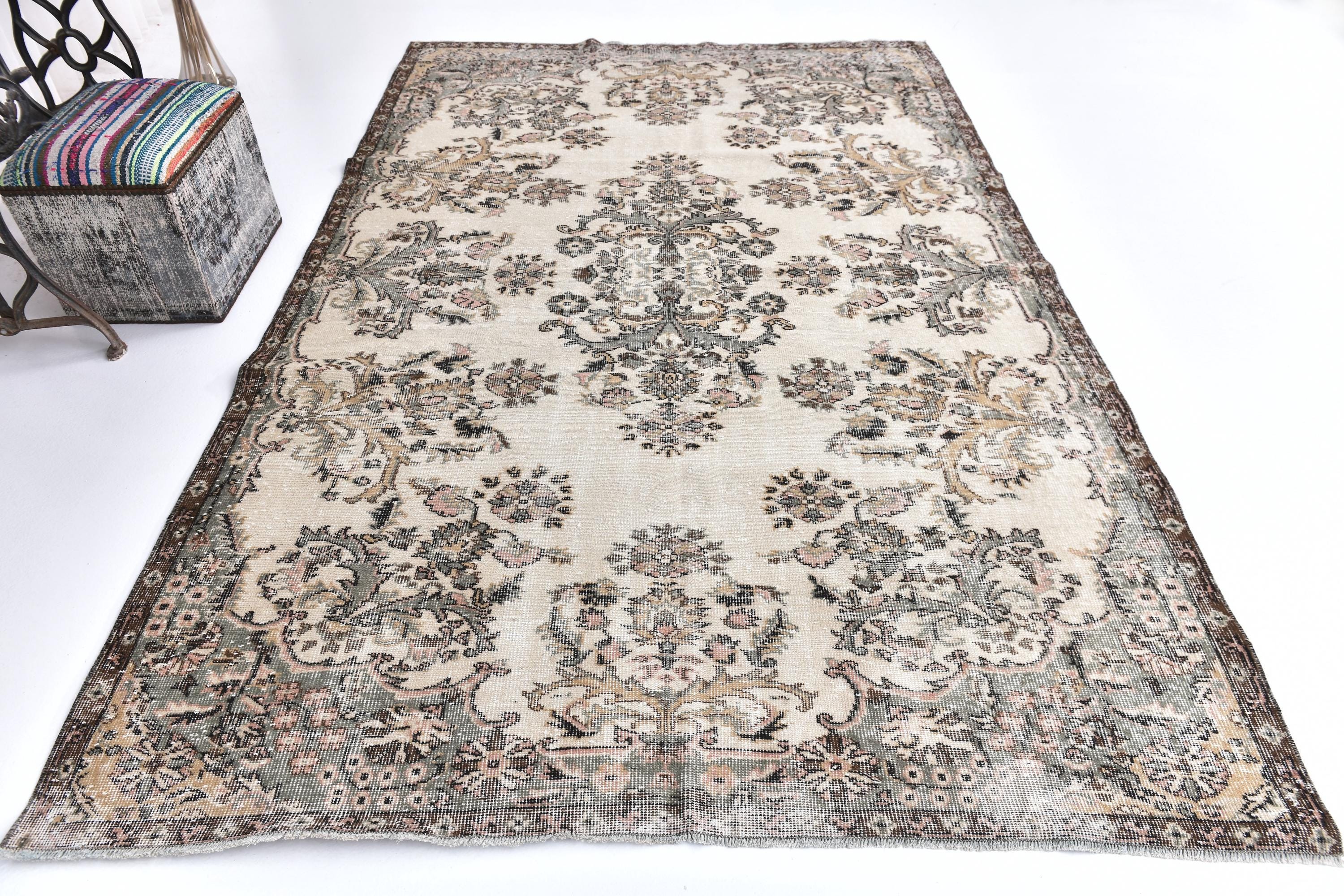 📜📌 Vintage Turkish area rug featuring brown and sage green colors with traditional floral medallion center and ornate border design. Hand-knotted distressed wool carpet with faded antique appearance and ivory cream accents, perfect for bohemian, vintage or eclectic interior decor