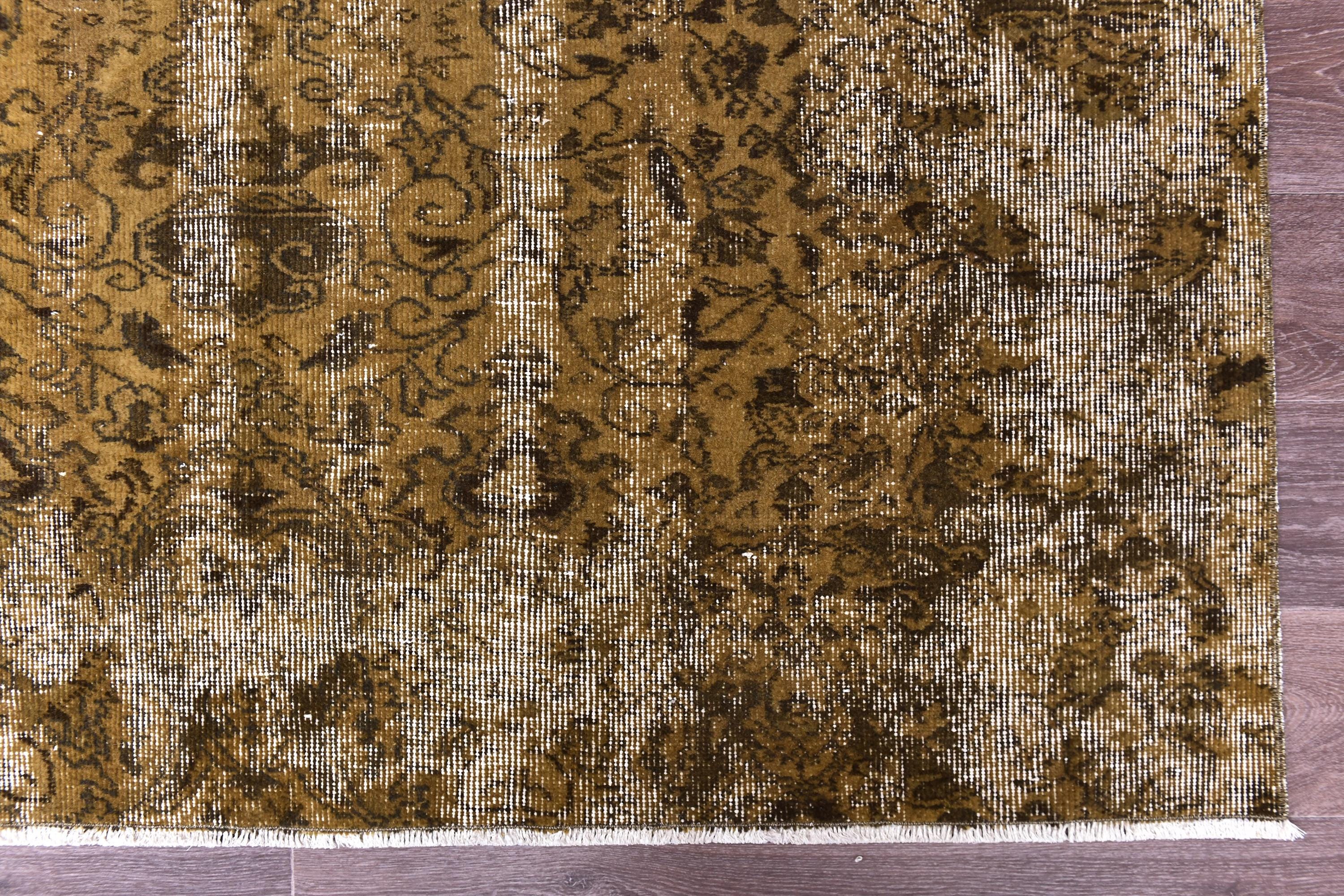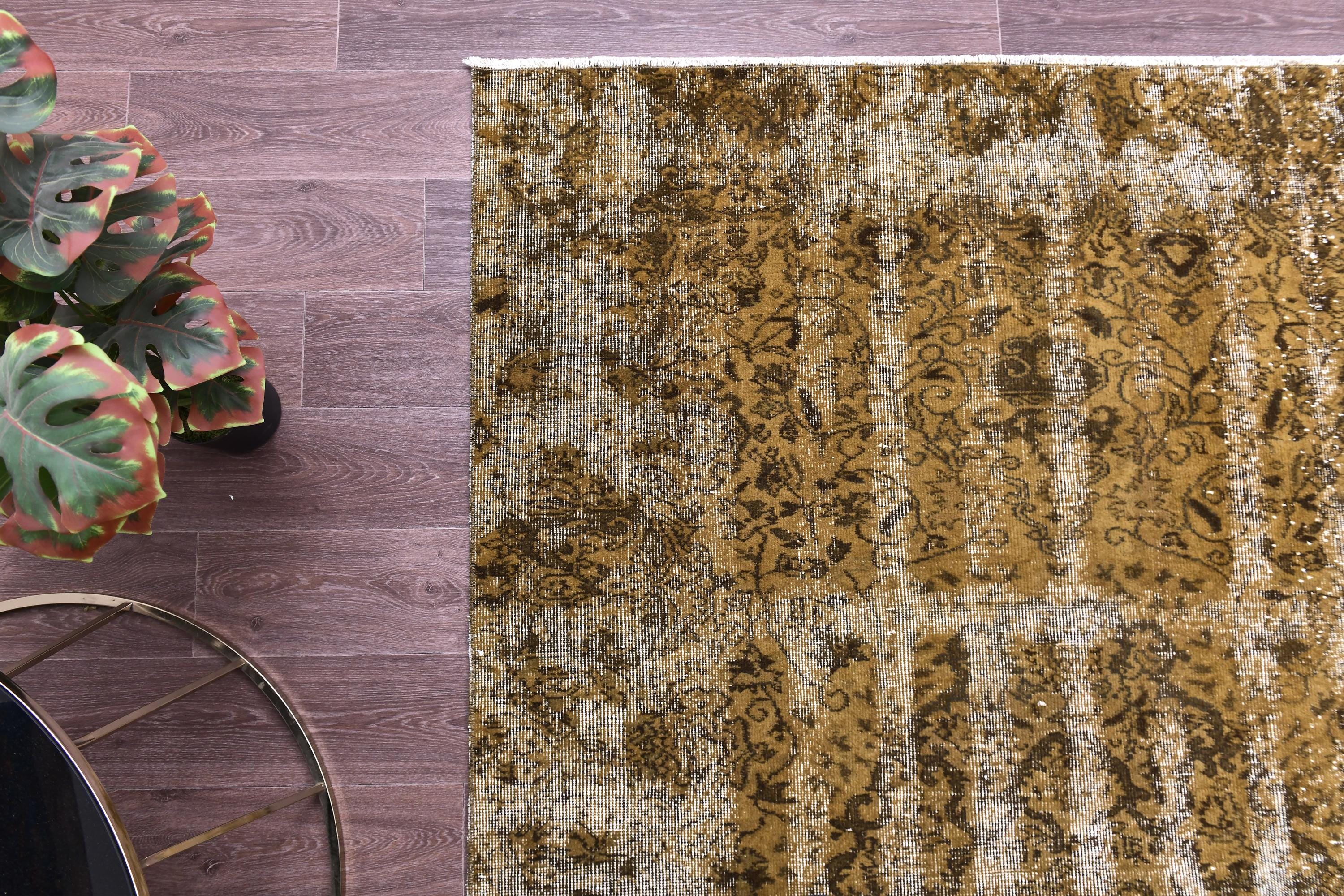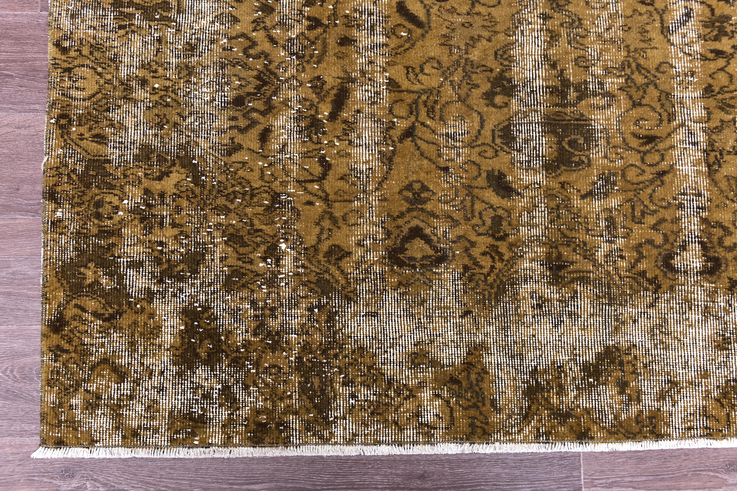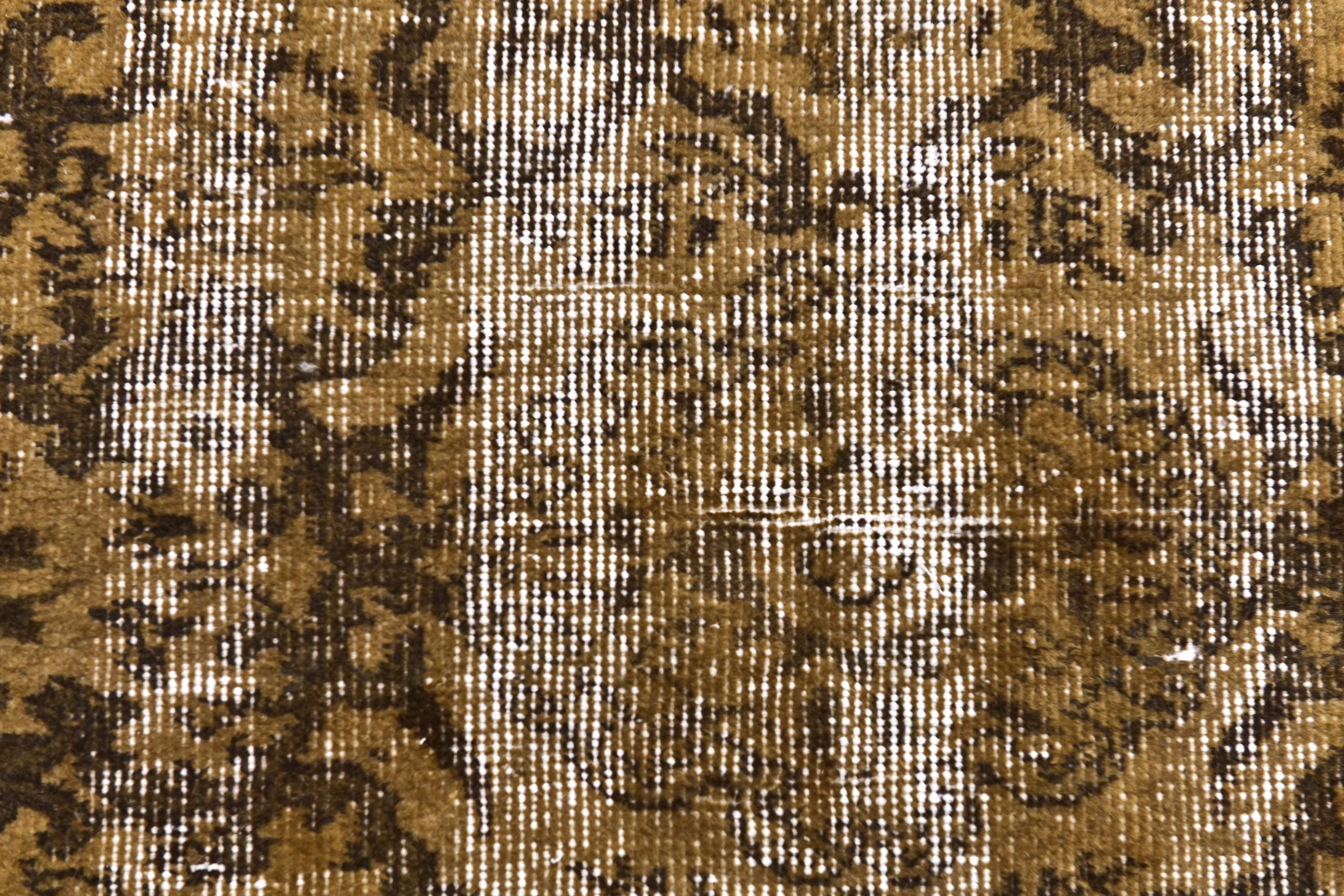 📜📌 Vintage Turkish overdyed area rug featuring golden mustard and brown tones with distressed floral medallion patterns throughout. Hand-knotted wool carpet with weathered appearance, cream-colored abrash effects, and traditional Oriental border design. Perfect for bohemian or eclectic interior spaces.