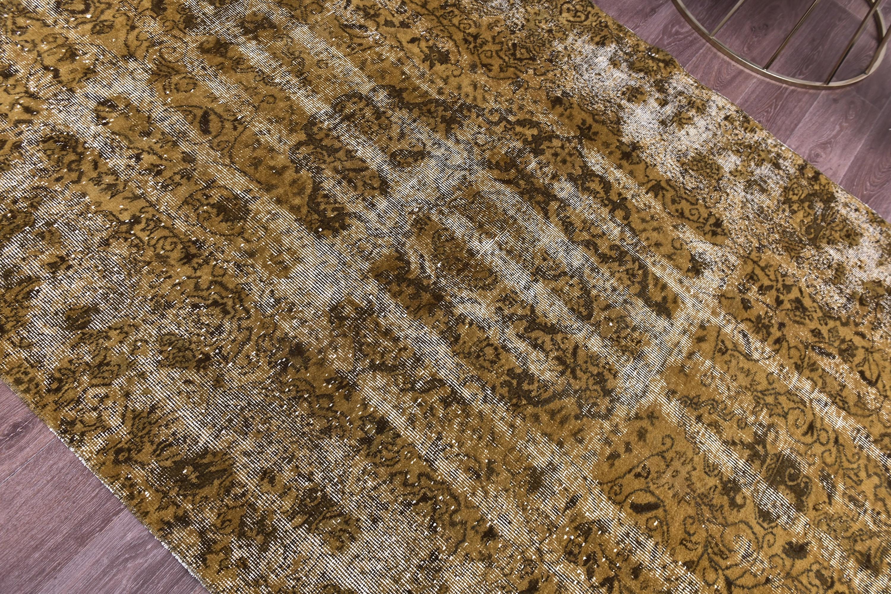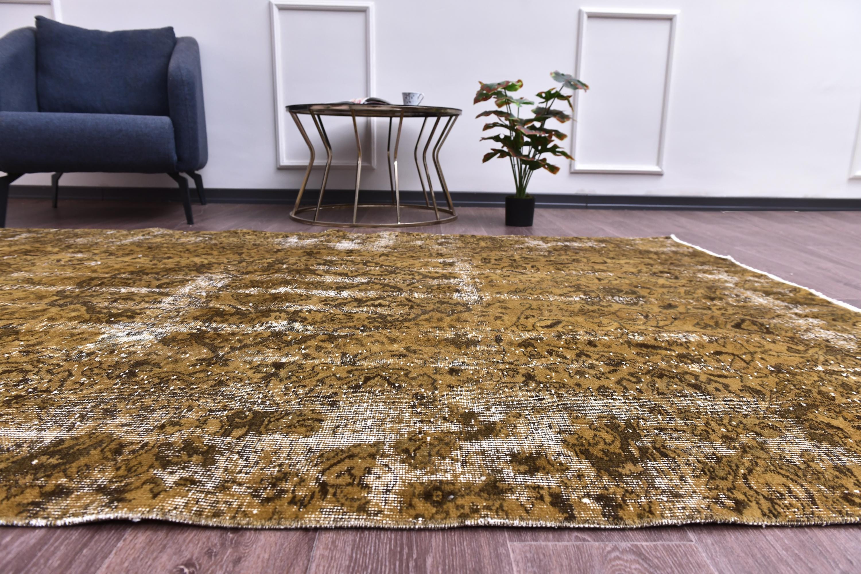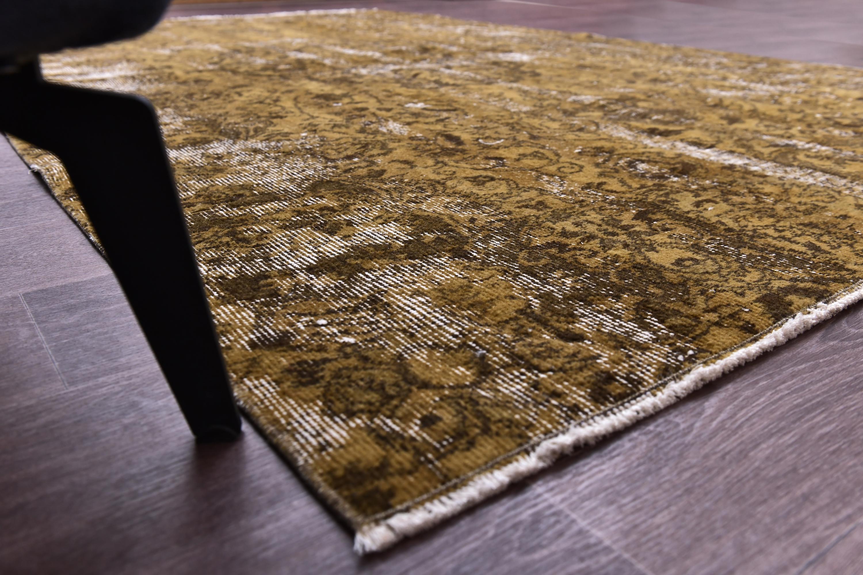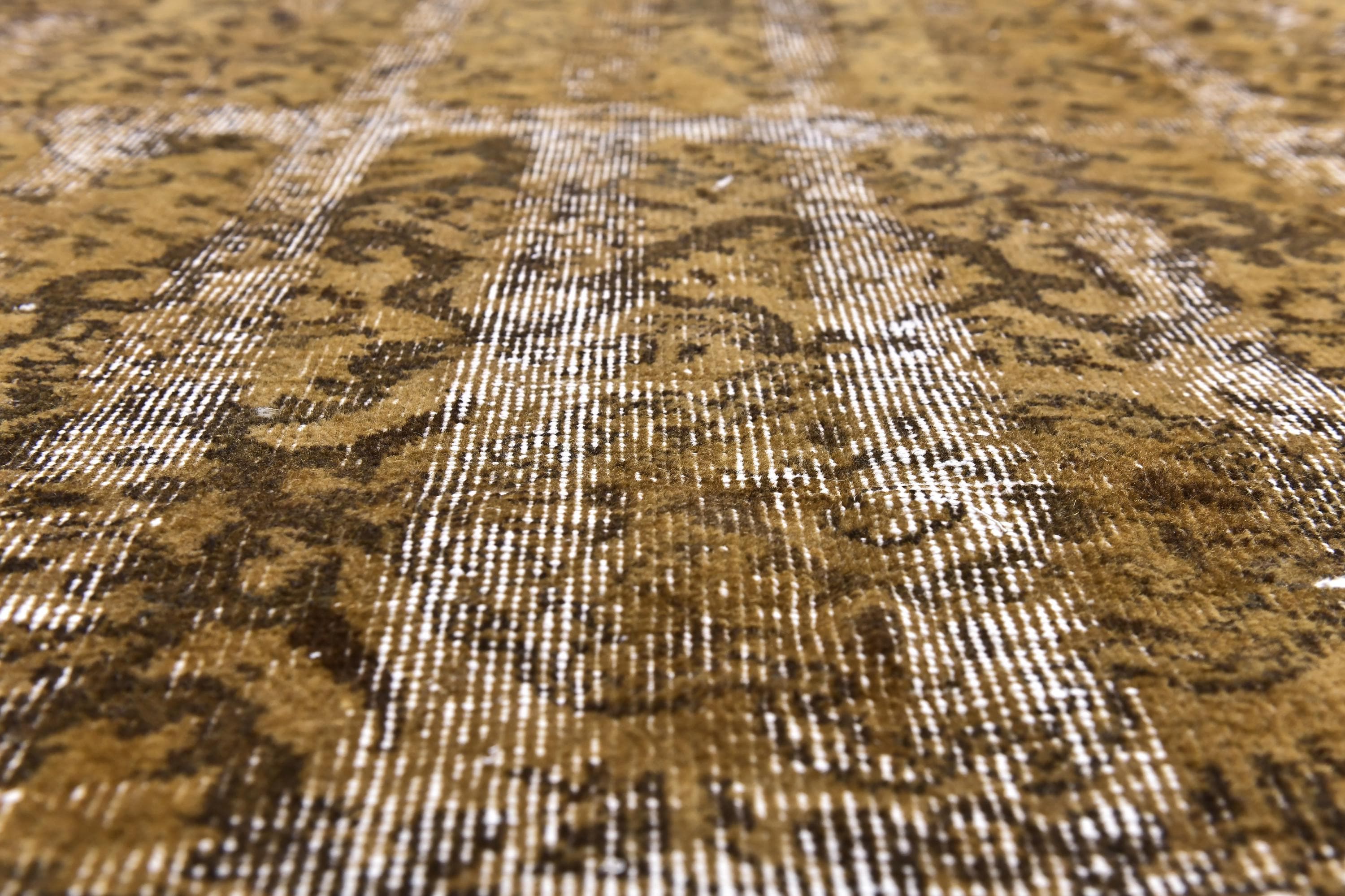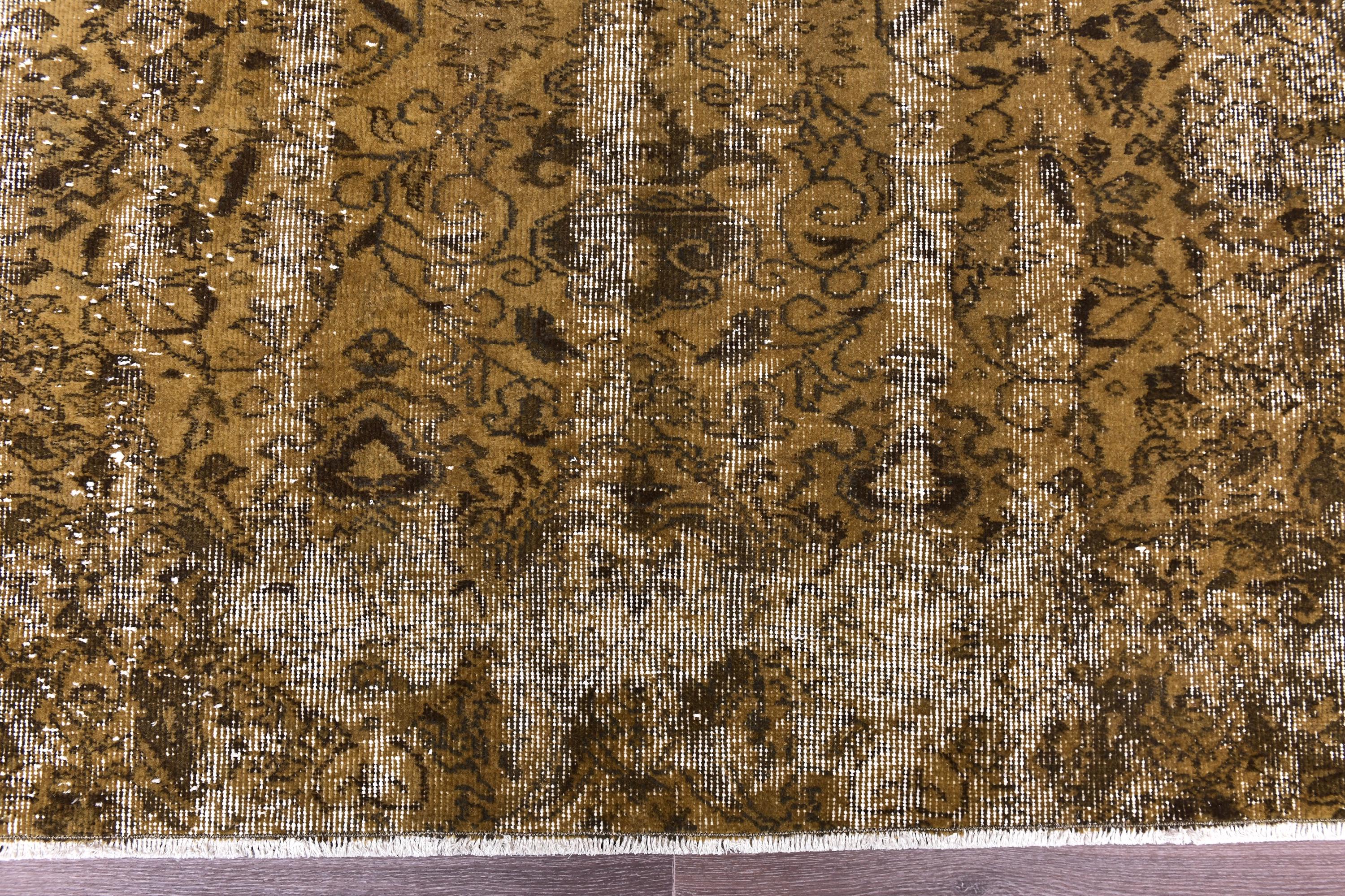📜📌 Vintage Turkish overdyed area rug featuring golden mustard and brown tones with distressed floral medallion patterns throughout. Hand-knotted wool carpet with weathered appearance, cream-colored abrash effects, and traditional Oriental border design. Perfect for bohemian or eclectic interior spaces.