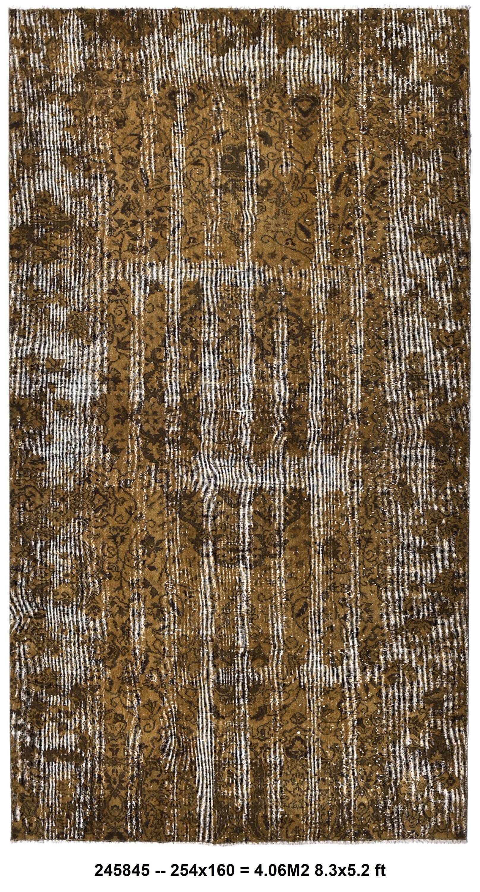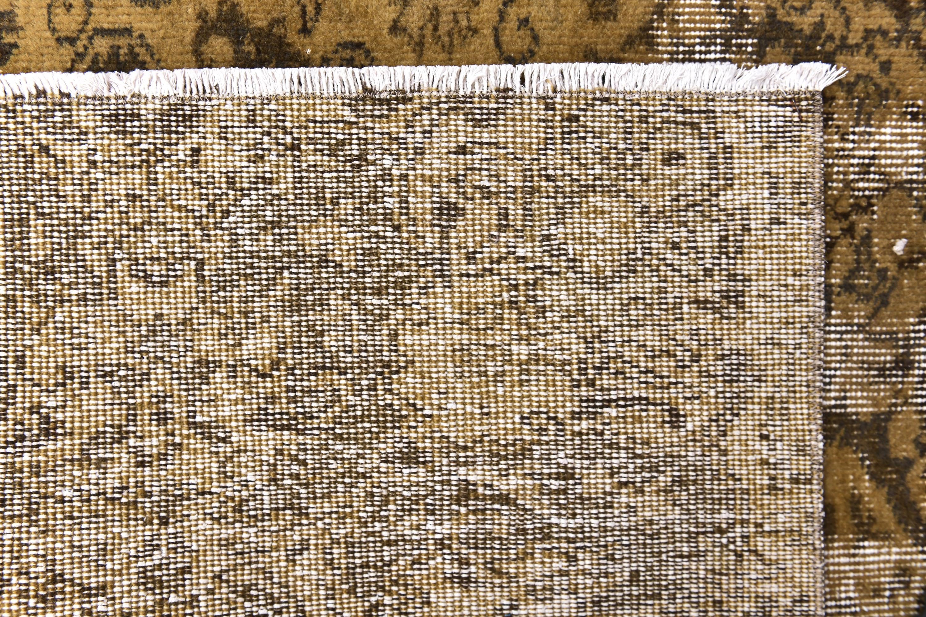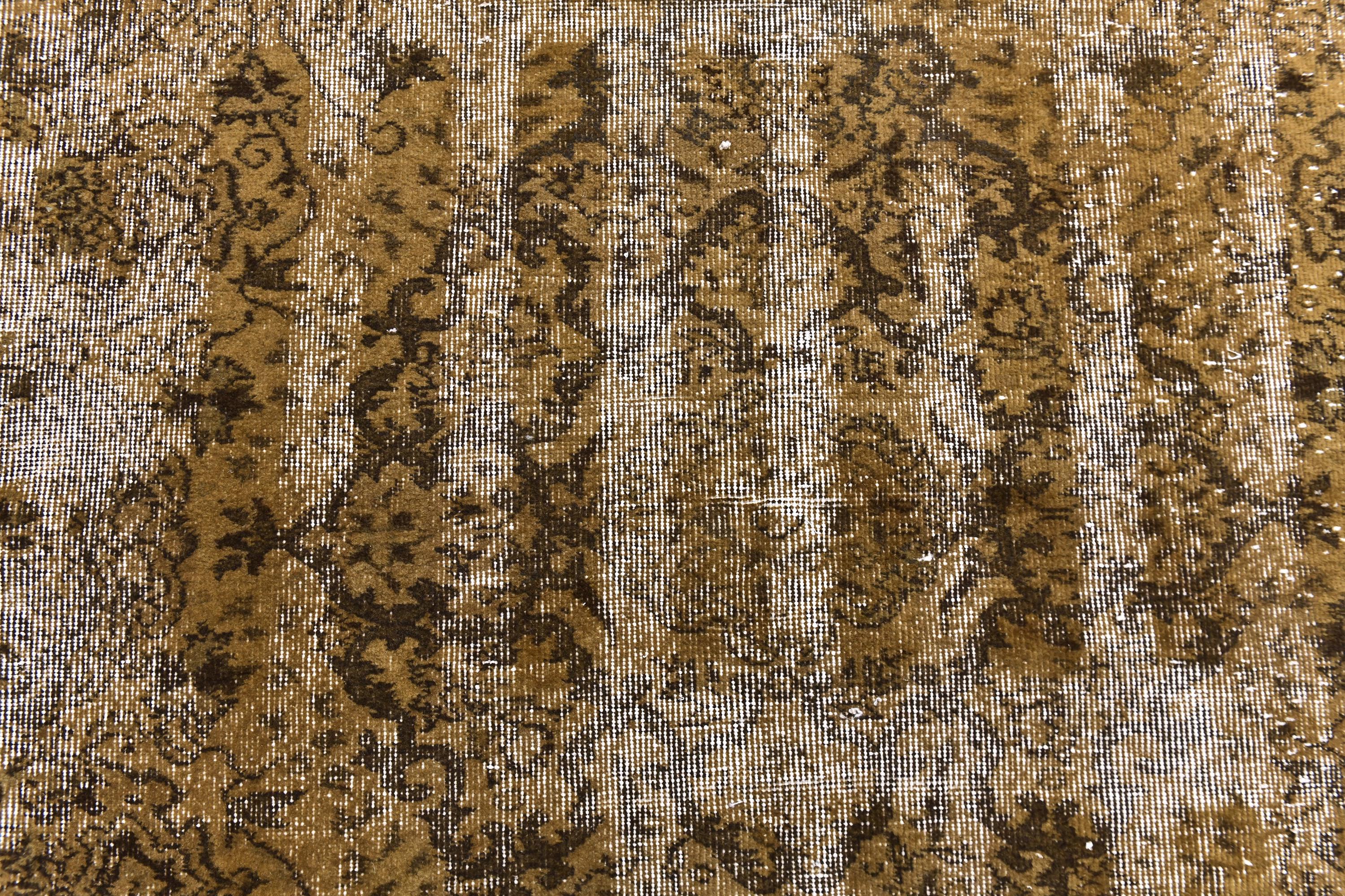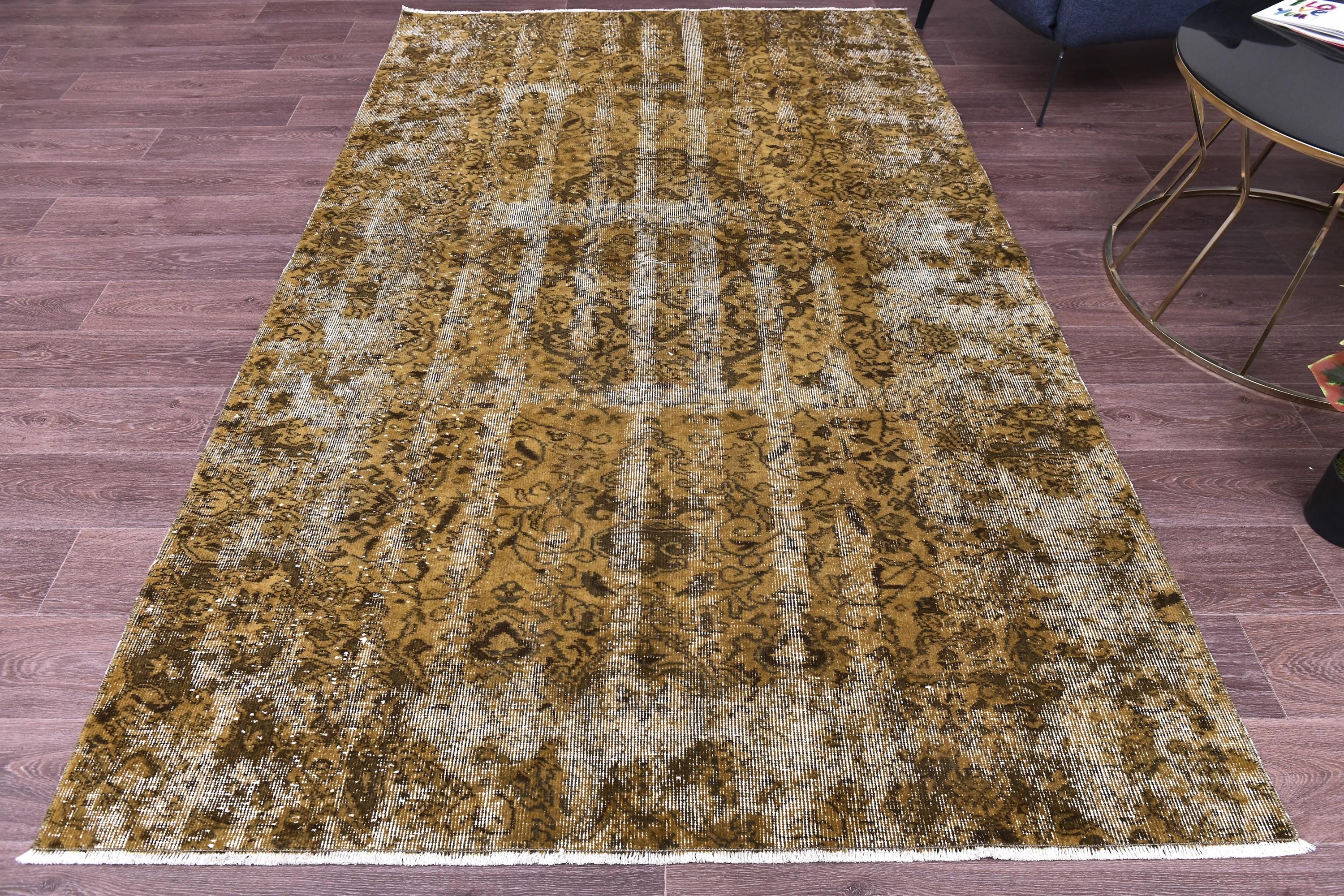 📜📌 Vintage Turkish overdyed area rug featuring golden mustard and brown tones with distressed floral medallion patterns throughout. Hand-knotted wool carpet with weathered appearance, cream-colored abrash effects, and traditional Oriental border design. Perfect for bohemian or eclectic interior spaces.