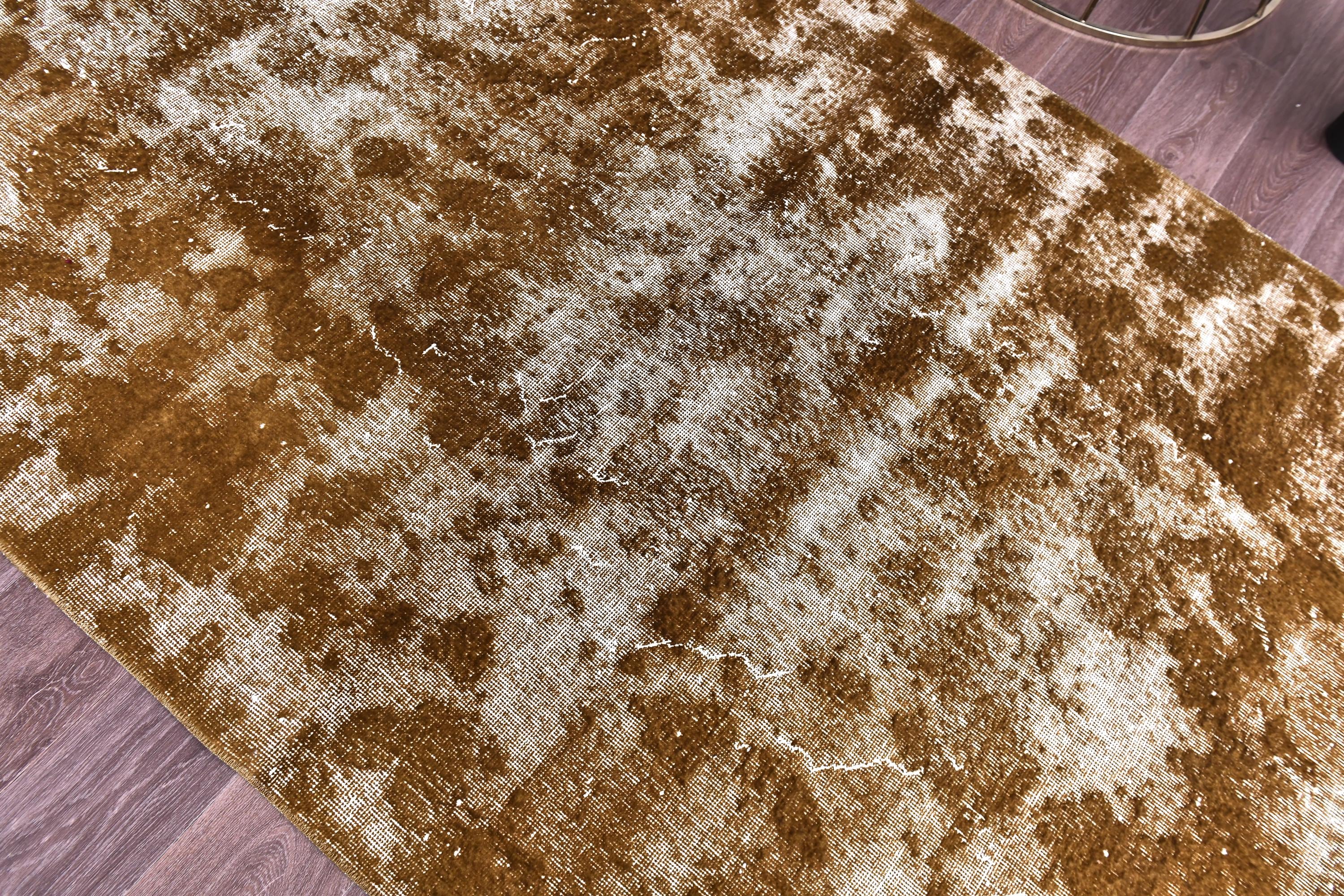 📜📌 Vintage Turkish overdyed area rug in rich mustard gold and cream colors featuring distressed traditional floral medallion patterns. Hand-knotted wool Oushak carpet with worn antique appearance, white fringe edges, displayed on dark wood floor next to modern gold furniture. Bohemian home decor.