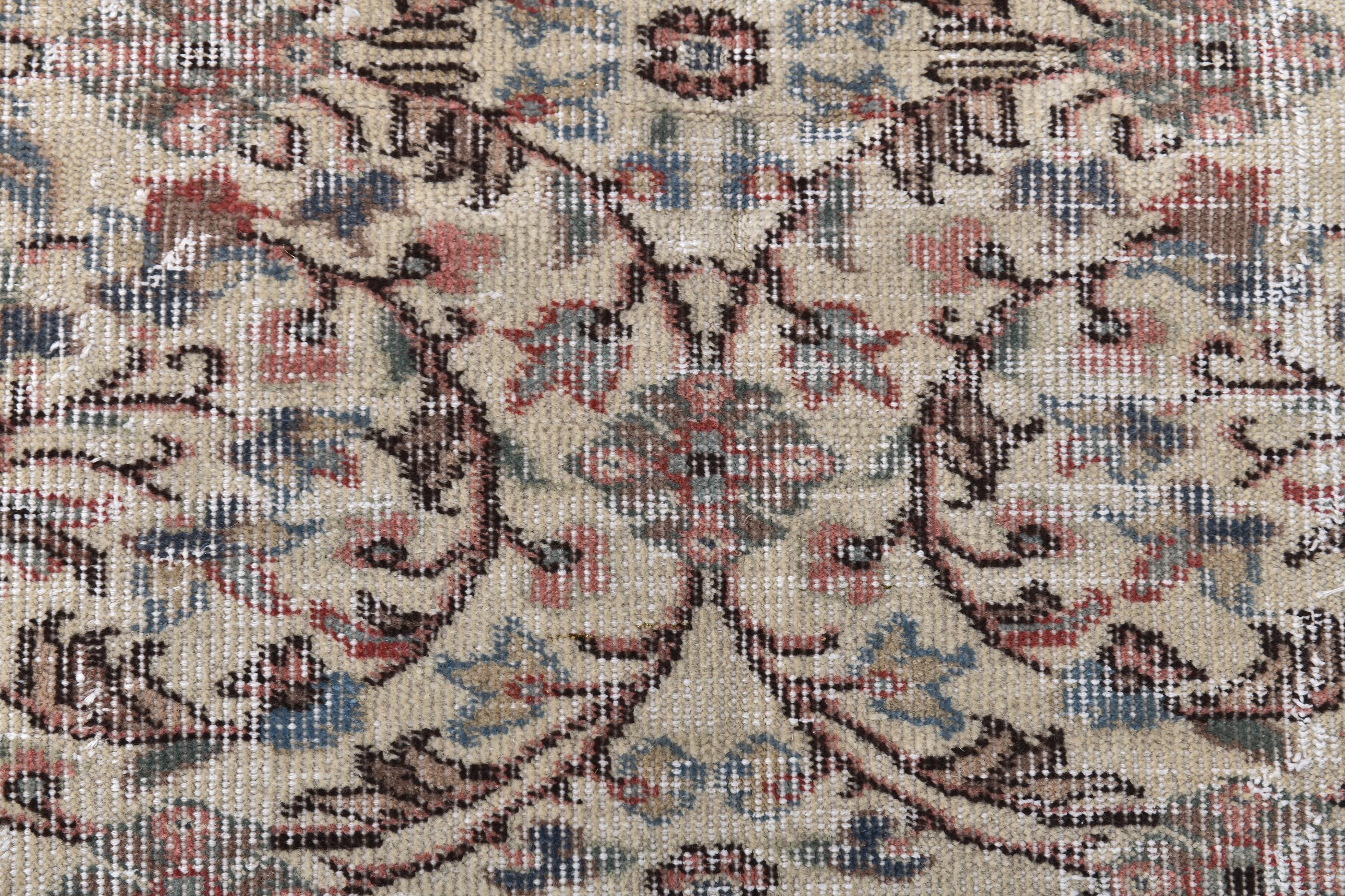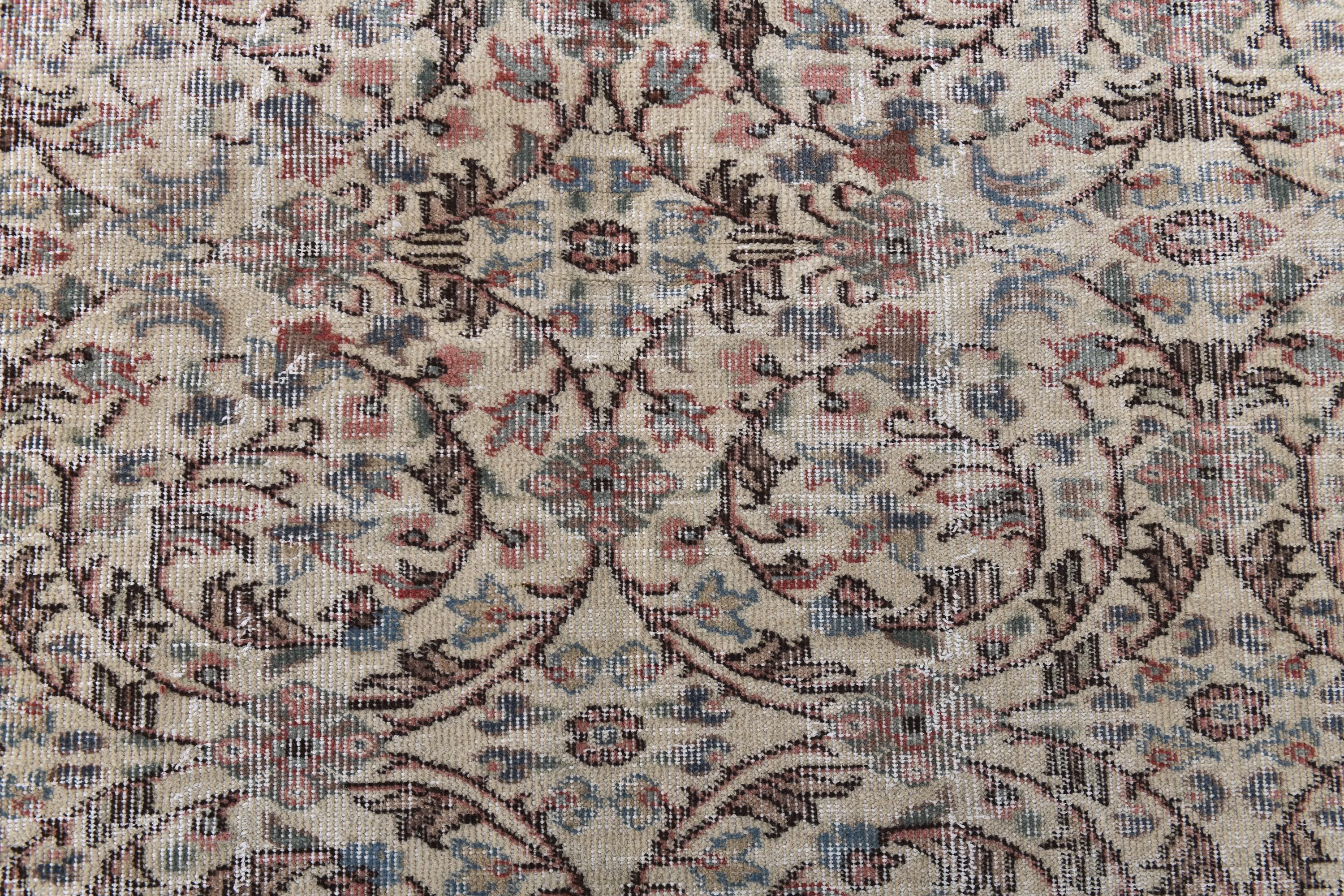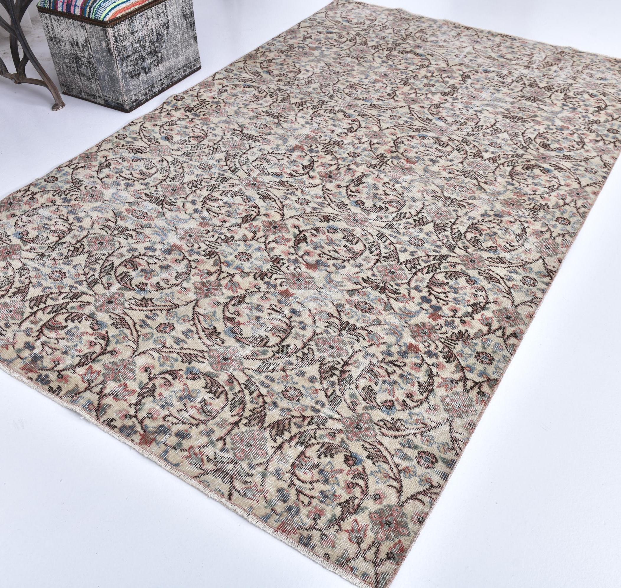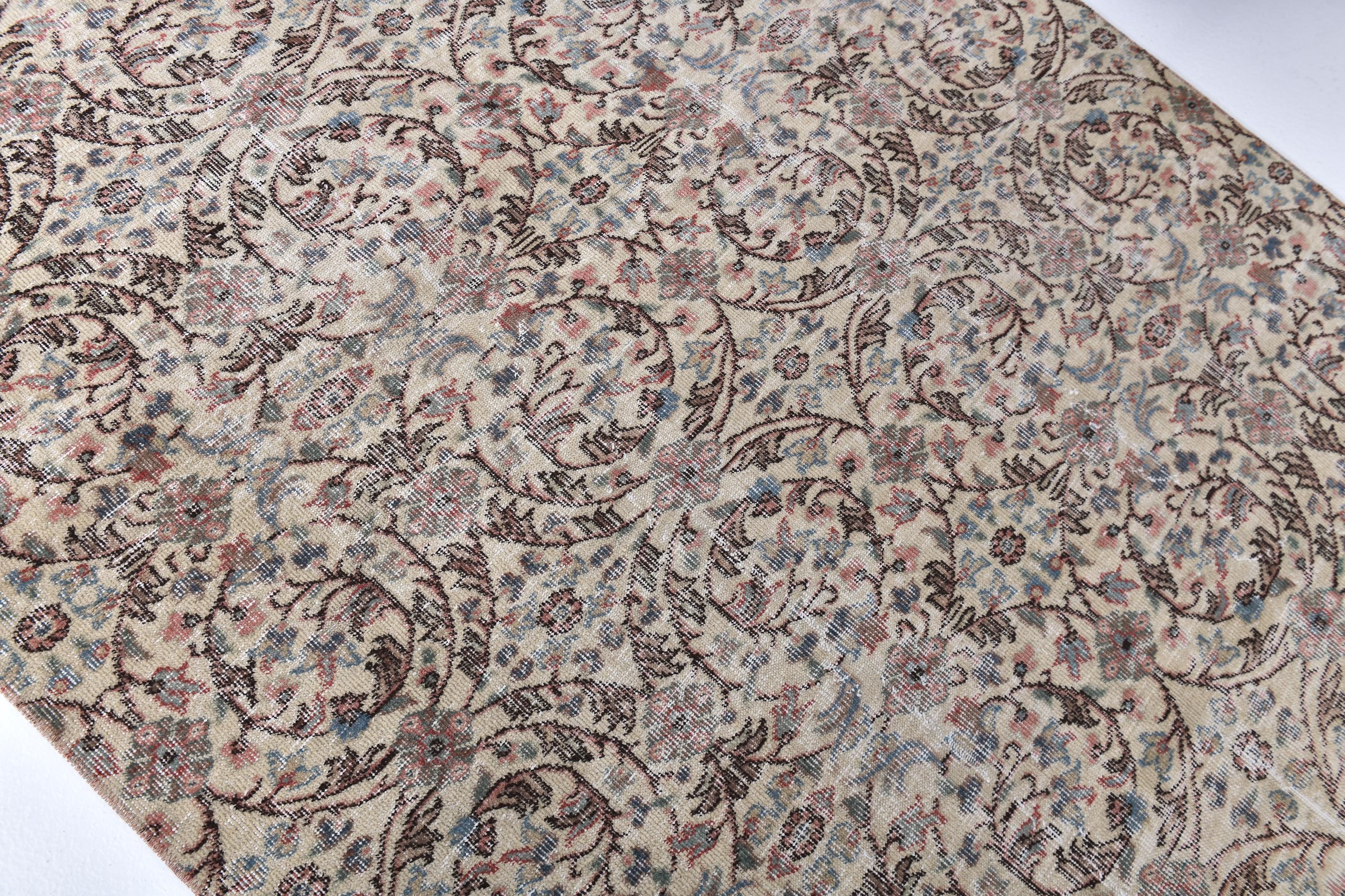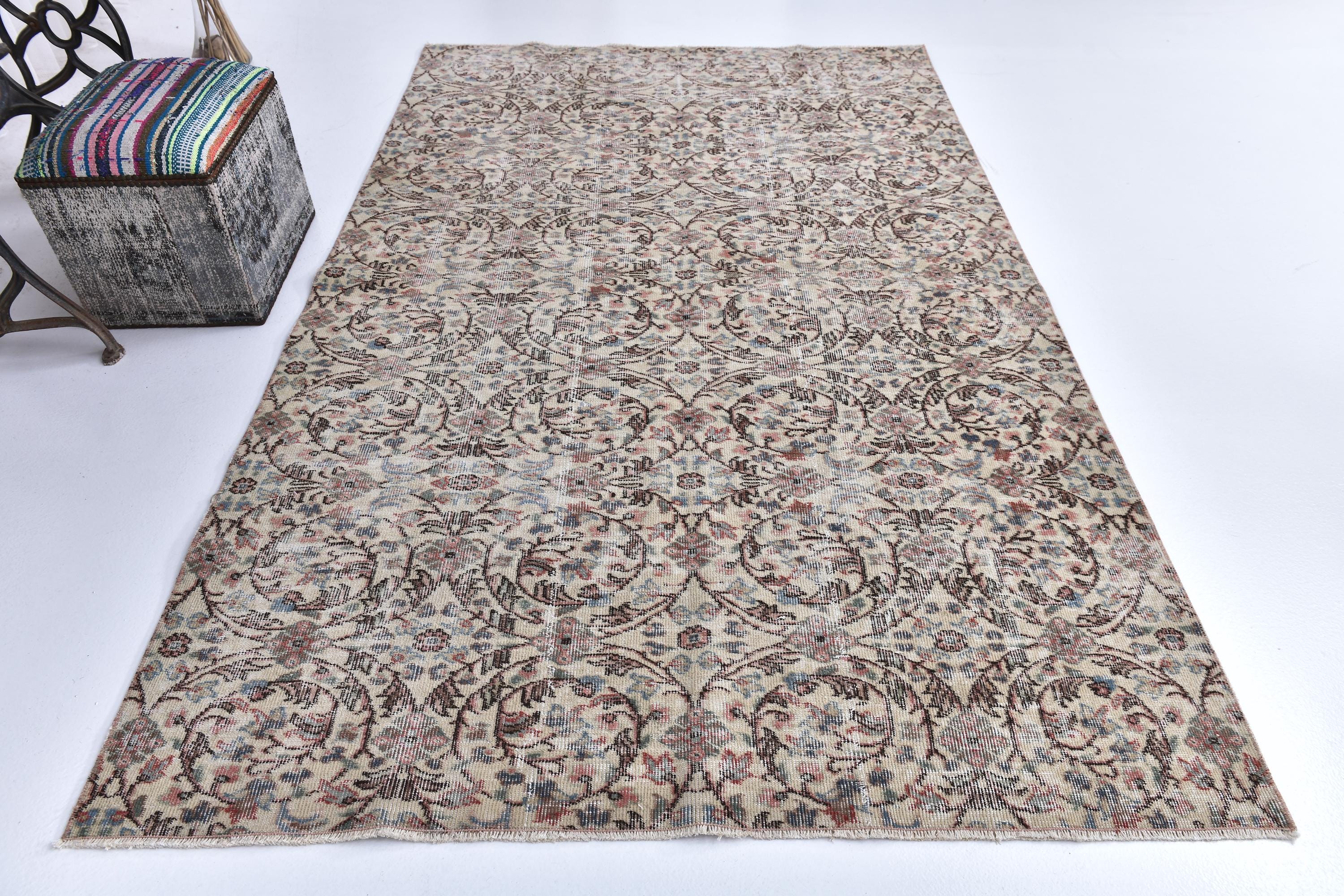 📜📌 Vintage Turkish distressed area rug in neutral beige, cream, and muted pastel tones featuring intricate all-over floral and arabesque patterns. Hand-knotted wool Paisley carpet with faded shabby chic appearance showing soft brown, pink, blue and sage green accents. Low-pile worn texture with antique patina, displayed on white background with decorative ottoman.