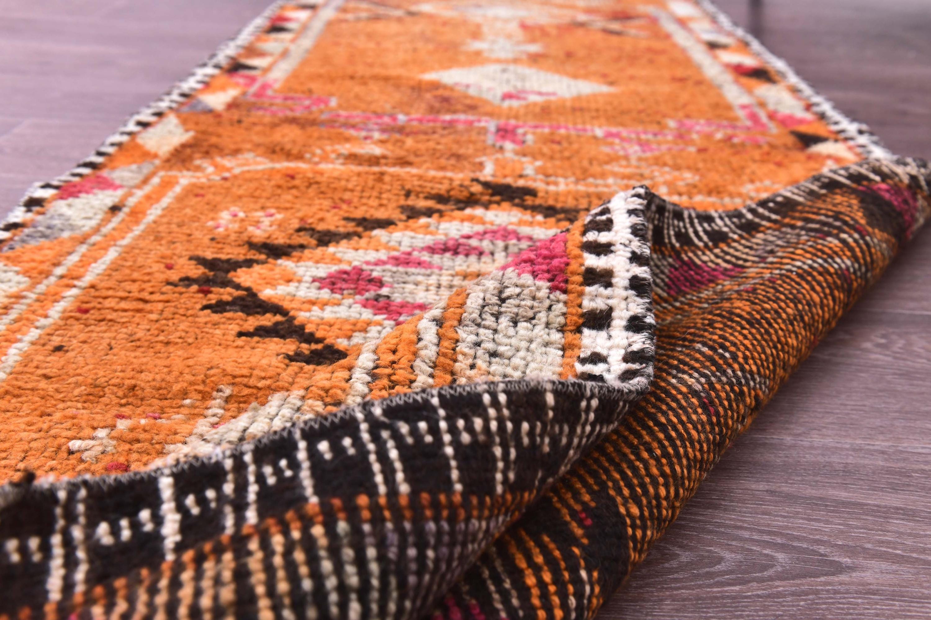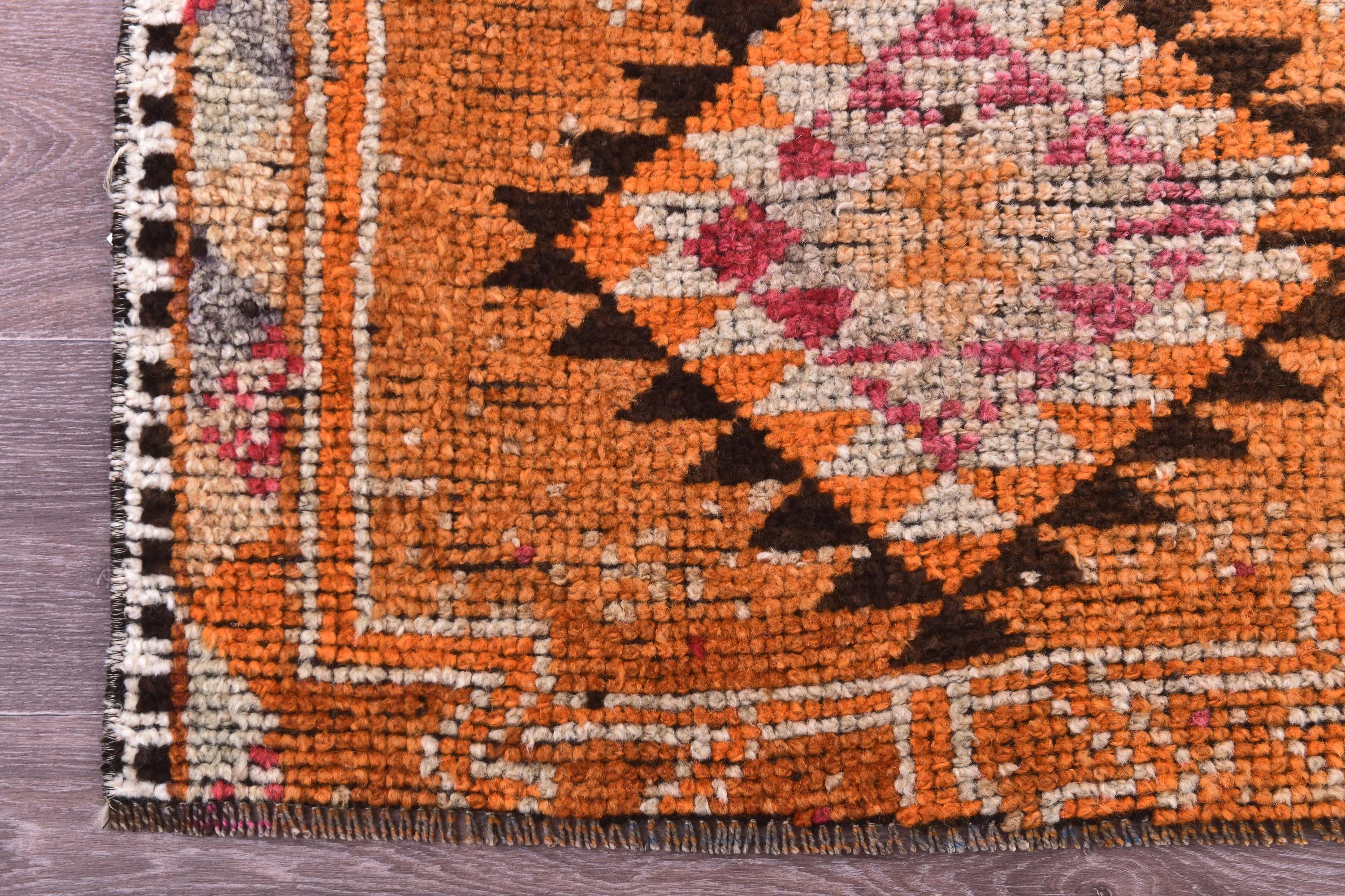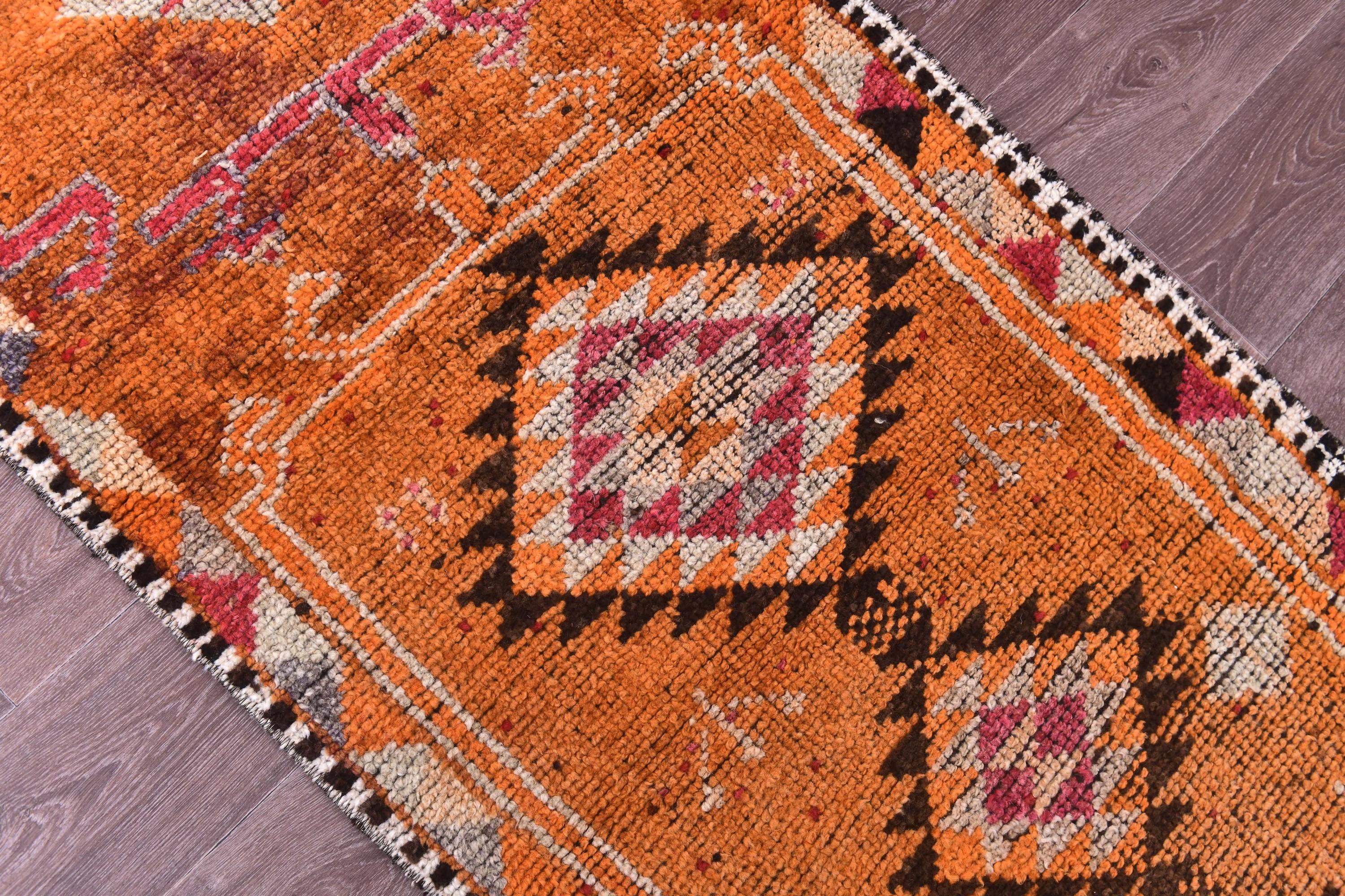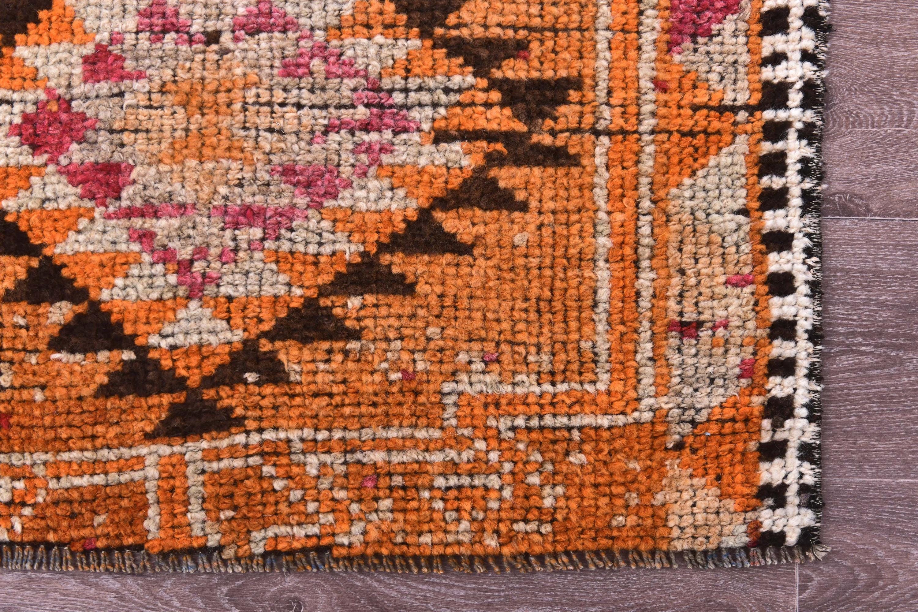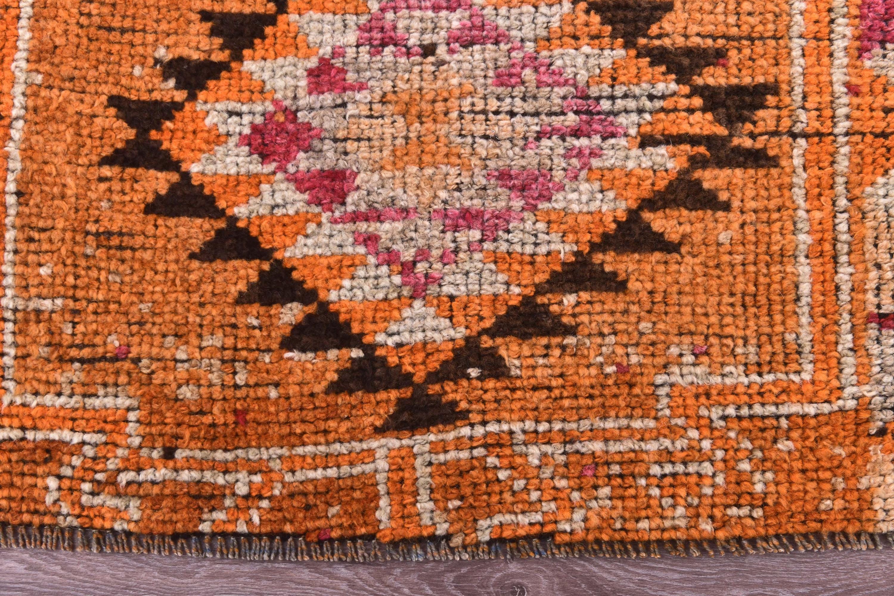 📜📌 Antique Anatolian hallway runner showcasing bold orange field with colorful geometric designs including diamond motifs, tribal symbols, and decorative borders in pink, cream, black accents, handwoven wool with authentic vintage character and patina