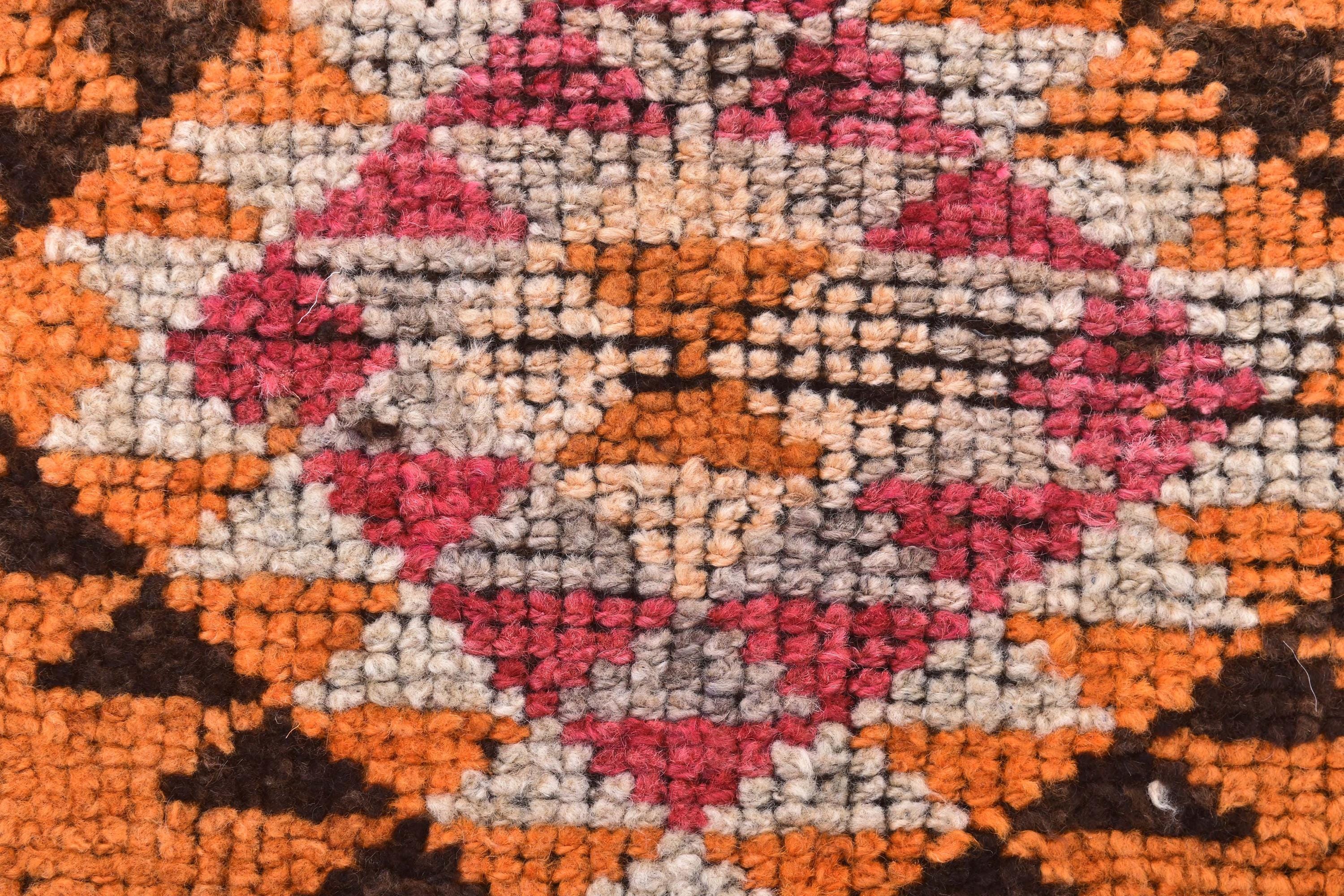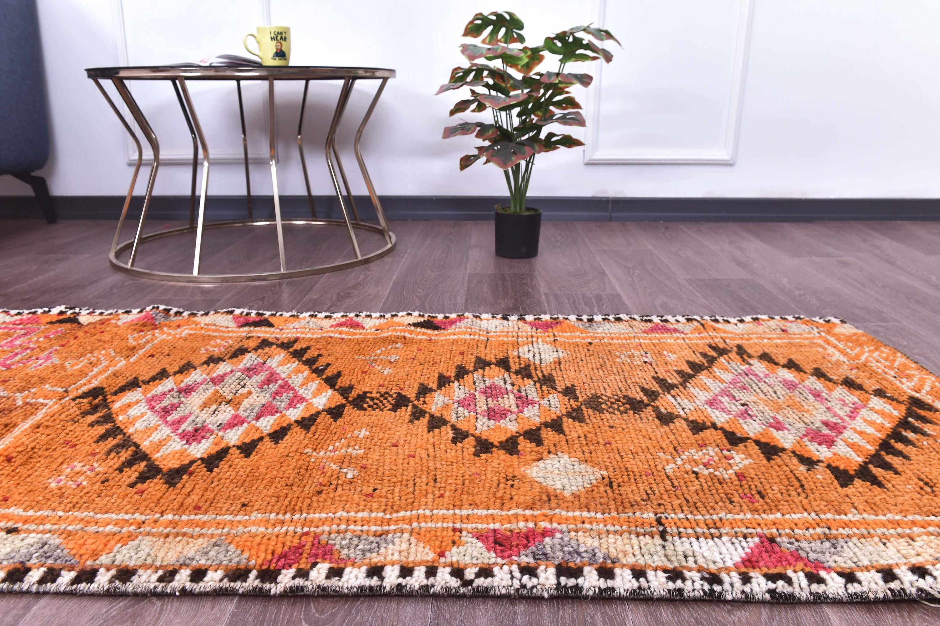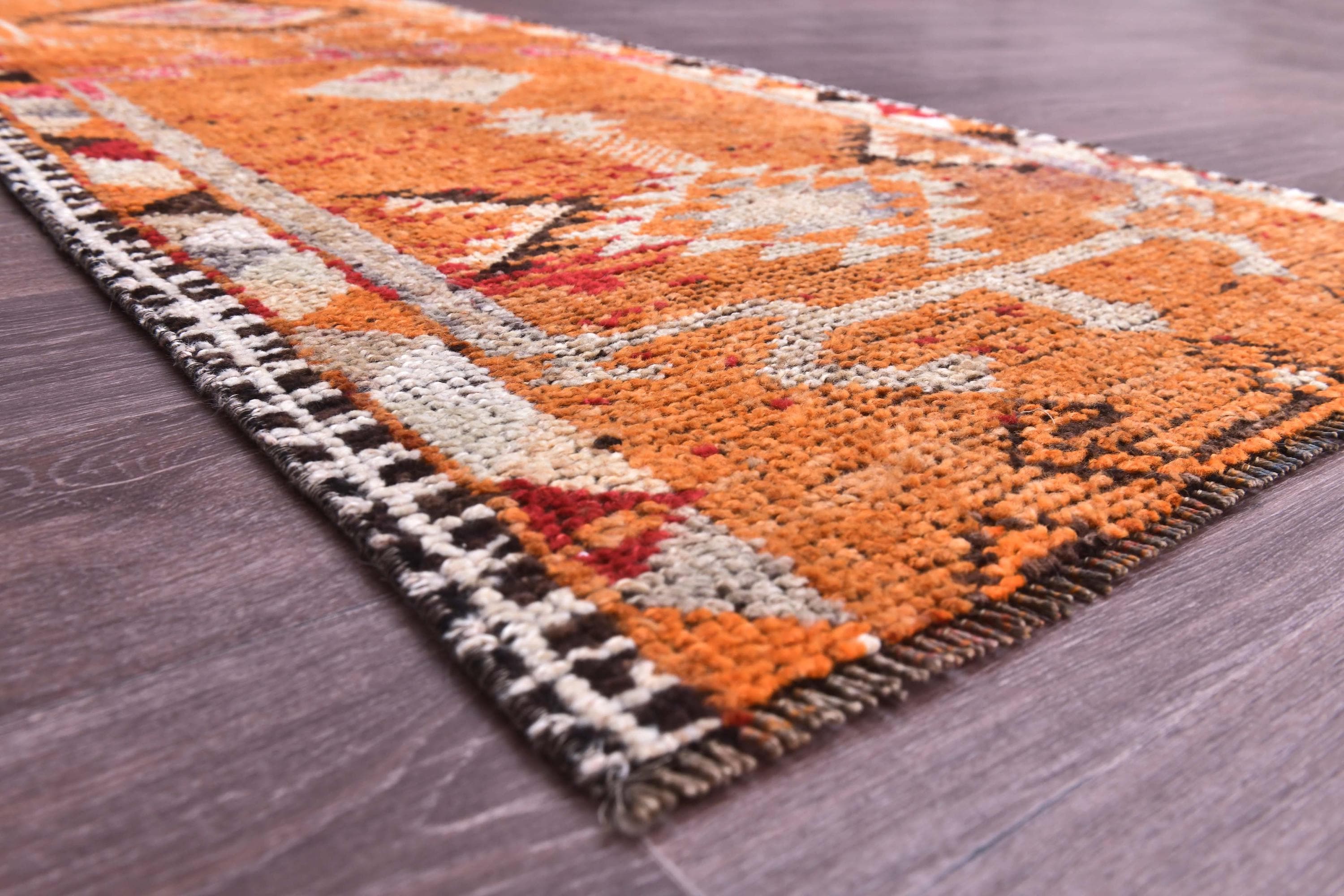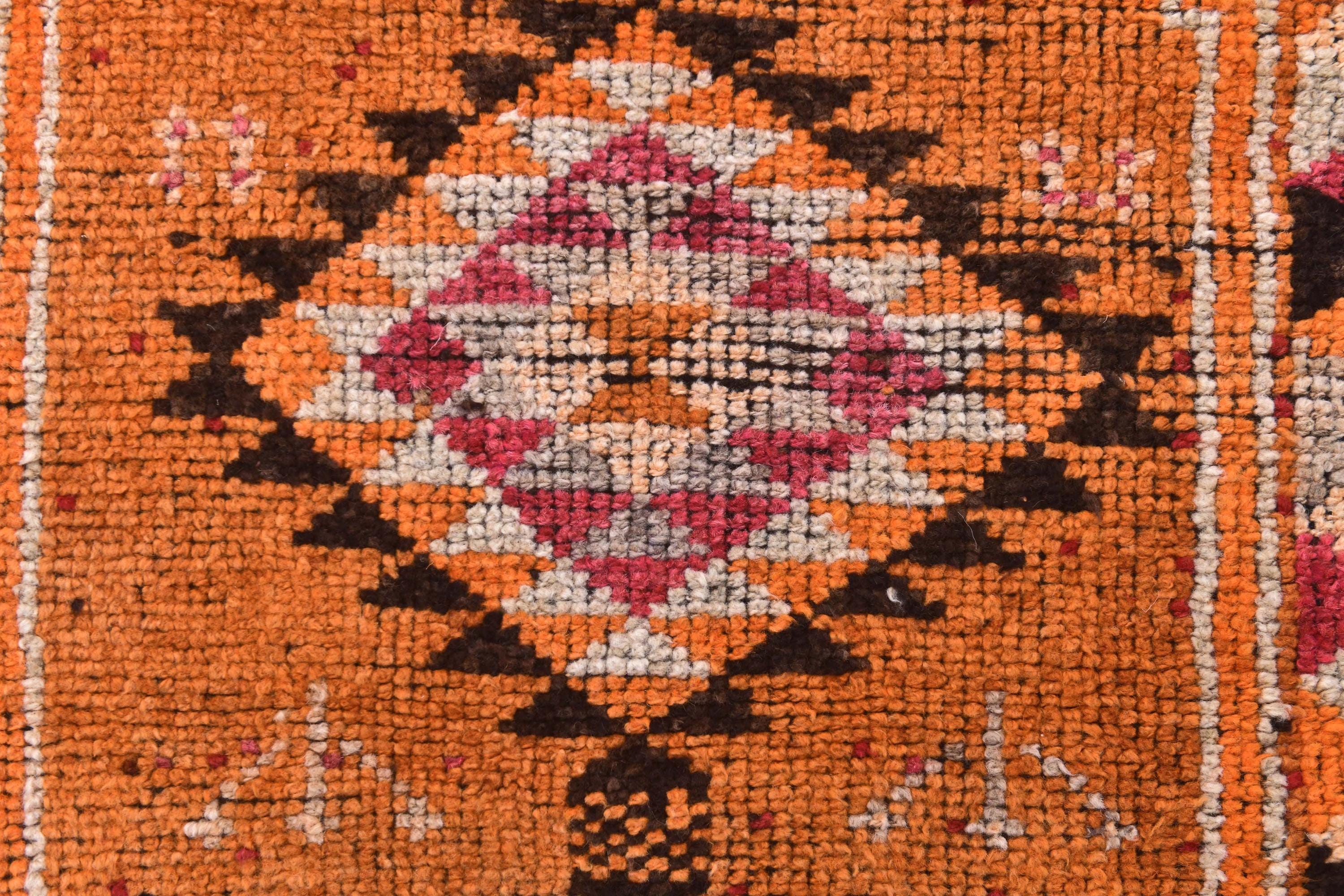 📜📌 Antique Anatolian hallway runner showcasing bold orange field with colorful geometric designs including diamond motifs, tribal symbols, and decorative borders in pink, cream, black accents, handwoven wool with authentic vintage character and patina