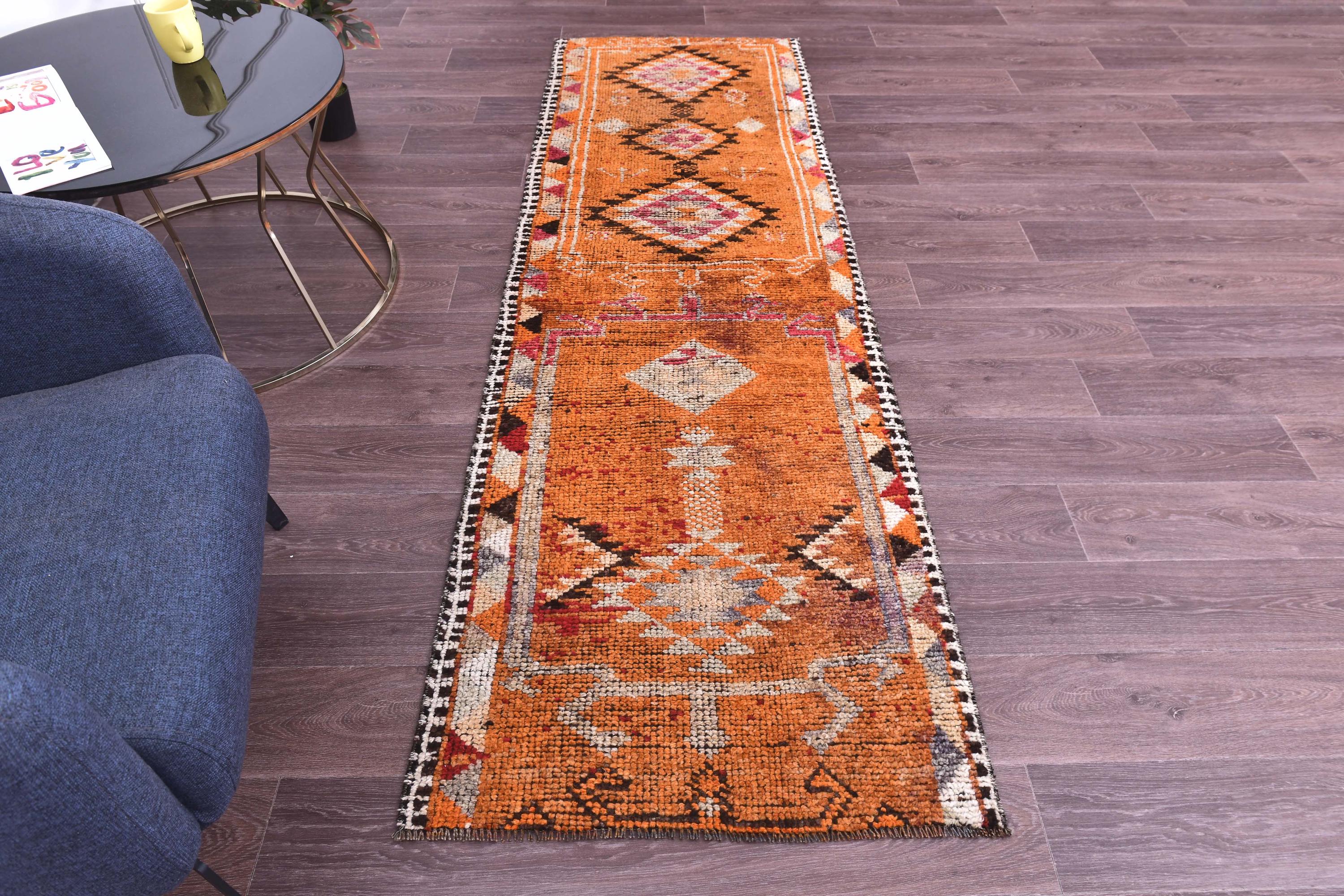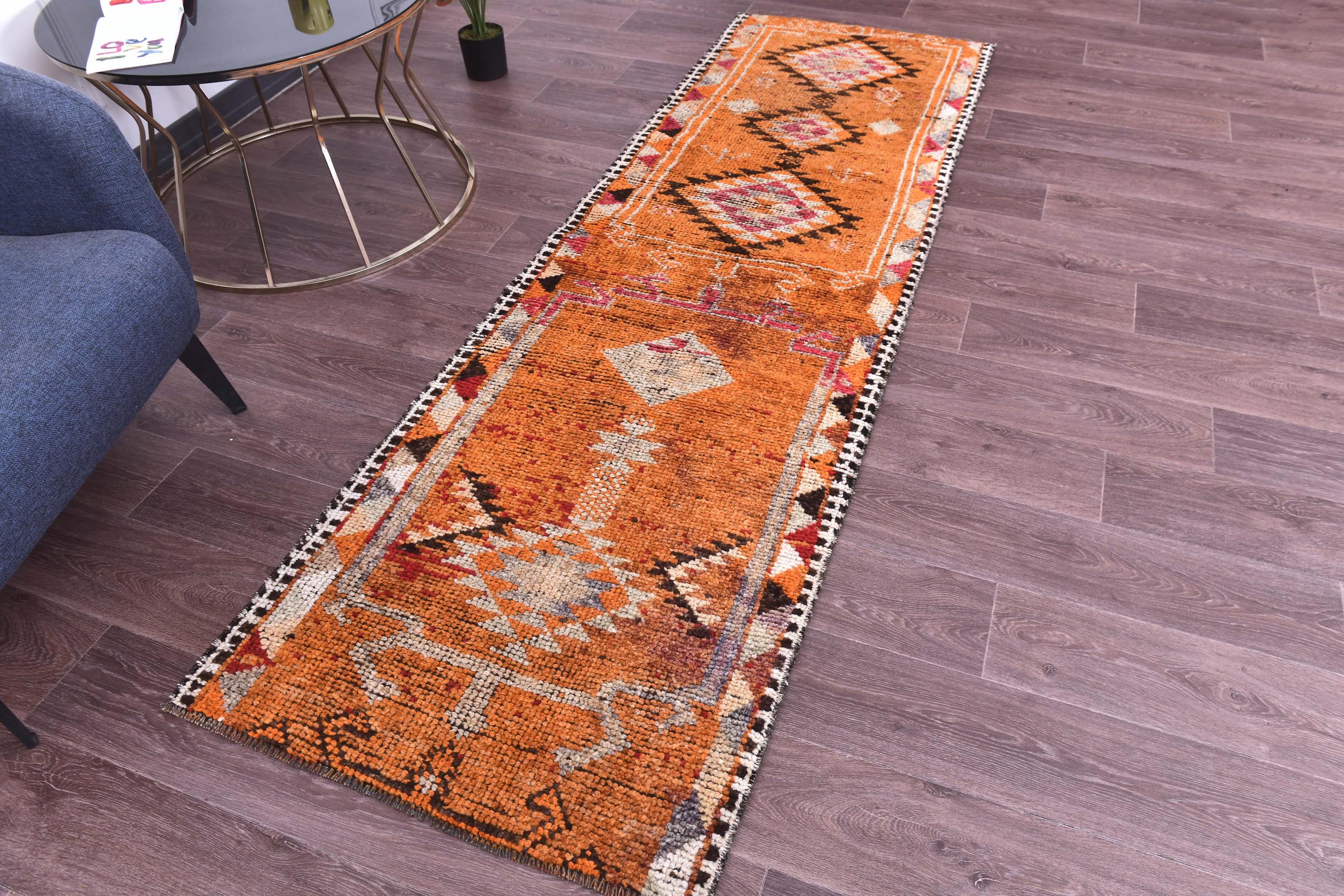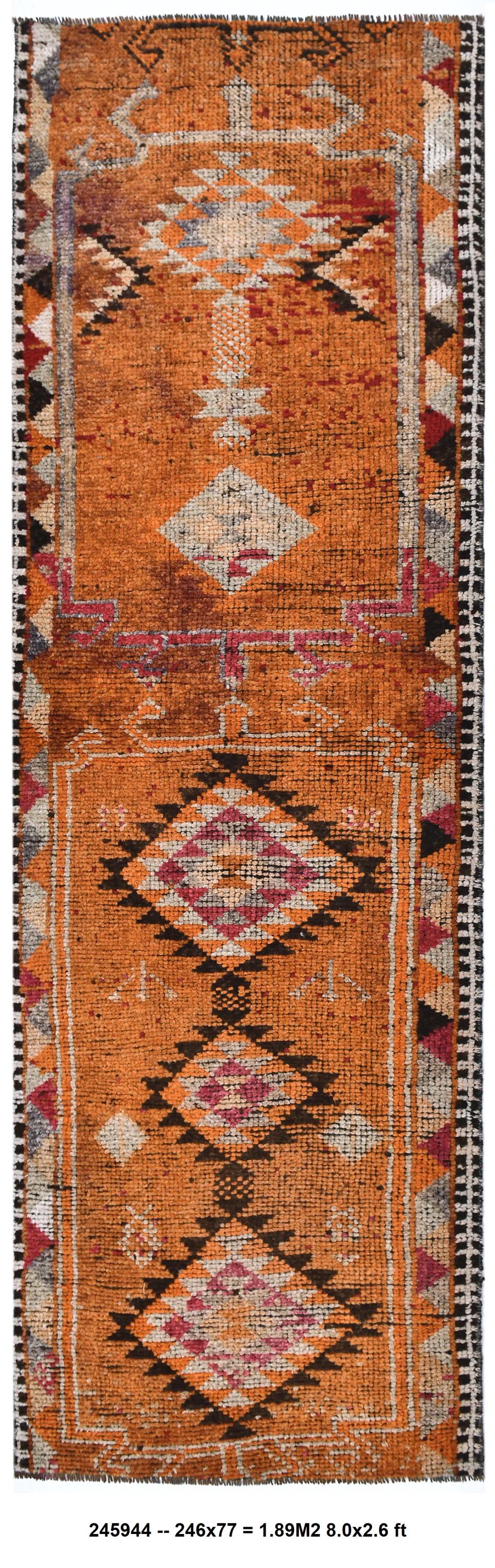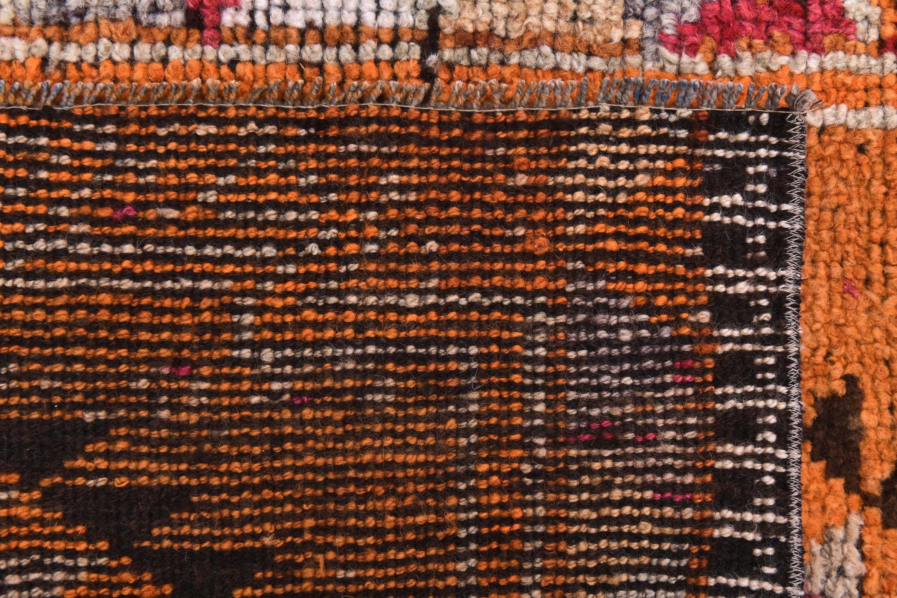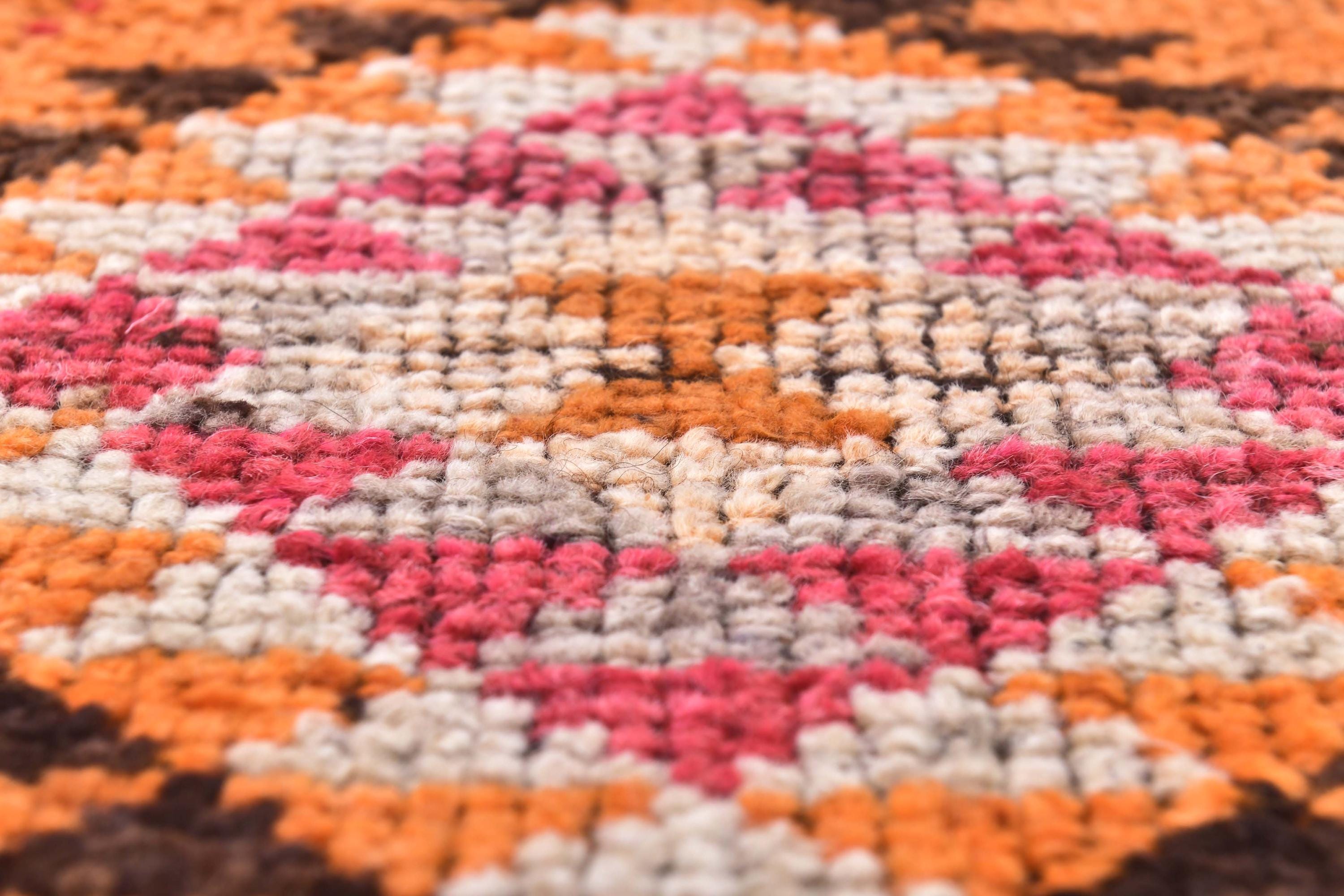 📜📌 Antique Anatolian hallway runner showcasing bold orange field with colorful geometric designs including diamond motifs, tribal symbols, and decorative borders in pink, cream, black accents, handwoven wool with authentic vintage character and patina