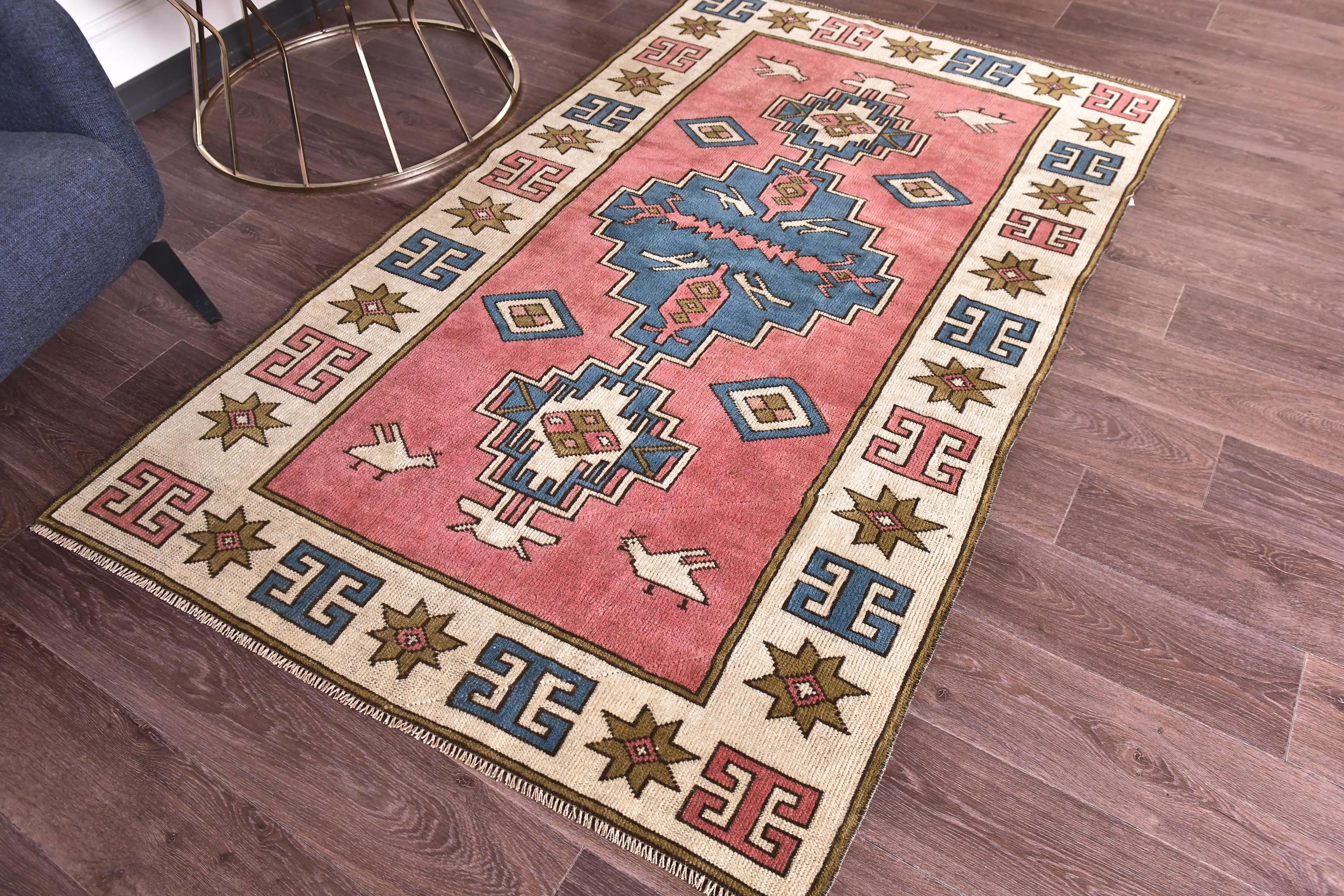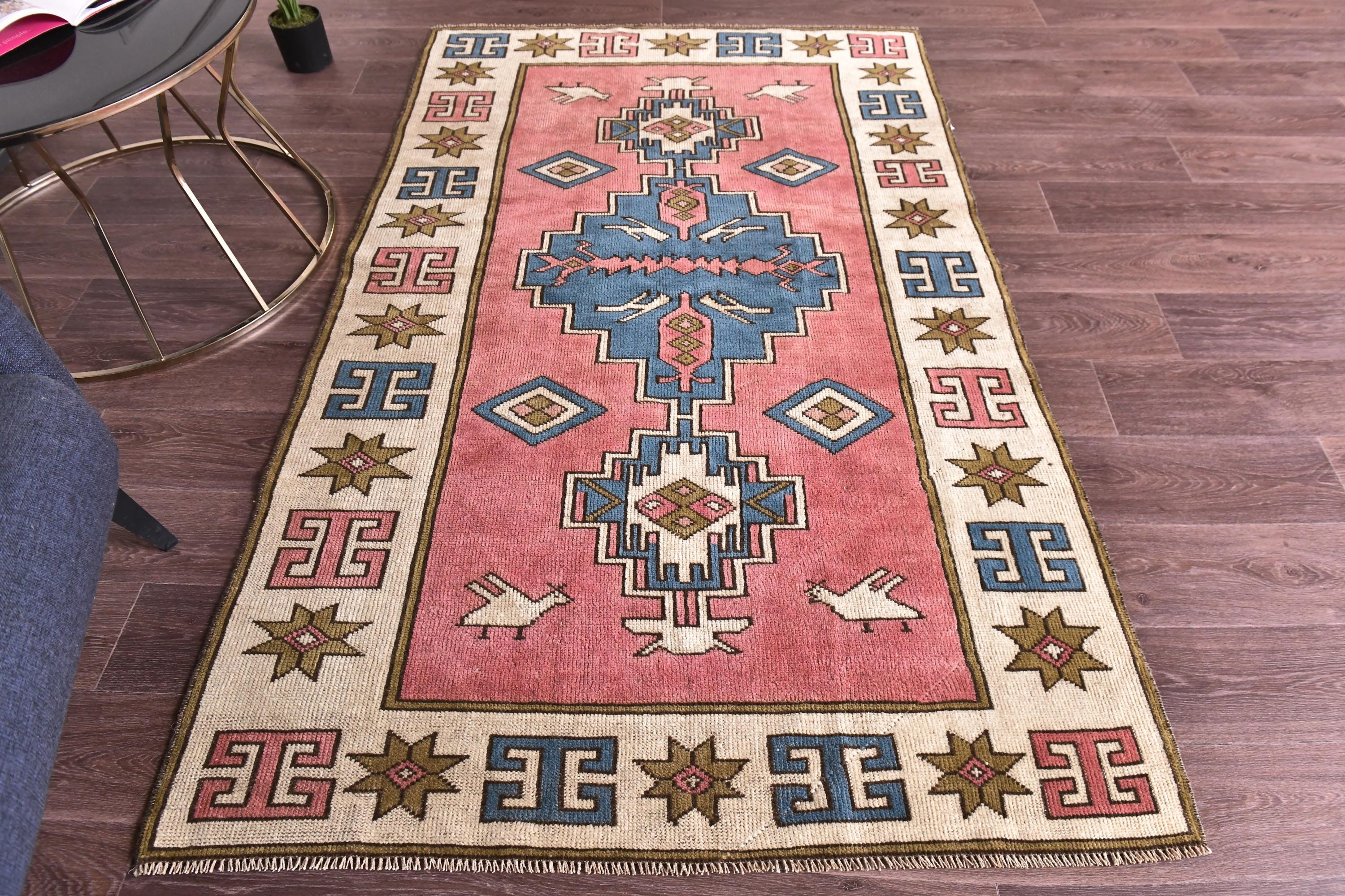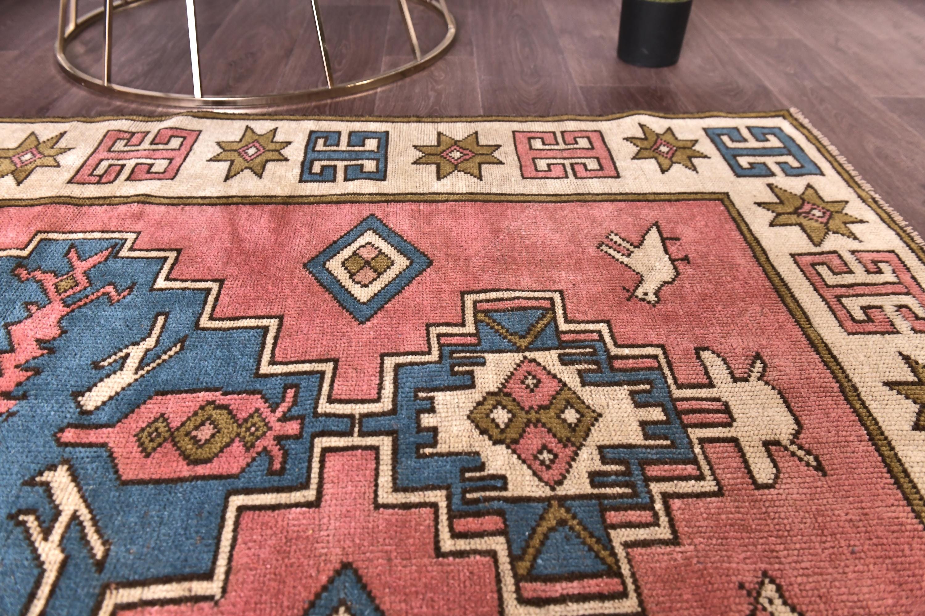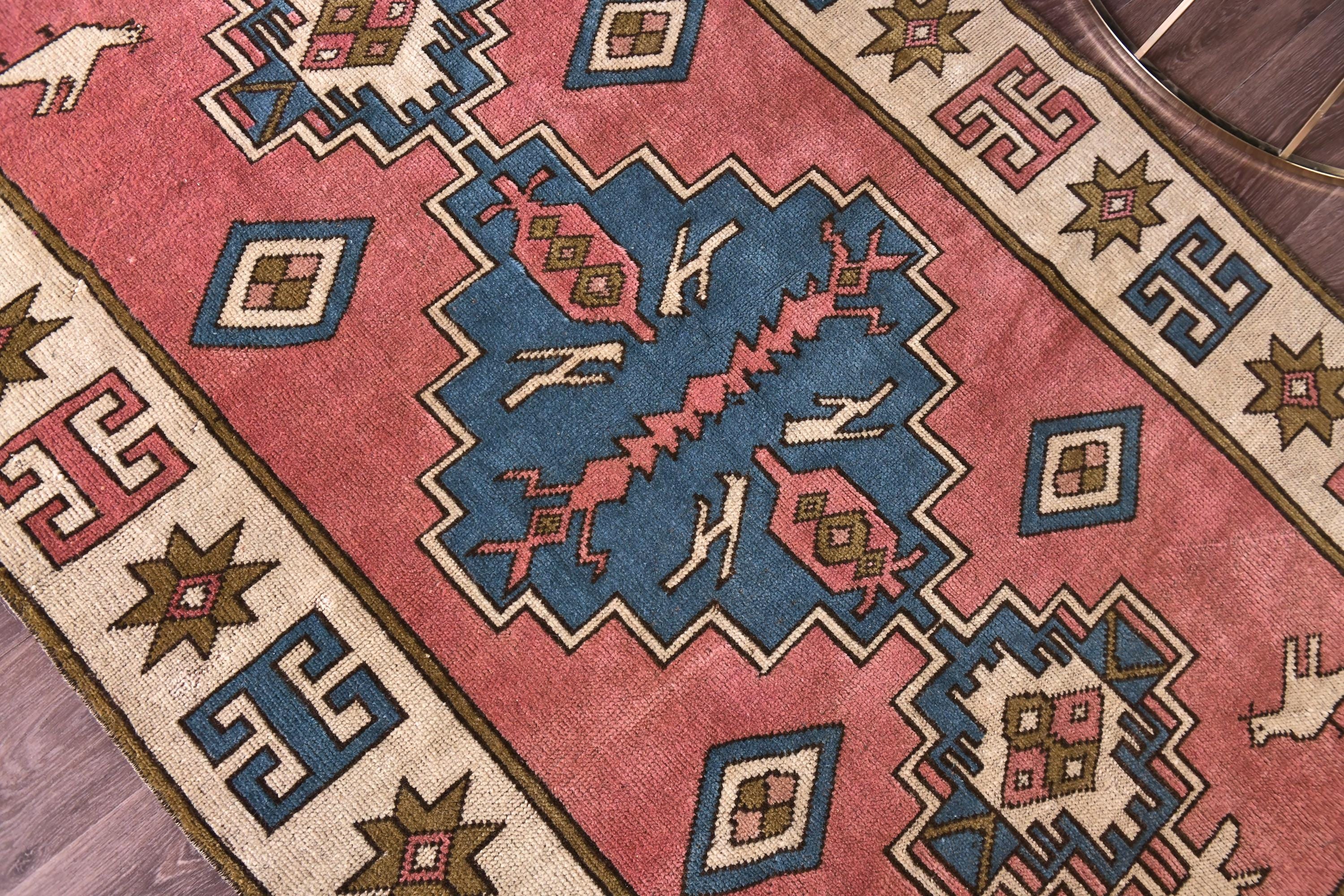 📜📌Vintage Turkish tribal area rug with three geometric medallions in denim blue and coral pink on a salmon-colored field. The hand-knotted wool carpet features traditional Anatolian star motifs, Greek key borders in beige, blue, and rose tones, and stylized animal figures. The rug displays authentic wear patterns and natural color variations.