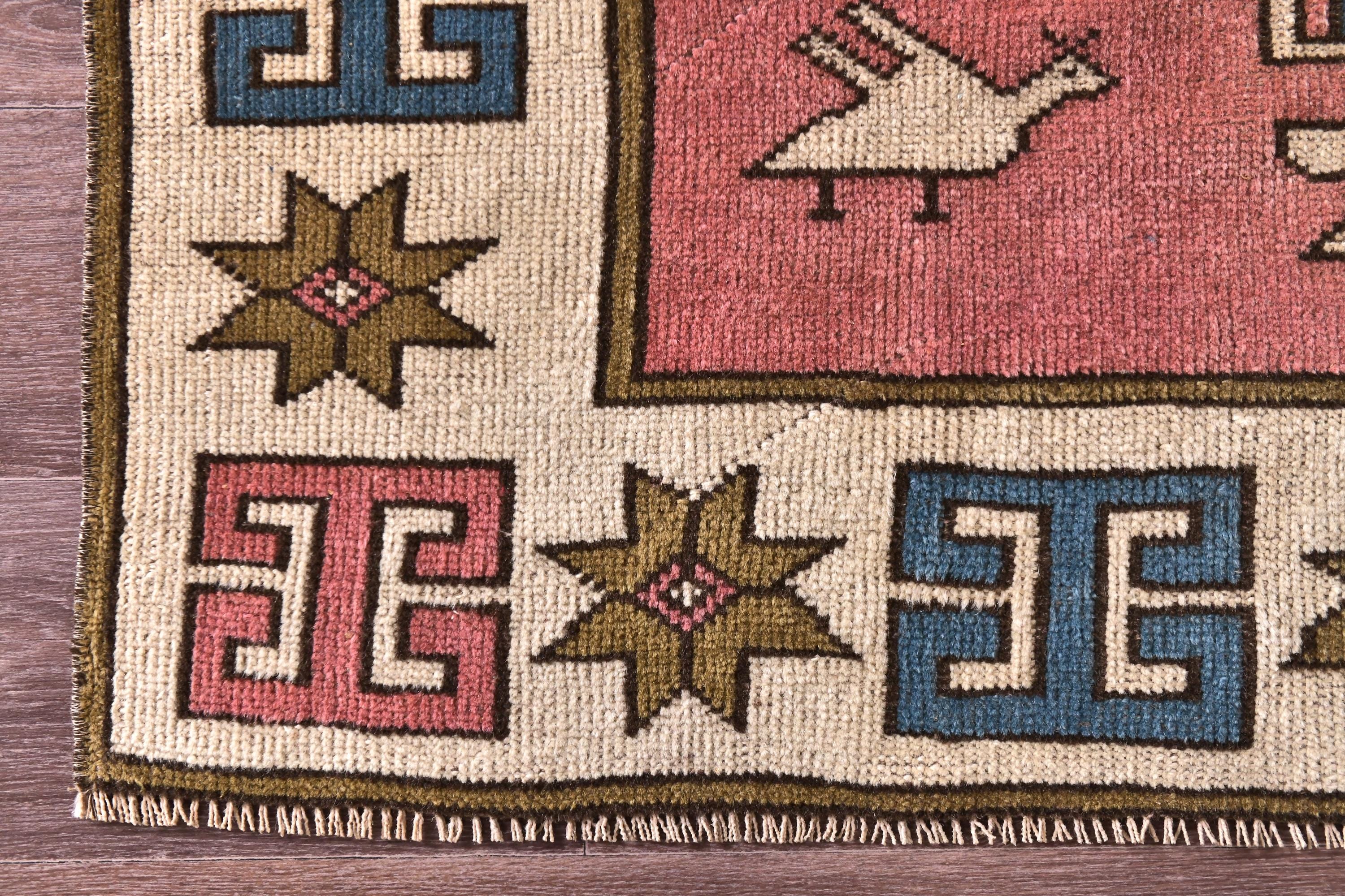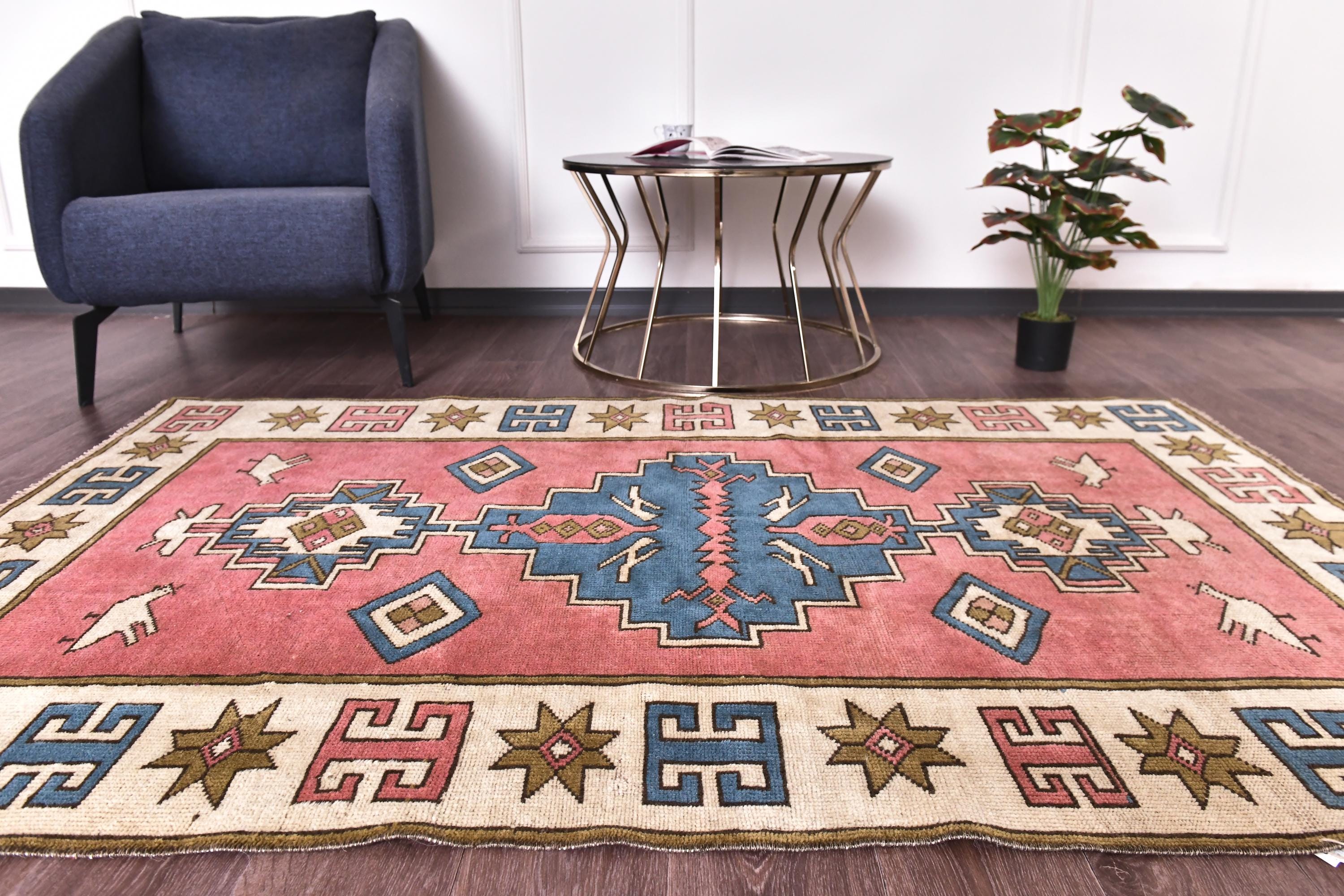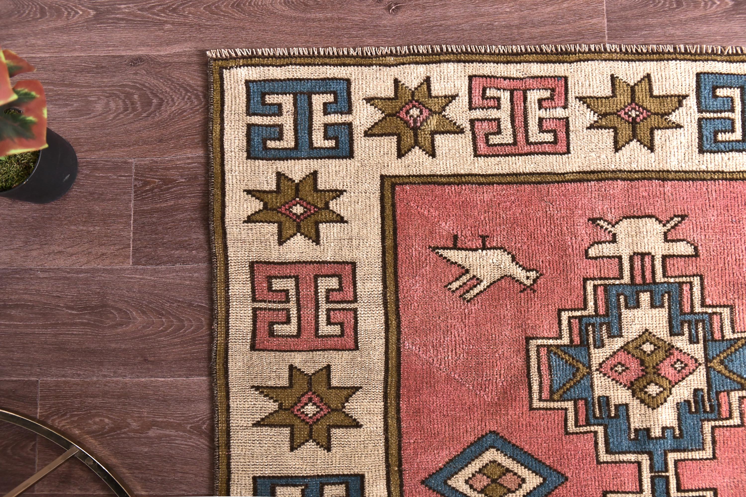📜📌Vintage Turkish tribal area rug with three geometric medallions in denim blue and coral pink on a salmon-colored field. The hand-knotted wool carpet features traditional Anatolian star motifs, Greek key borders in beige, blue, and rose tones, and stylized animal figures. The rug displays authentic wear patterns and natural color variations.