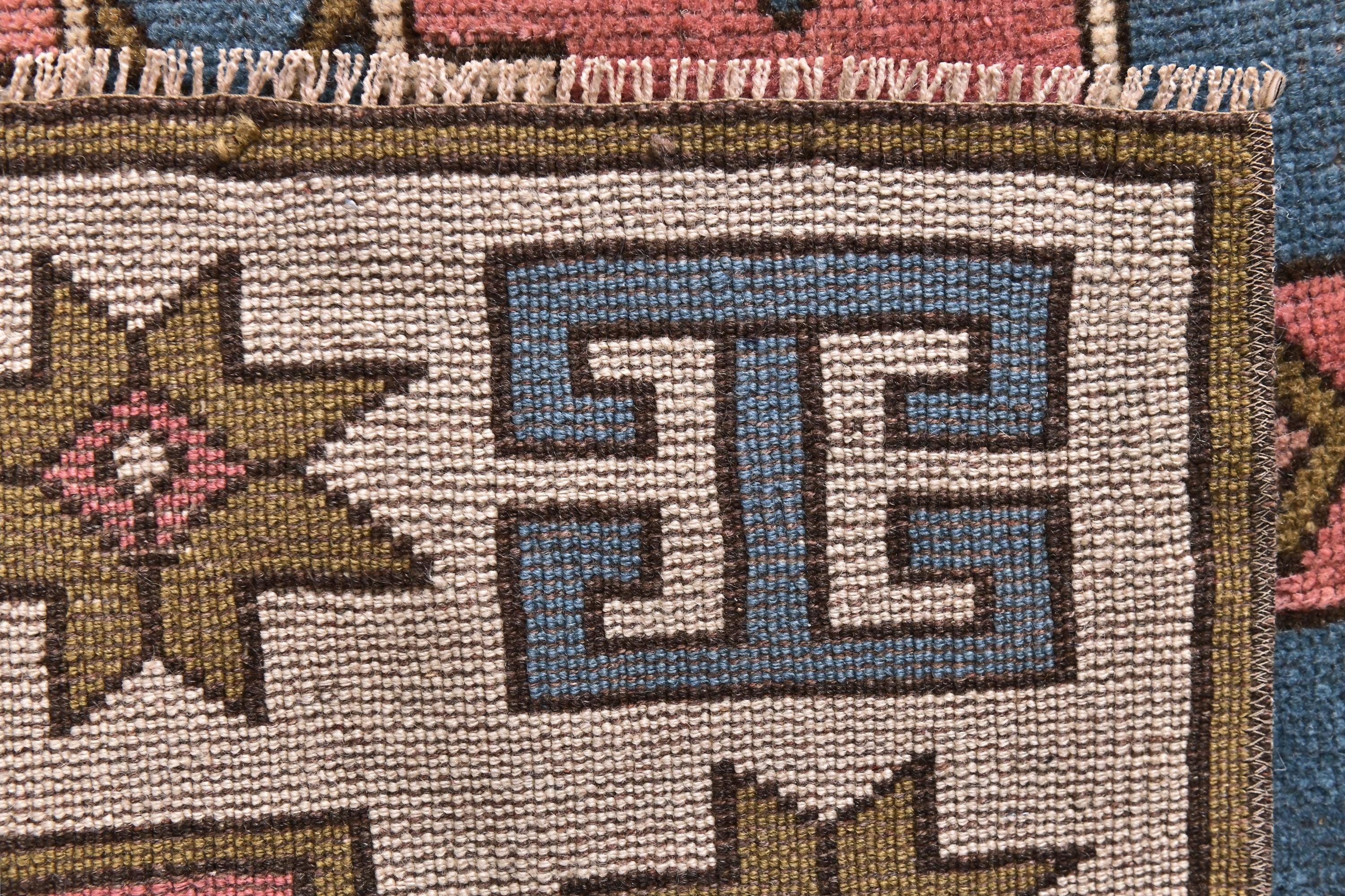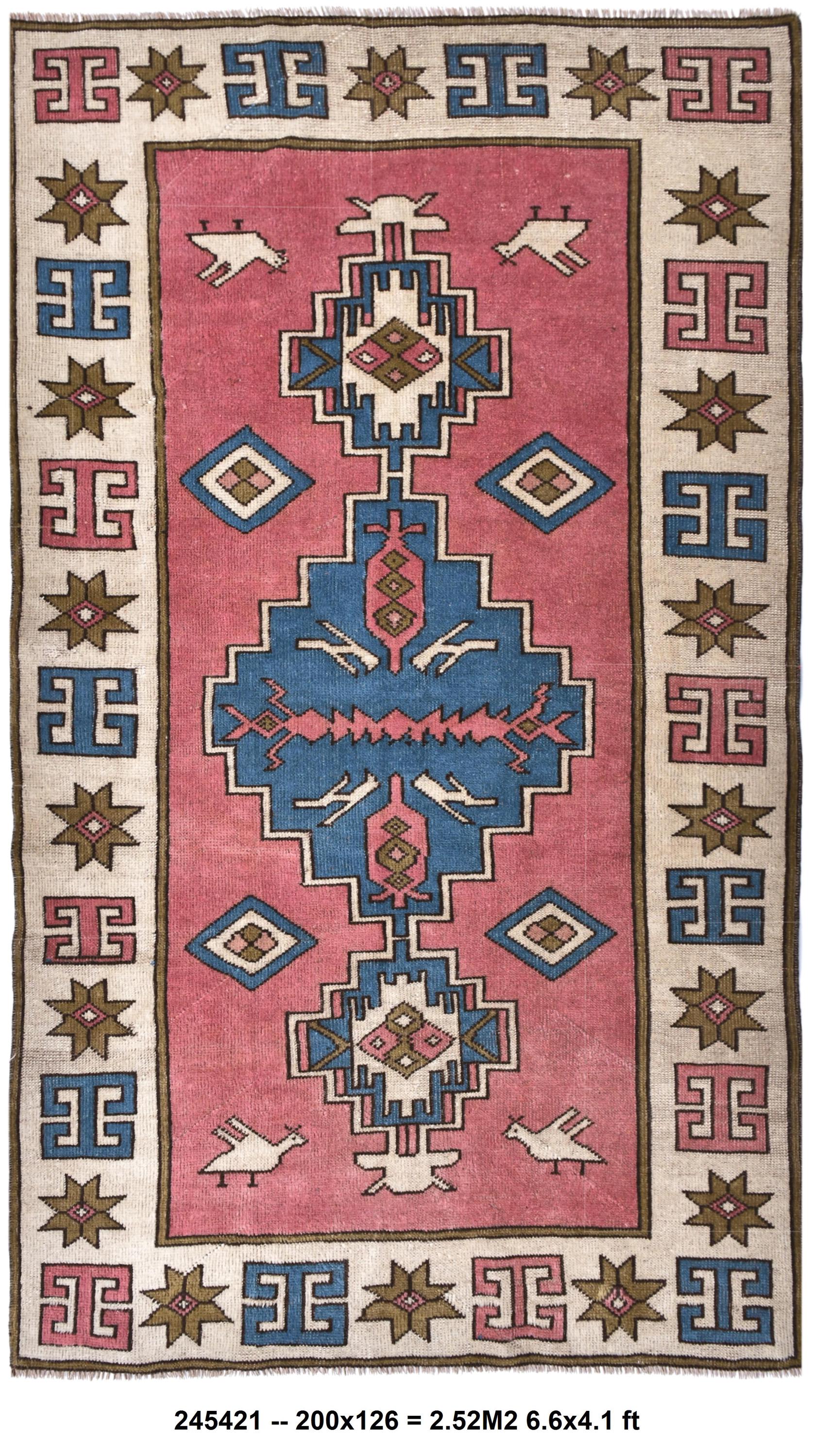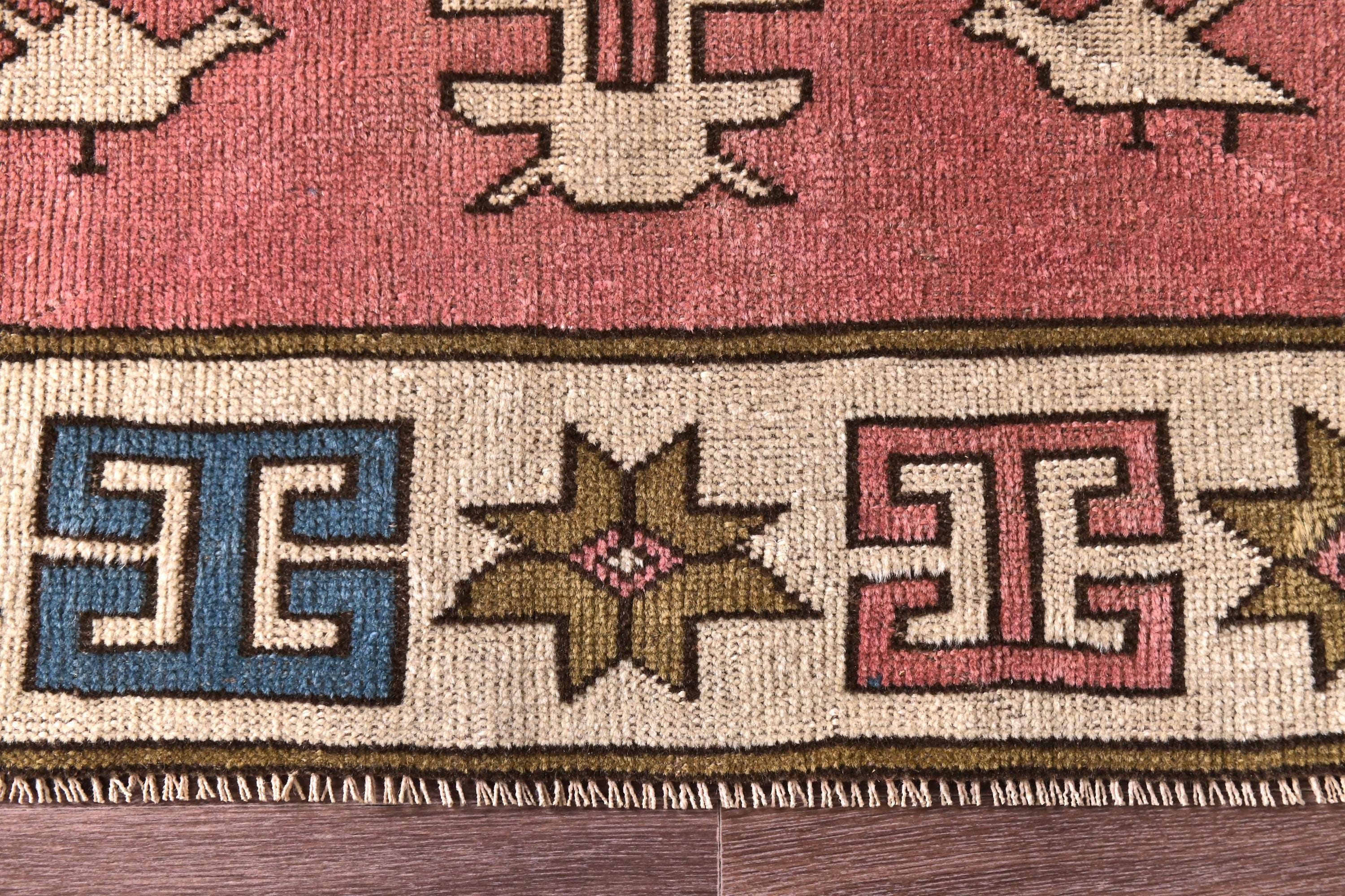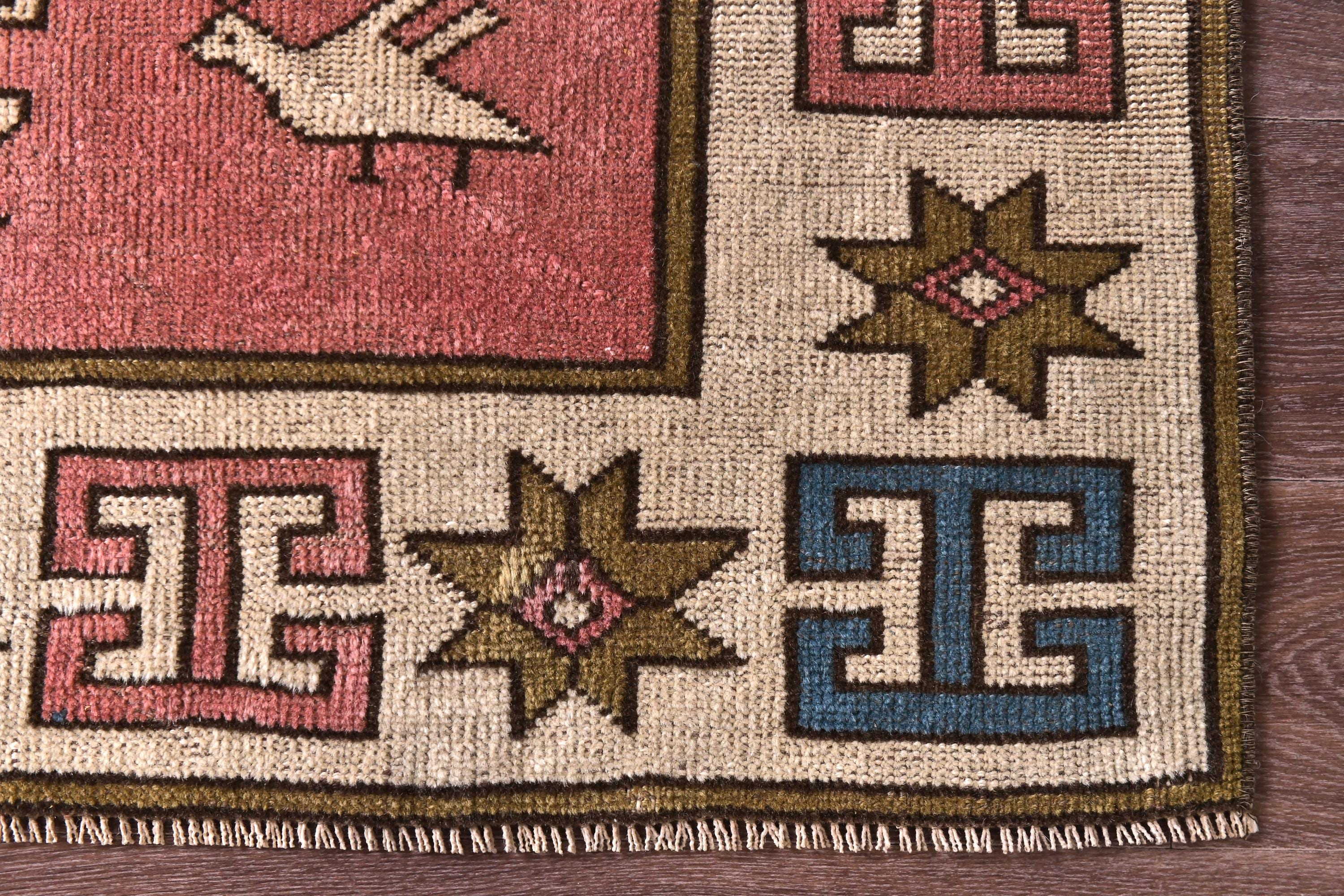 📜📌Vintage Turkish tribal area rug with three geometric medallions in denim blue and coral pink on a salmon-colored field. The hand-knotted wool carpet features traditional Anatolian star motifs, Greek key borders in beige, blue, and rose tones, and stylized animal figures. The rug displays authentic wear patterns and natural color variations.