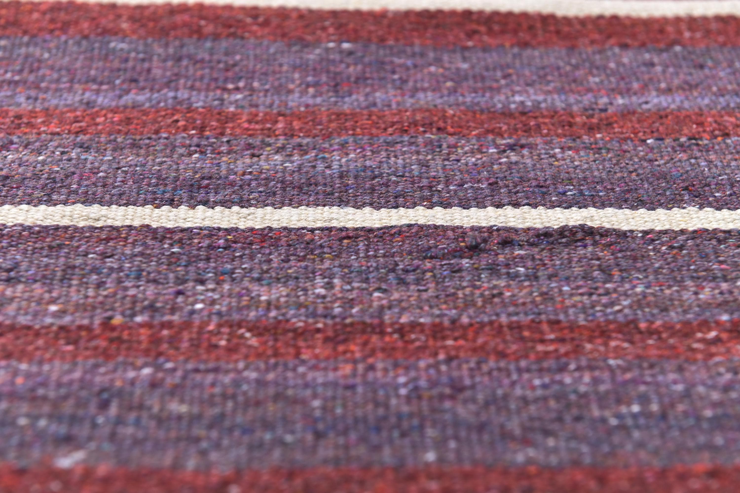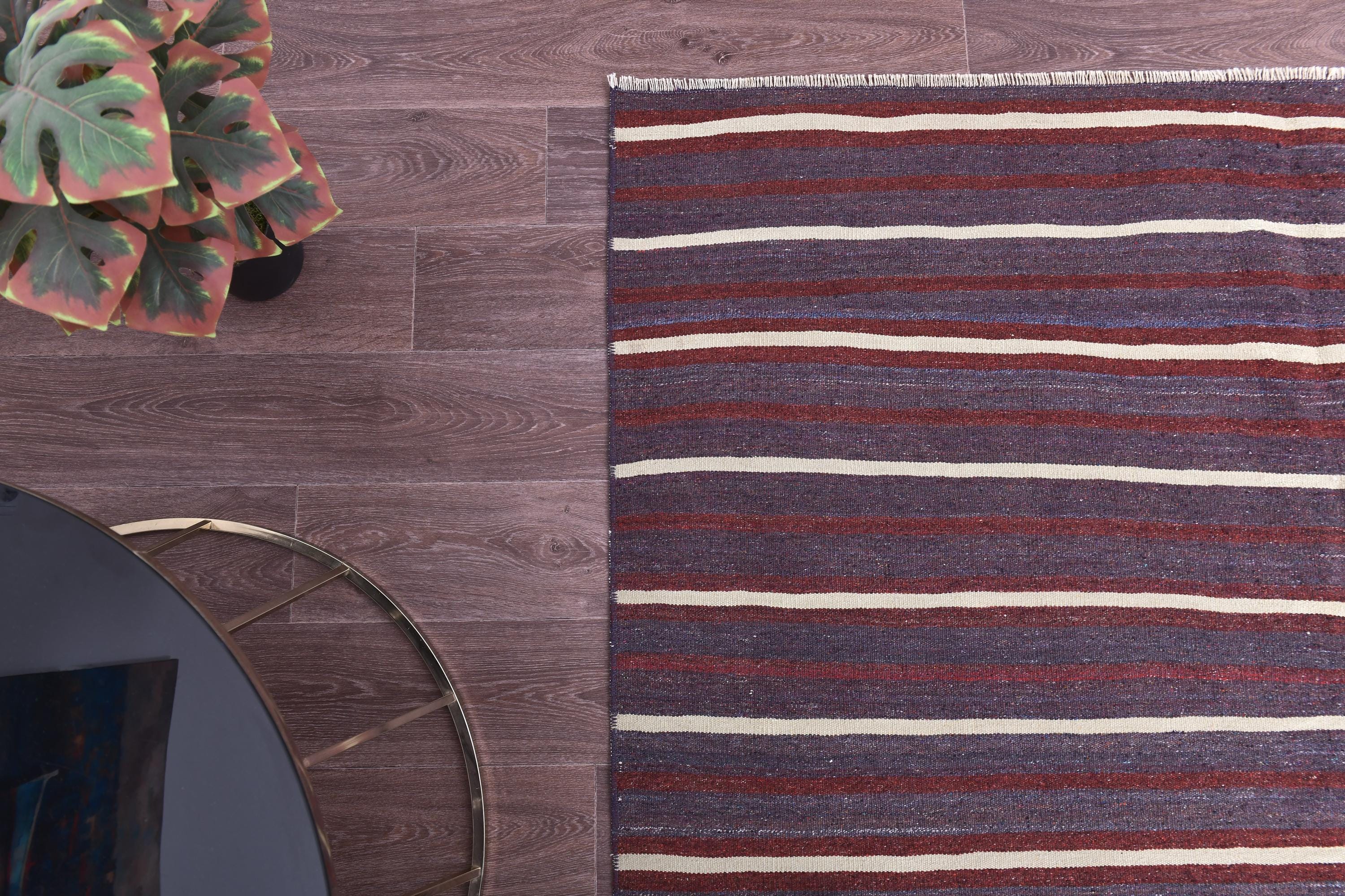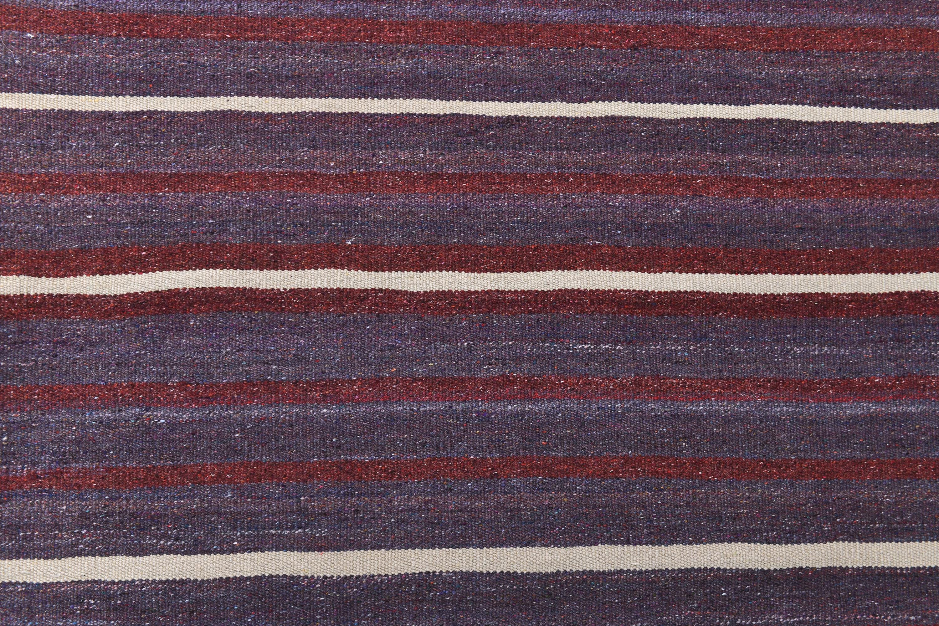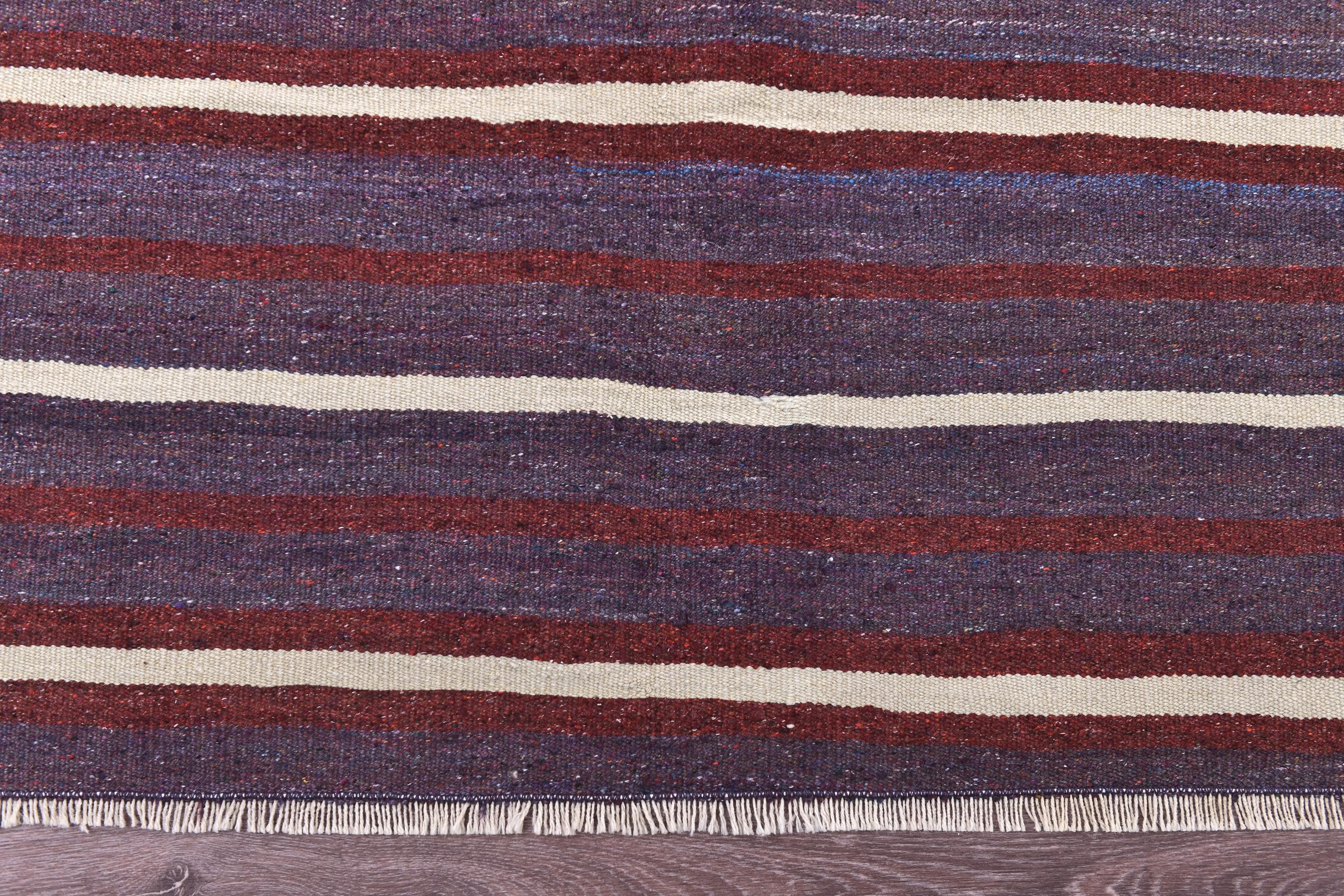 📜📌 Vintage Turkish kilim rug featuring horizontal striped pattern in purple, burgundy red, and cream ivory colors. The hand-woven flatweave wool carpet displays a traditional minimalist design with natural color variations and authentic wear. The reversible kilim has visible fringe details and shows characteristic irregularities of handmade textiles.