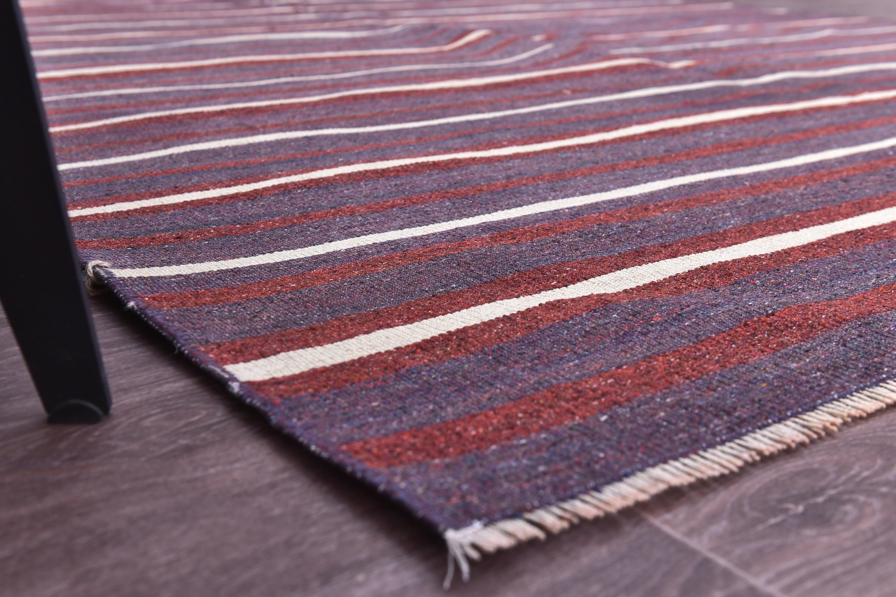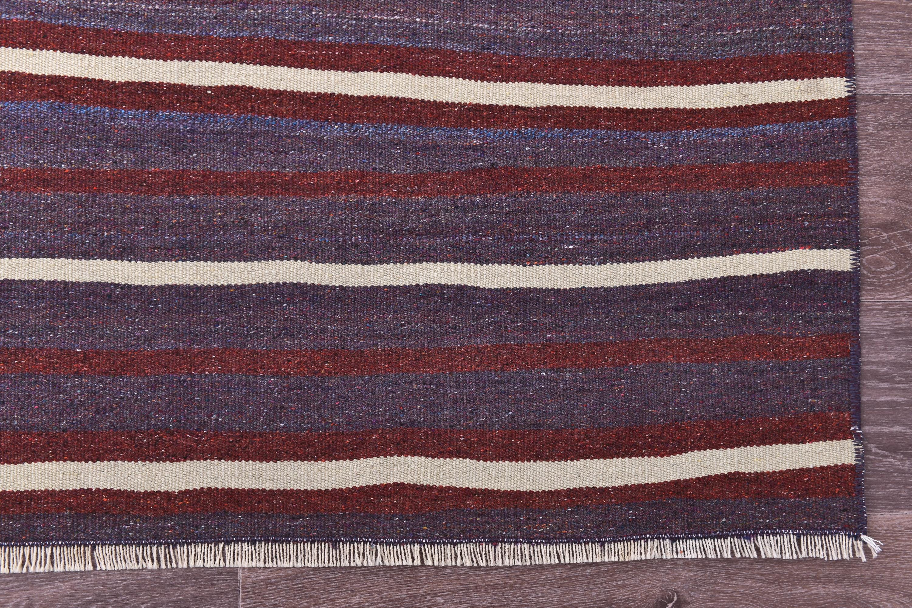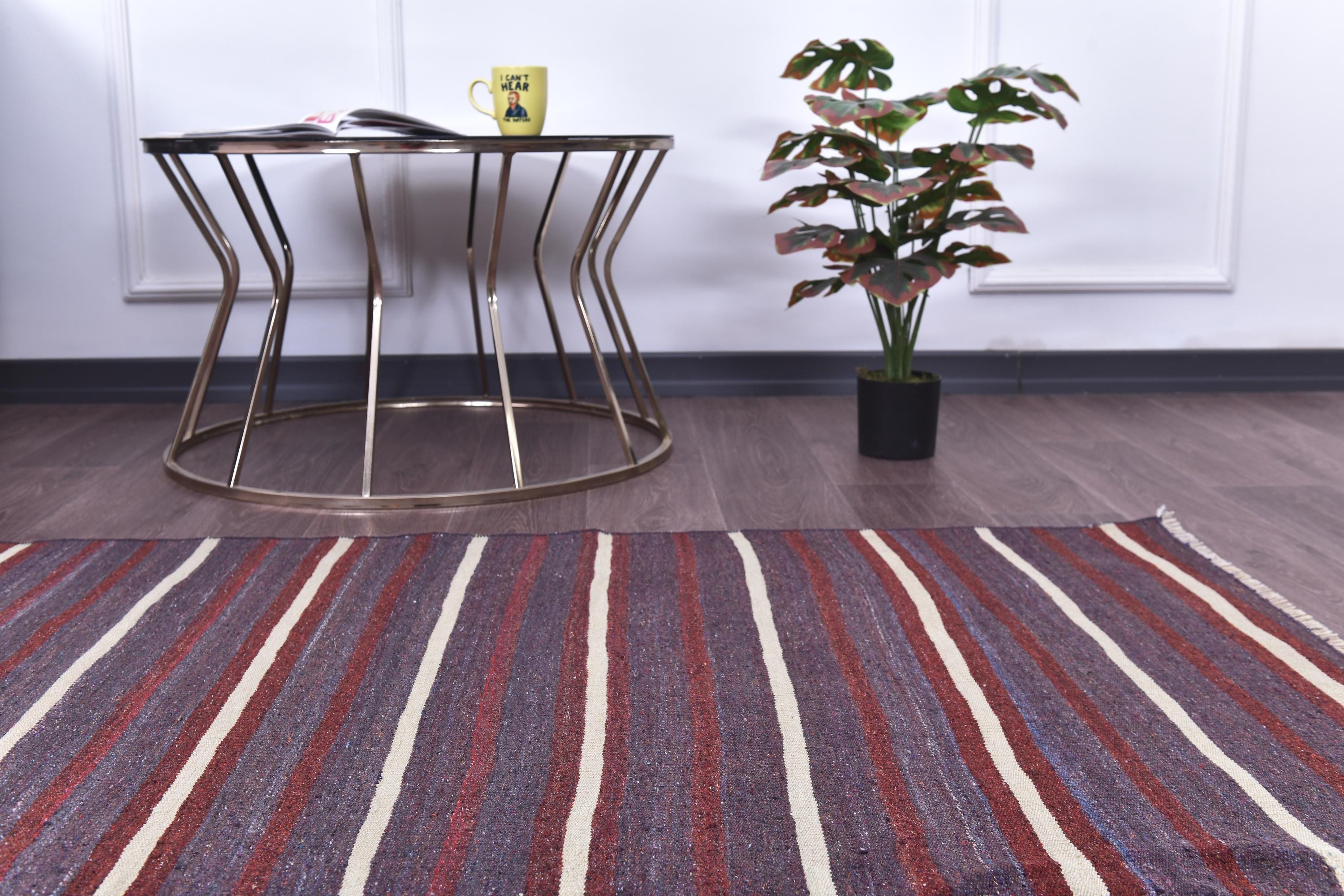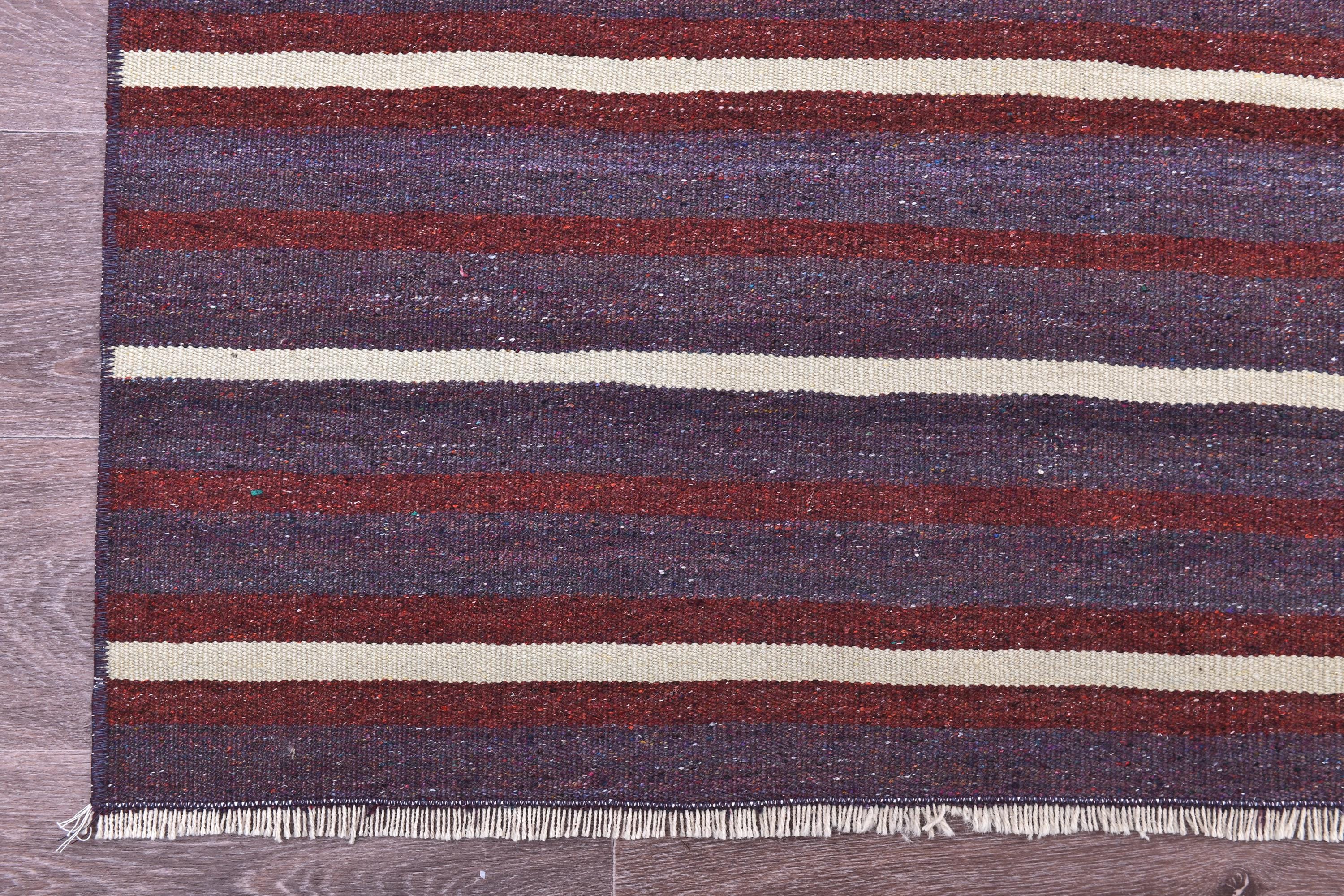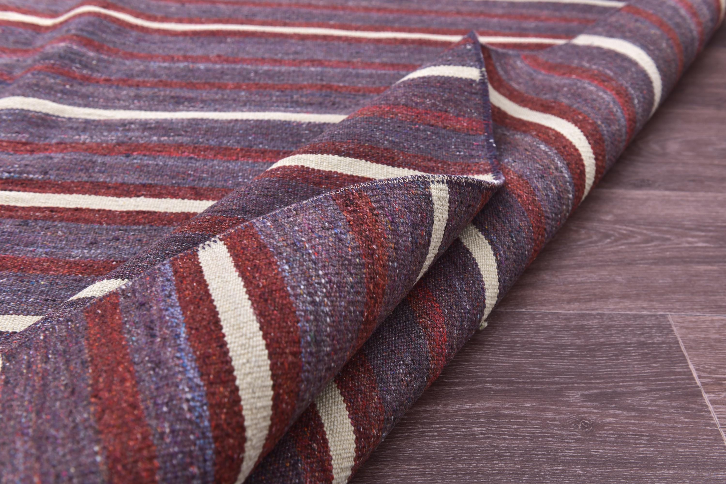 📜📌 Vintage Turkish kilim rug featuring horizontal striped pattern in purple, burgundy red, and cream ivory colors. The hand-woven flatweave wool carpet displays a traditional minimalist design with natural color variations and authentic wear. The reversible kilim has visible fringe details and shows characteristic irregularities of handmade textiles.