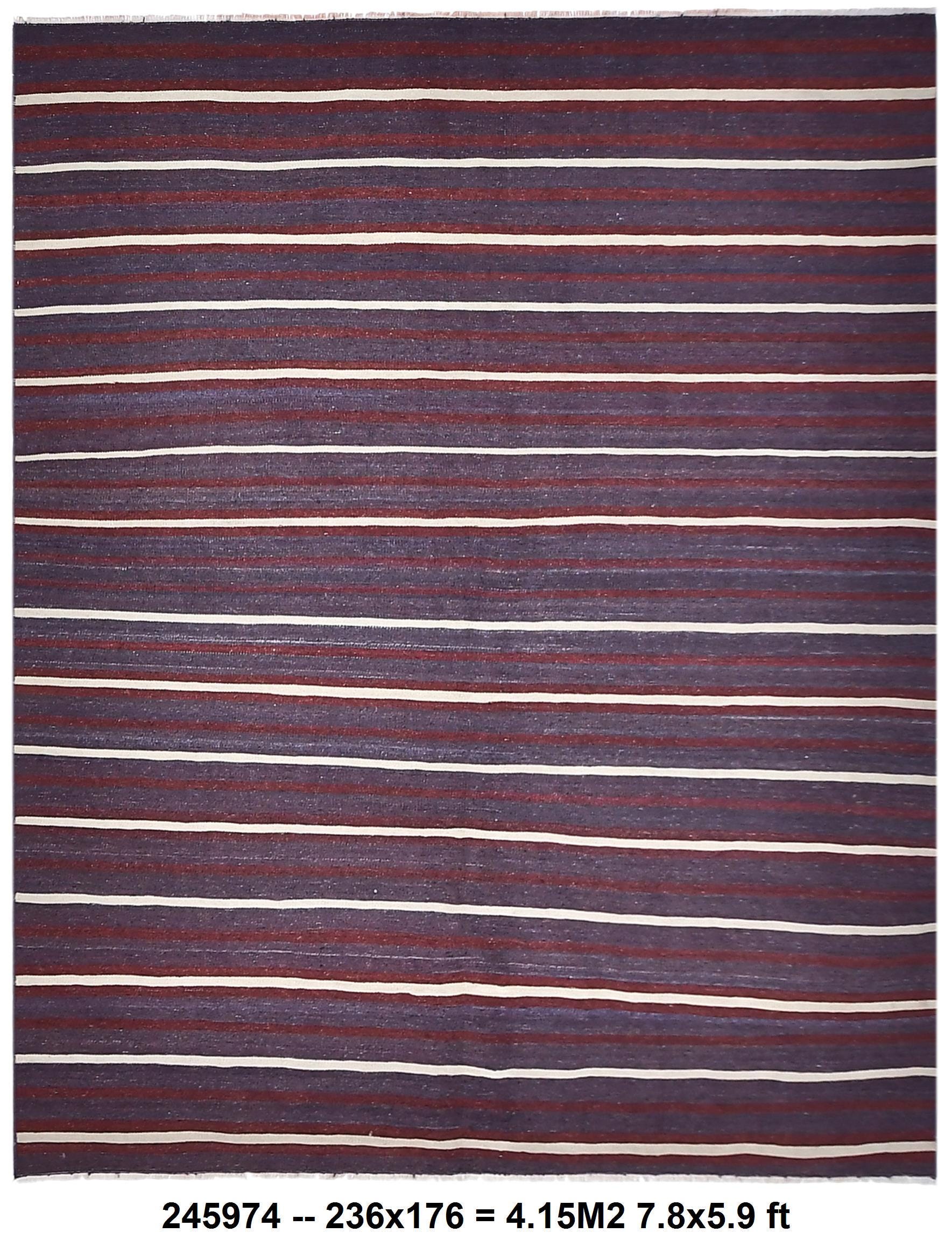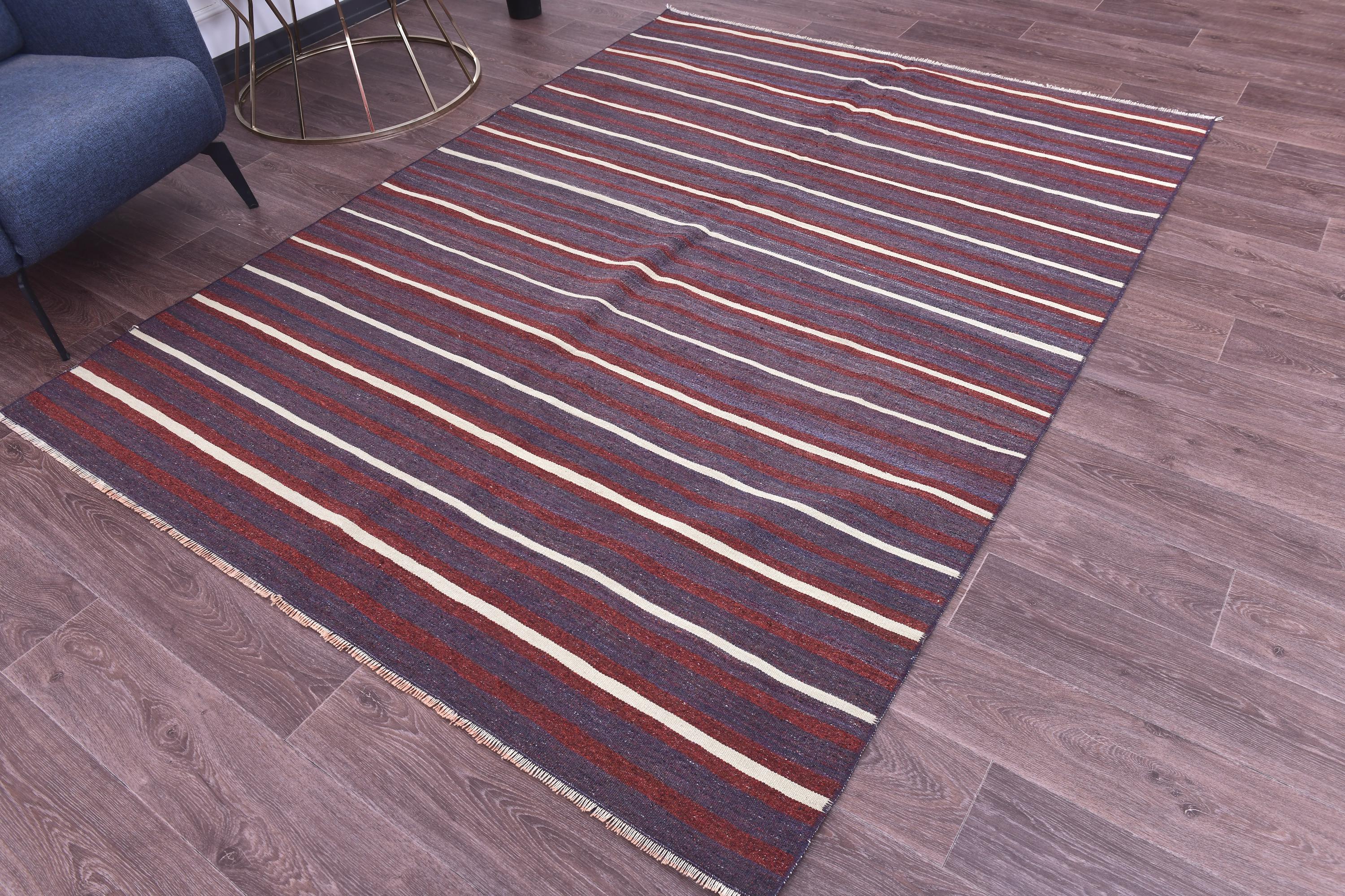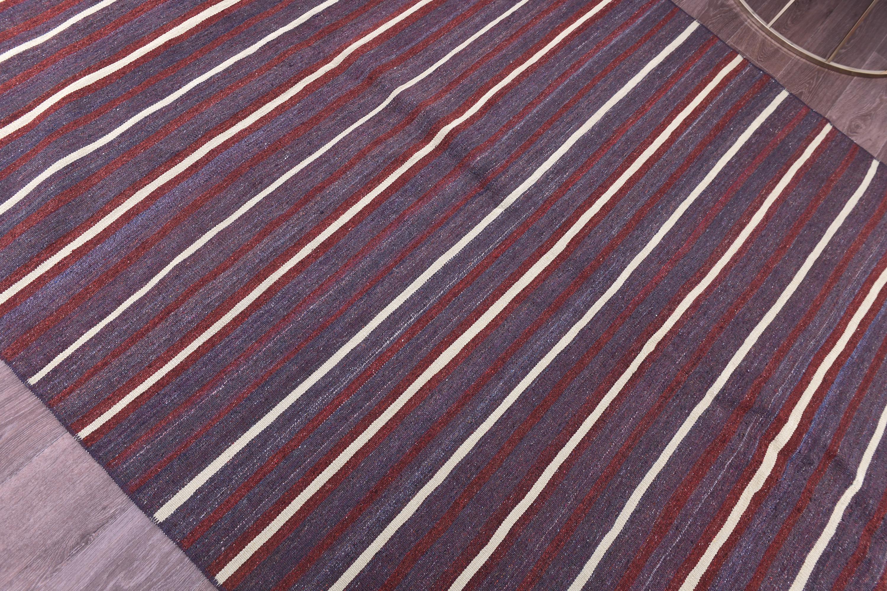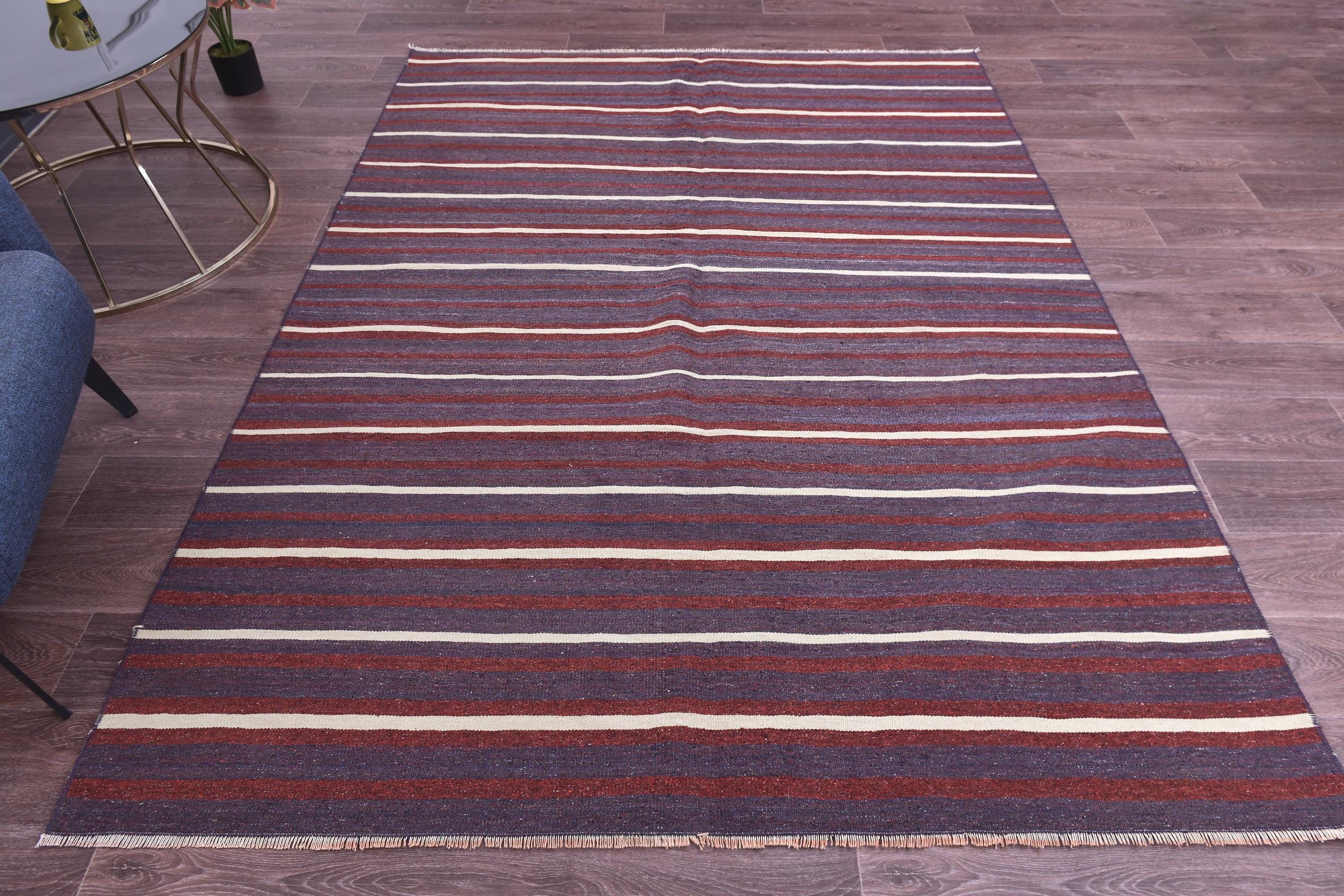 📜📌 Vintage Turkish kilim rug featuring horizontal striped pattern in purple, burgundy red, and cream ivory colors. The hand-woven flatweave wool carpet displays a traditional minimalist design with natural color variations and authentic wear. The reversible kilim has visible fringe details and shows characteristic irregularities of handmade textiles.