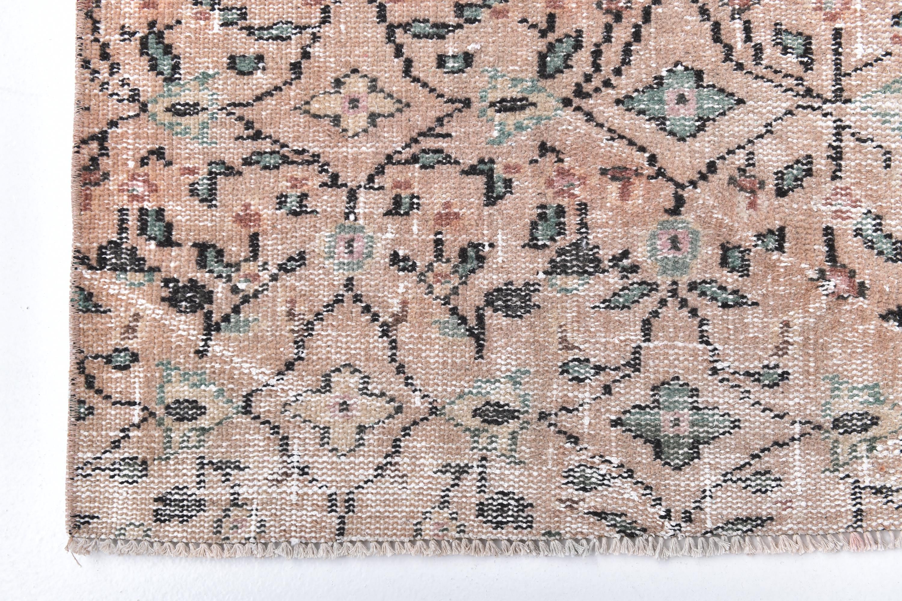 📜📌 Antique Anatolian rug in muted dusty peach and green color palette, showcasing delicate botanical corner designs with flowers and vines, worn vintage appearance with open center field, handwoven wool with naturally faded character