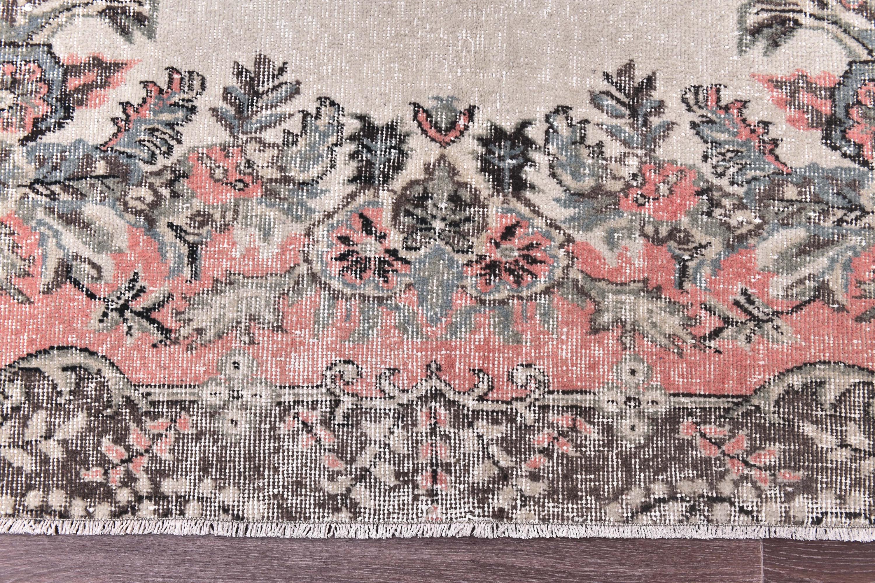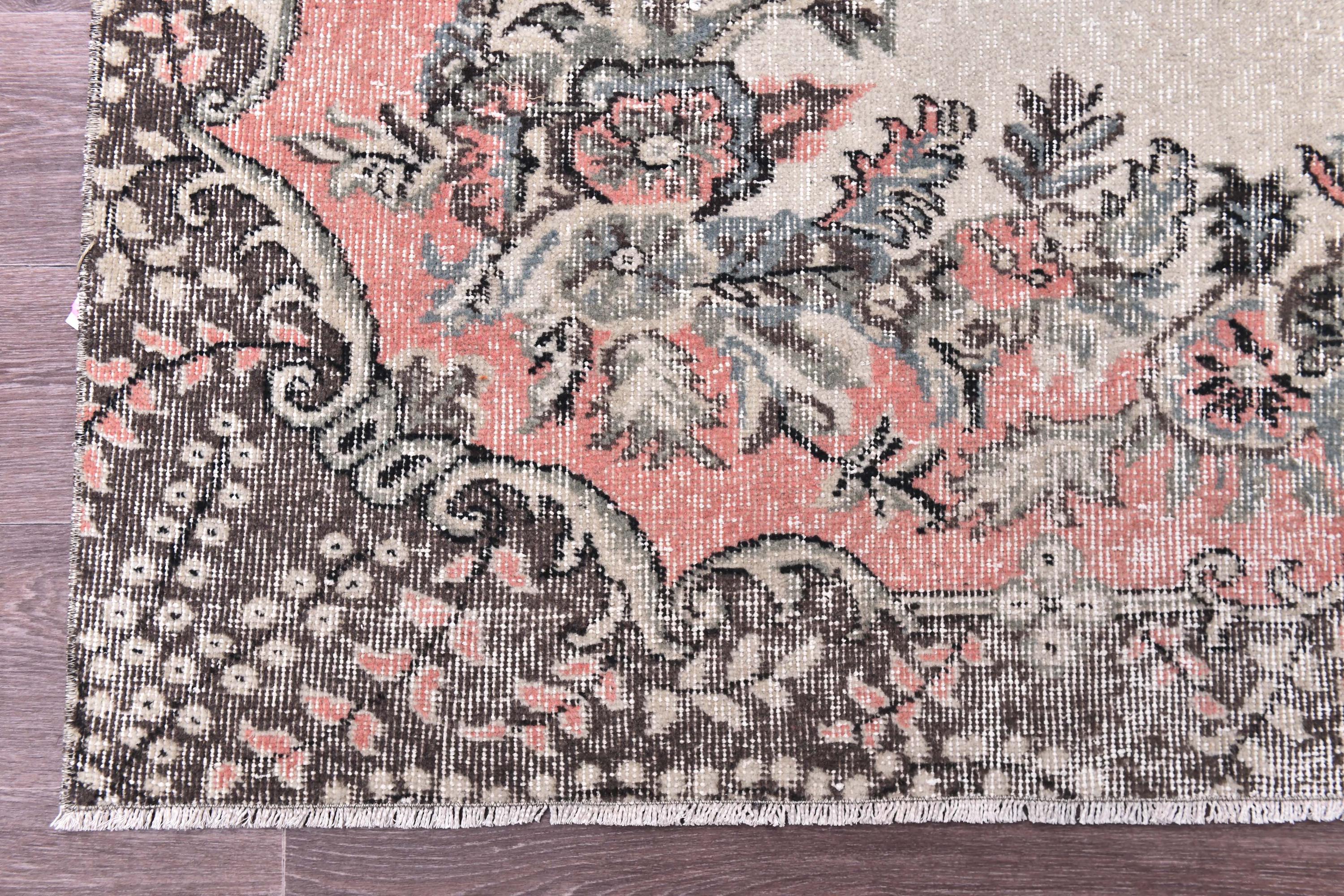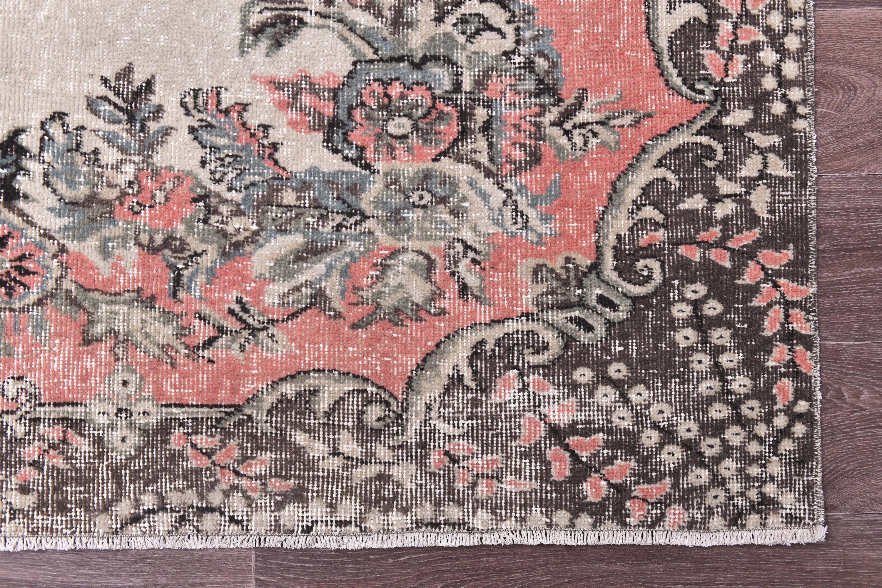 📜📌Brown, pink and Cream vintage-inspired area rug featuring traditional floral medallion patterns with distressed weaving, displaying warm taupe tones and dark charcoal botanical motifs throughout the woven fabric surface.