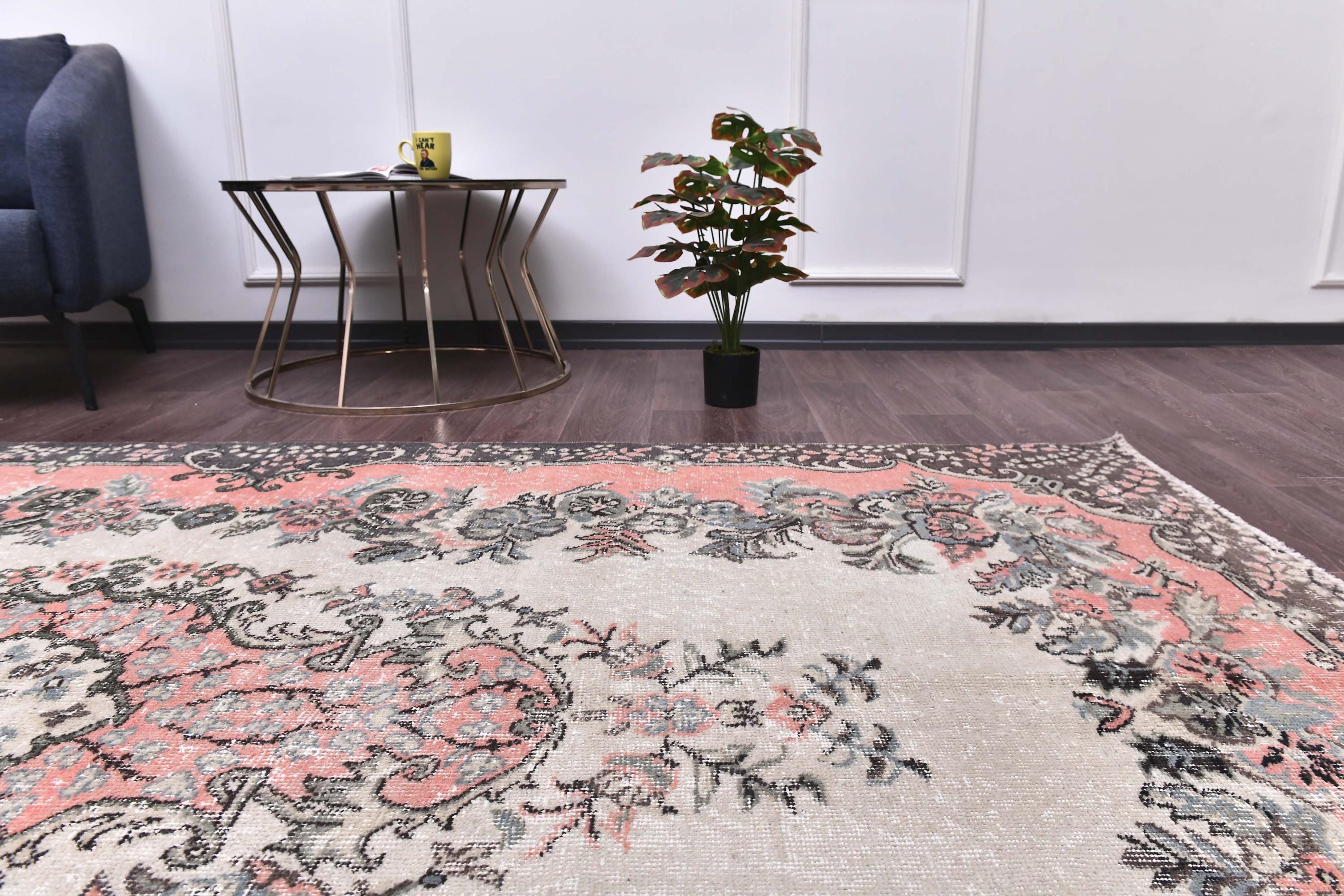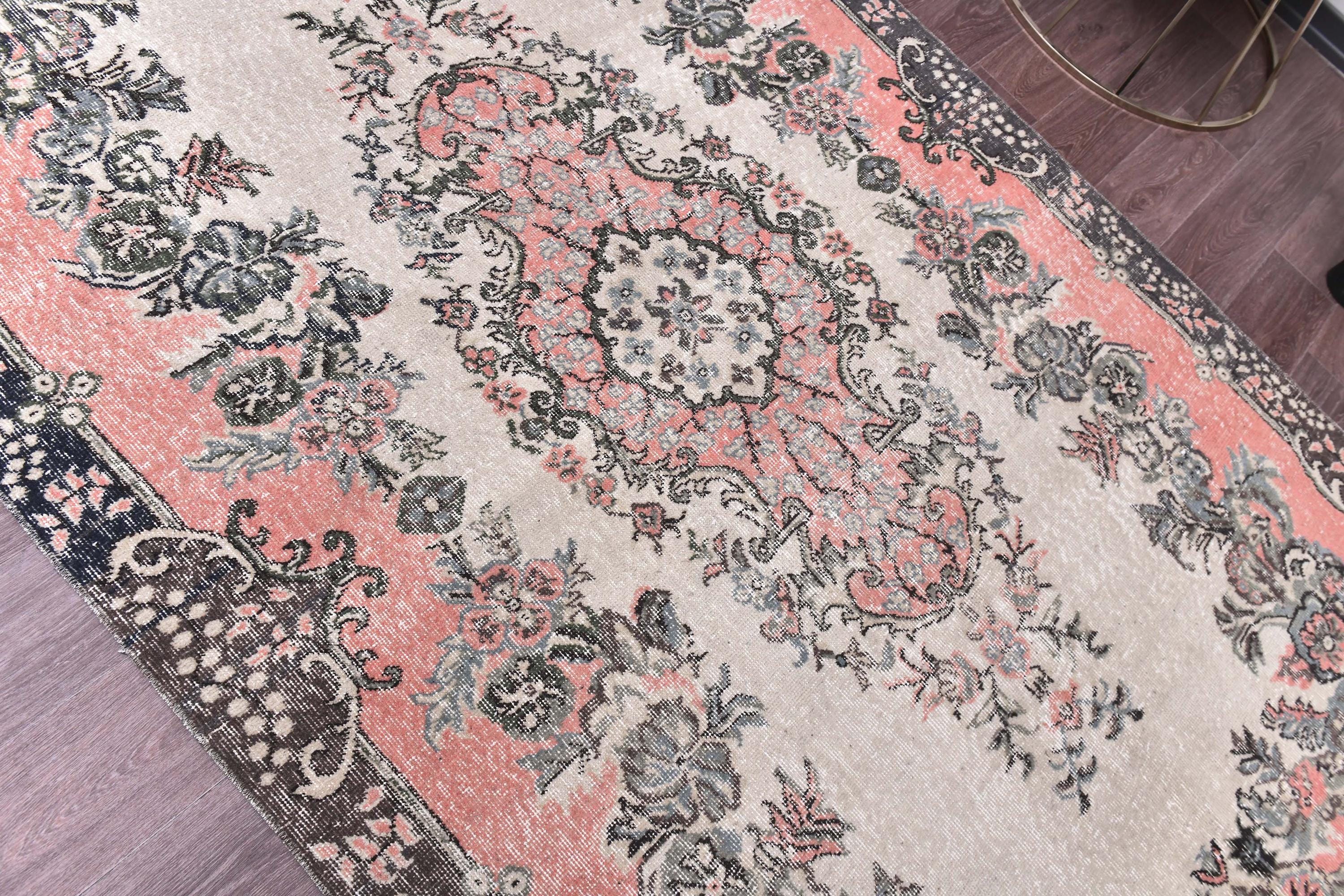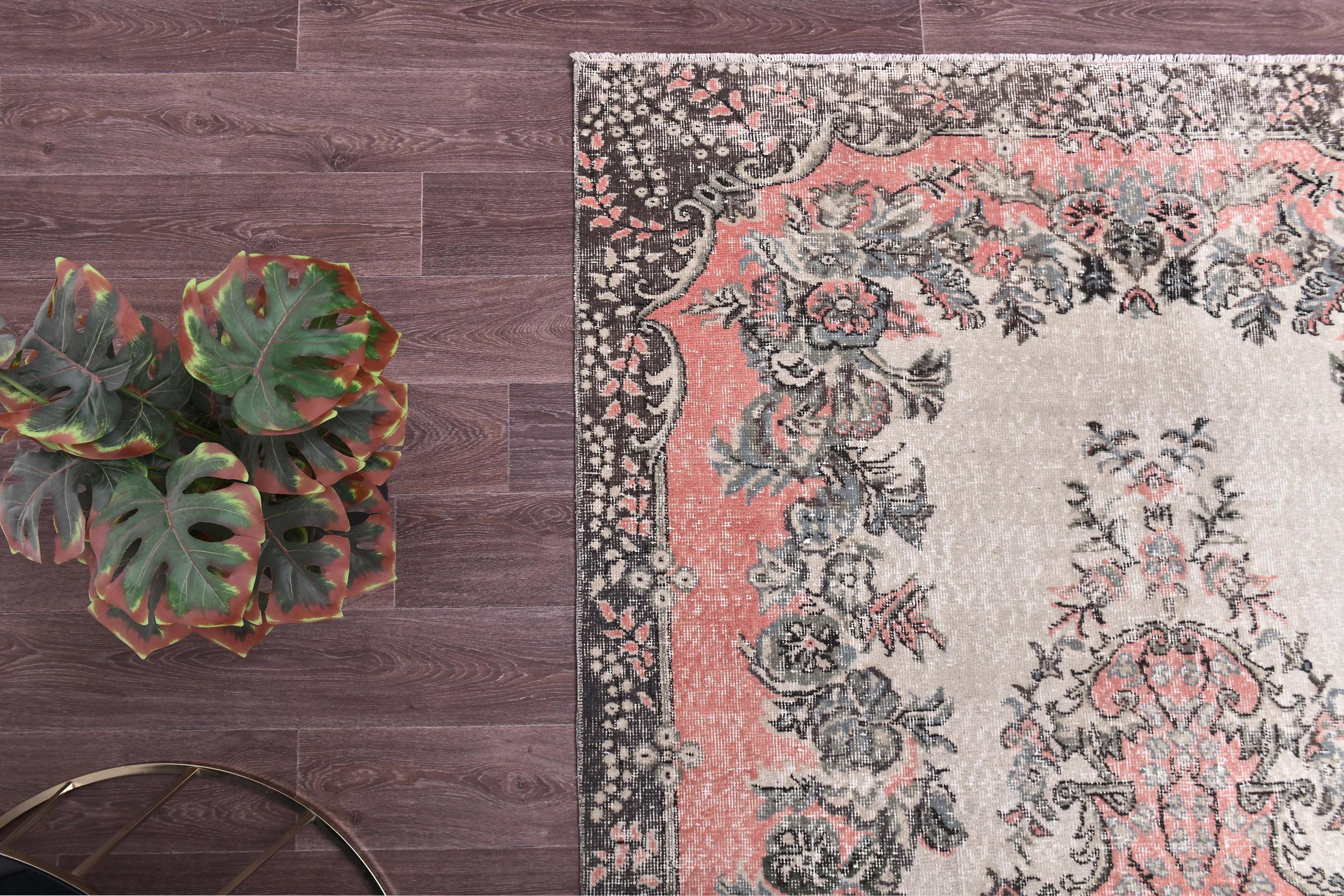 📜📌Brown, pink and Cream vintage-inspired area rug featuring traditional floral medallion patterns with distressed weaving, displaying warm taupe tones and dark charcoal botanical motifs throughout the woven fabric surface.