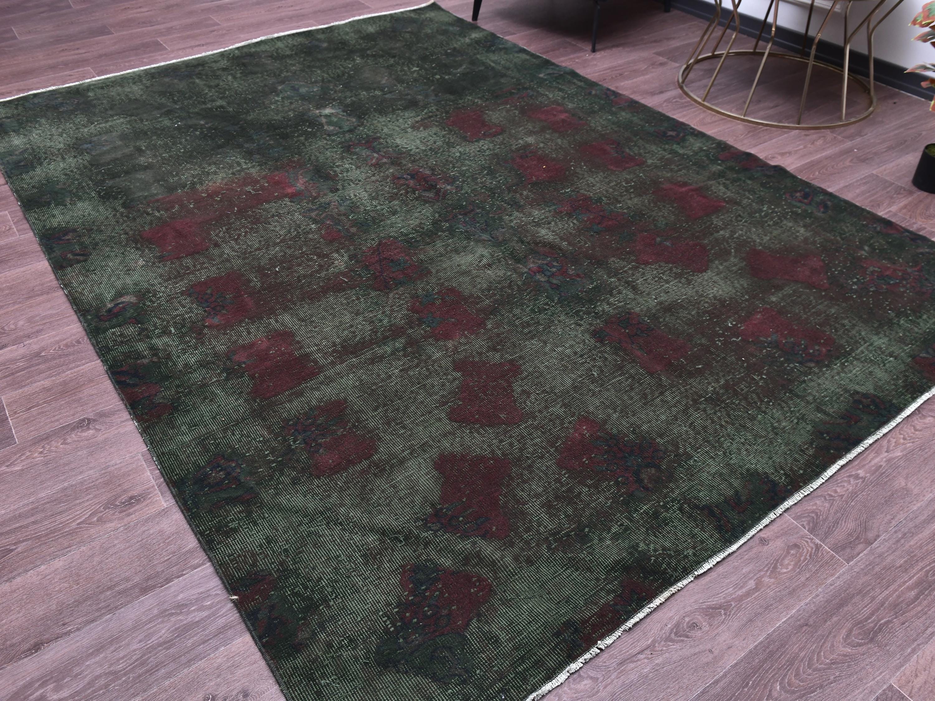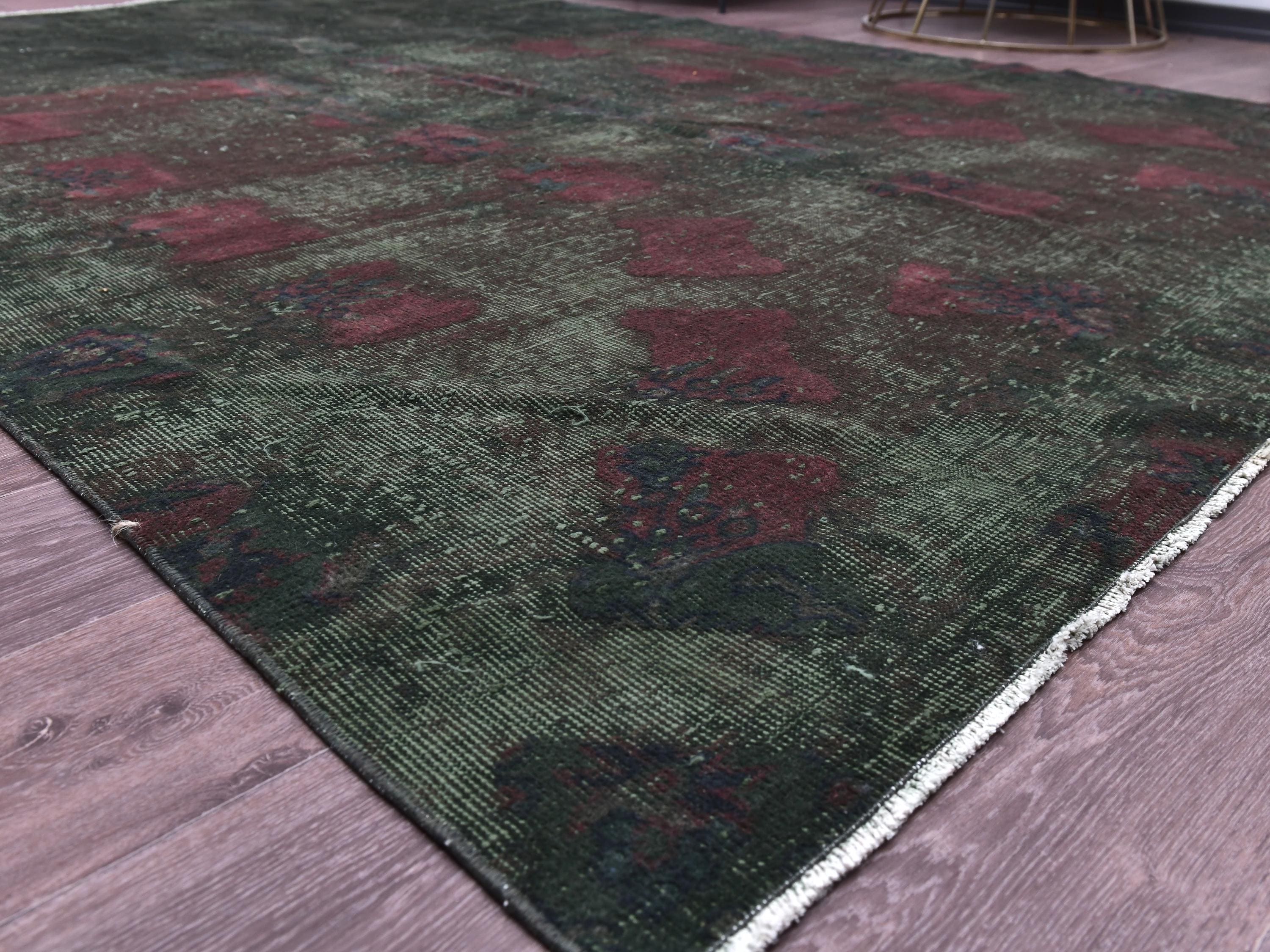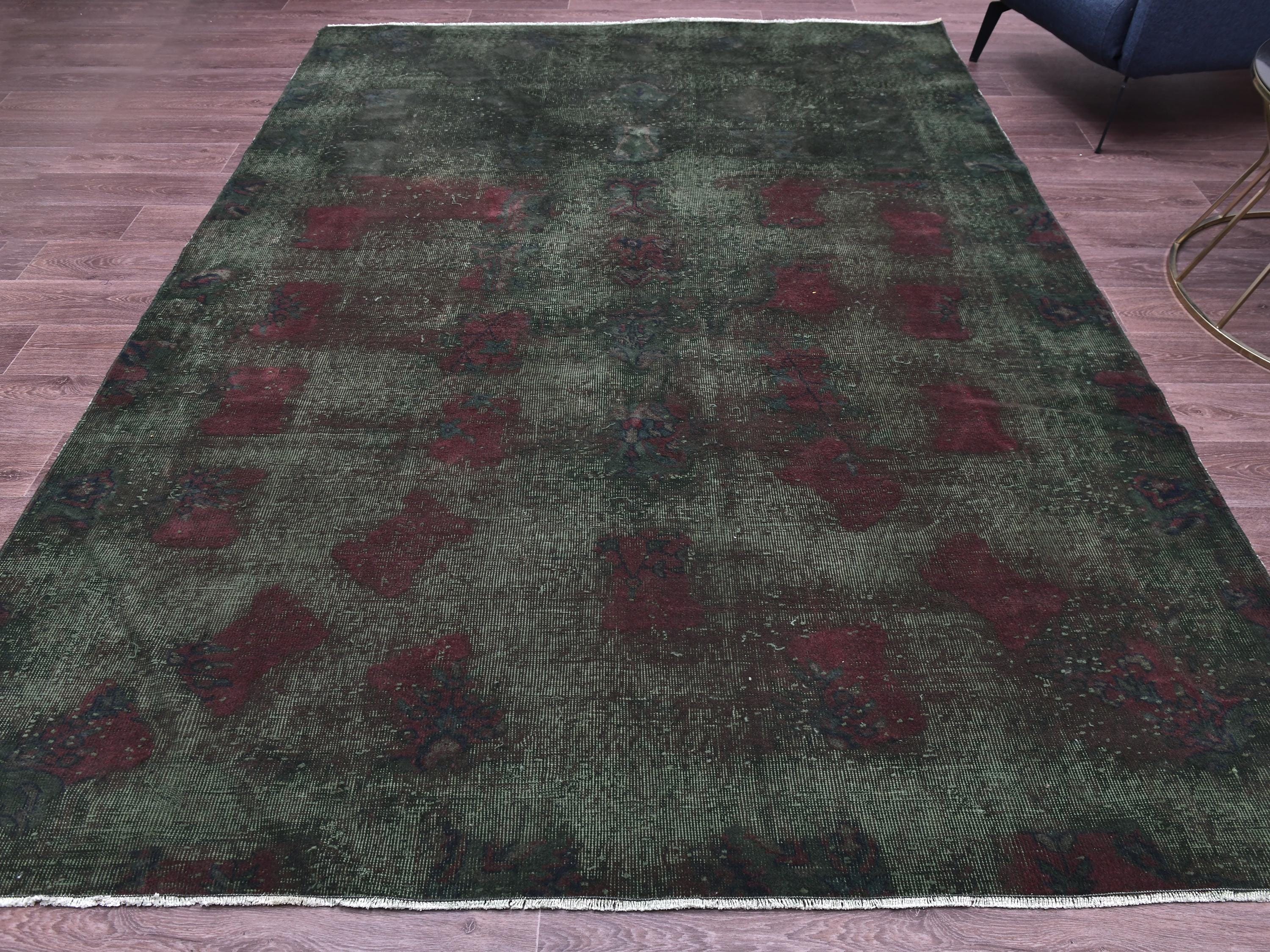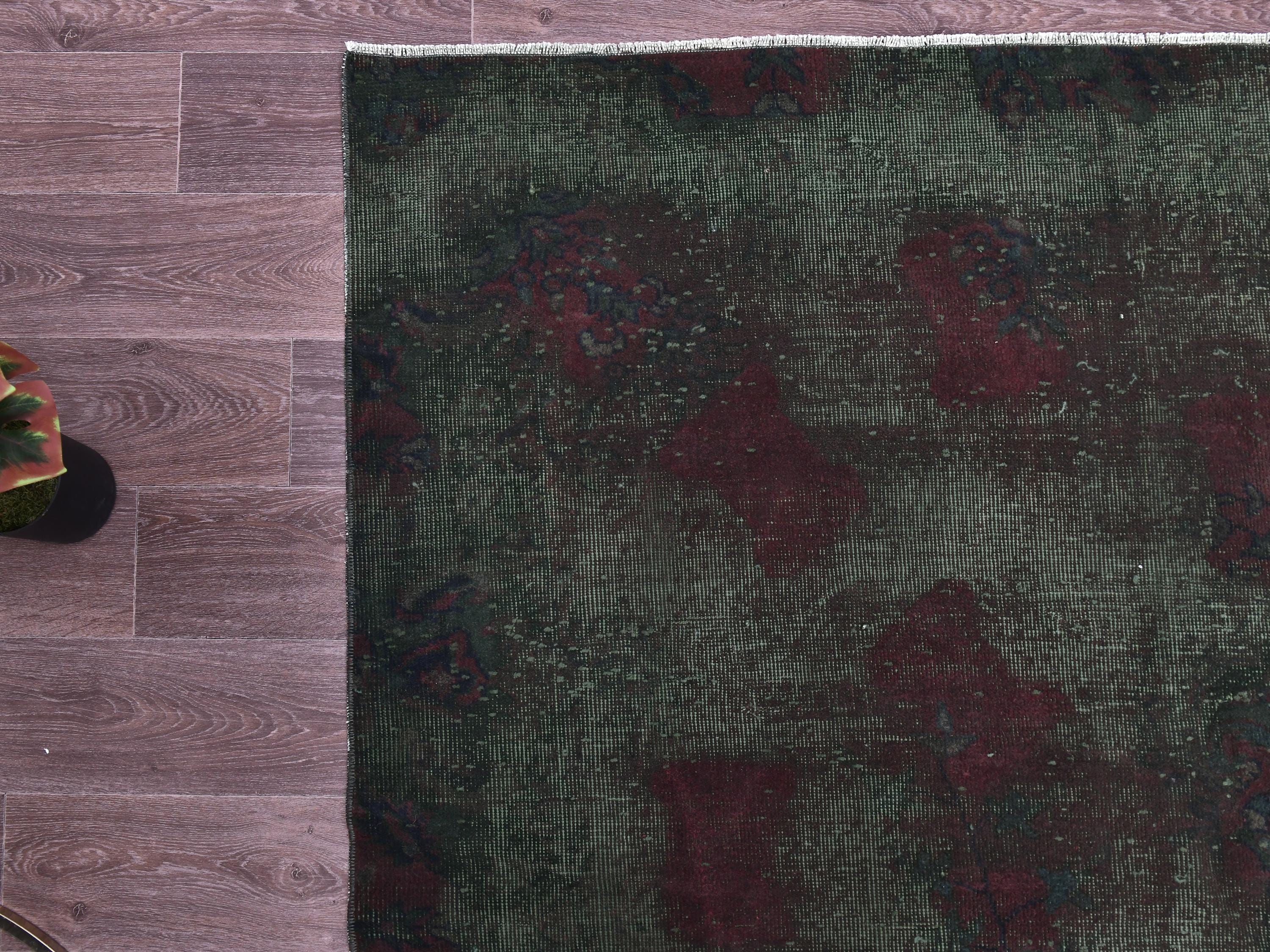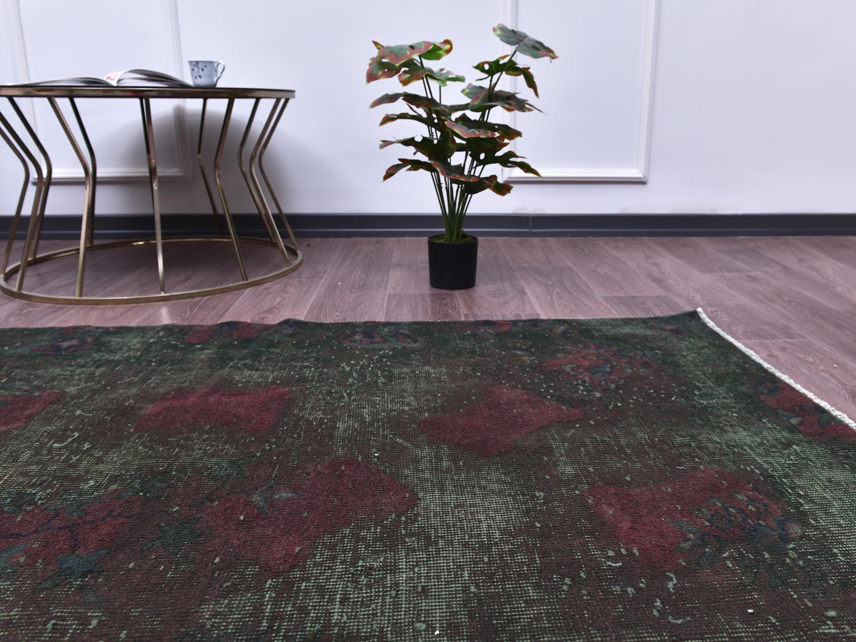 📜📌 Overdyed vintage Turkish area rug featuring distressed floral medallion patterns in deep green and burgundy colors. Hand-knotted wool carpet with worn patina finish, displayed on grey hardwood floor with modern furniture. Traditional Oriental design transformed through contemporary overdyeing technique.