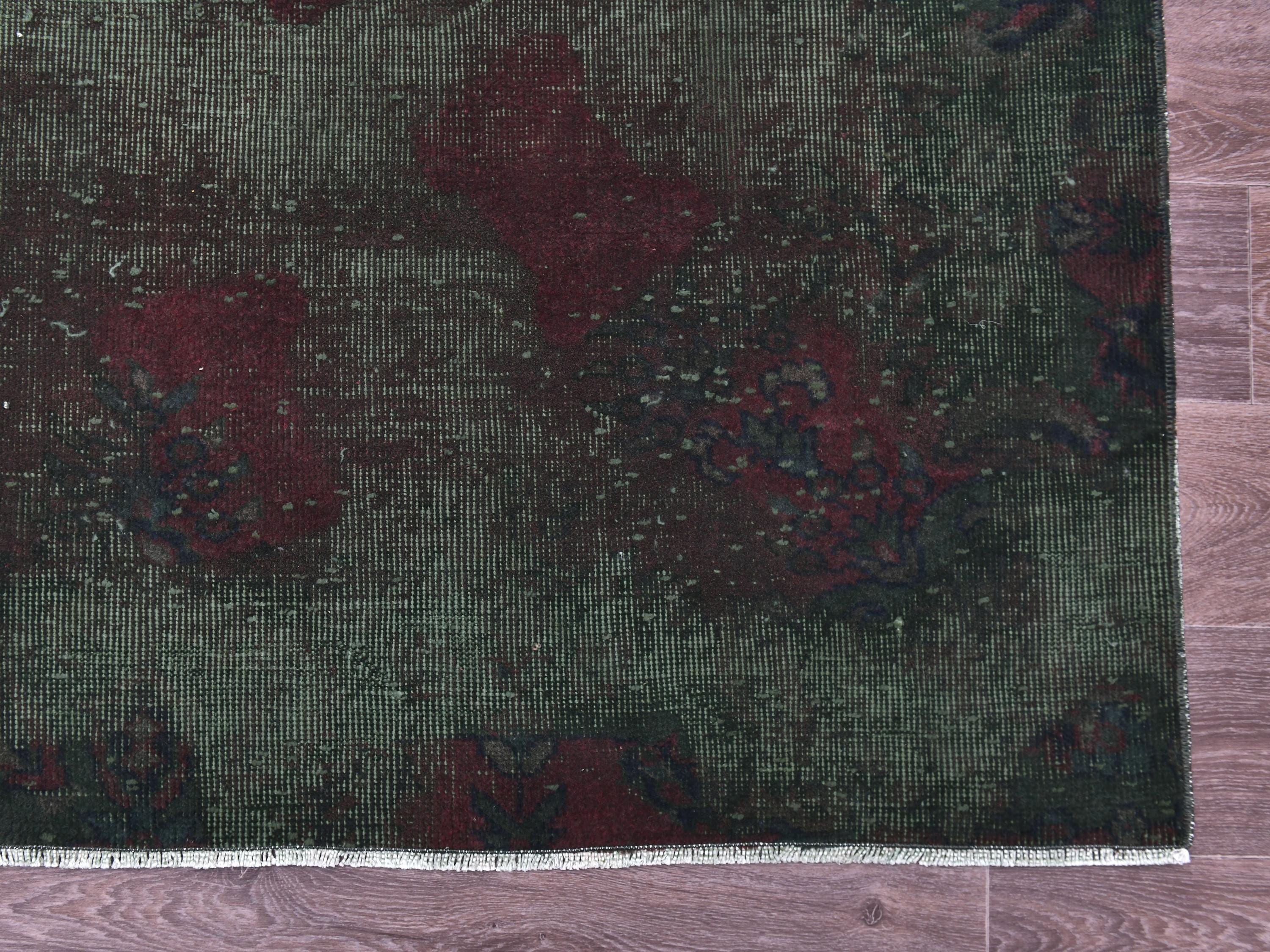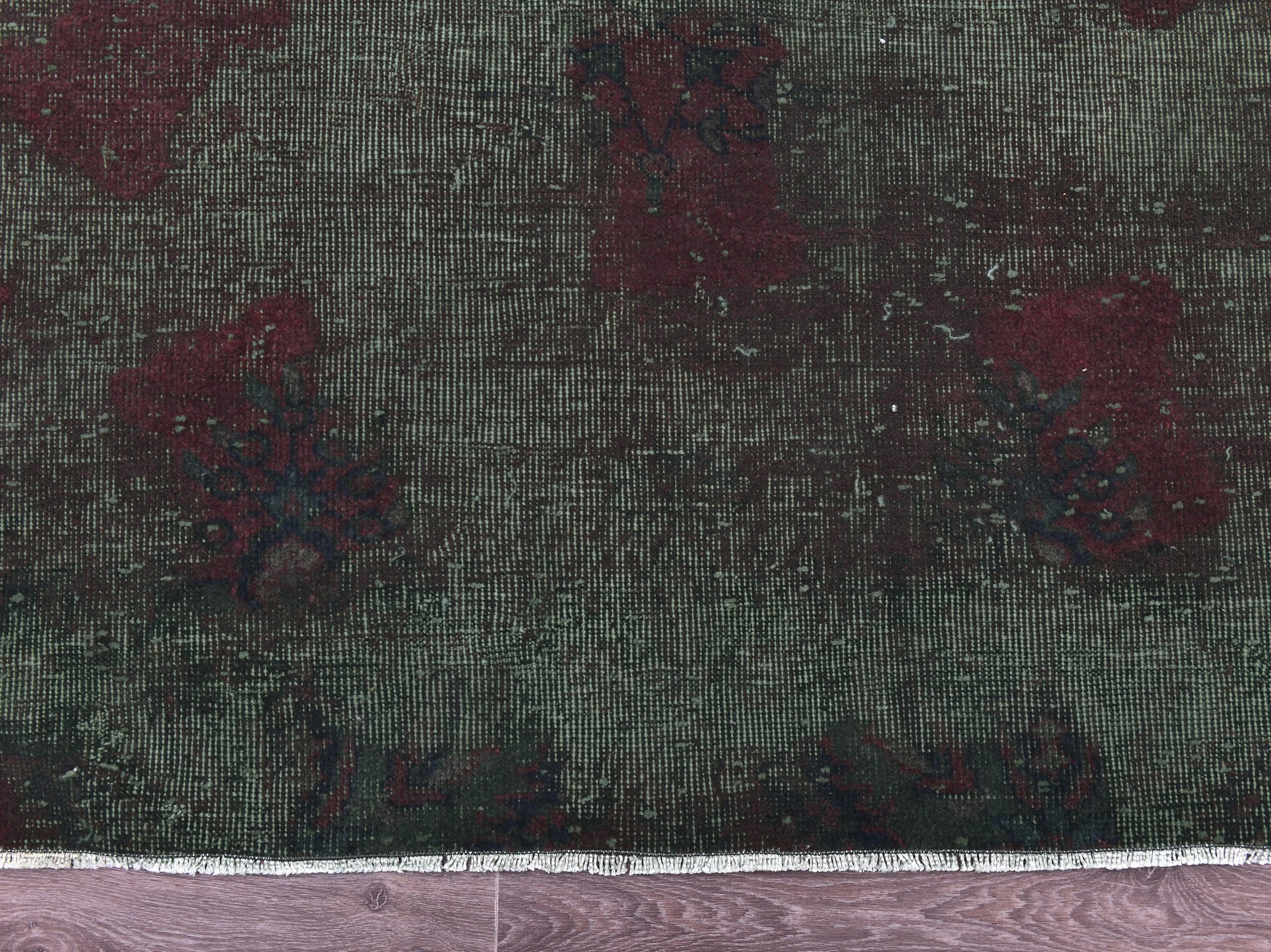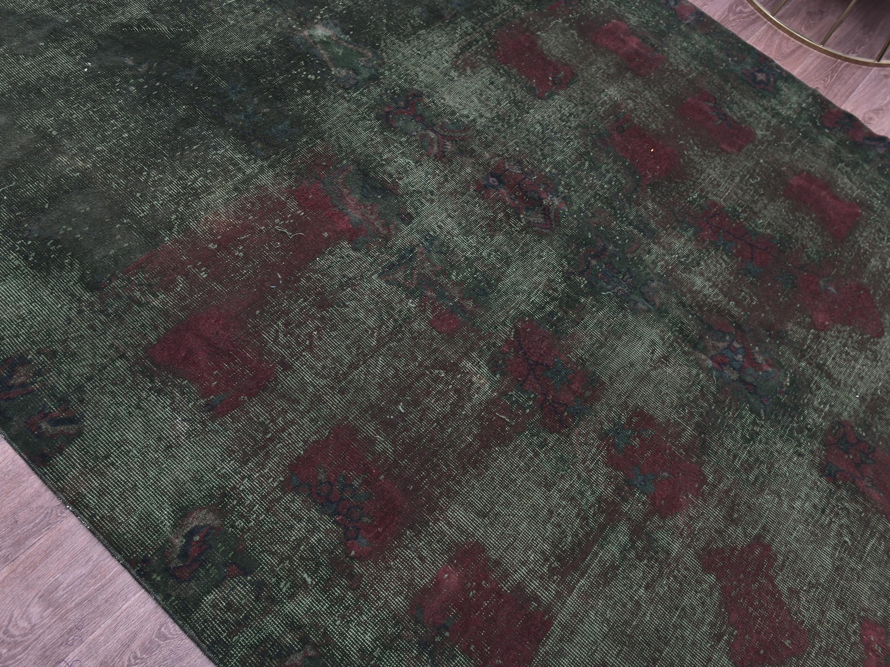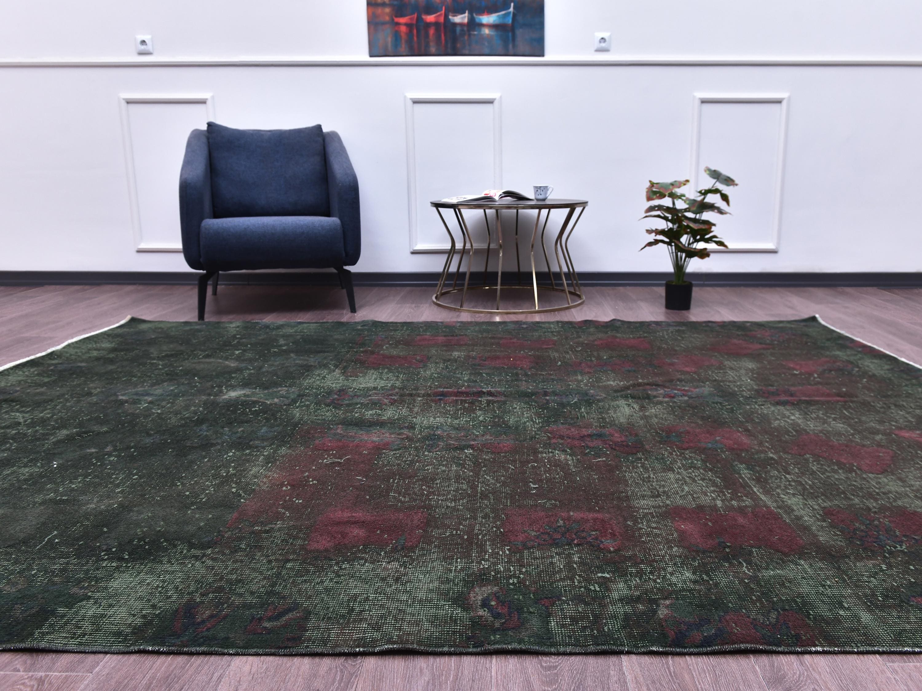 📜📌 Overdyed vintage Turkish area rug featuring distressed floral medallion patterns in deep green and burgundy colors. Hand-knotted wool carpet with worn patina finish, displayed on grey hardwood floor with modern furniture. Traditional Oriental design transformed through contemporary overdyeing technique.