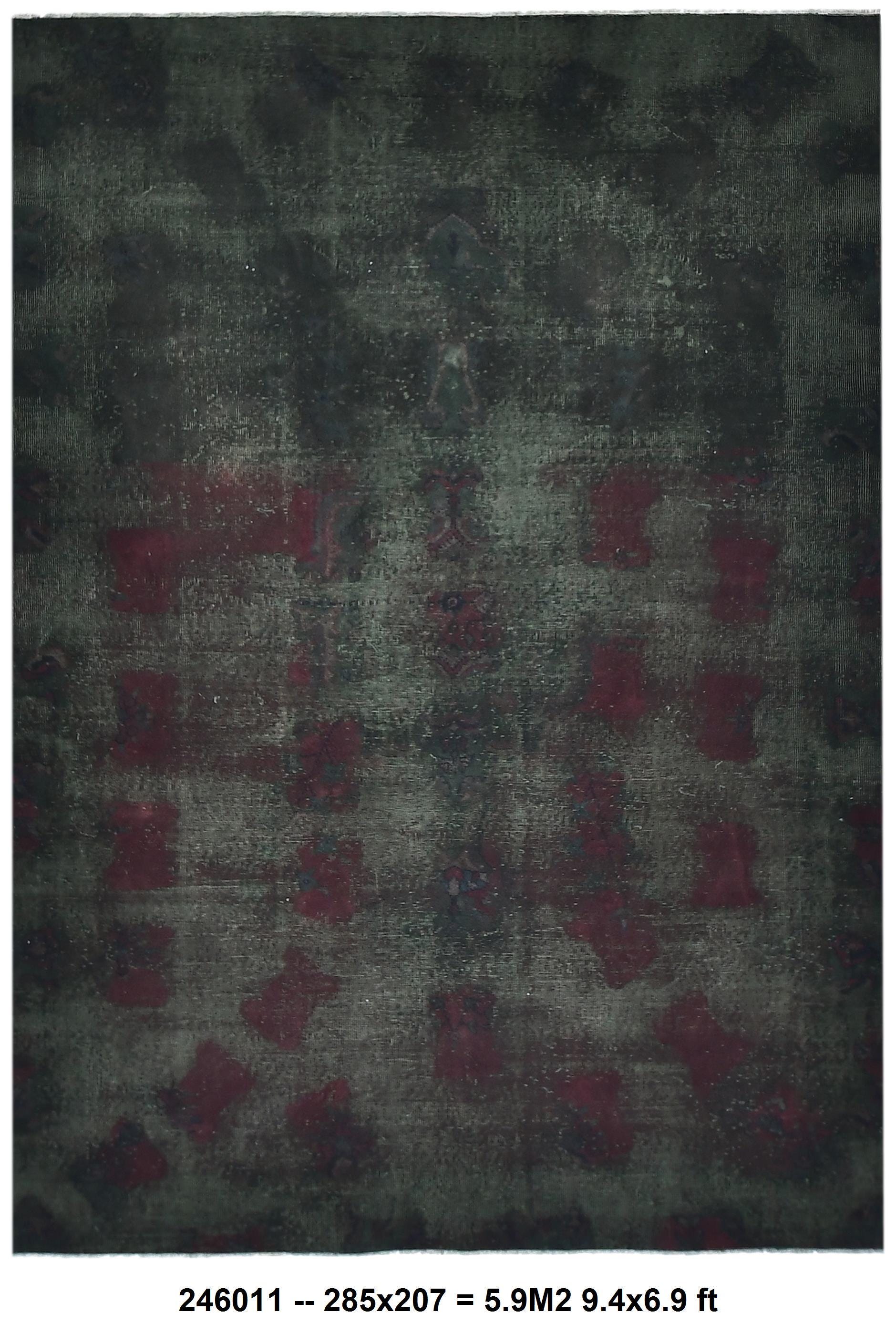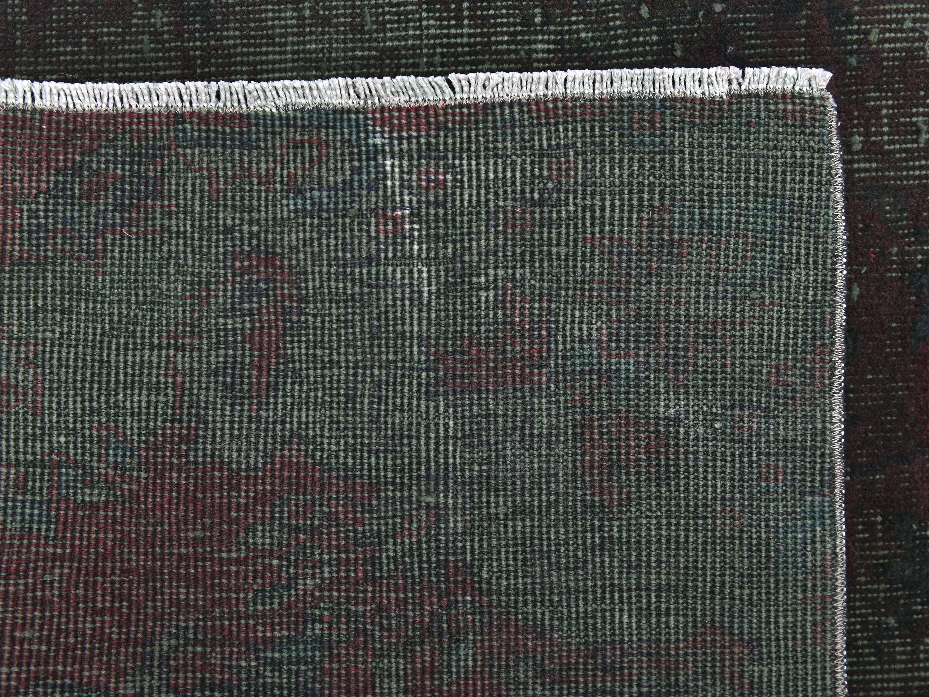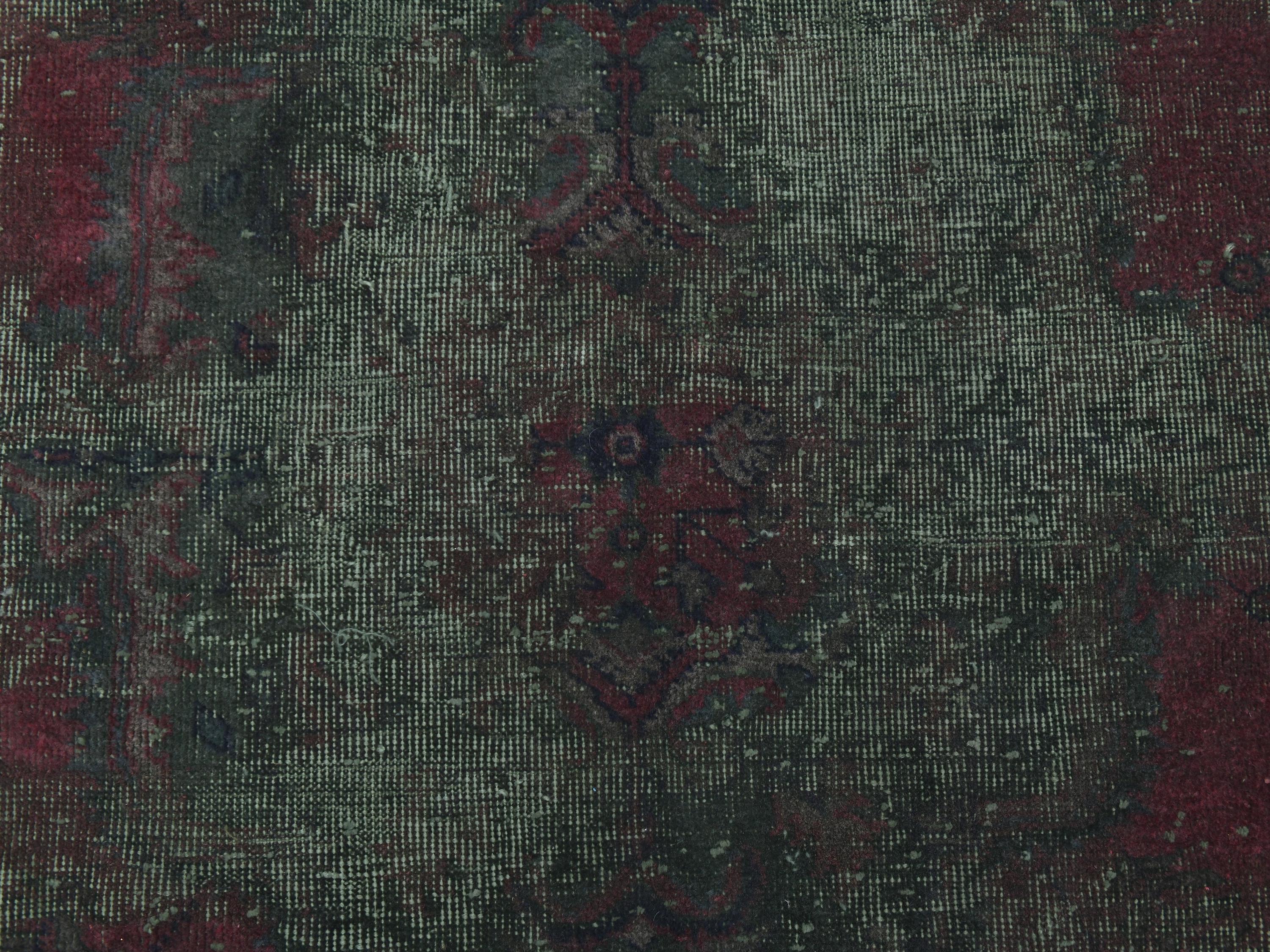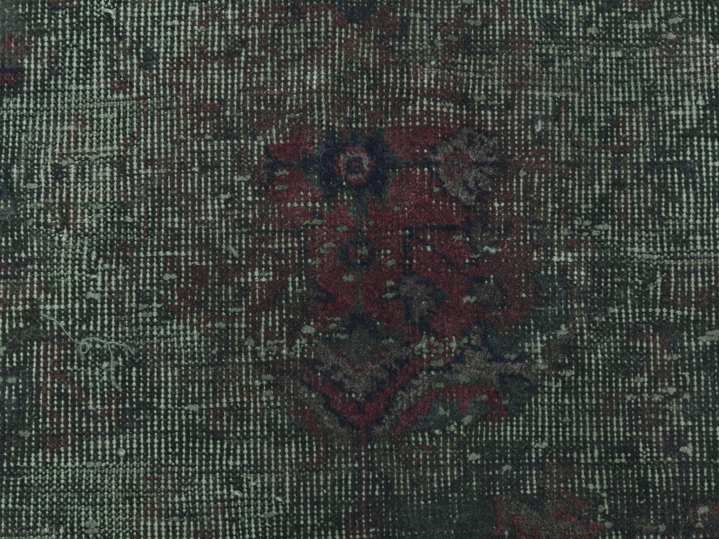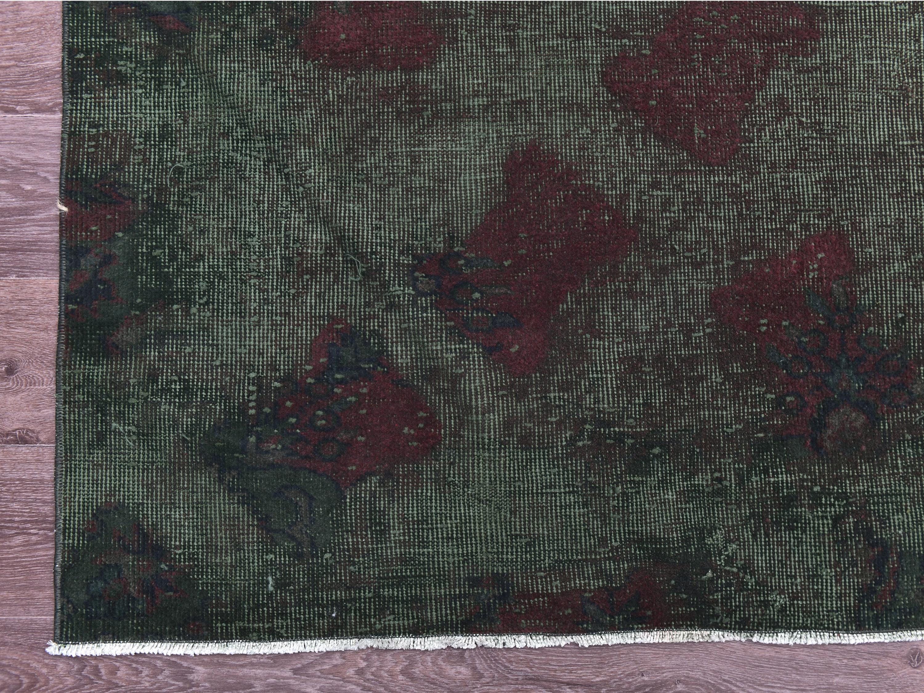 📜📌 Overdyed vintage Turkish area rug featuring distressed floral medallion patterns in deep green and burgundy colors. Hand-knotted wool carpet with worn patina finish, displayed on grey hardwood floor with modern furniture. Traditional Oriental design transformed through contemporary overdyeing technique.