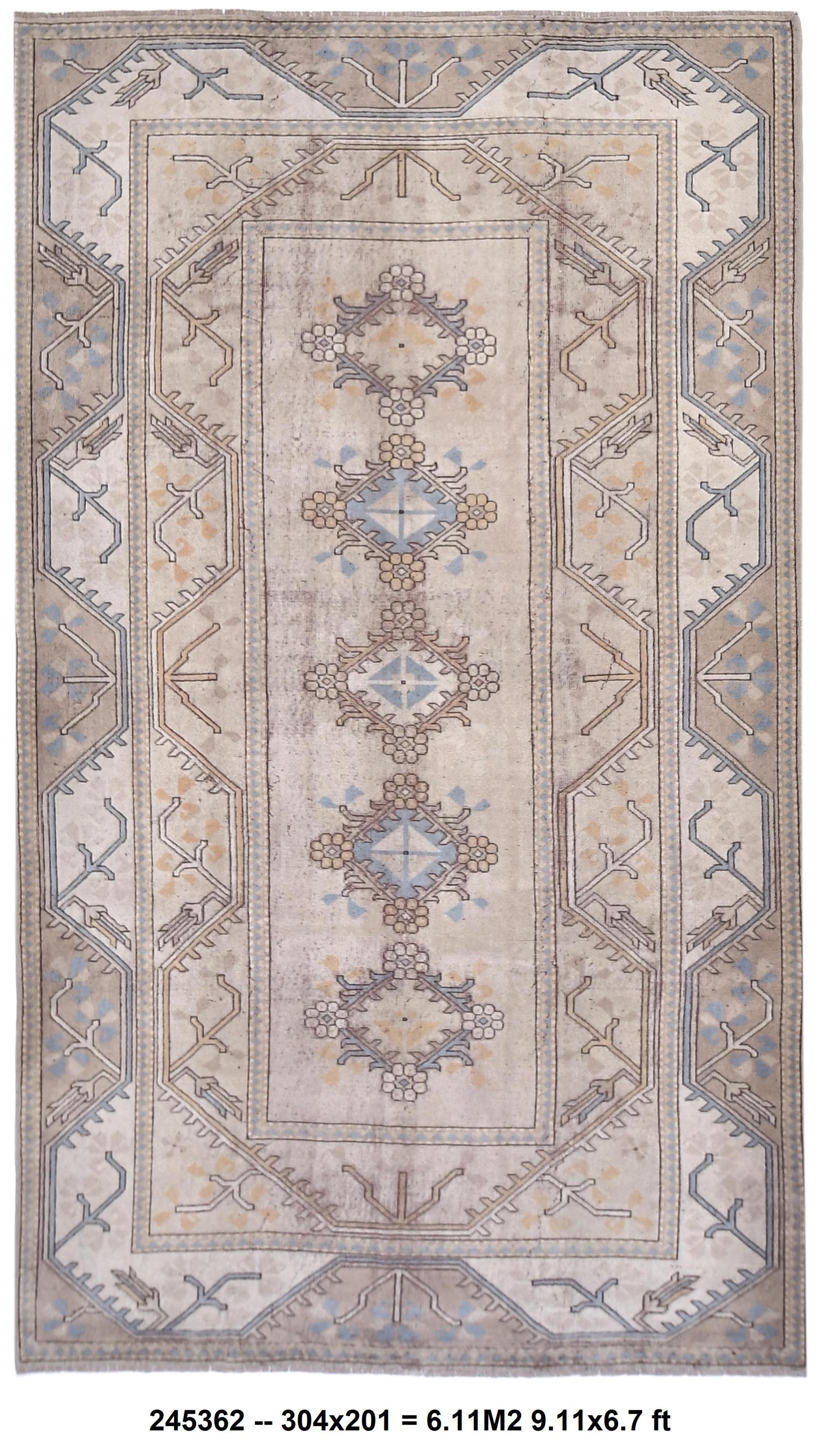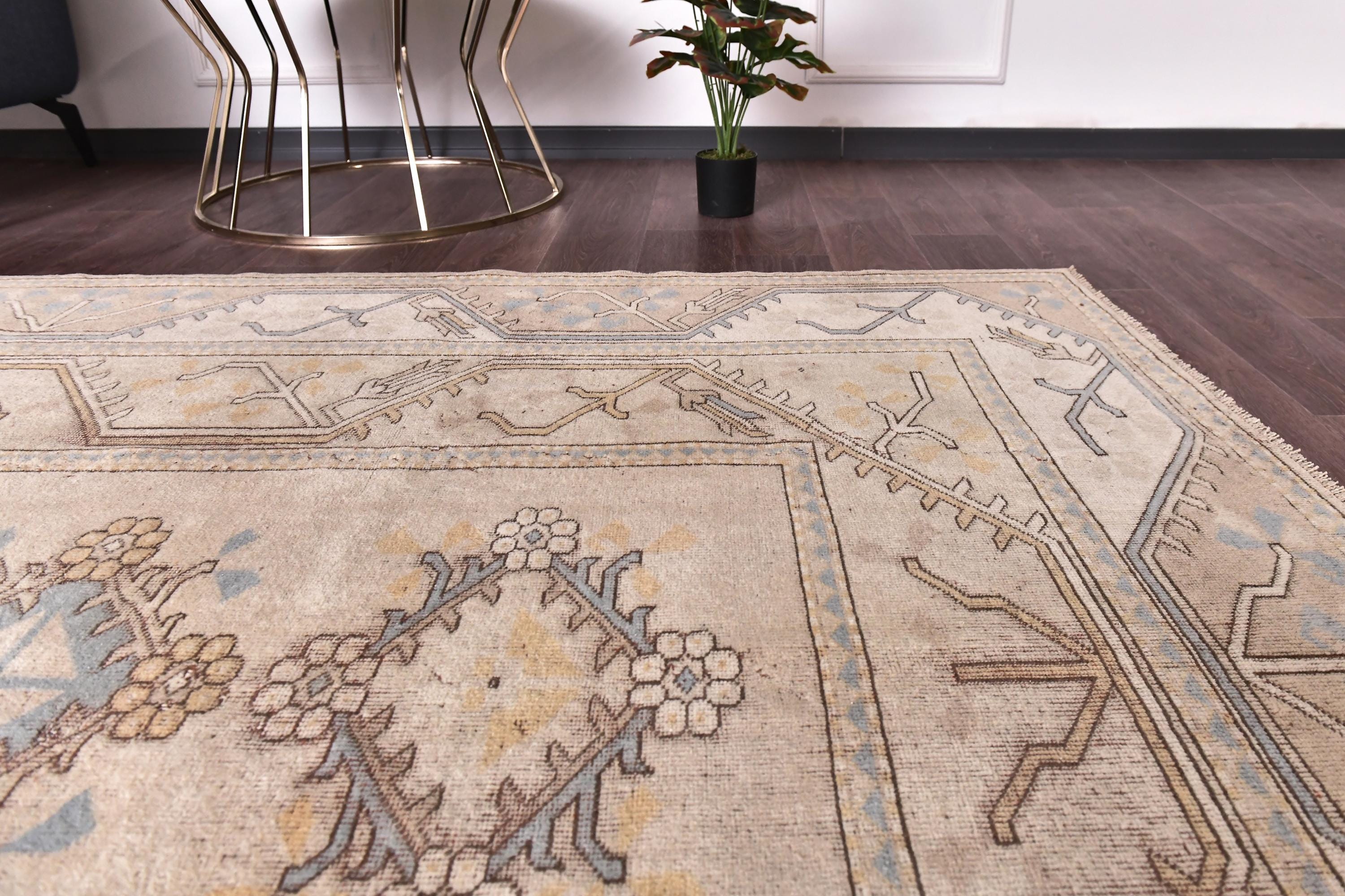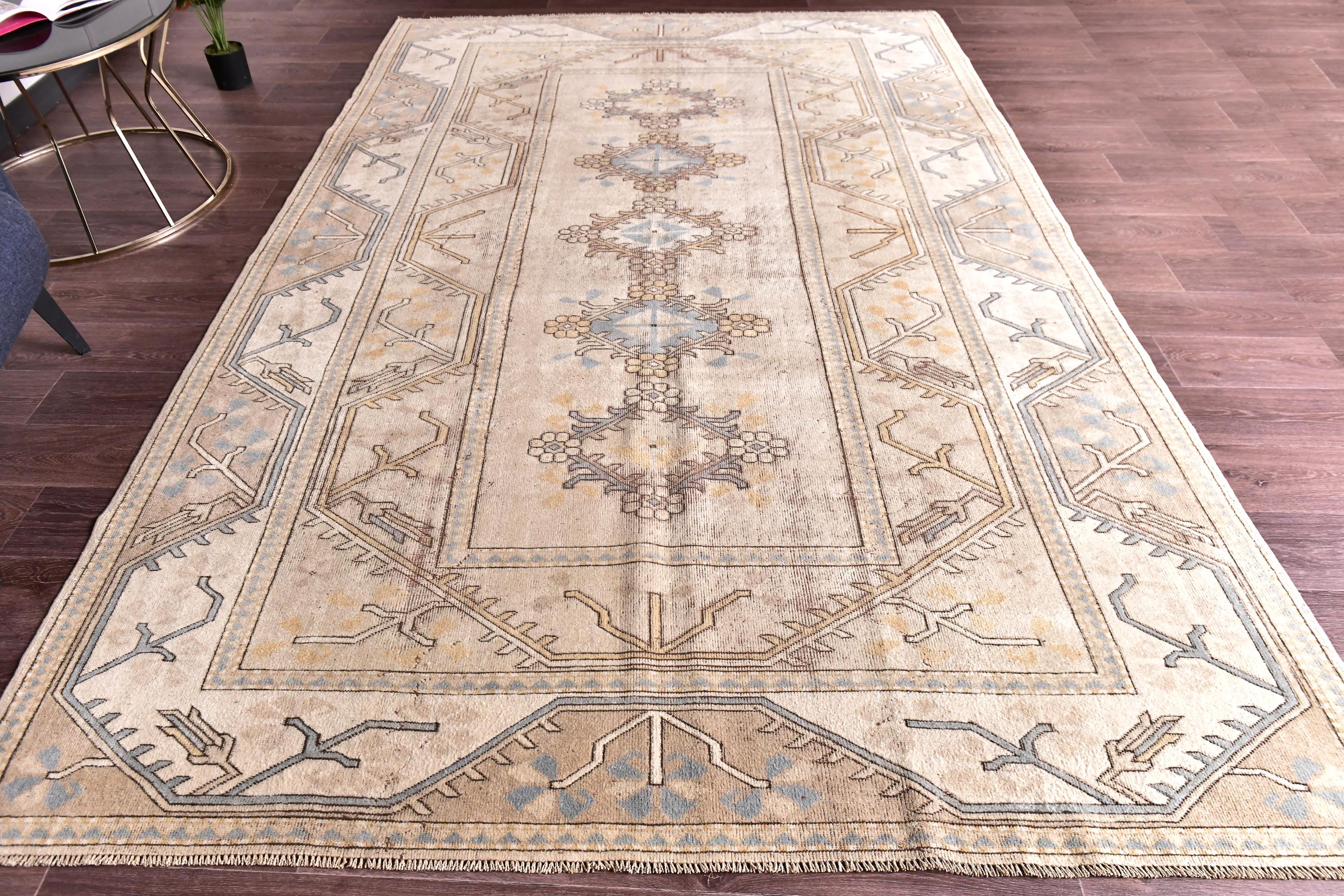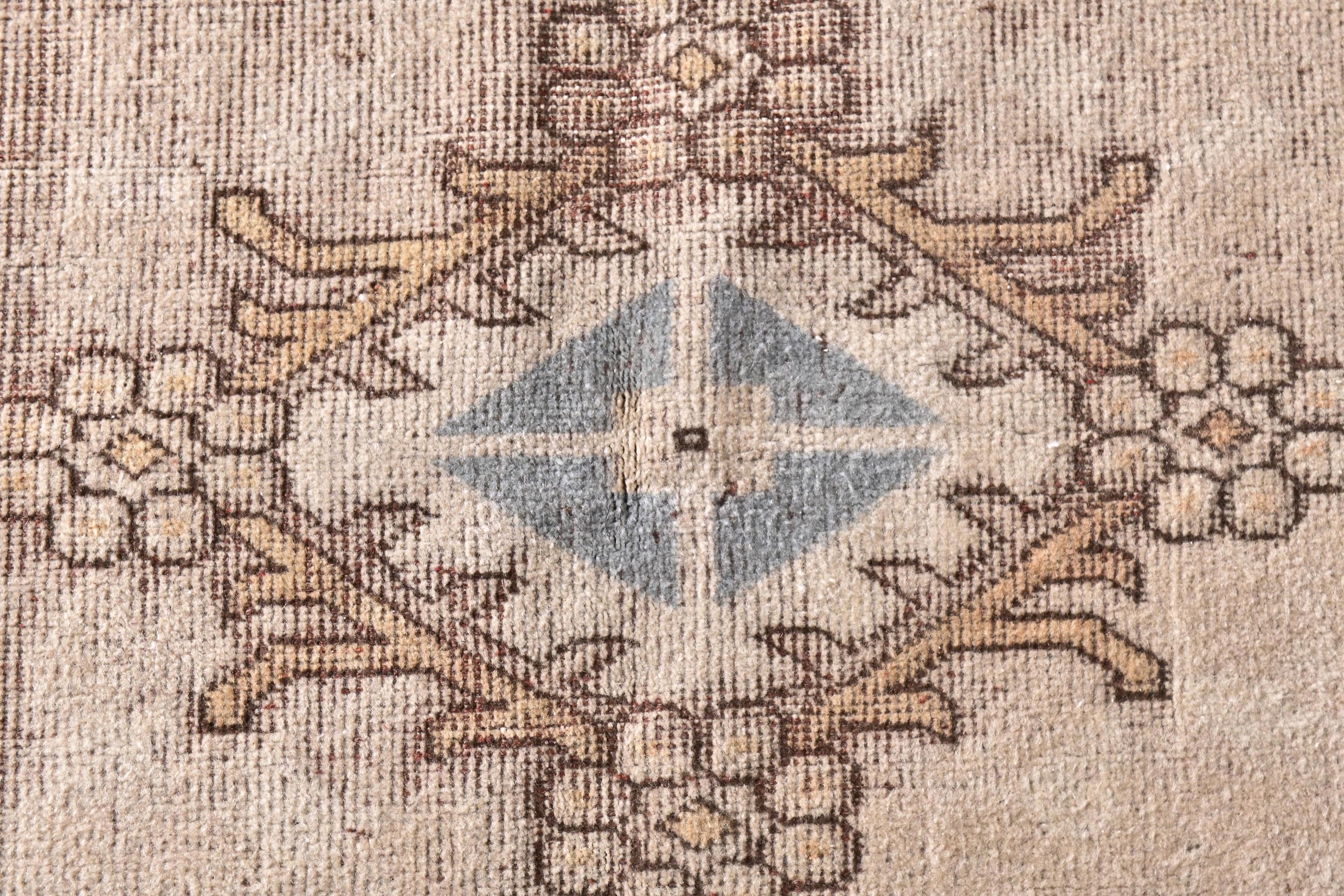 📜📌Vintage Turkish Oushak area rug featuring warm neutral color palette with camel beige, golden tan and soft blue gray accents, showcasing traditional Khotan style design with repeating geometric medallions in center field, wide decorative borders with tribal motifs, hand-knotted wool construction with naturally faded pile perfect for modern bohemian and transitional interiors