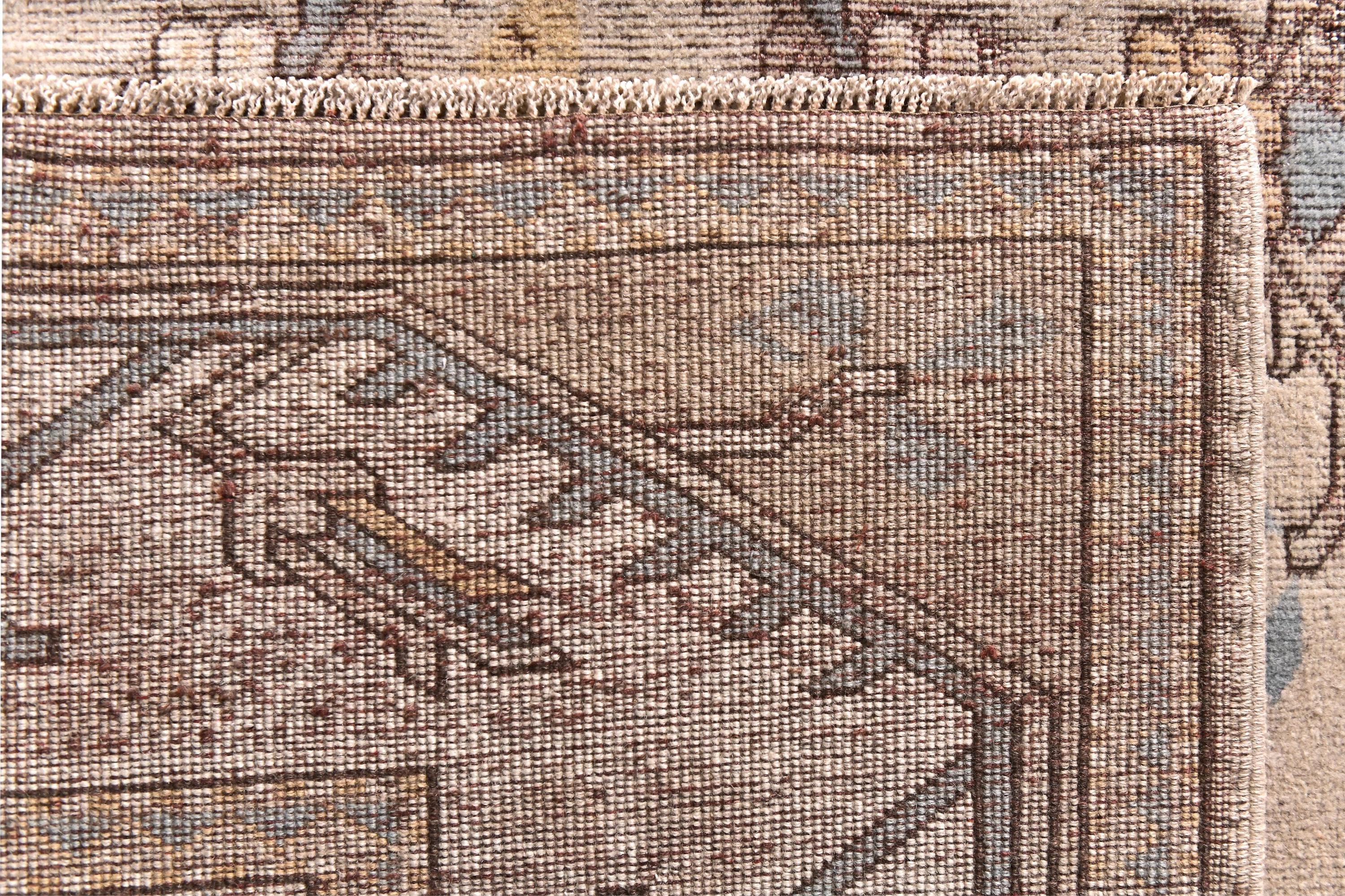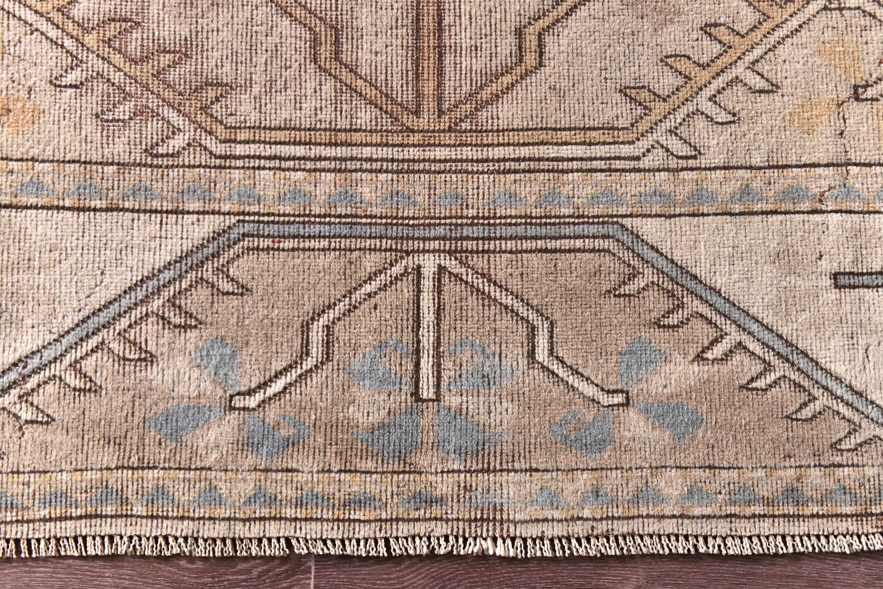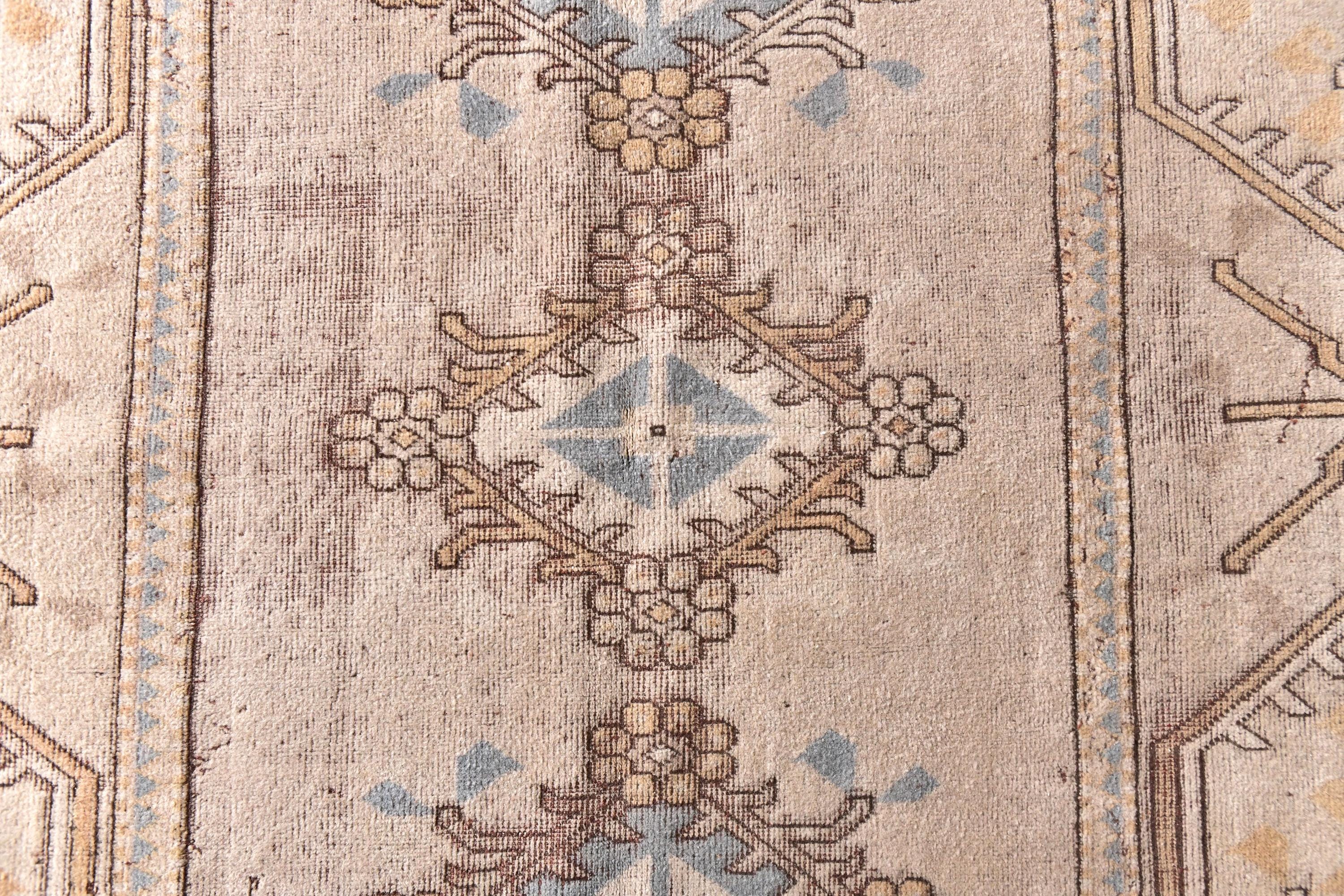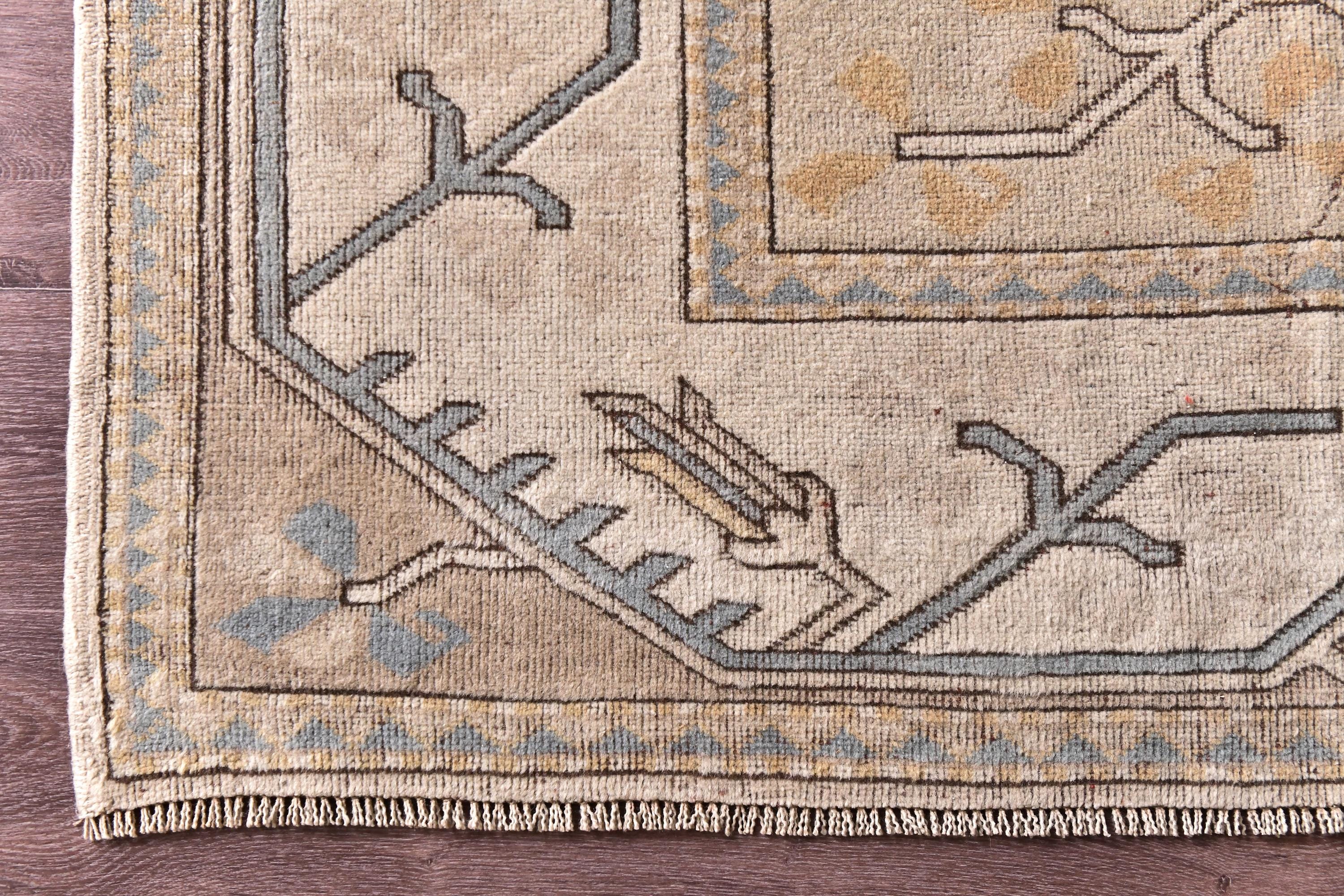 📜📌Vintage Turkish Oushak area rug featuring warm neutral color palette with camel beige, golden tan and soft blue gray accents, showcasing traditional Khotan style design with repeating geometric medallions in center field, wide decorative borders with tribal motifs, hand-knotted wool construction with naturally faded pile perfect for modern bohemian and transitional interiors