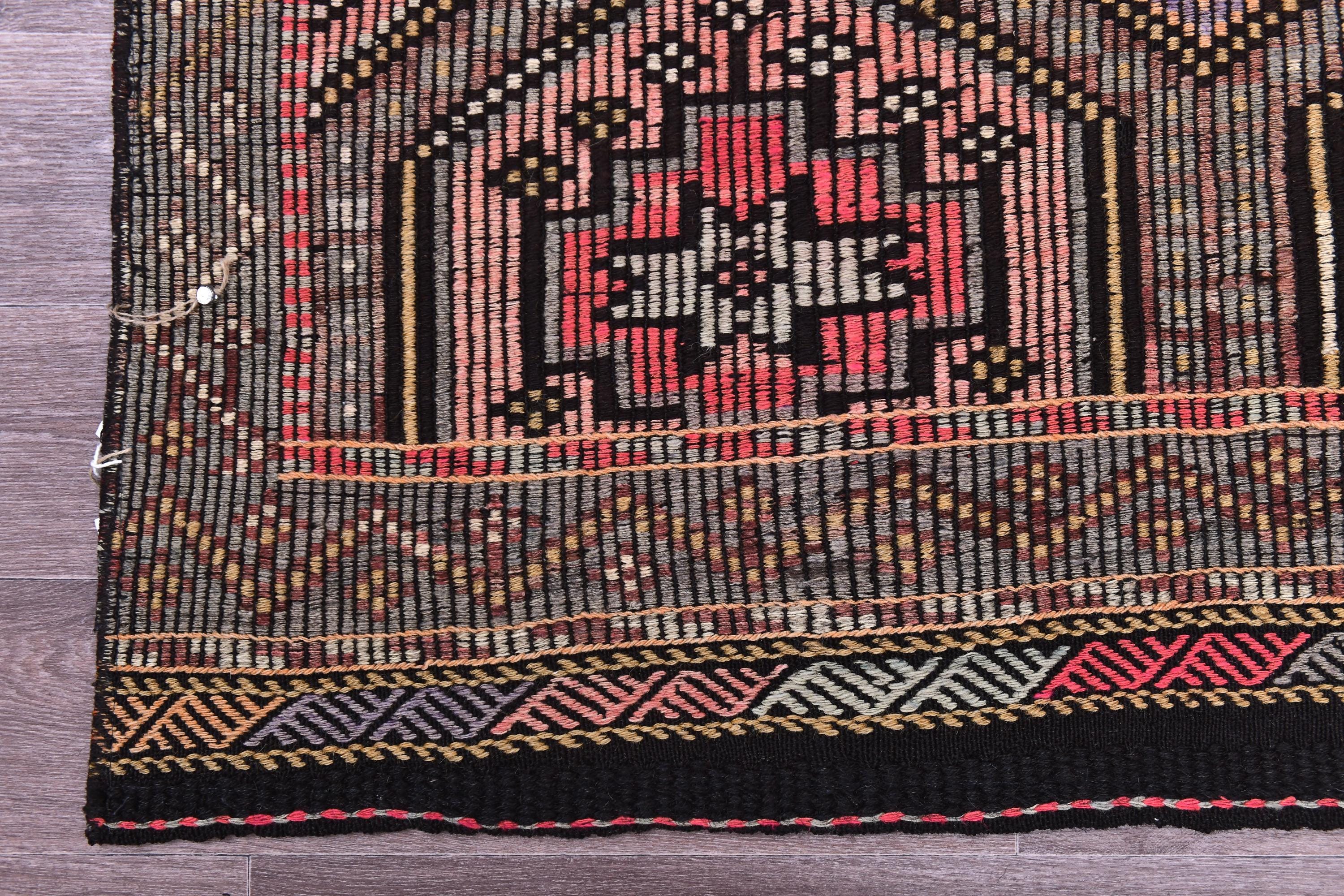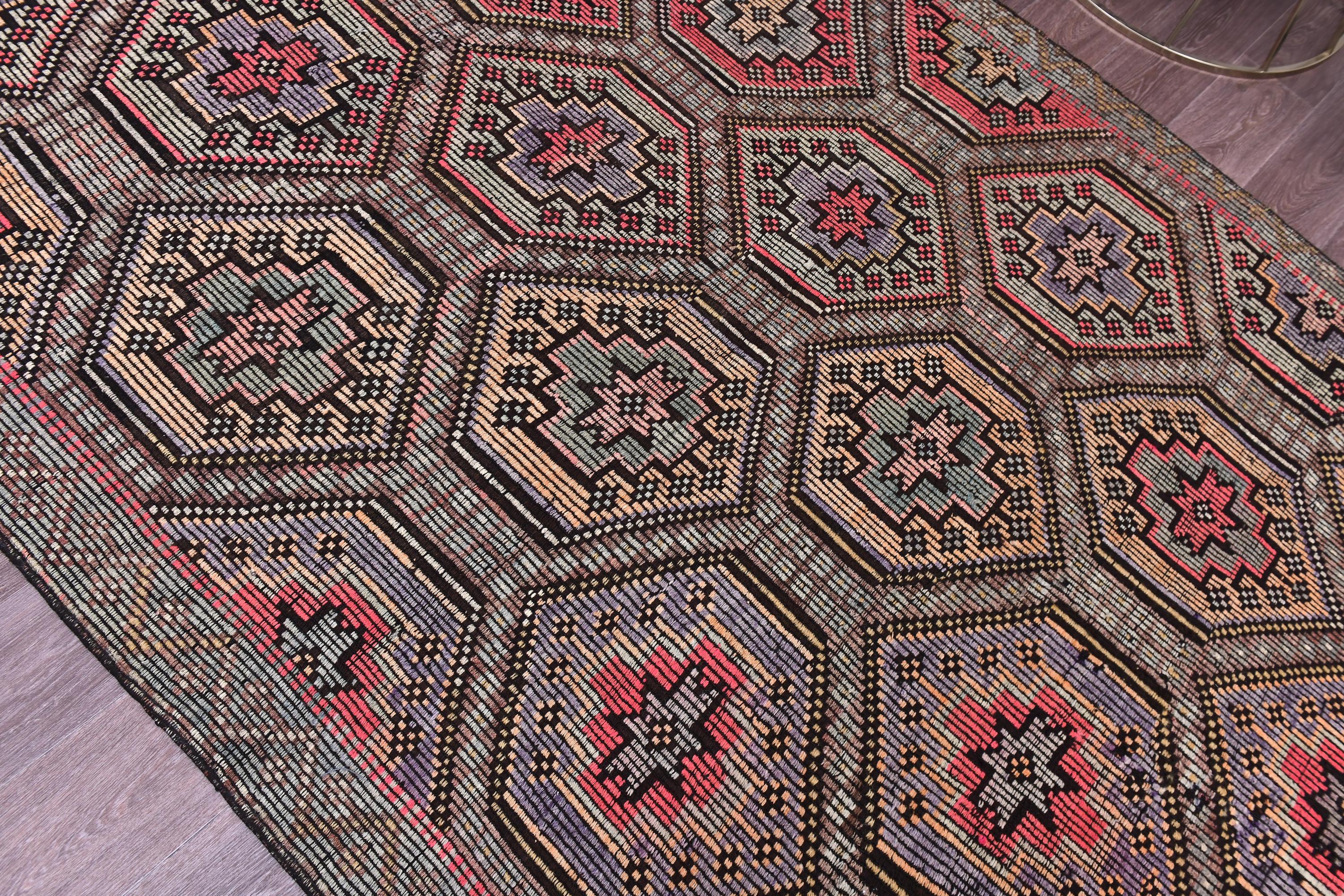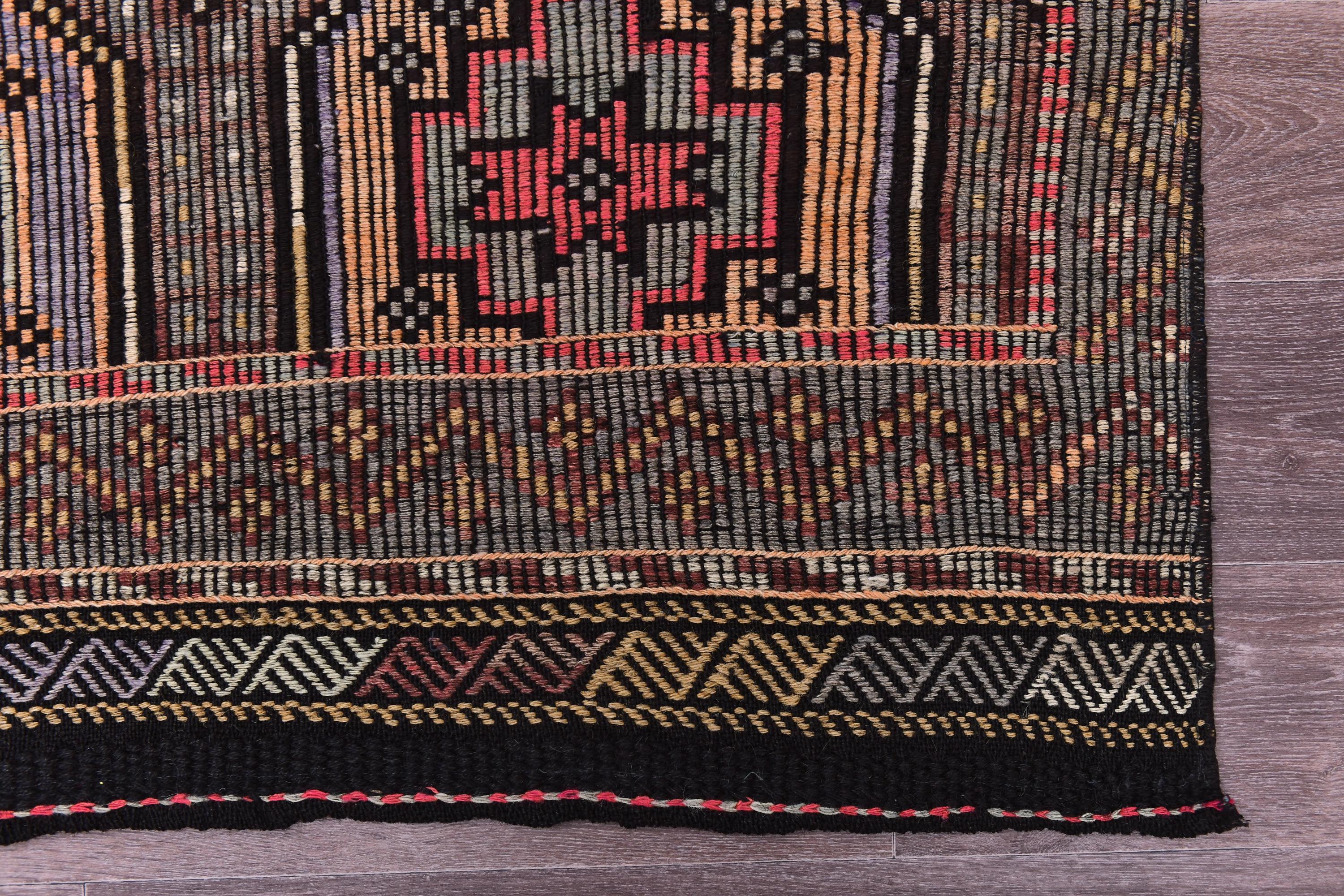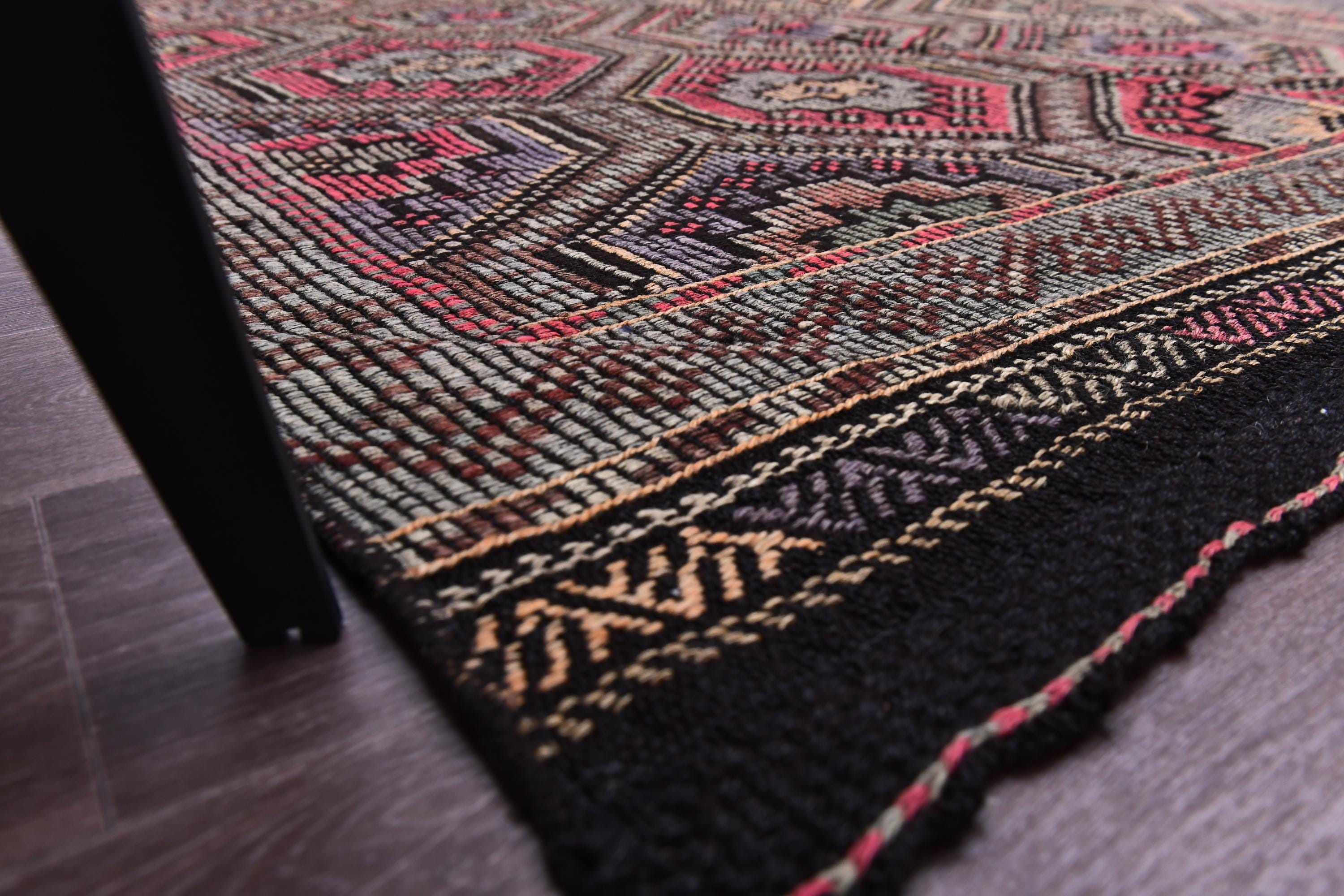 📜📌 Vintage Turkish kilim flatweave rug featuring repeating hexagonal geometric pattern in black, coral red, tan, and cream colors with intricate embroidered cicim details and tribal motifs throughout