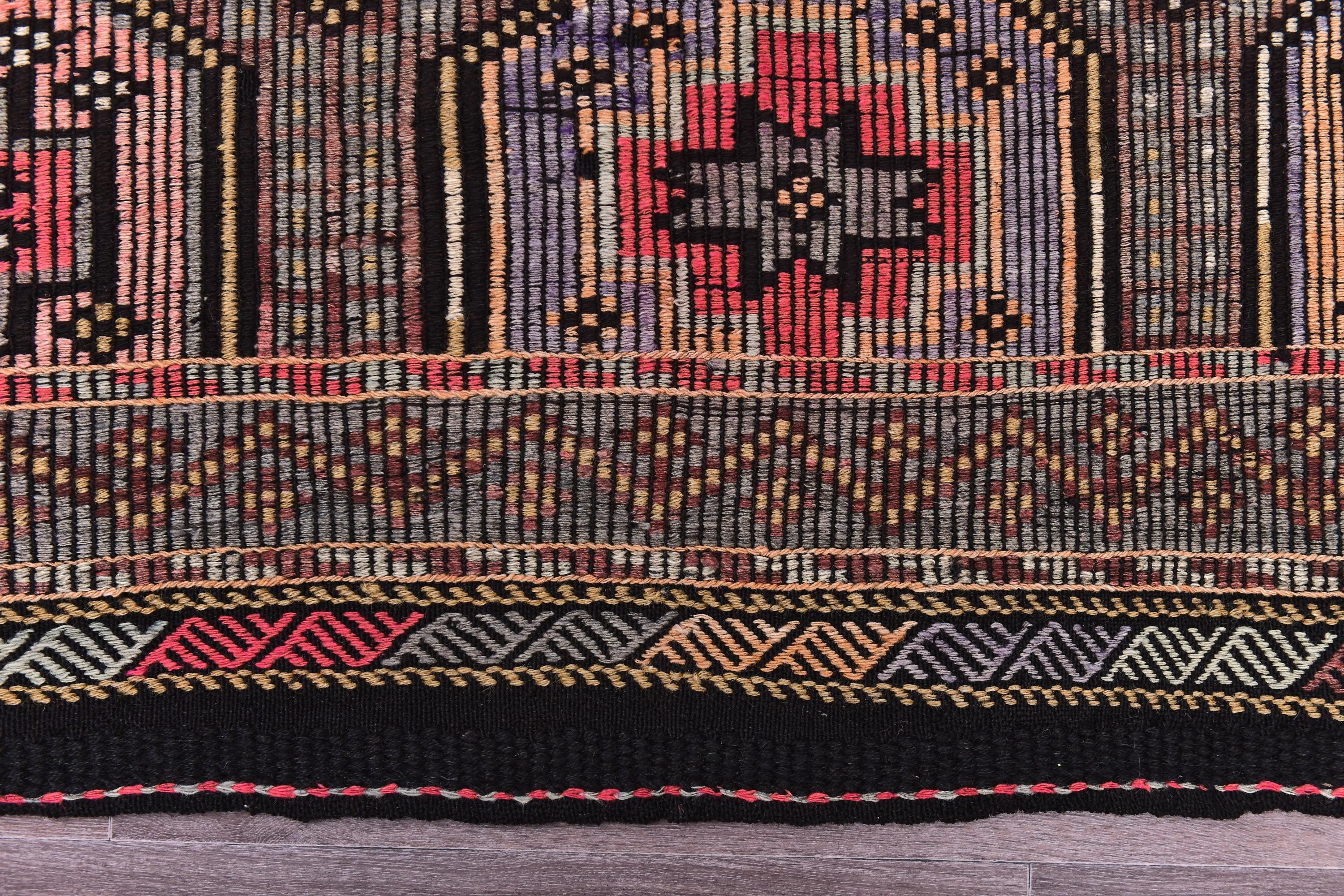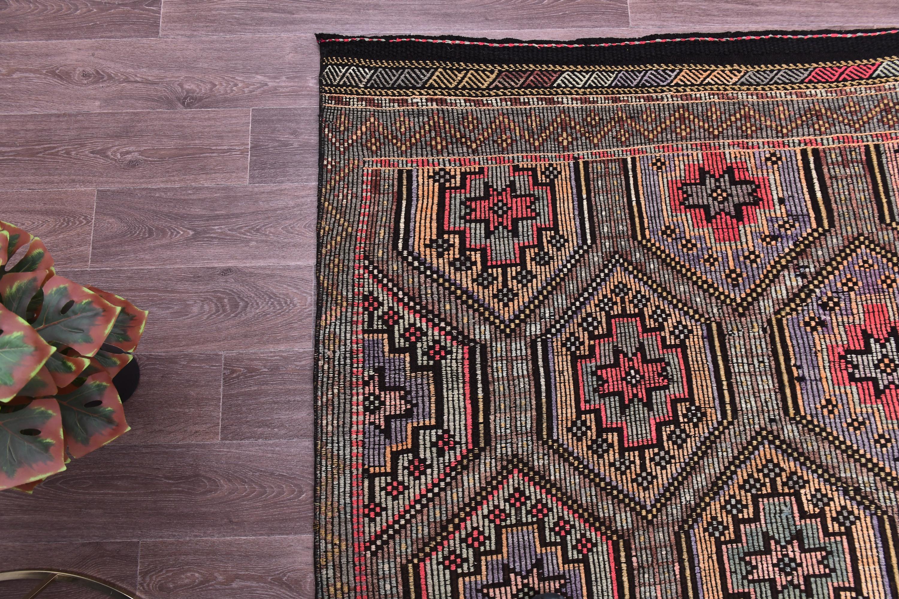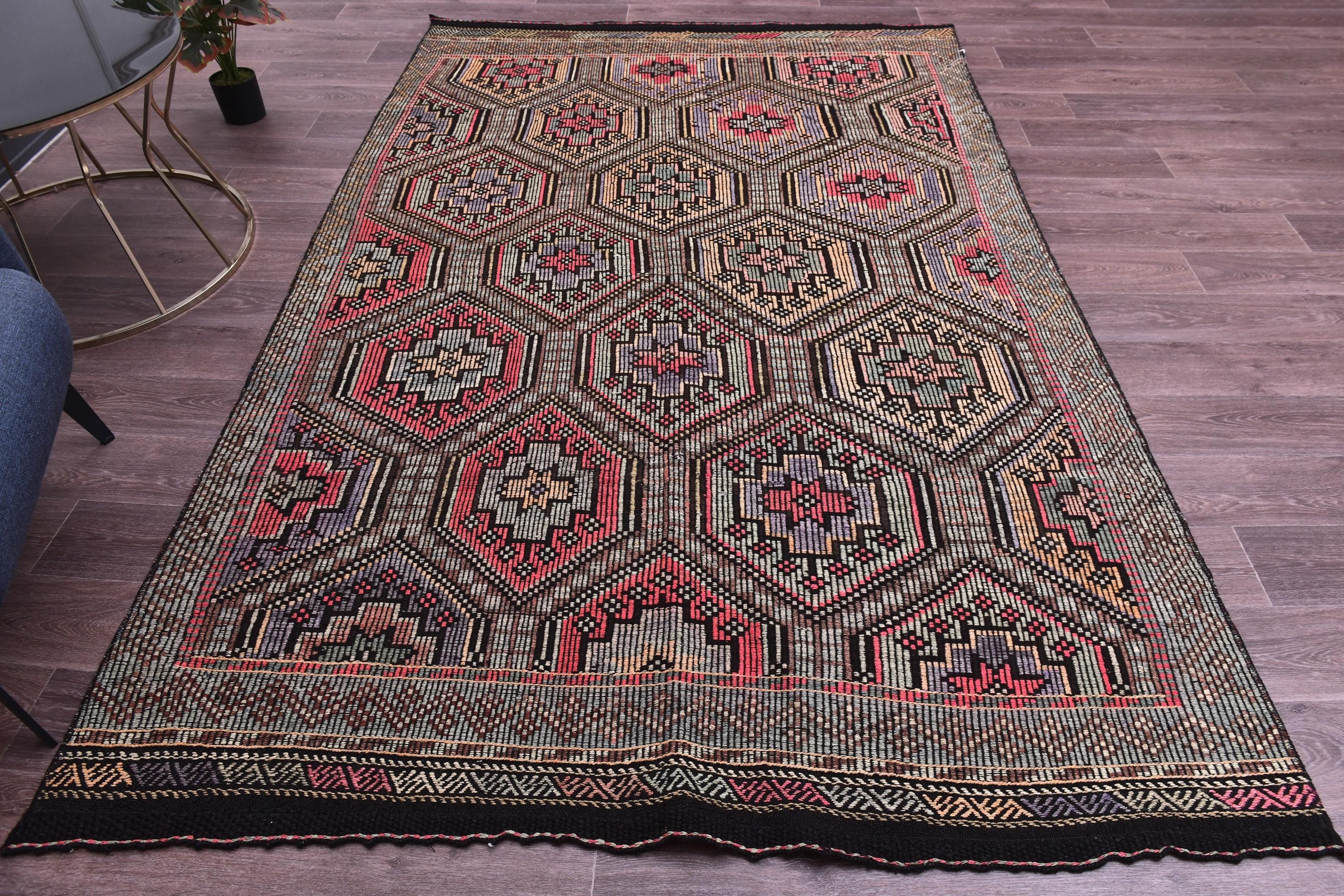 📜📌 Vintage Turkish kilim flatweave rug featuring repeating hexagonal geometric pattern in black, coral red, tan, and cream colors with intricate embroidered cicim details and tribal motifs throughout