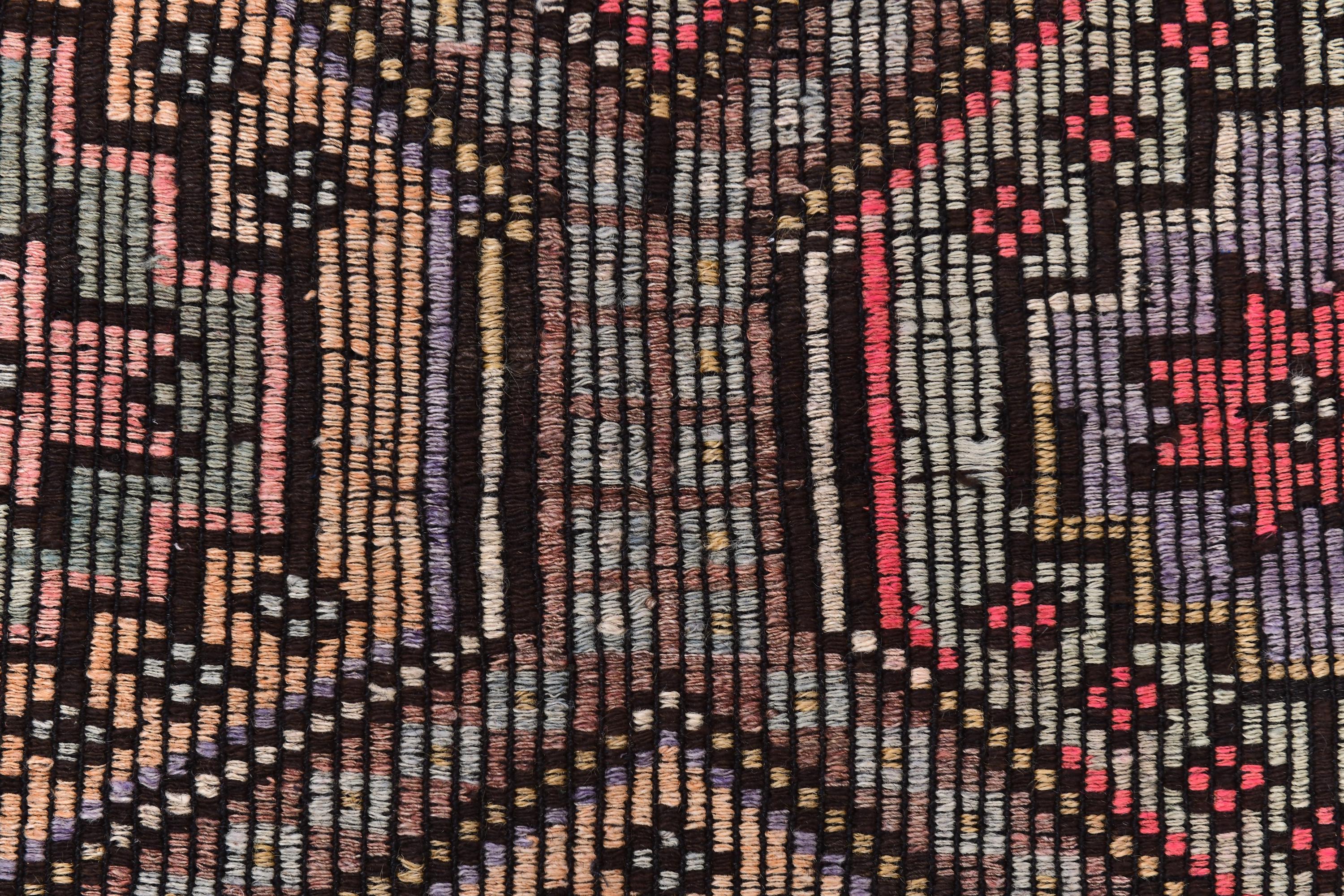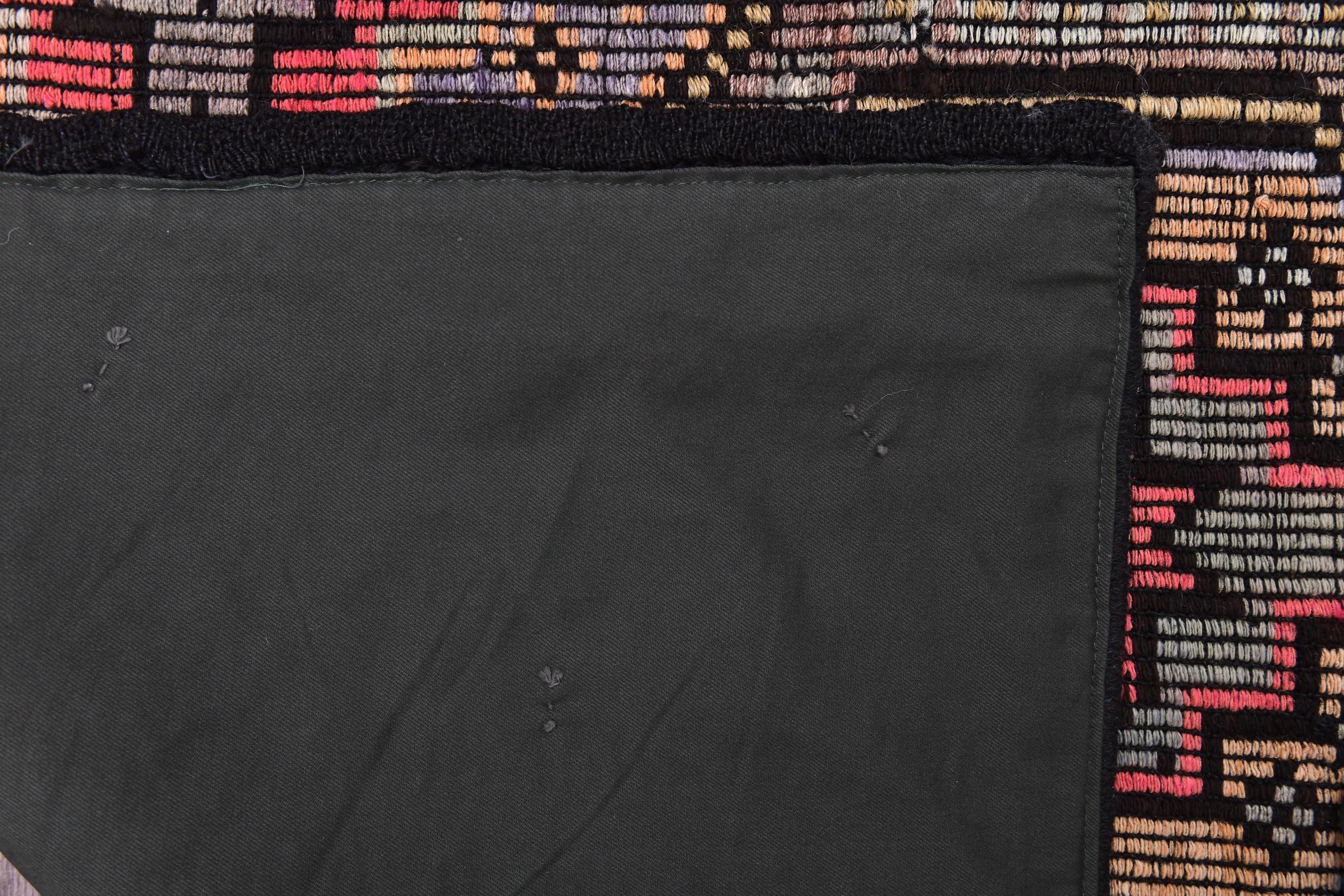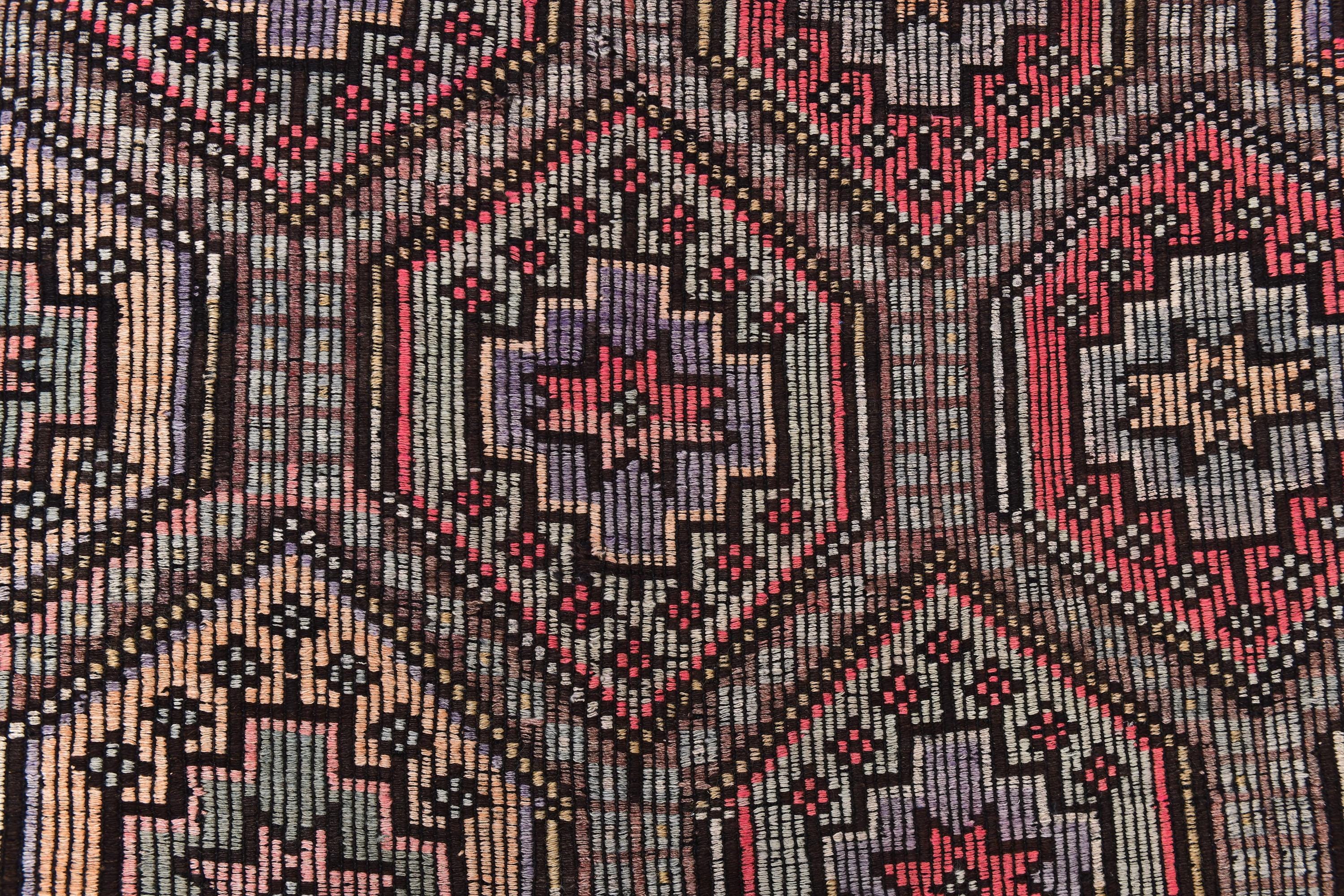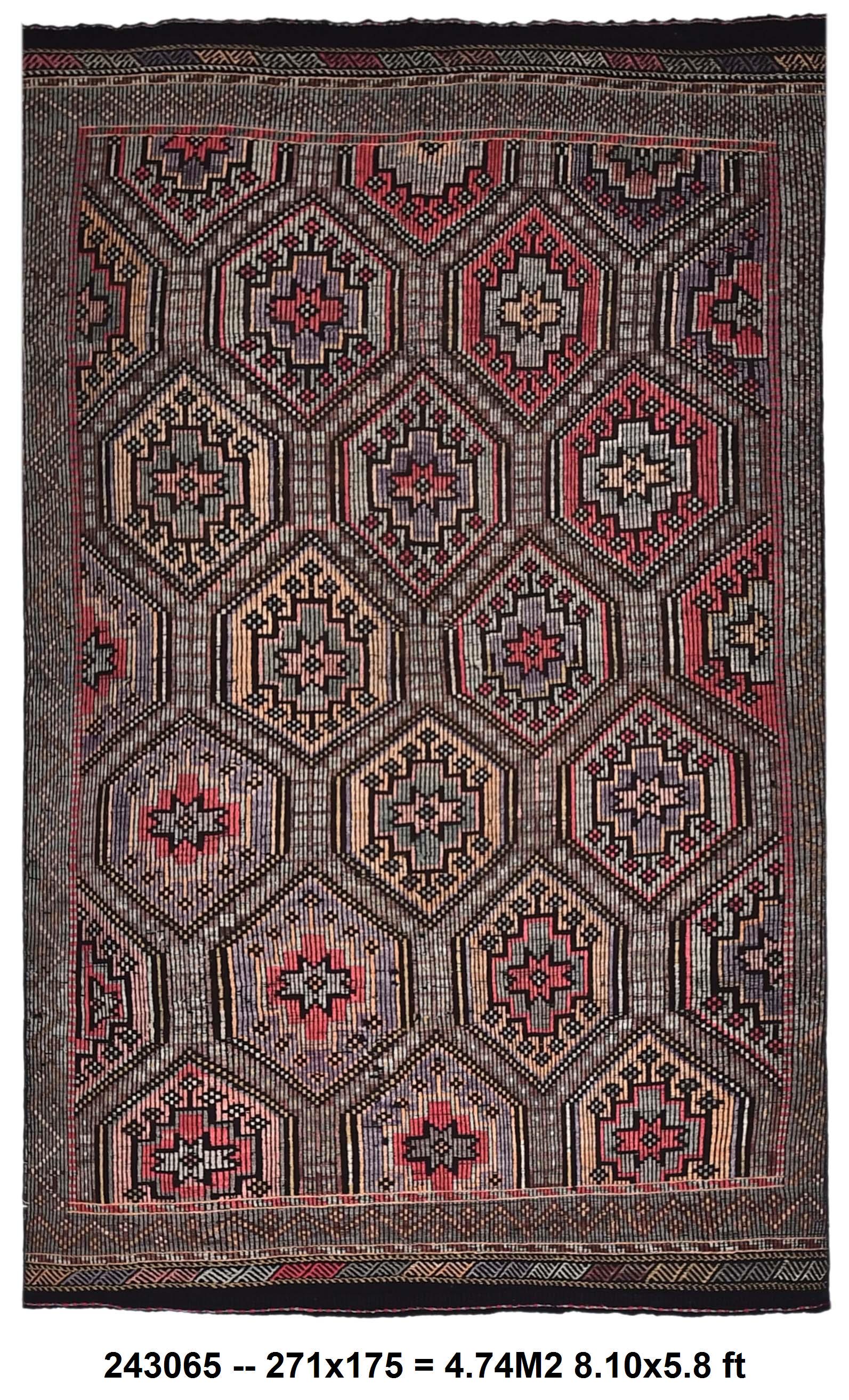 📜📌 Vintage Turkish kilim flatweave rug featuring repeating hexagonal geometric pattern in black, coral red, tan, and cream colors with intricate embroidered cicim details and tribal motifs throughout