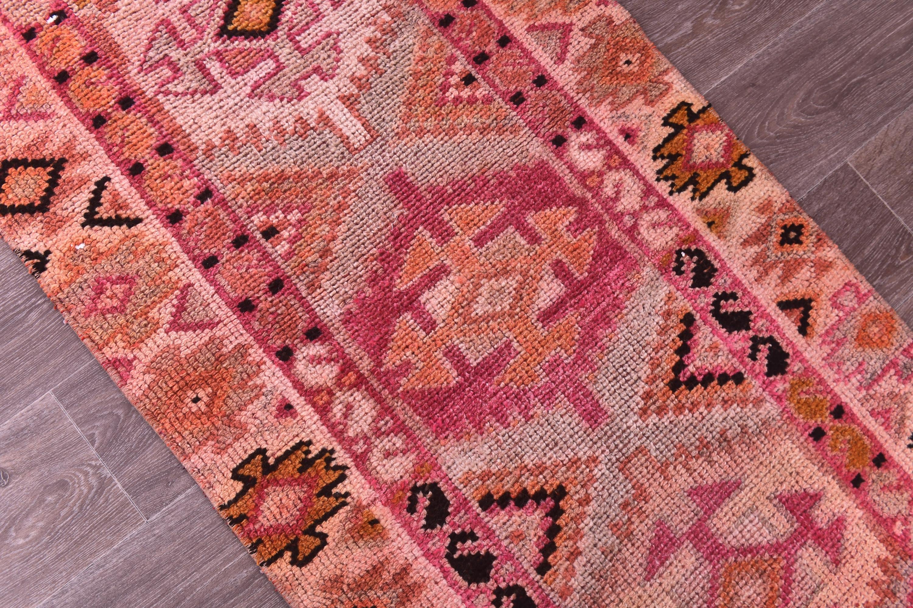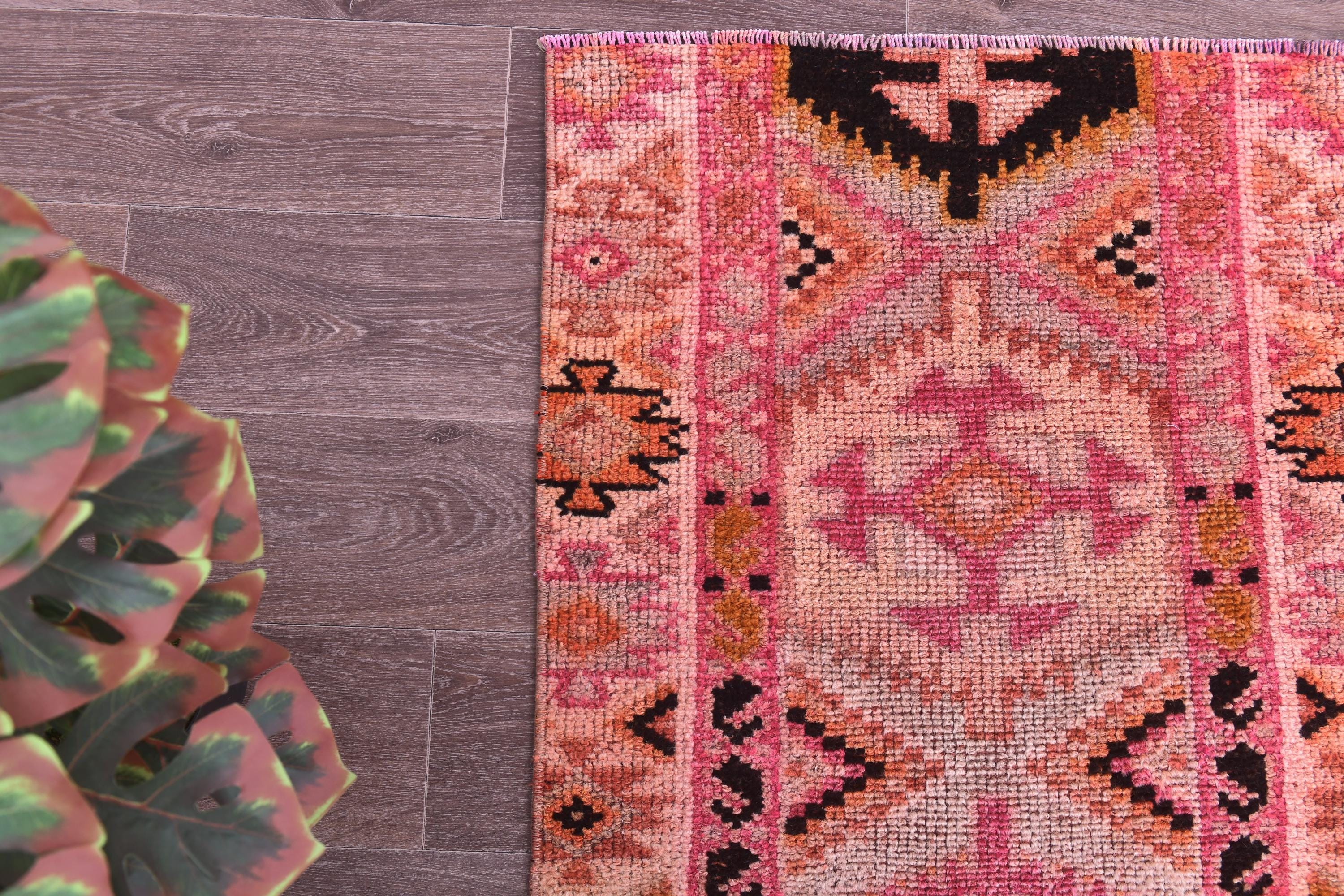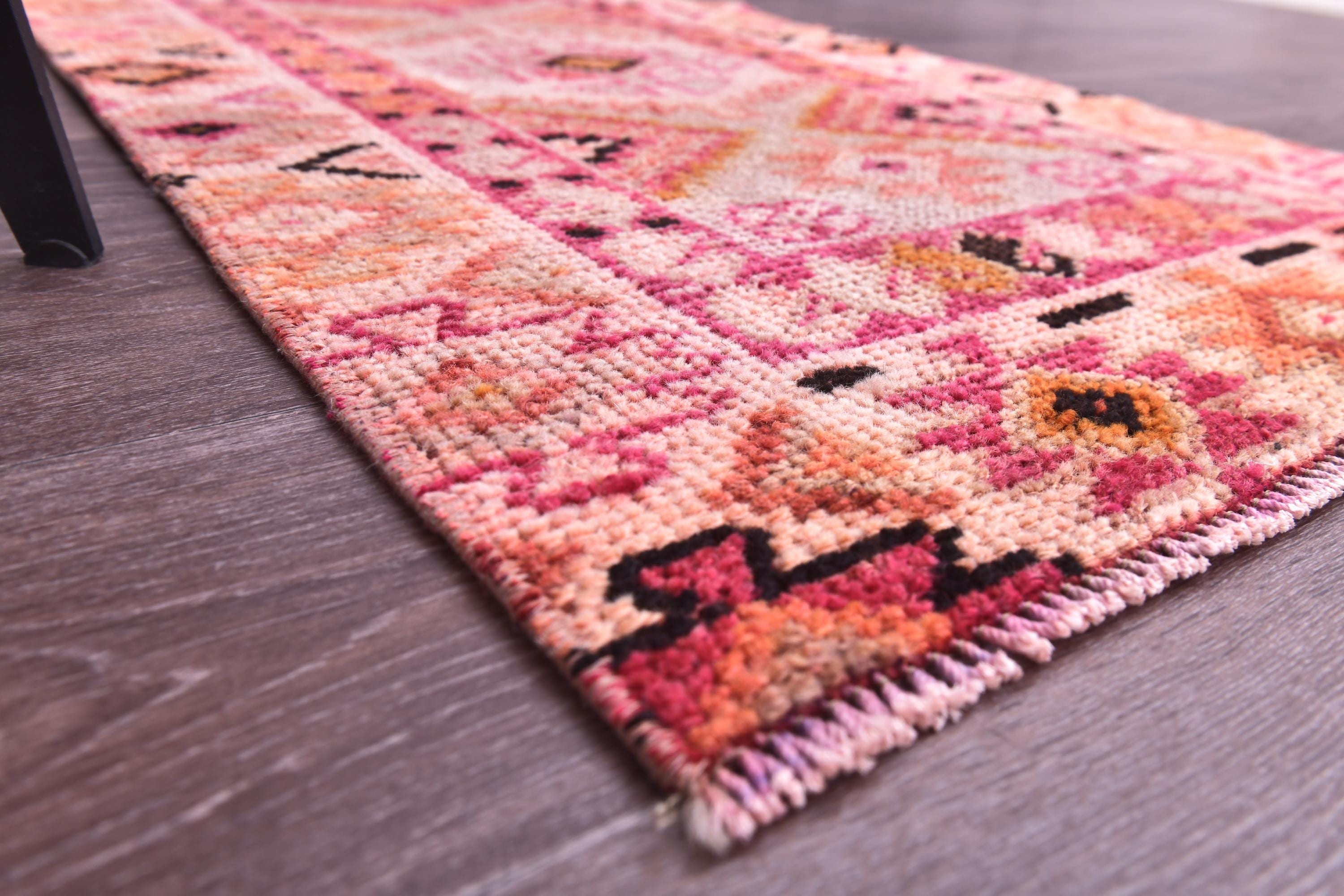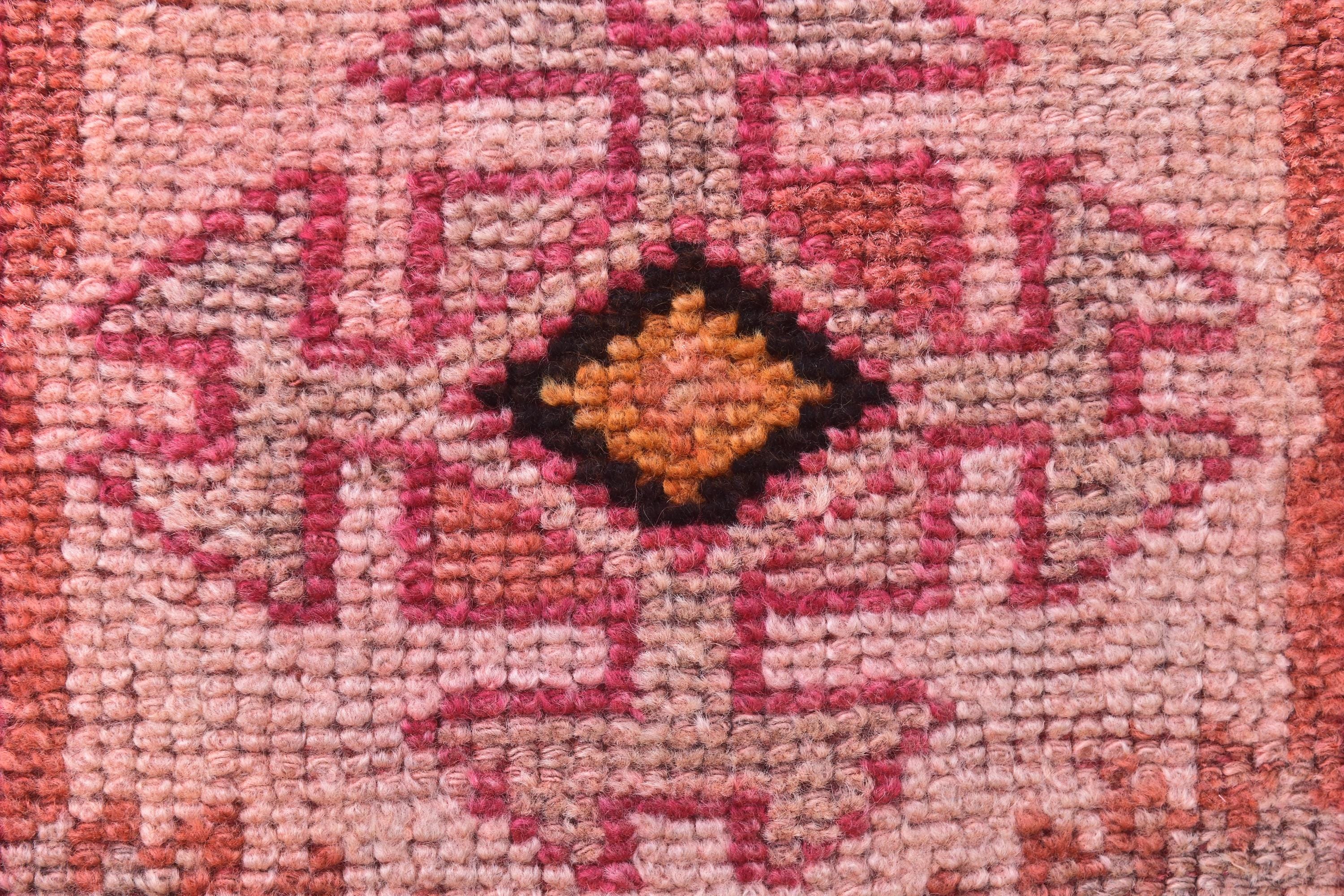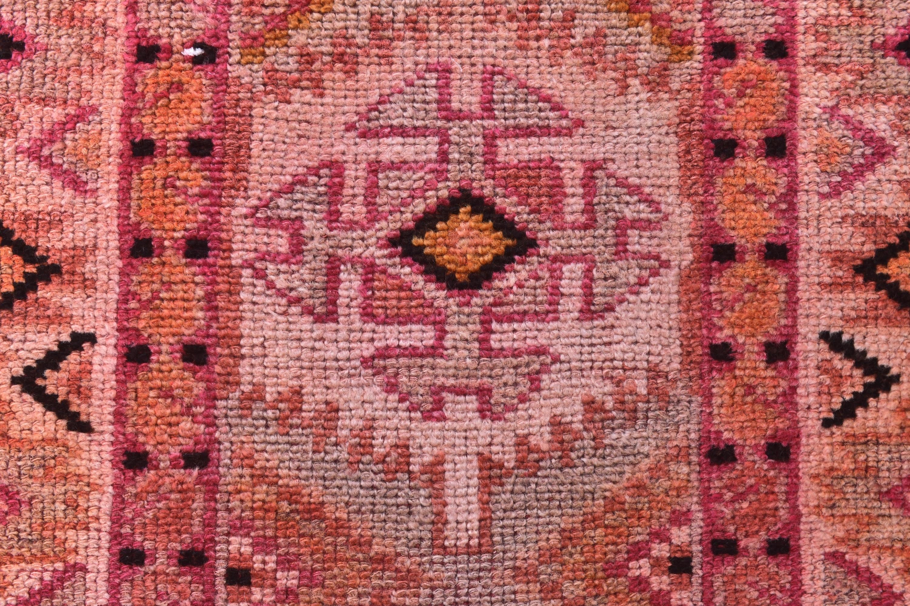 📜📌 Vintage Turkish runner rug in pink, coral, and orange hues featuring distressed geometric diamond medallions and tribal patterns. The hand-knotted textile displays a faded, weathered aesthetic with a central field of repeating motifs bordered by traditional Anatolian designs in warm peachy tones with black accents.