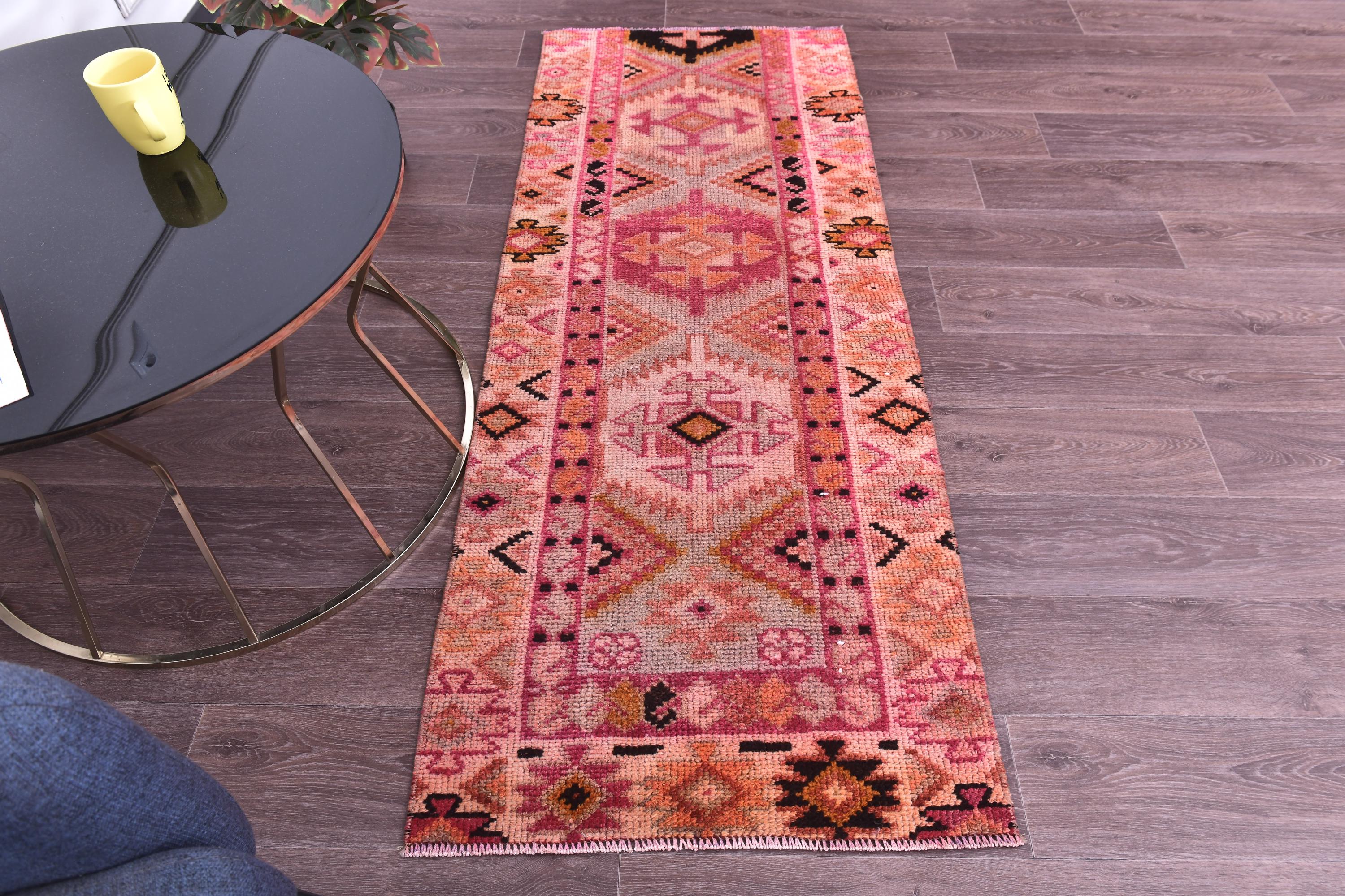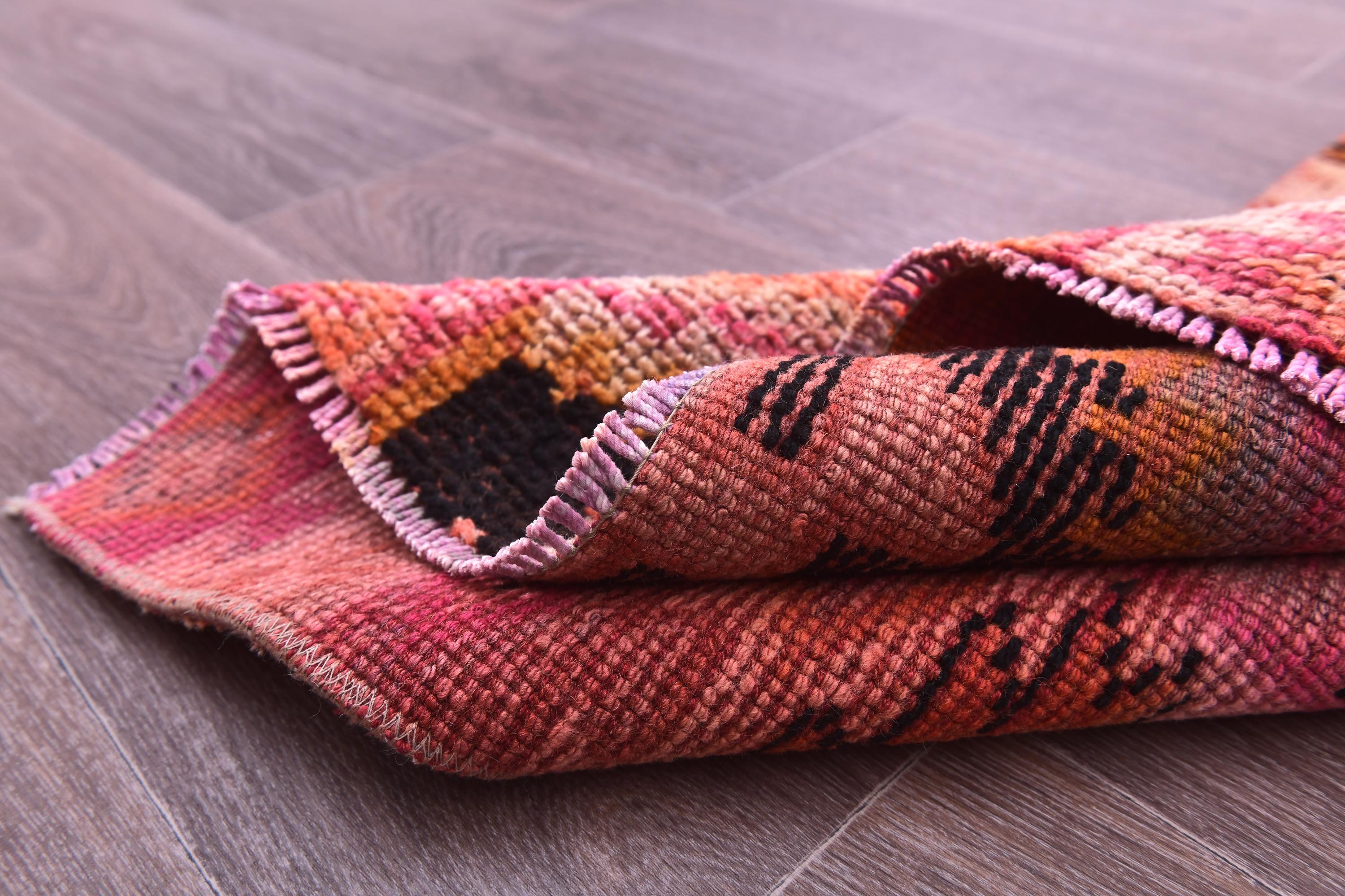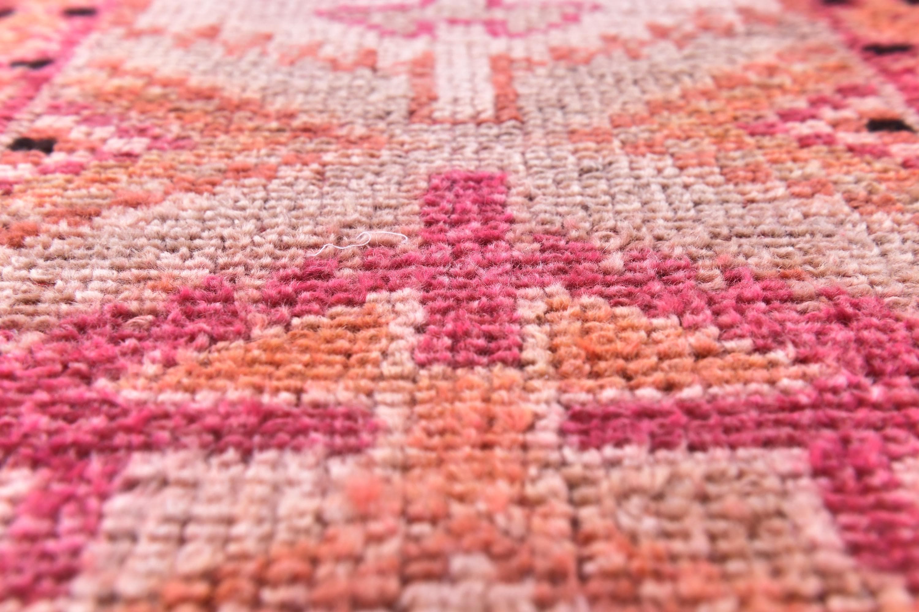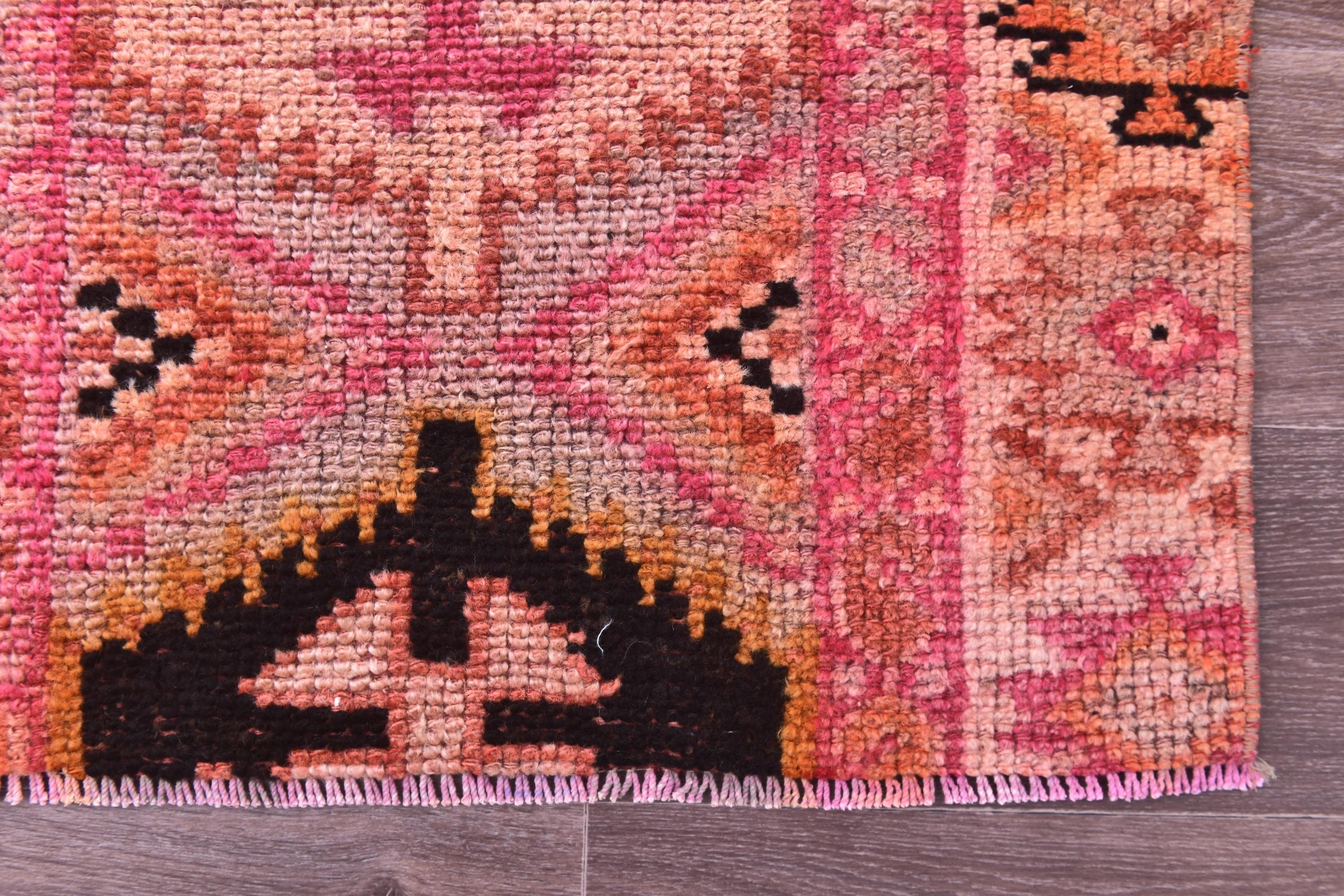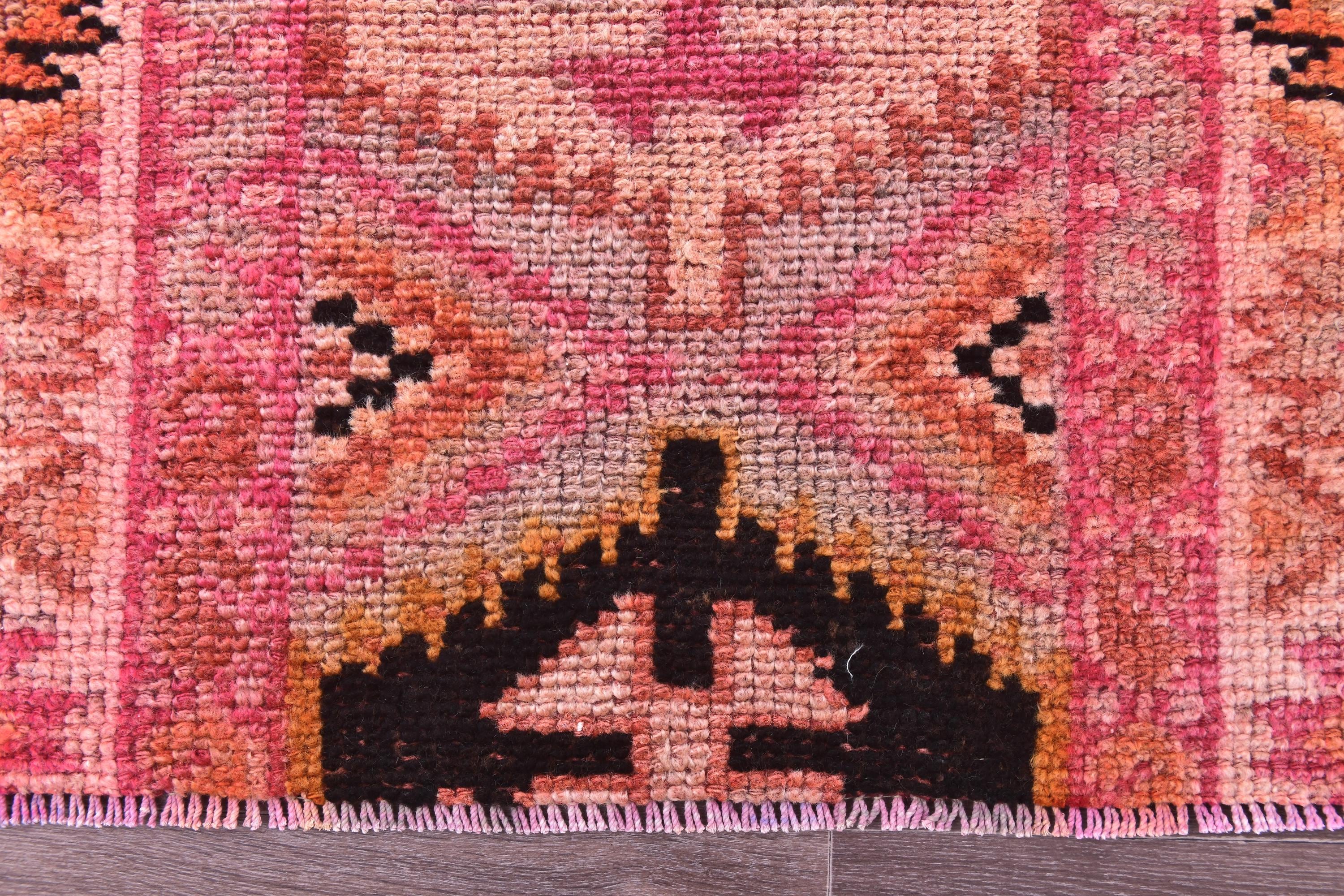 📜📌 Vintage Turkish runner rug in pink, coral, and orange hues featuring distressed geometric diamond medallions and tribal patterns. The hand-knotted textile displays a faded, weathered aesthetic with a central field of repeating motifs bordered by traditional Anatolian designs in warm peachy tones with black accents.