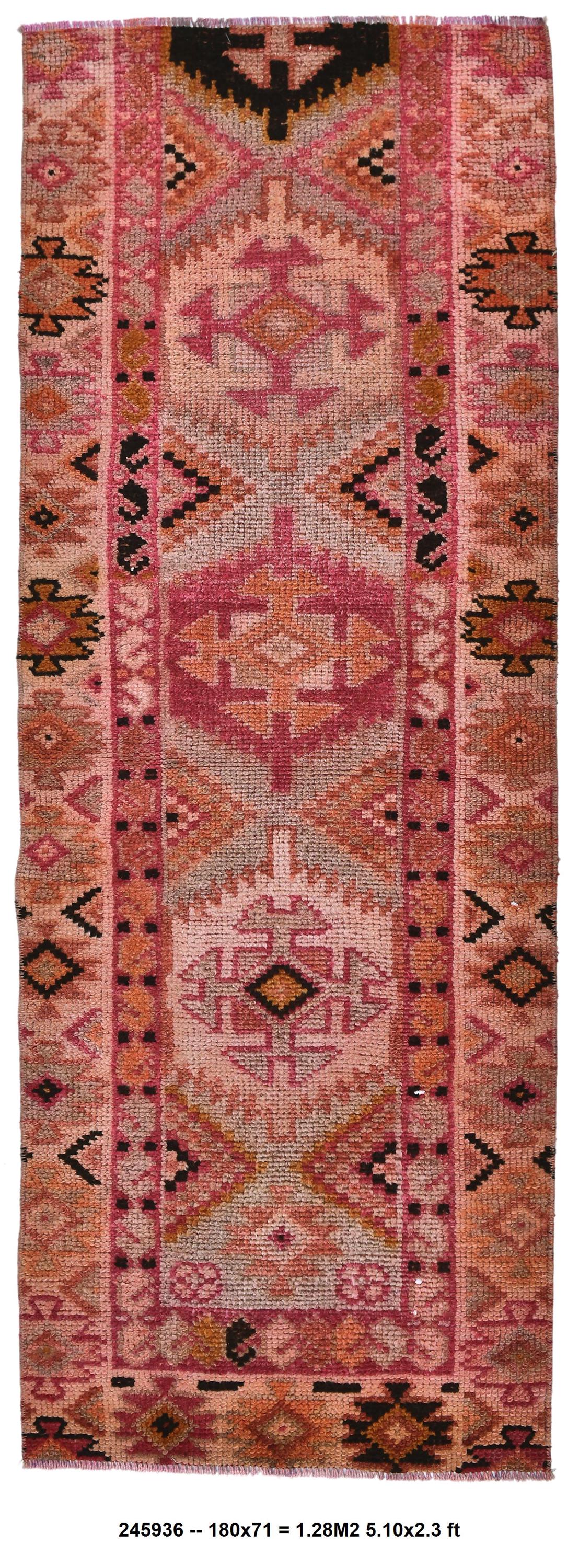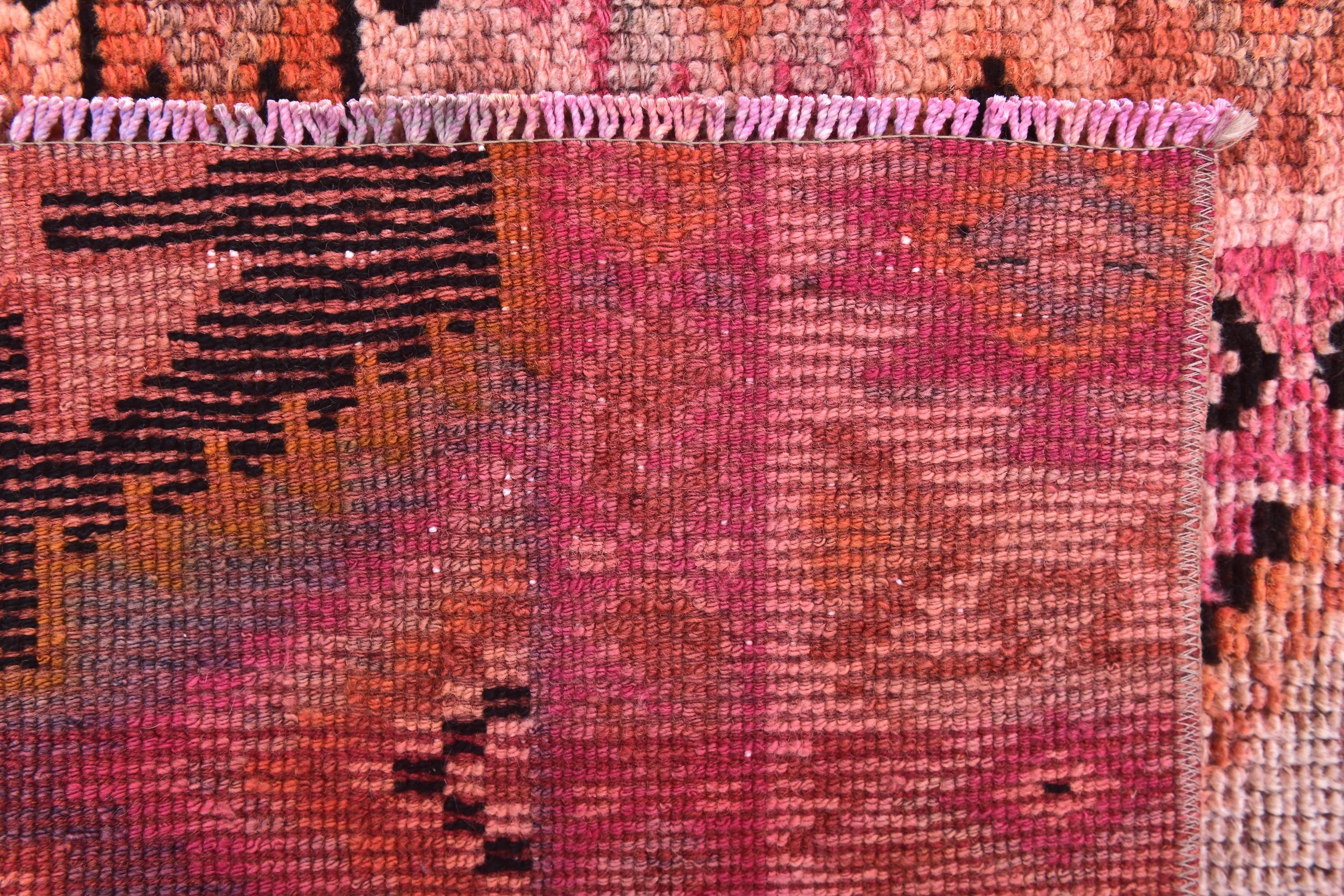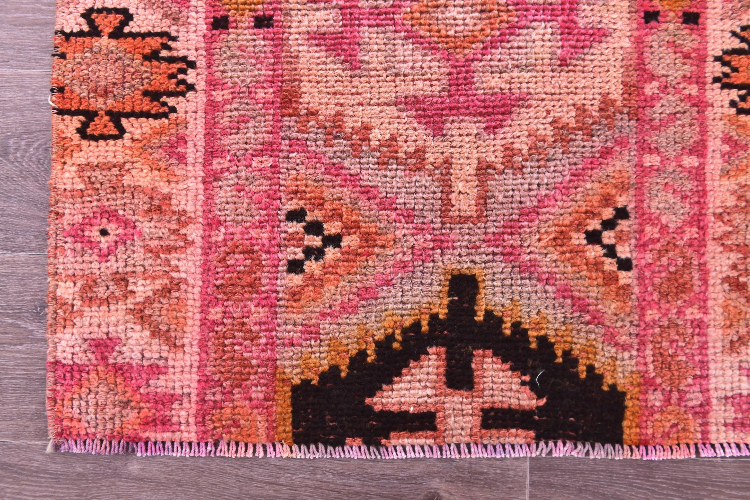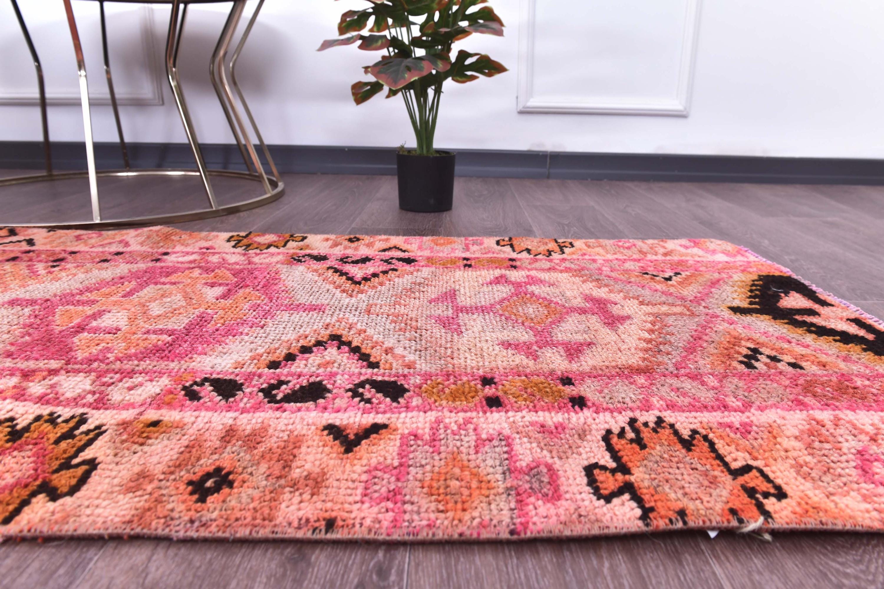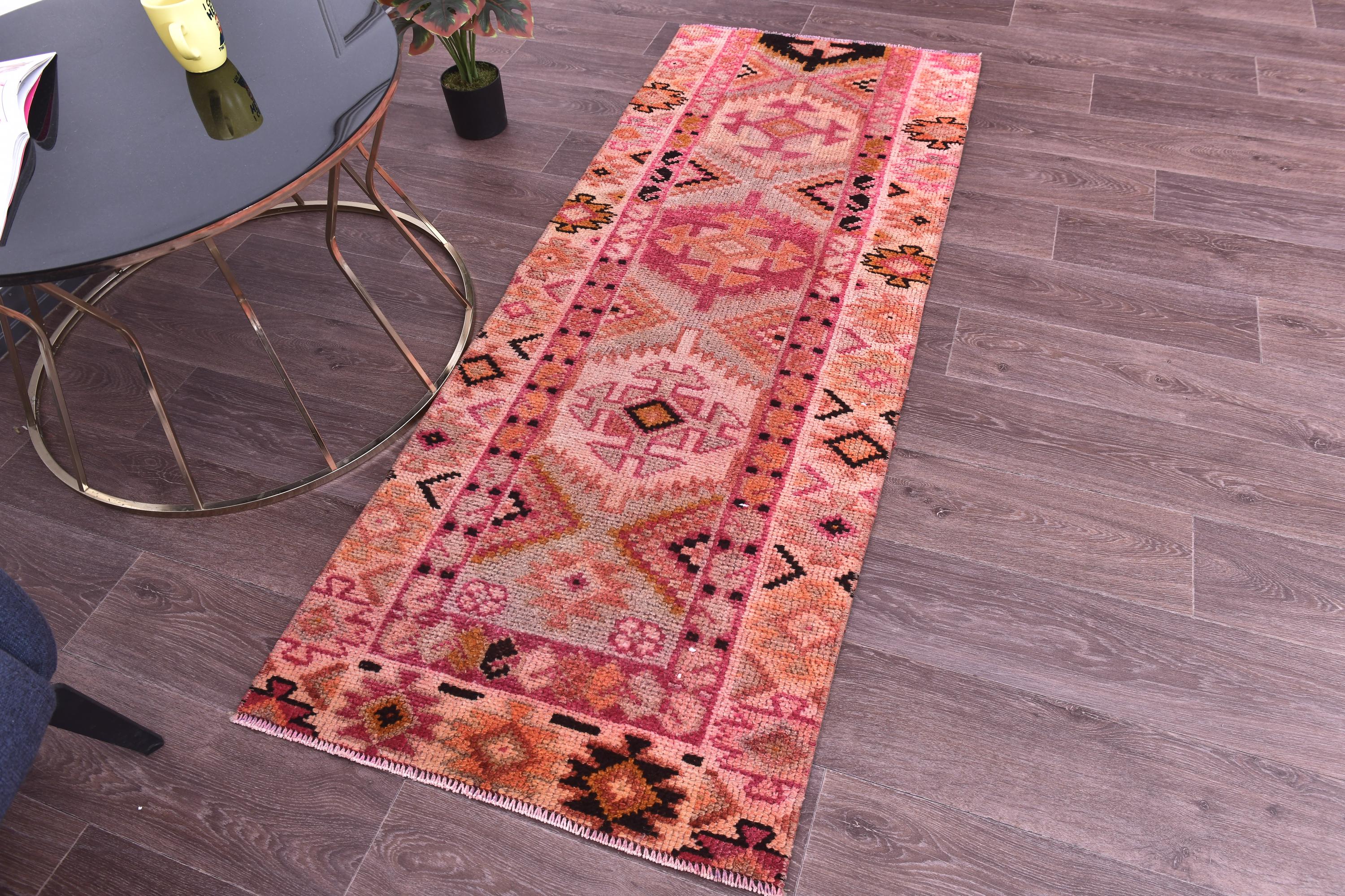 📜📌 Vintage Turkish runner rug in pink, coral, and orange hues featuring distressed geometric diamond medallions and tribal patterns. The hand-knotted textile displays a faded, weathered aesthetic with a central field of repeating motifs bordered by traditional Anatolian designs in warm peachy tones with black accents.