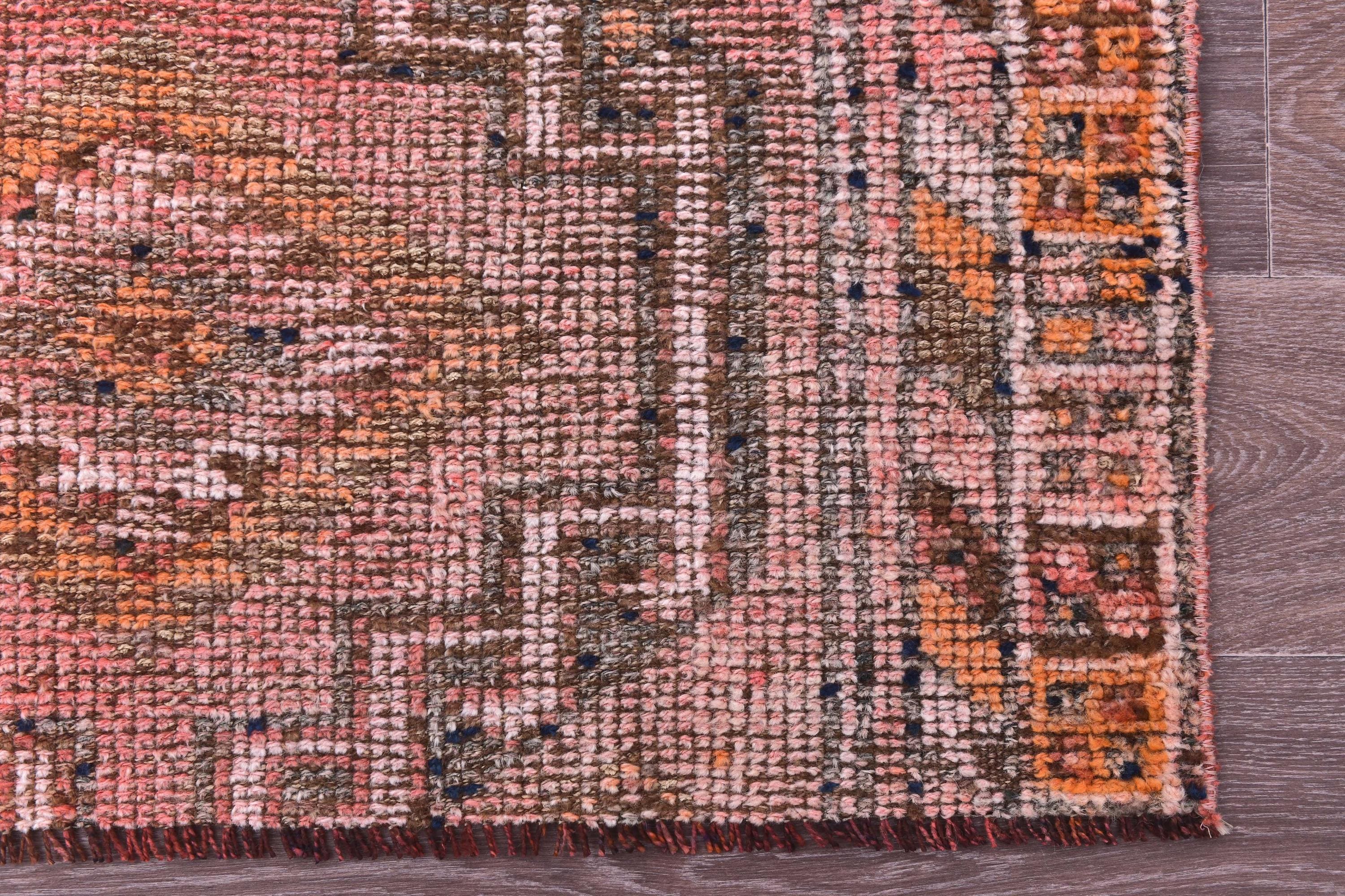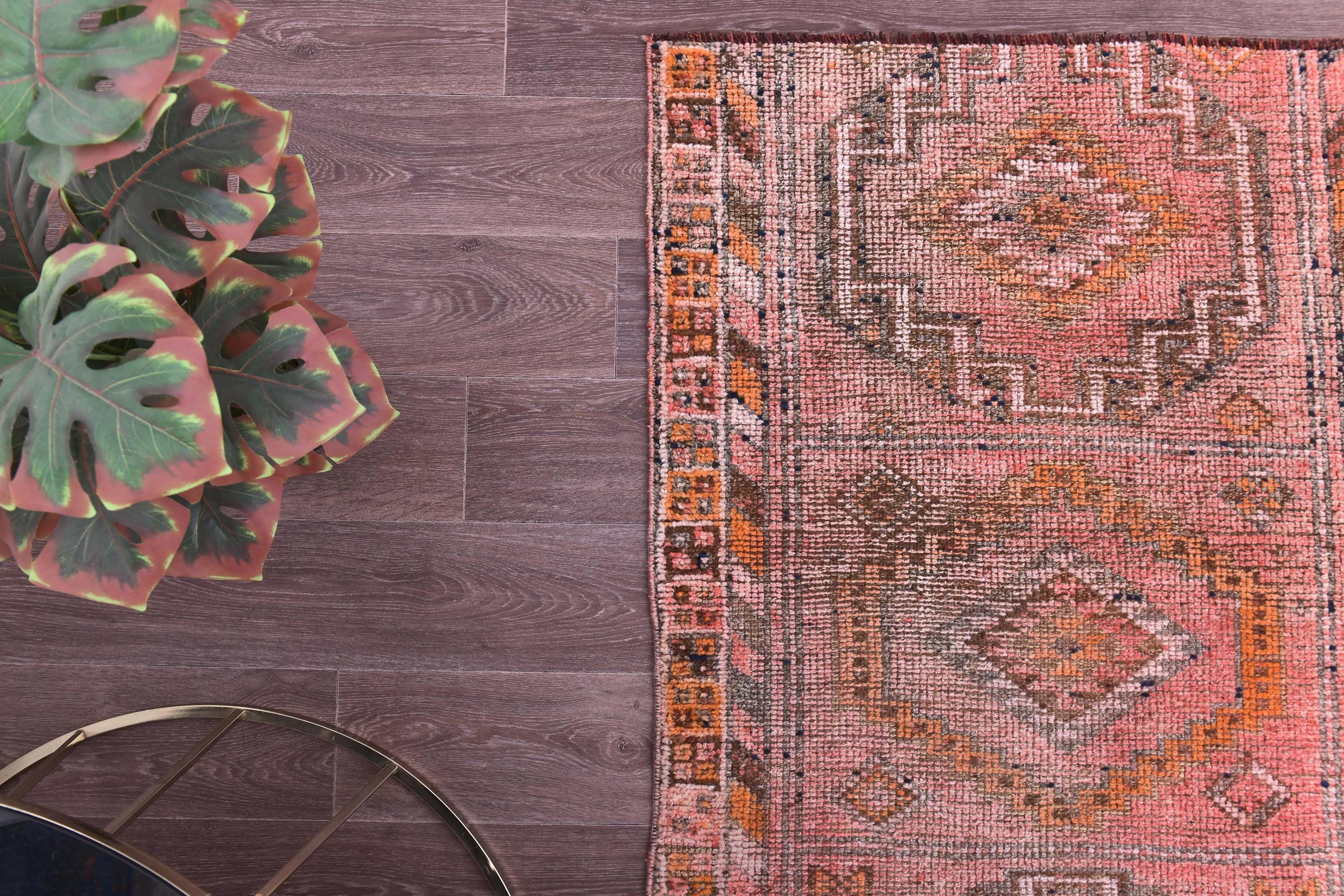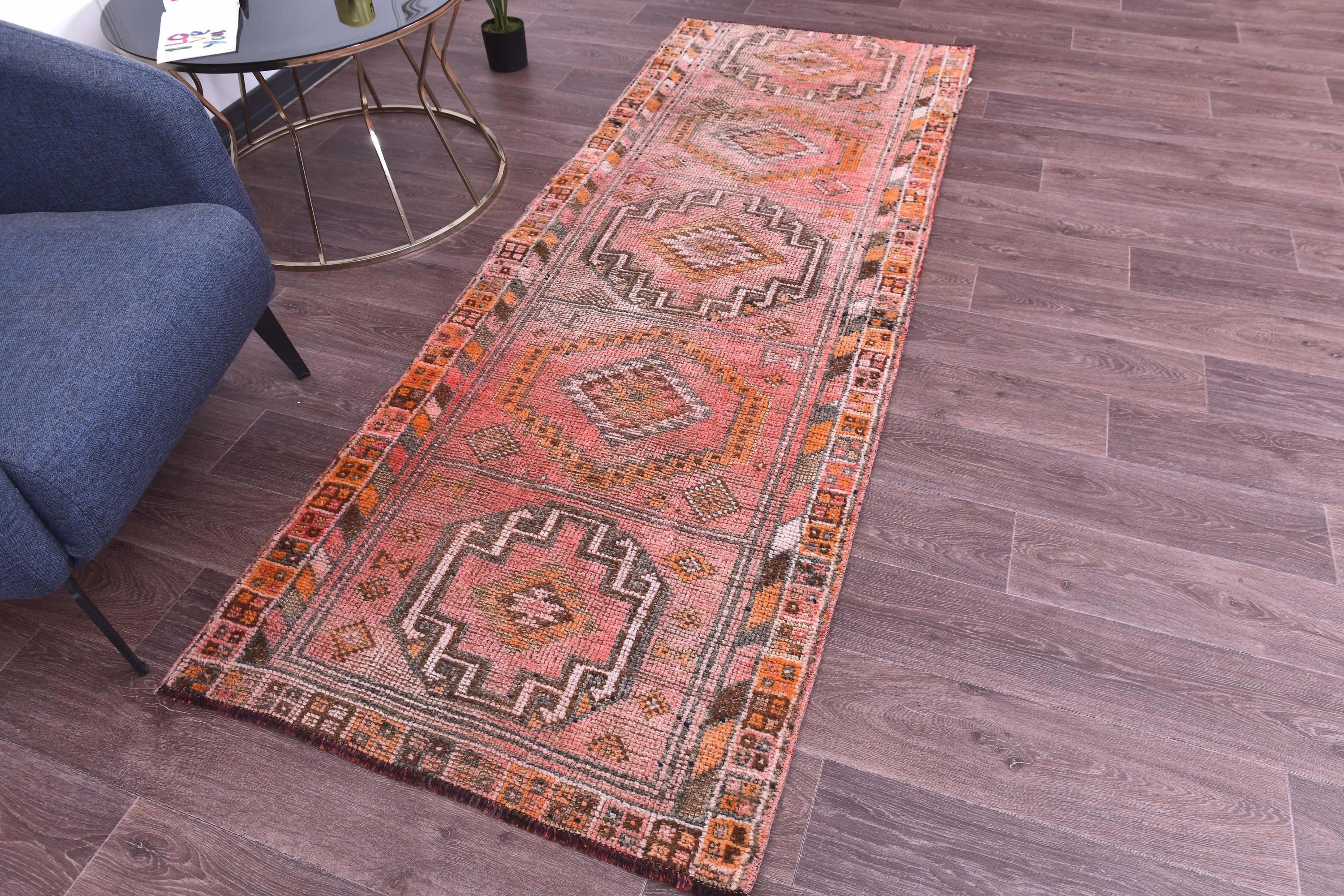 📜📌 Vintage Turkish Oushak runner rug featuring faded pink, beige, yellow and grey geometric medallion pattern with traditional star motifs and zigzag borders, handwoven wool with distressed patina, displayed on wood floor next to blue armchair