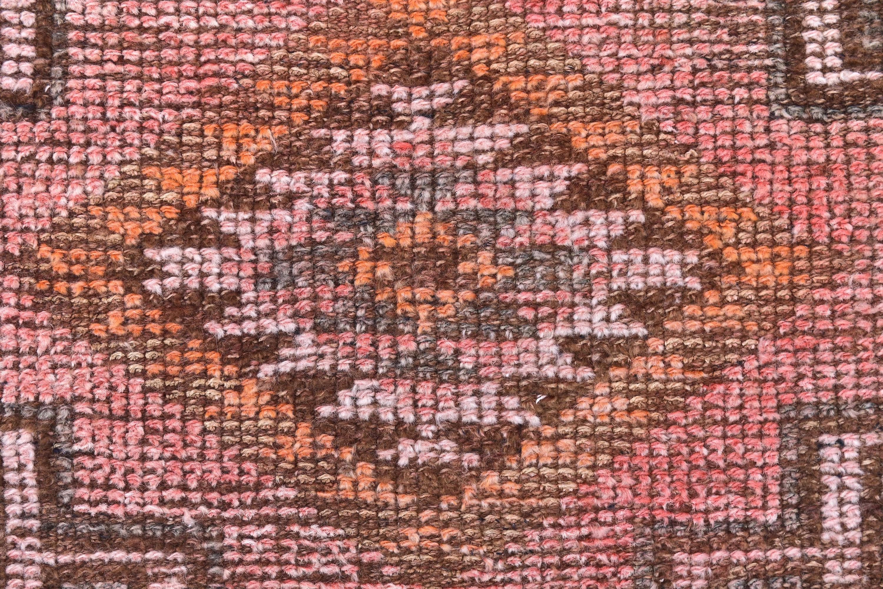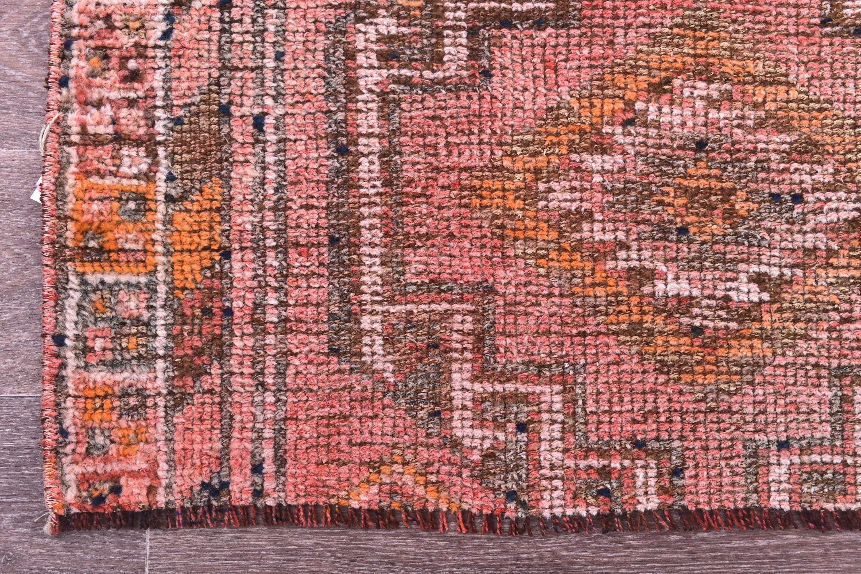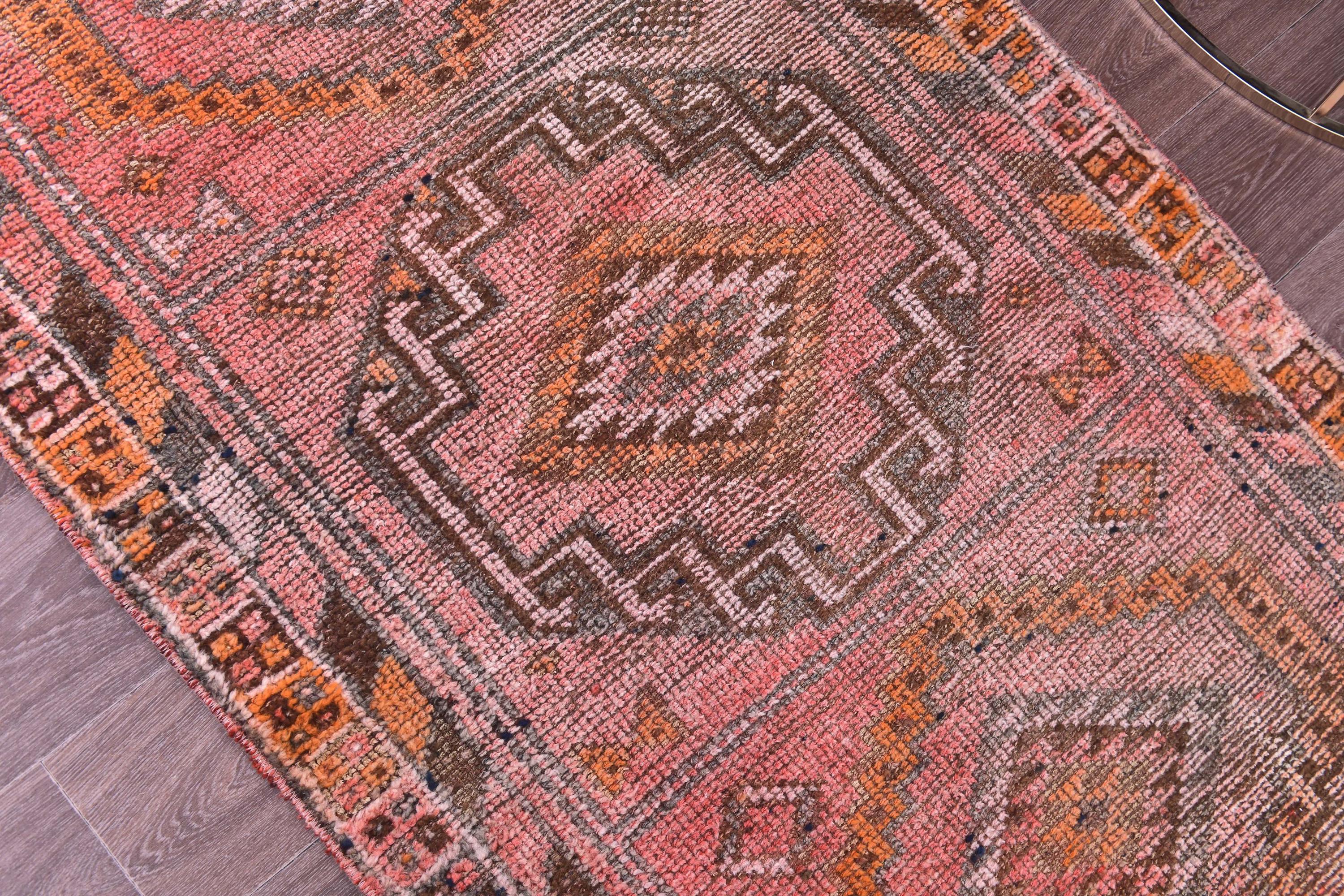 📜📌 Vintage Turkish Oushak runner rug featuring faded pink, beige, yellow and grey geometric medallion pattern with traditional star motifs and zigzag borders, handwoven wool with distressed patina, displayed on wood floor next to blue armchair