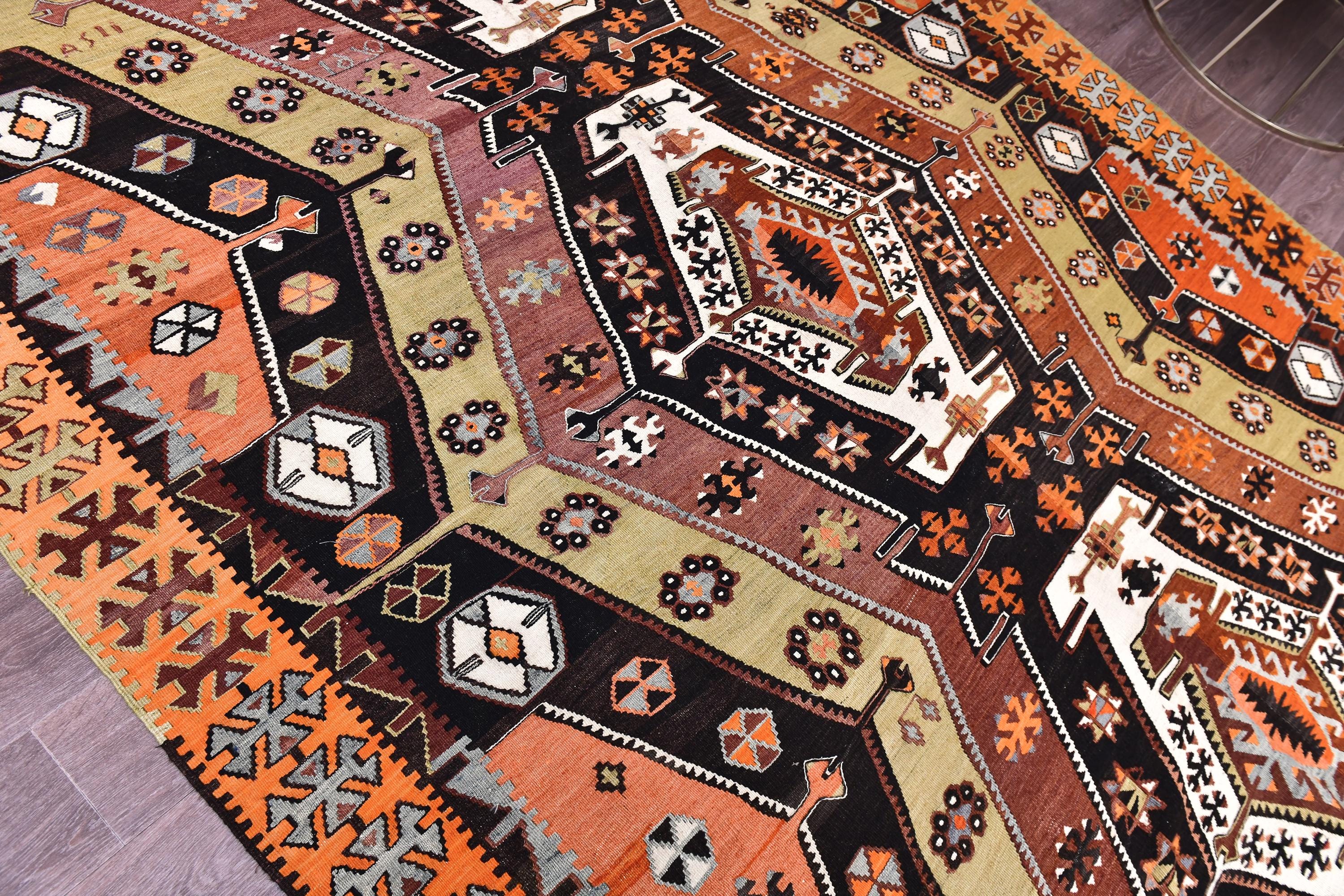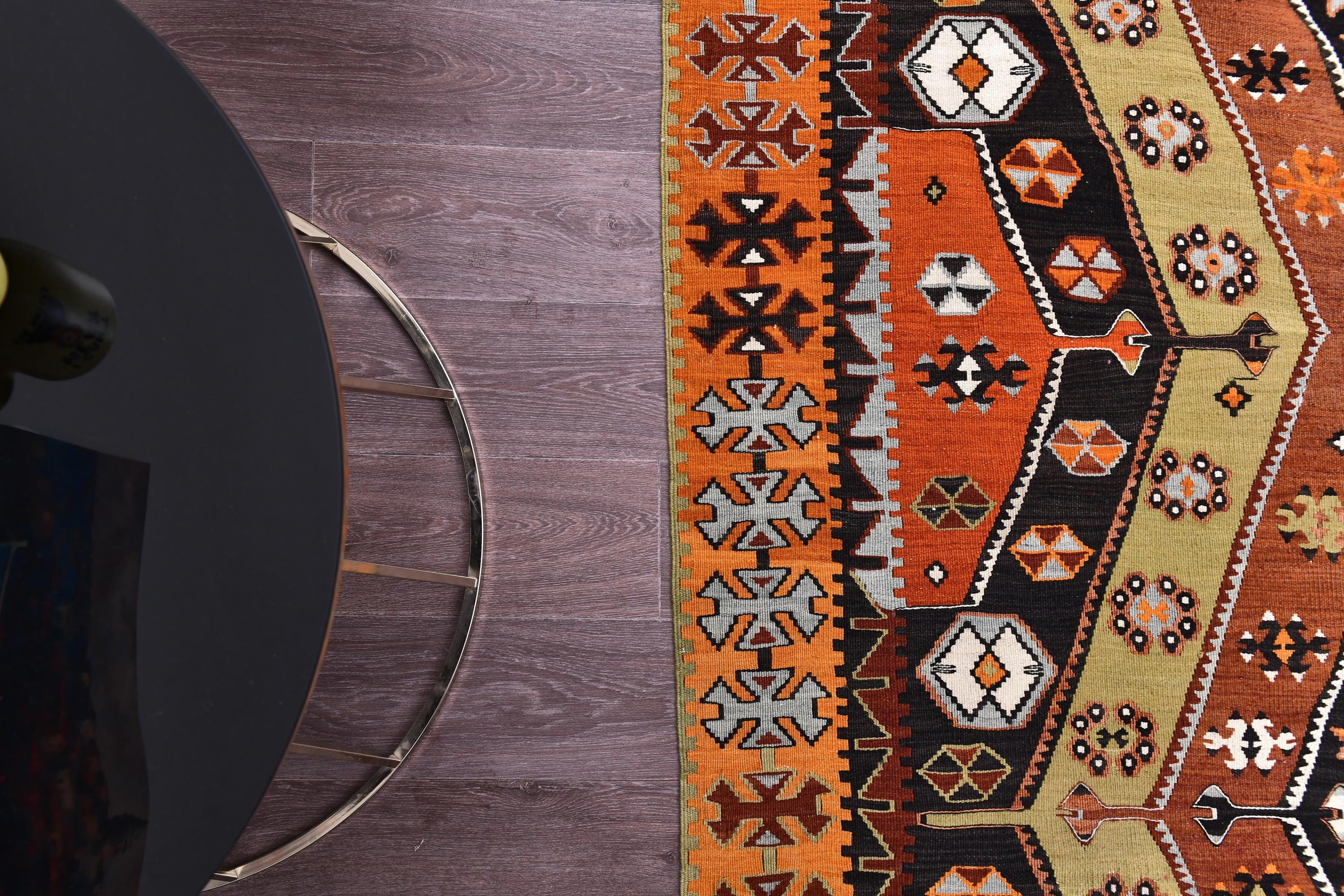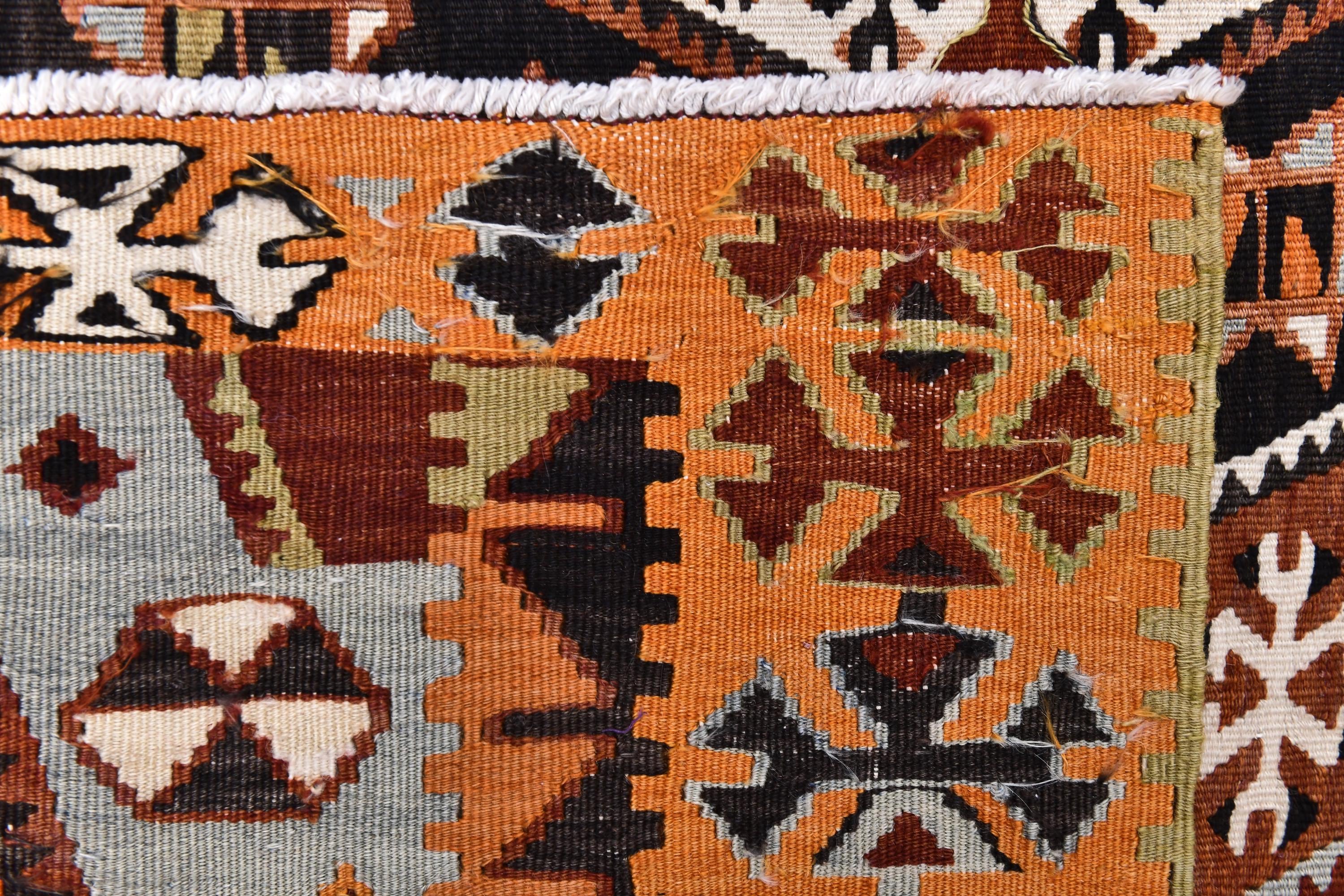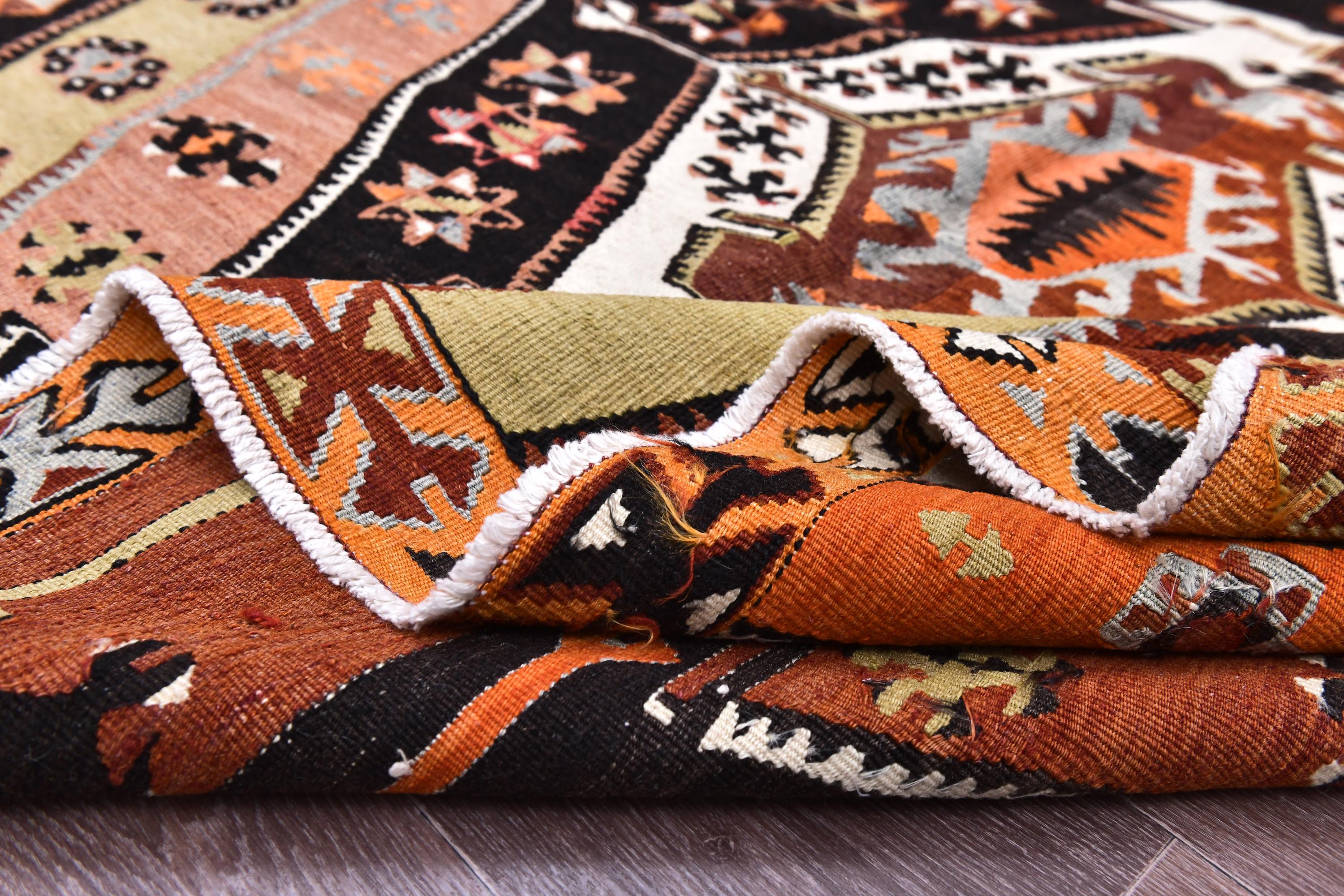 📜📌 Vintage Turkish kilim area rug featuring vibrant orange, rust, black, and cream geometric patterns with three large hexagonal medallions running down the center. The hand-woven wool textile displays traditional Anatolian tribal motifs including star bursts, hexagons, and stepped designs with an ornate border in shades of tangerine, terracotta, sage green, and charcoal.