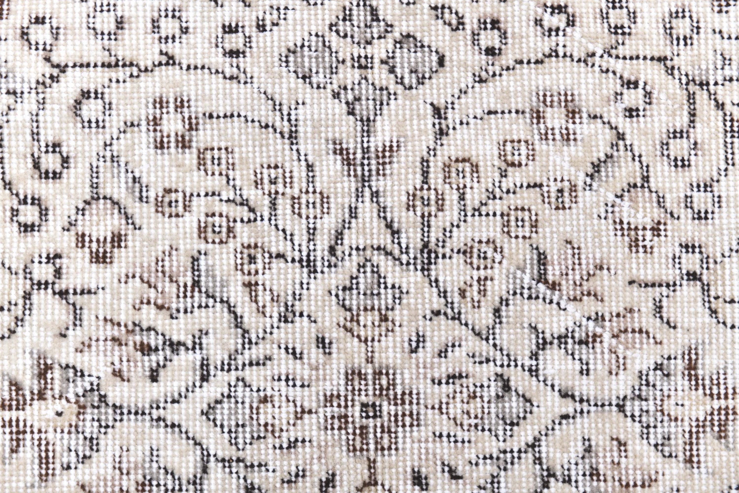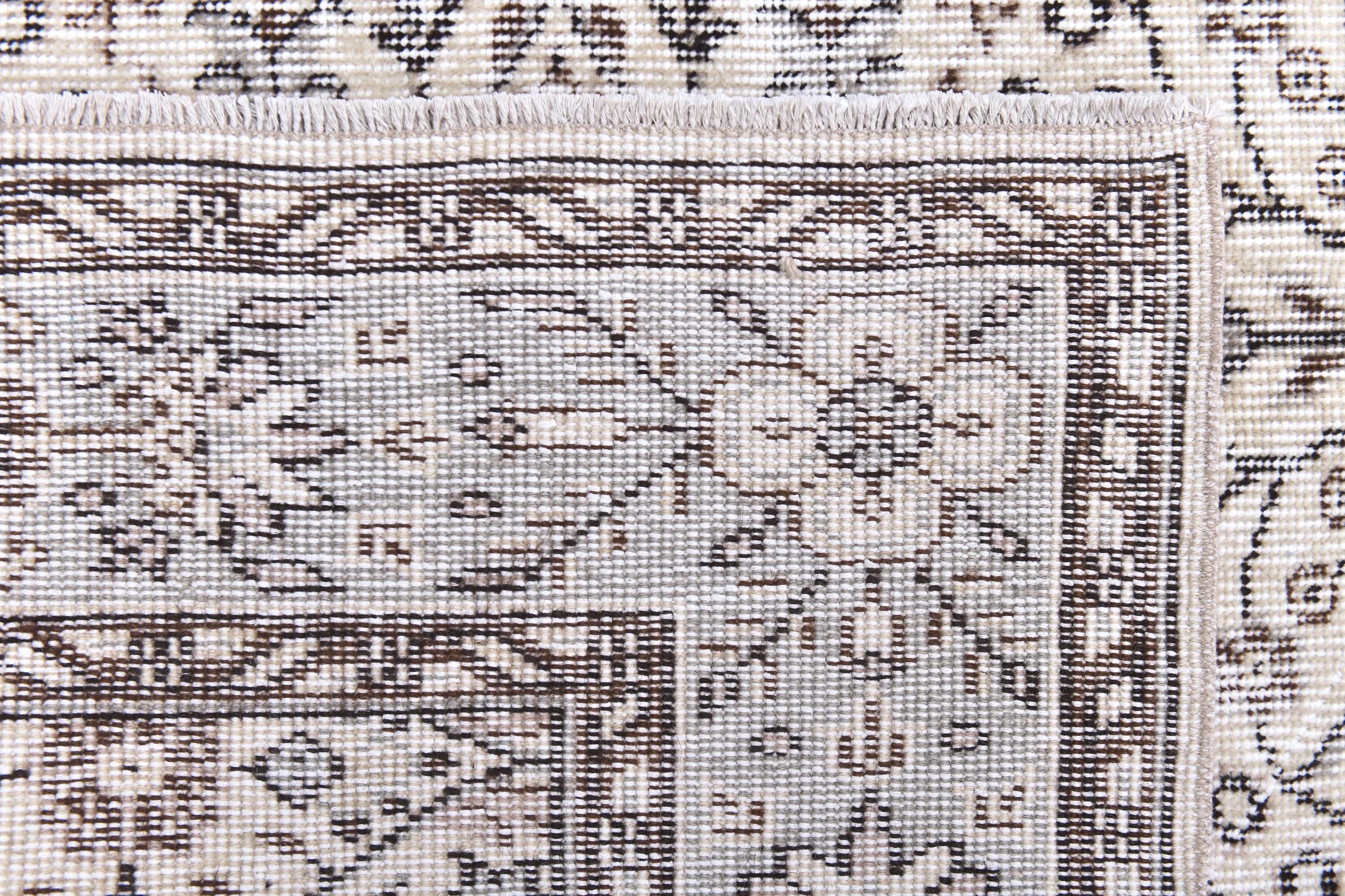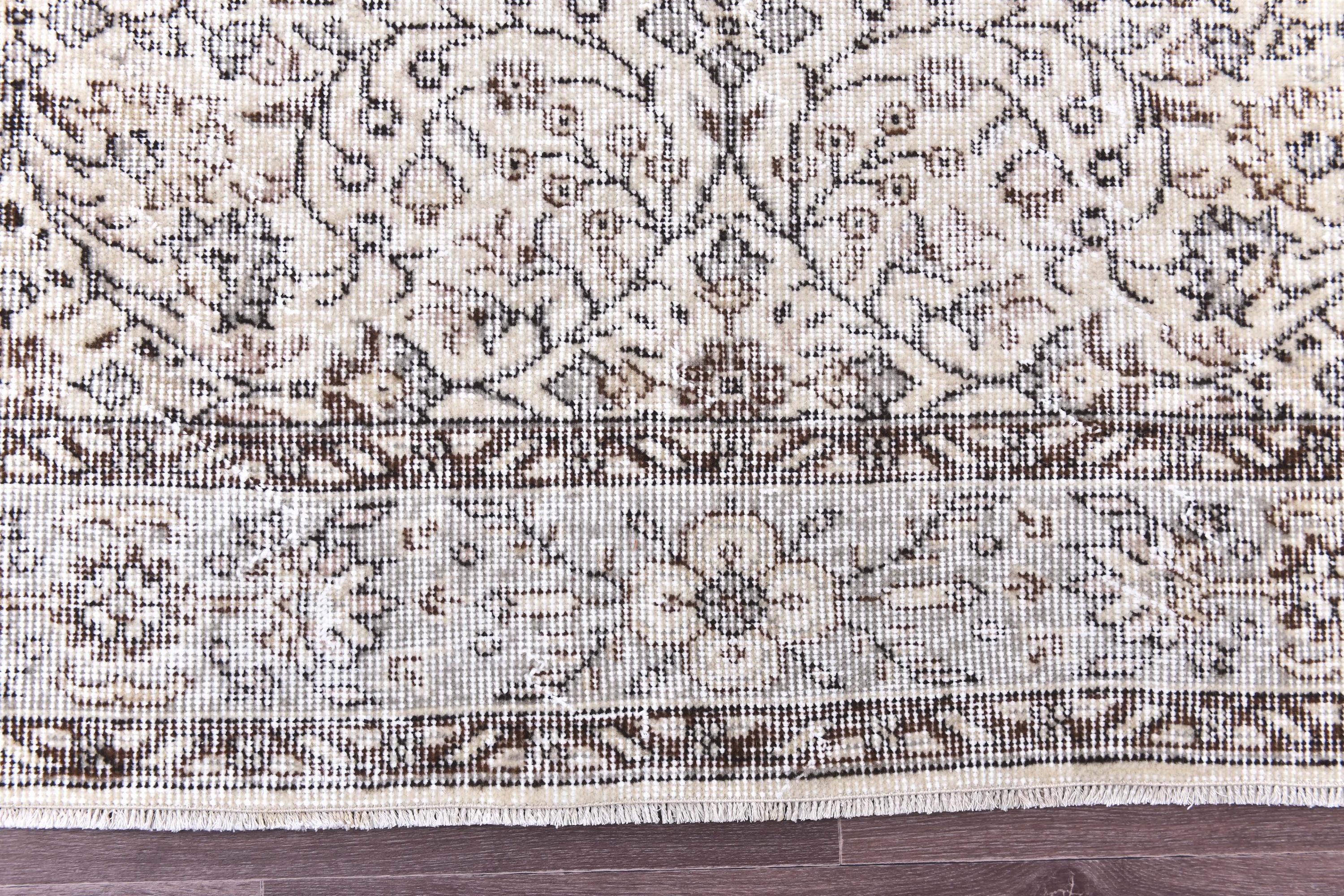 📜📌 Faded antique-style Turkish runner rug with beige ivory background, brown distressed detailing, intricate Persian-inspired botanical motifs, and decorative fringe edges on dark wood flooring