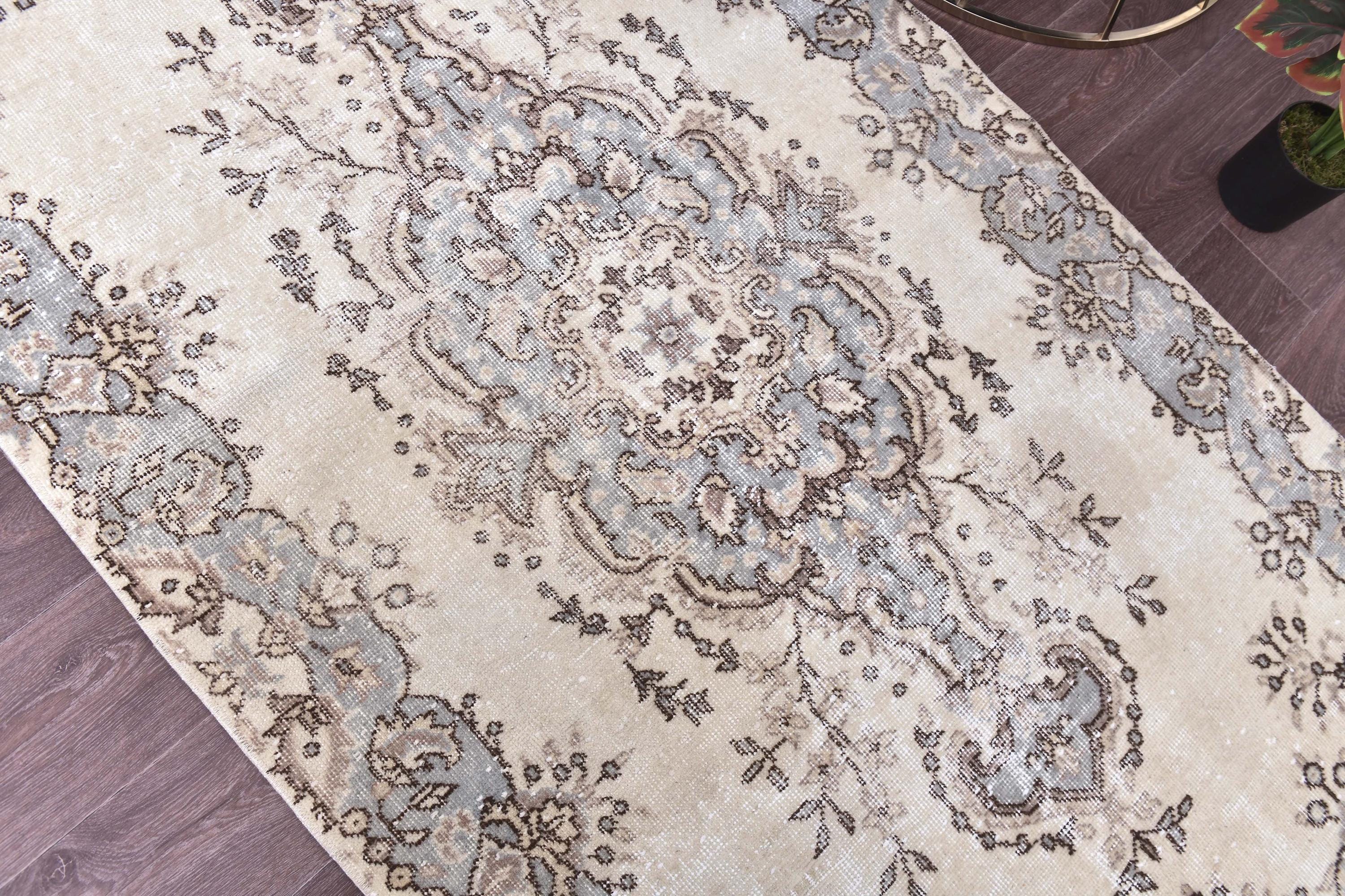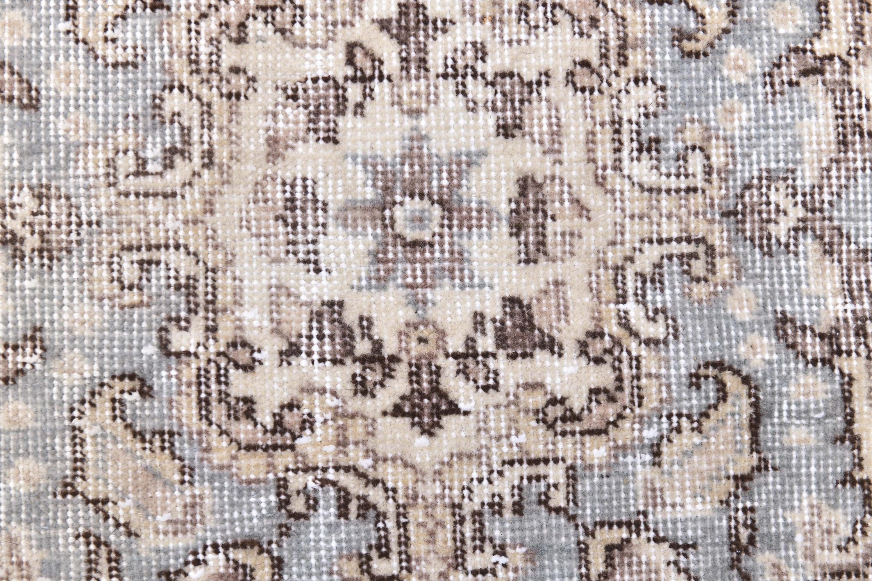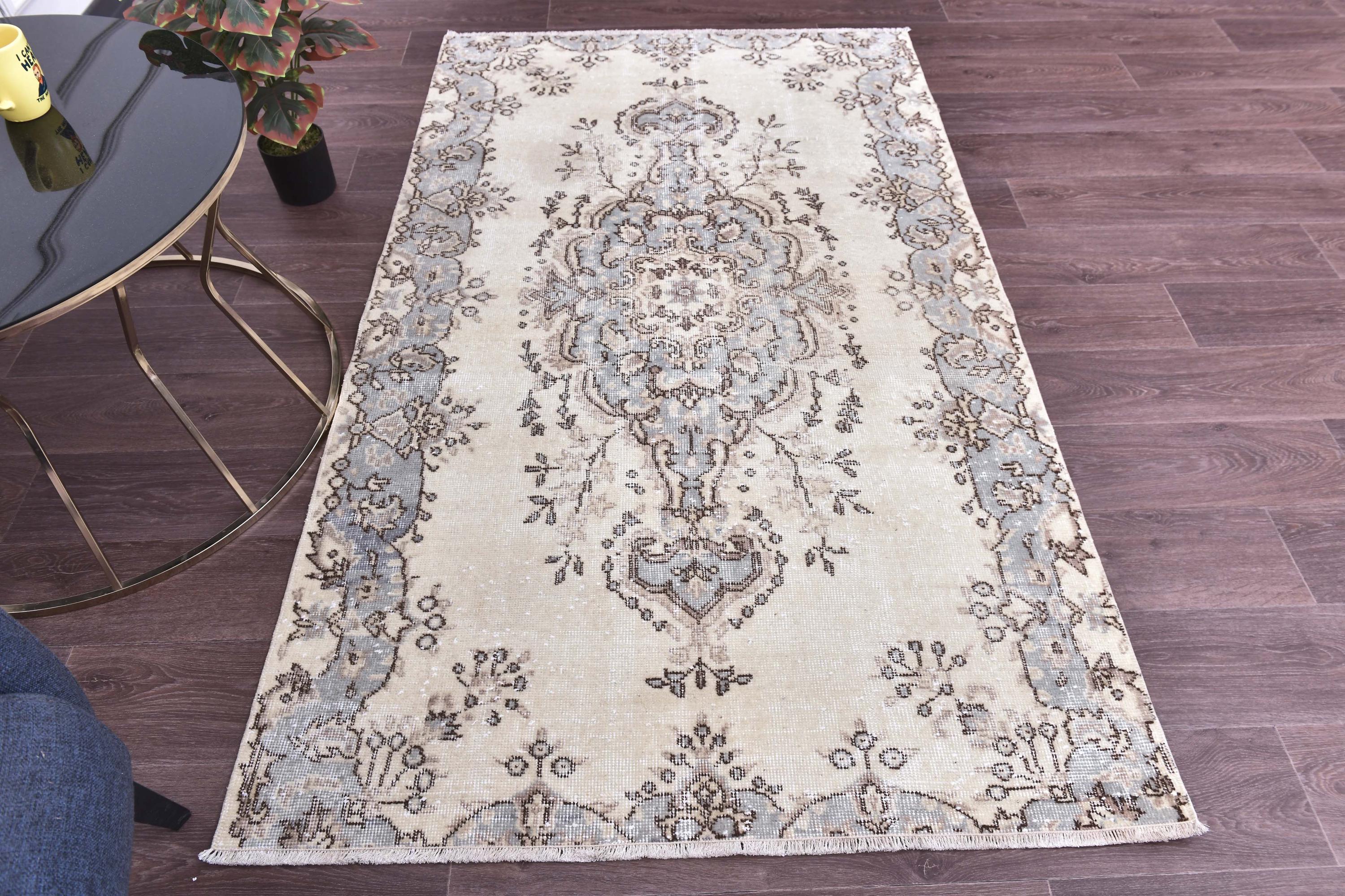📜📌 Vintage hand-knotted Turkish area rug featuring elegant central medallion design in hunter blue and brown on cream ivory field with ornate floral border scrollwork and traditional fringed edges