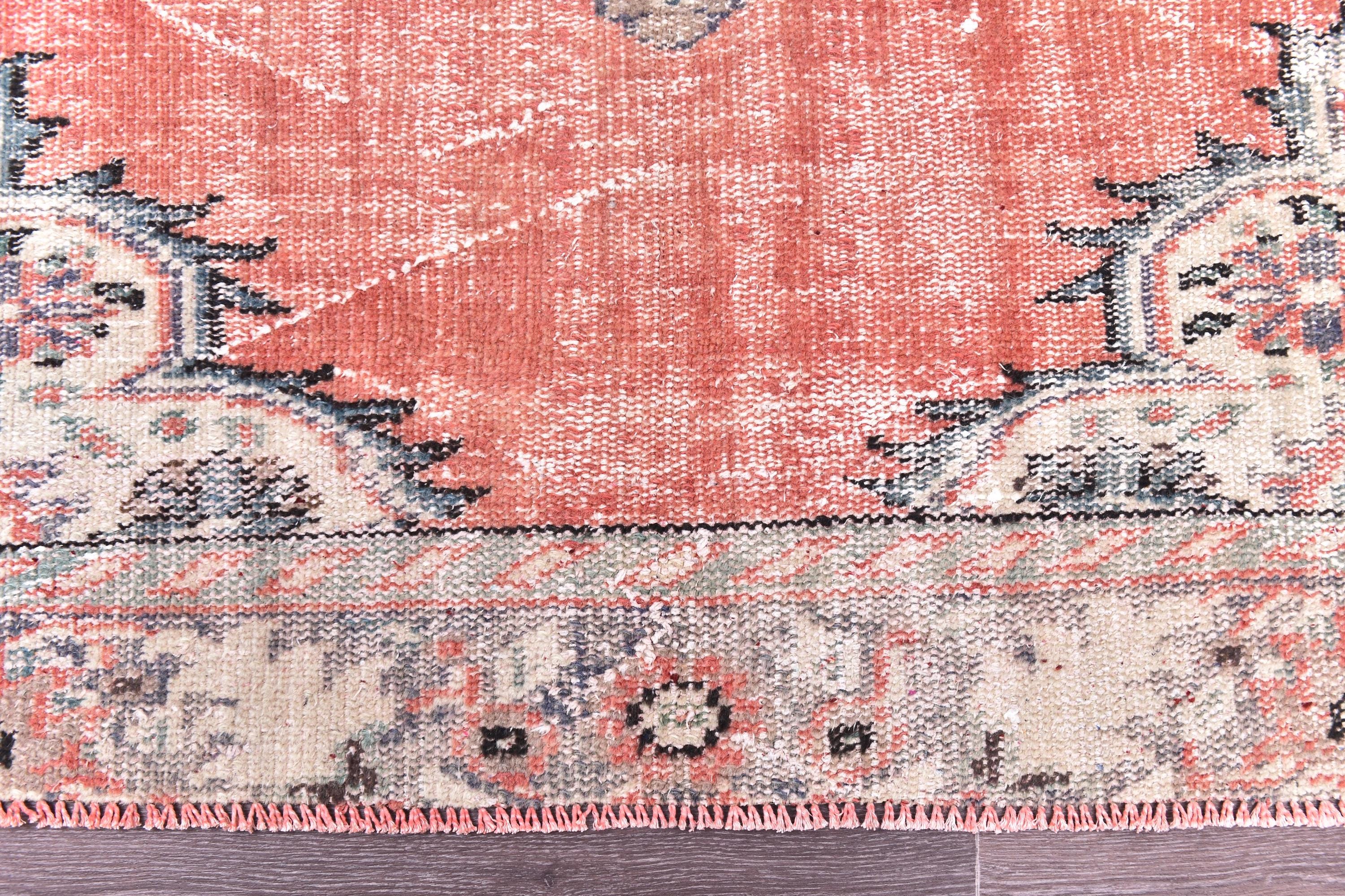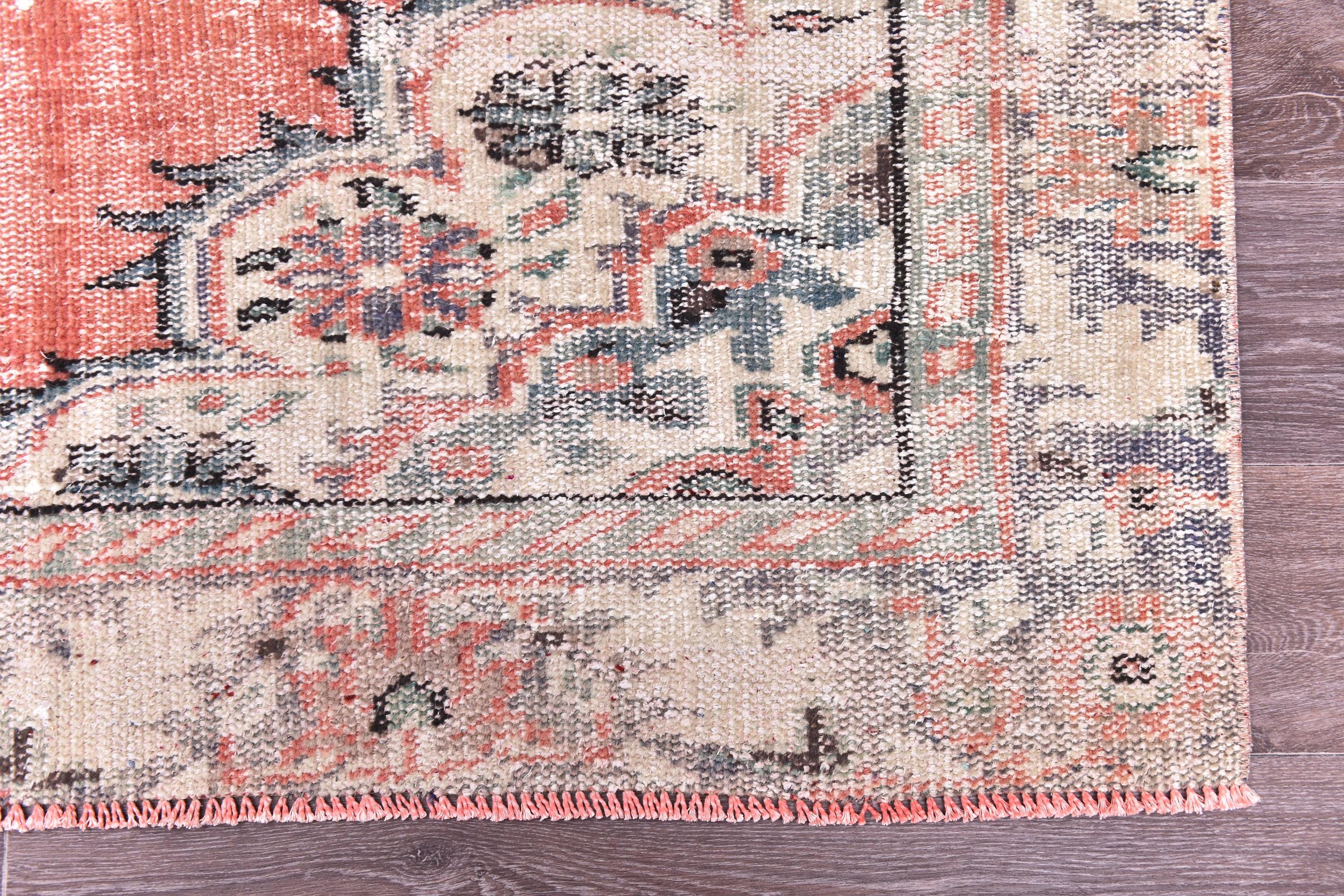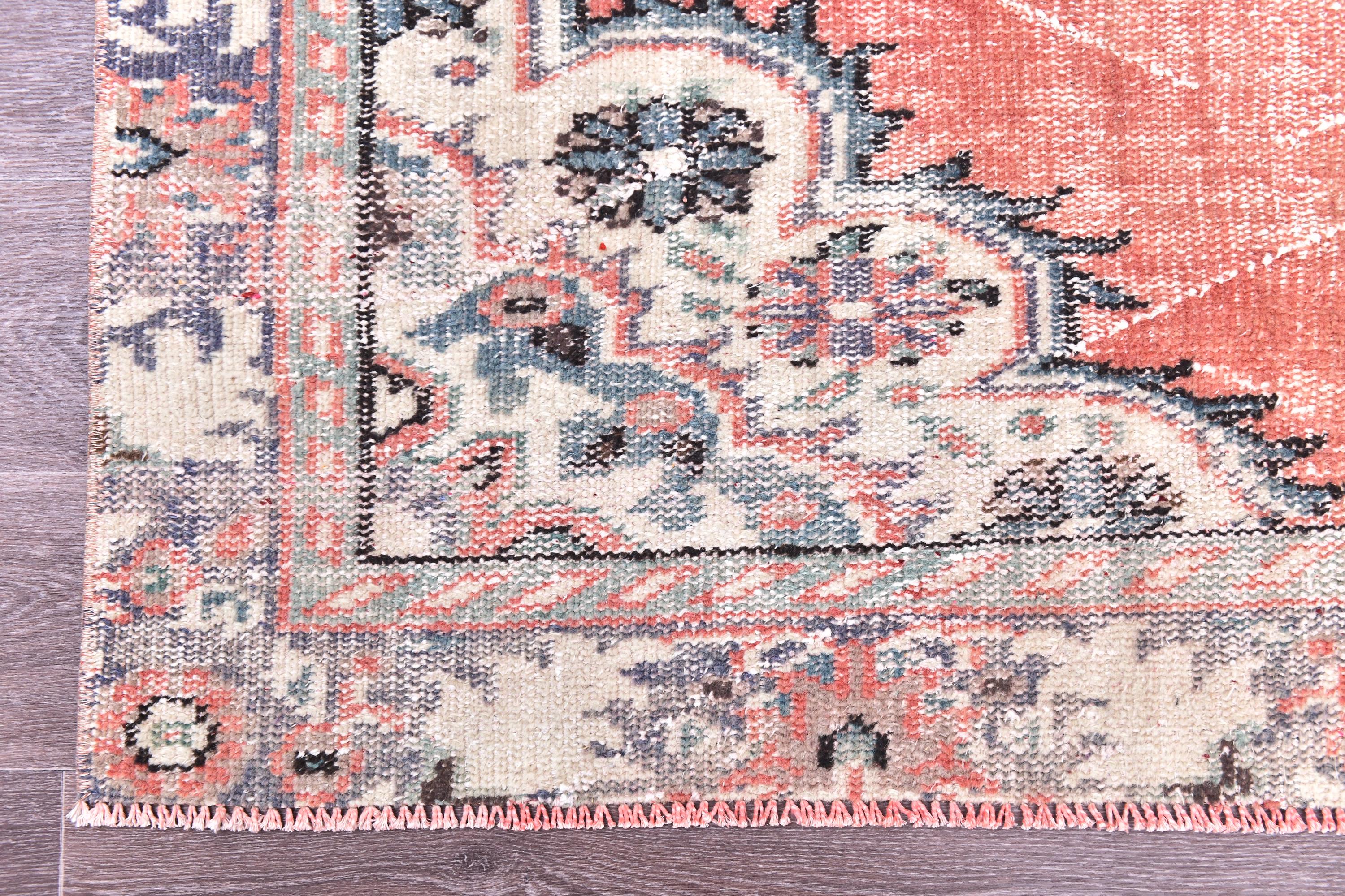 📜📌 Vintage distressed Turkish area rug featuring a faded terracotta field with beige decorative borders. This antique-style runner showcases traditional geometric medallion patterns in the center with ornate floral motifs along the deep blue border, perfect for bohemian and eclectic home decor with its low-pile, worn texture.
