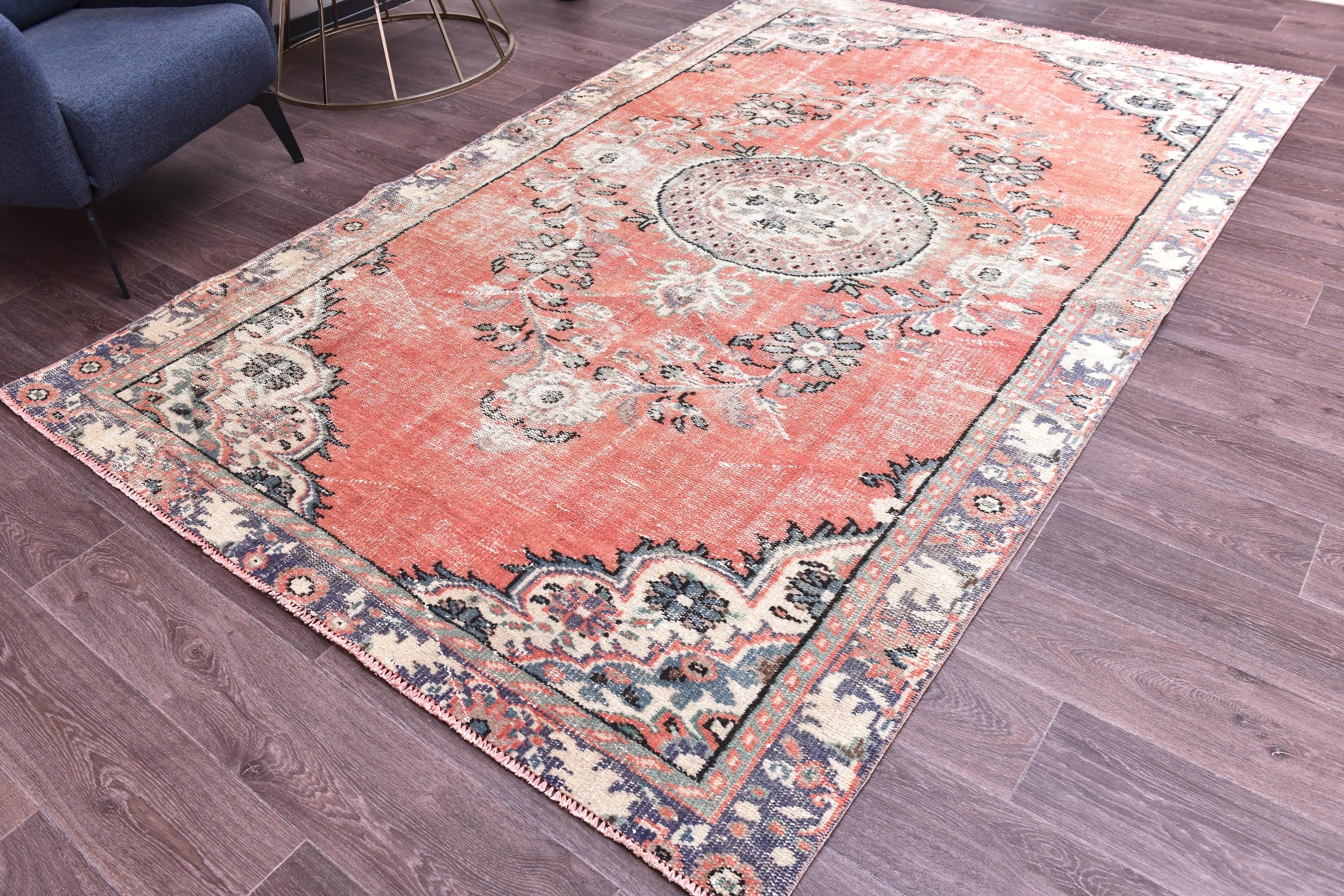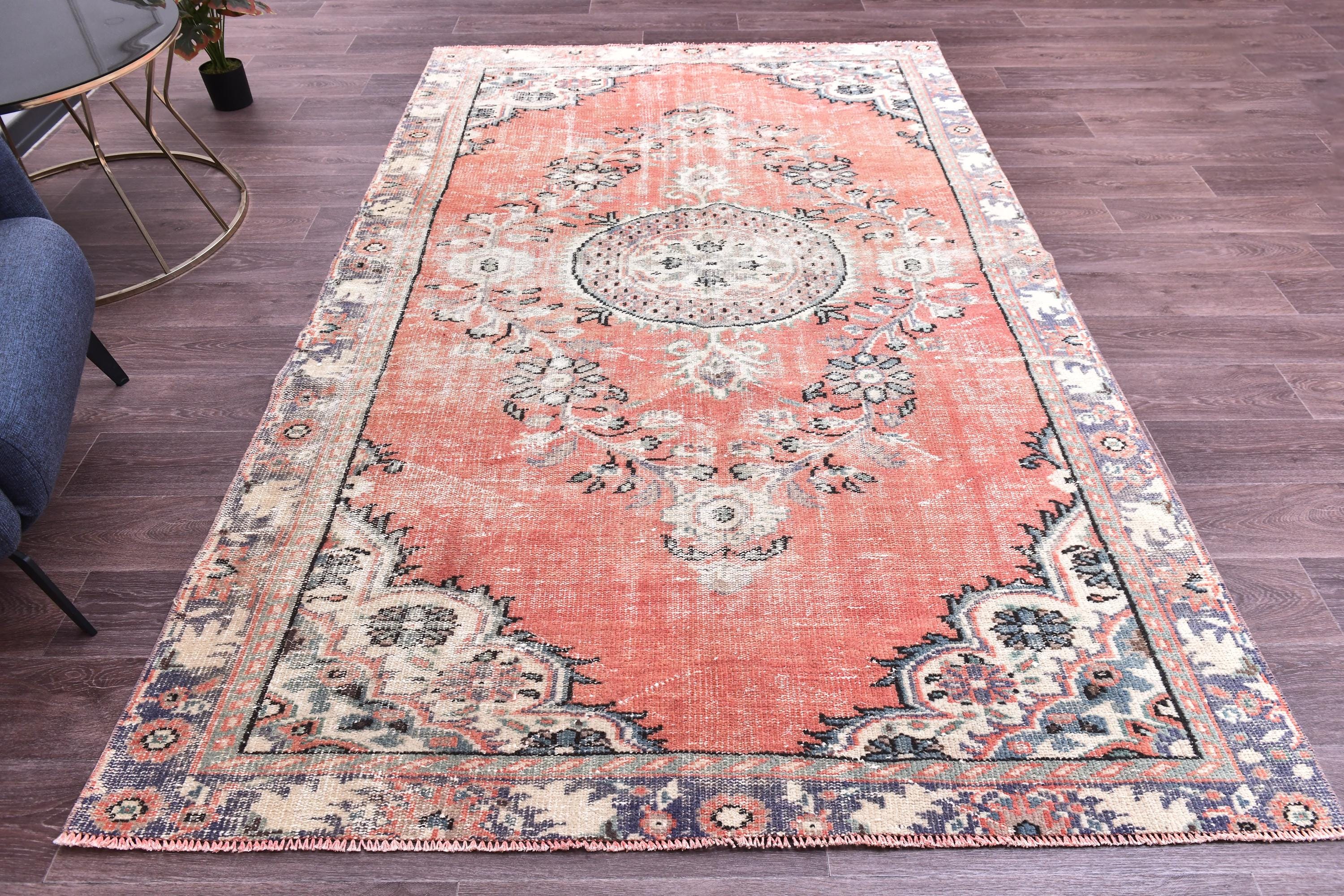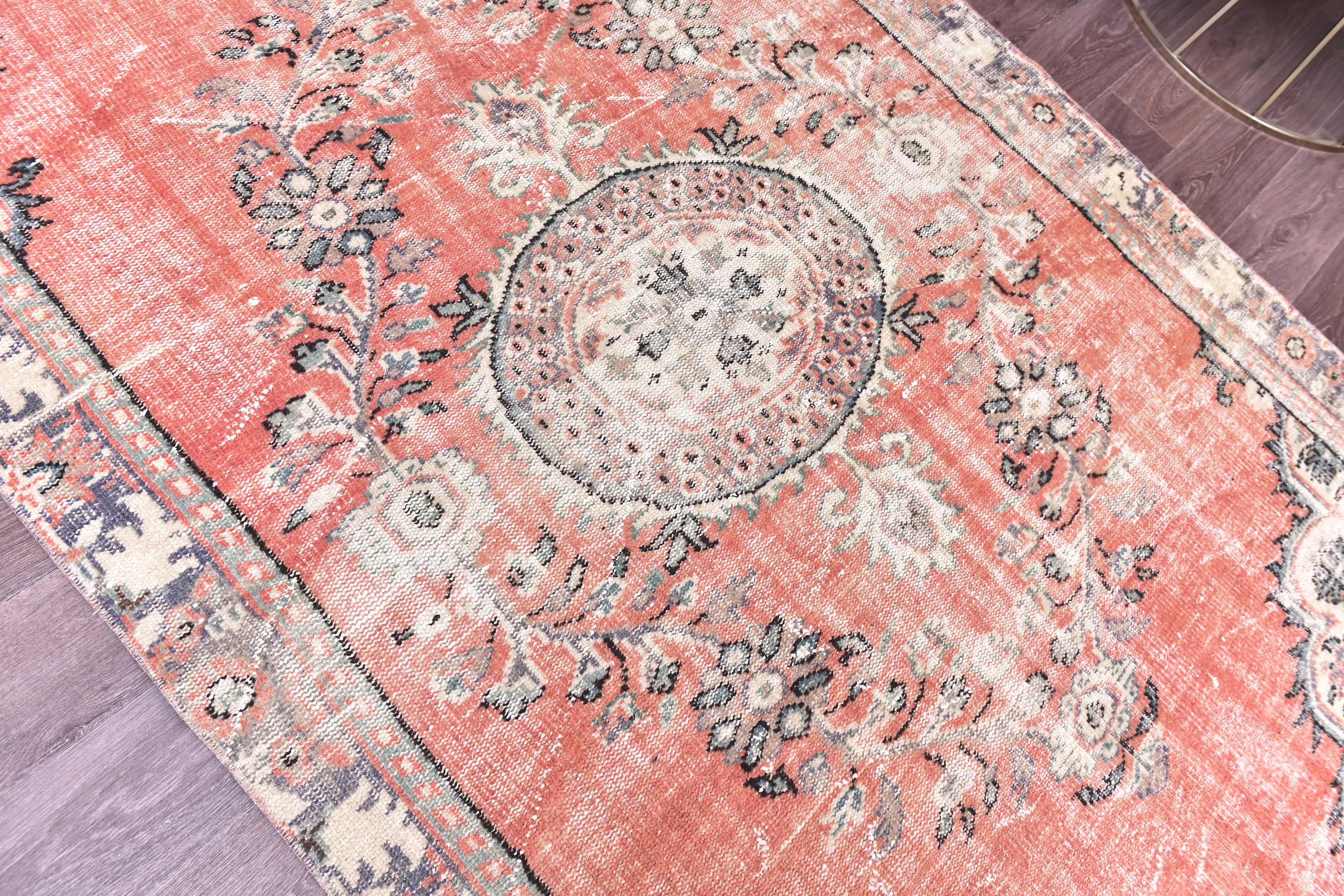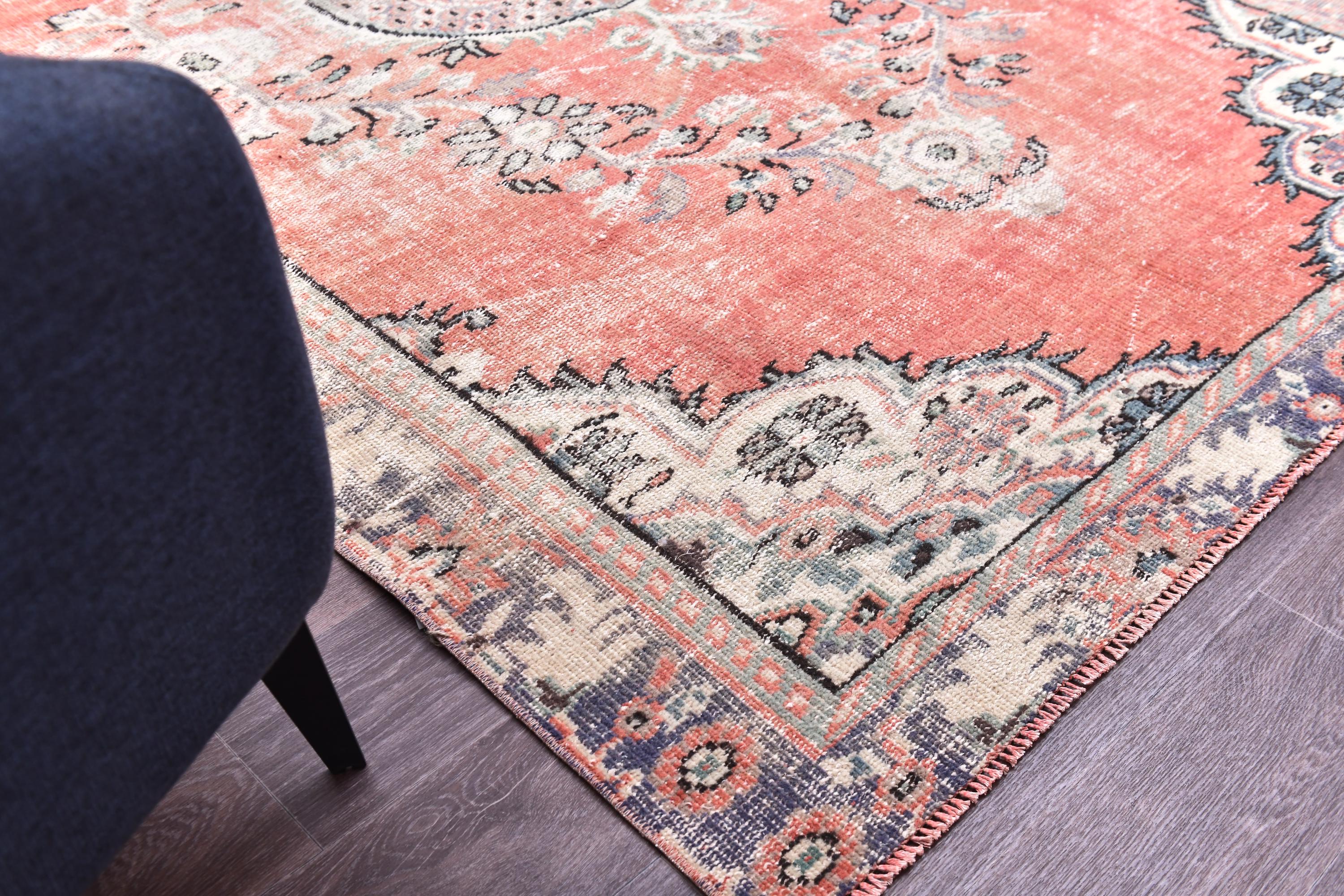 📜📌 Vintage distressed Turkish area rug featuring a faded terracotta field with beige decorative borders. This antique-style runner showcases traditional geometric medallion patterns in the center with ornate floral motifs along the deep blue border, perfect for bohemian and eclectic home decor with its low-pile, worn texture.