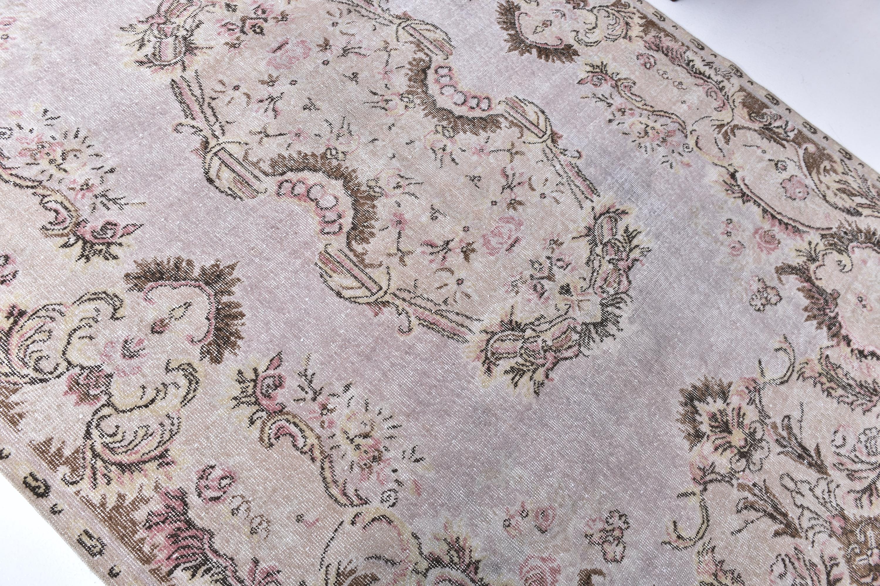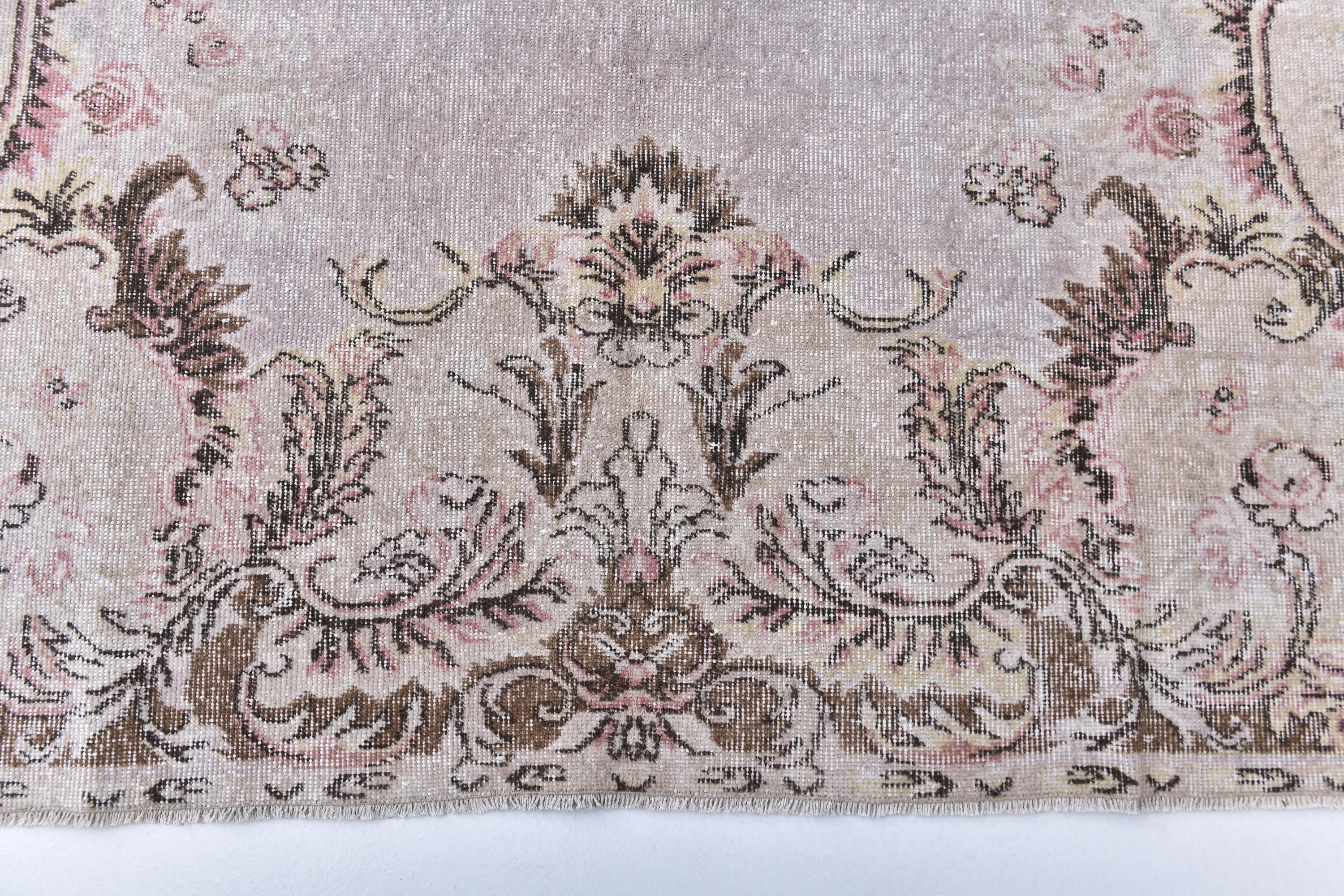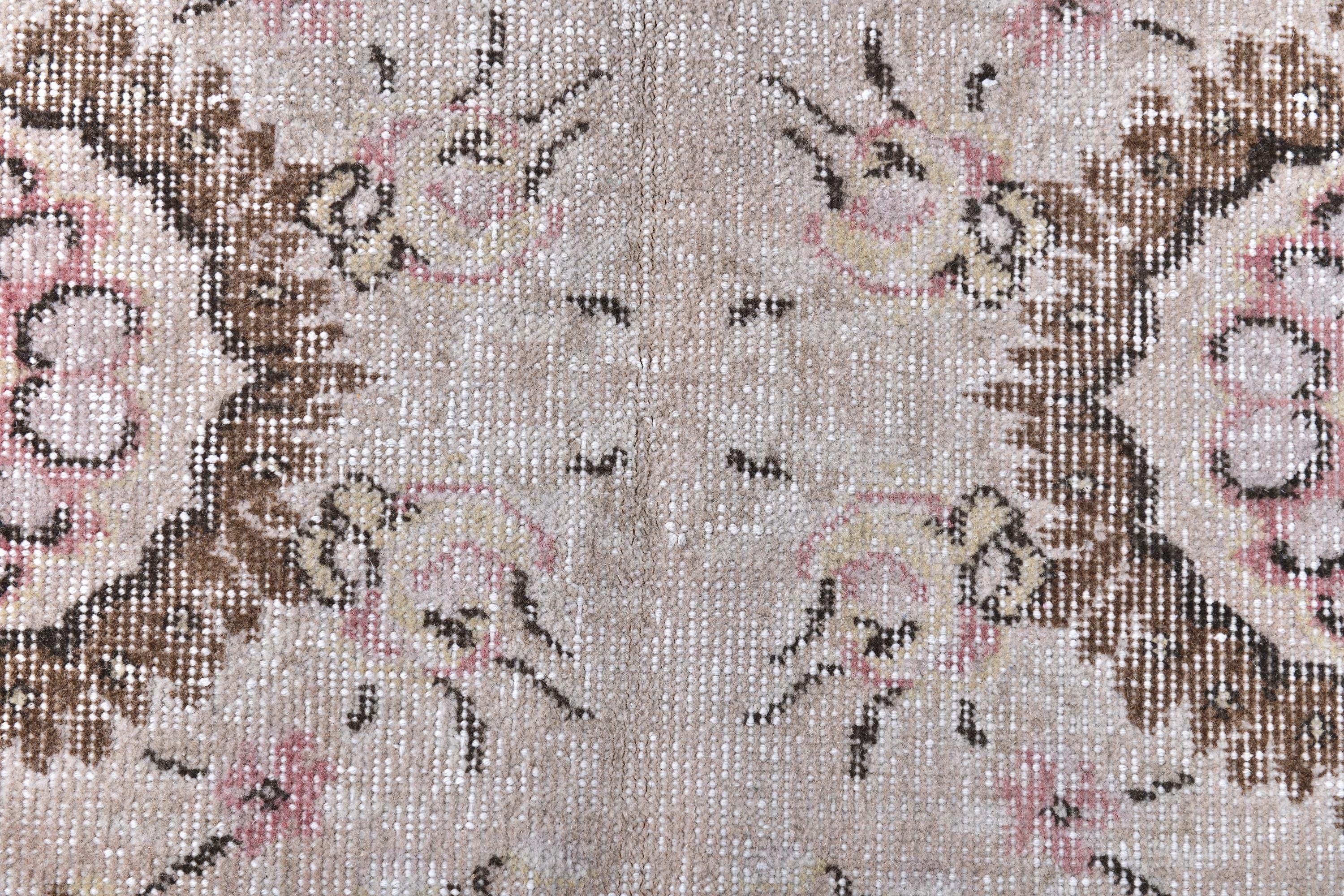 📜📌A vintage distressed Turkish Oushak area rug featuring an elegant central medallion design on a soft gray background with pink floral accents. The hand-knotted wool carpet displays ornate rococo-style cartouches with scrolling botanical motifs in muted brown, pink, beige, and cream tones. Multiple decorative corners showcase elaborate floral sprays with C-scroll frames, creating a romantic shabby chic aesthetic with authentic patina and worn texture.