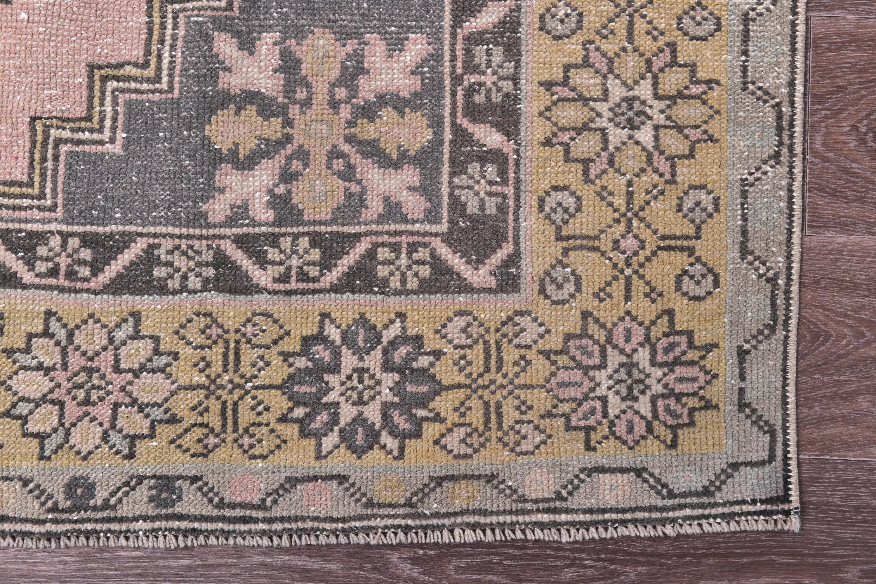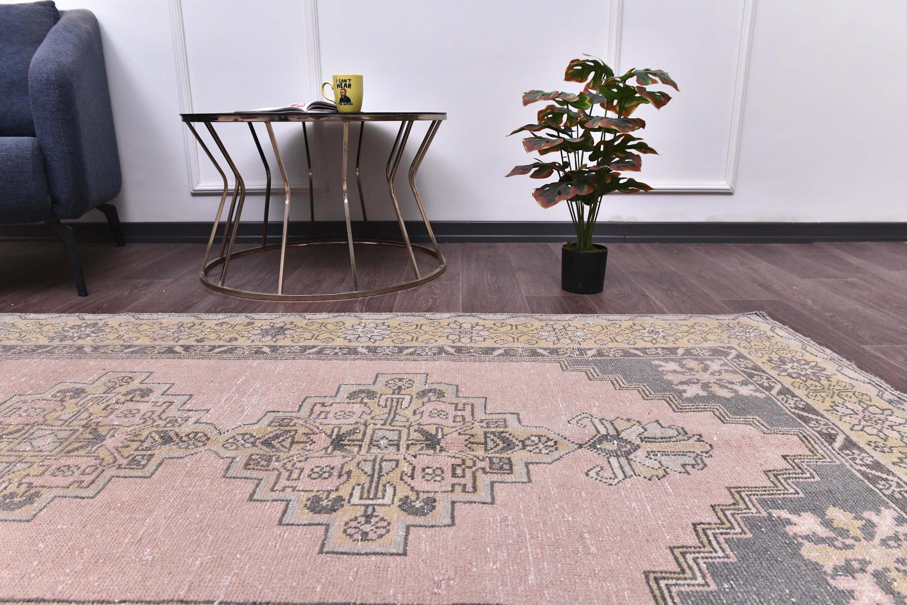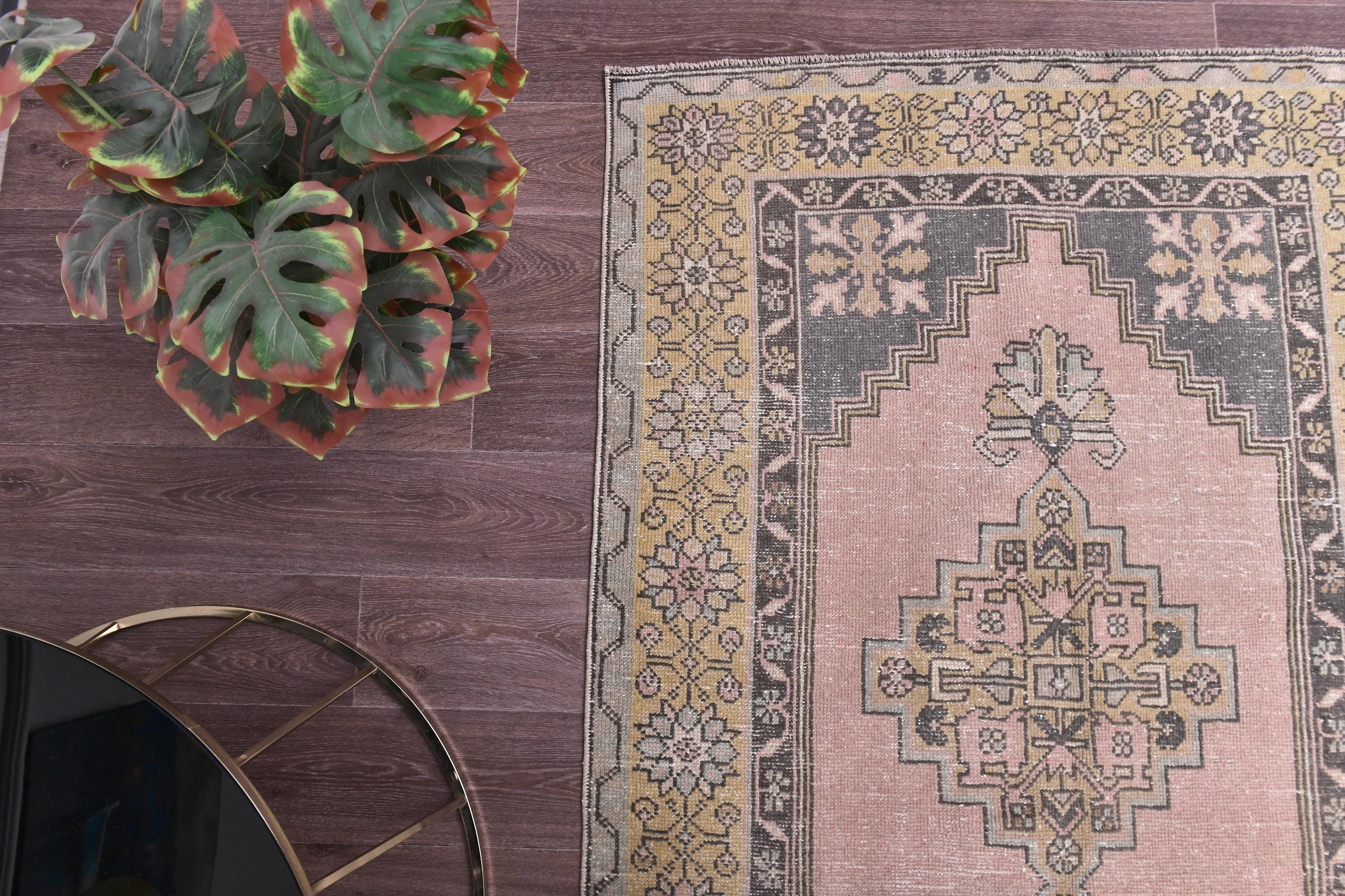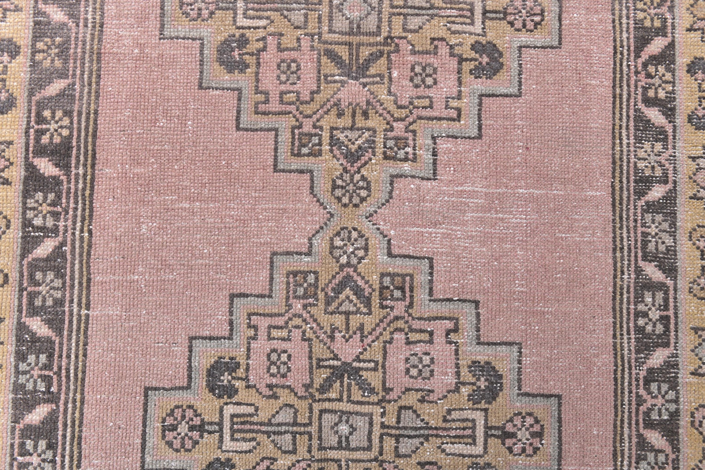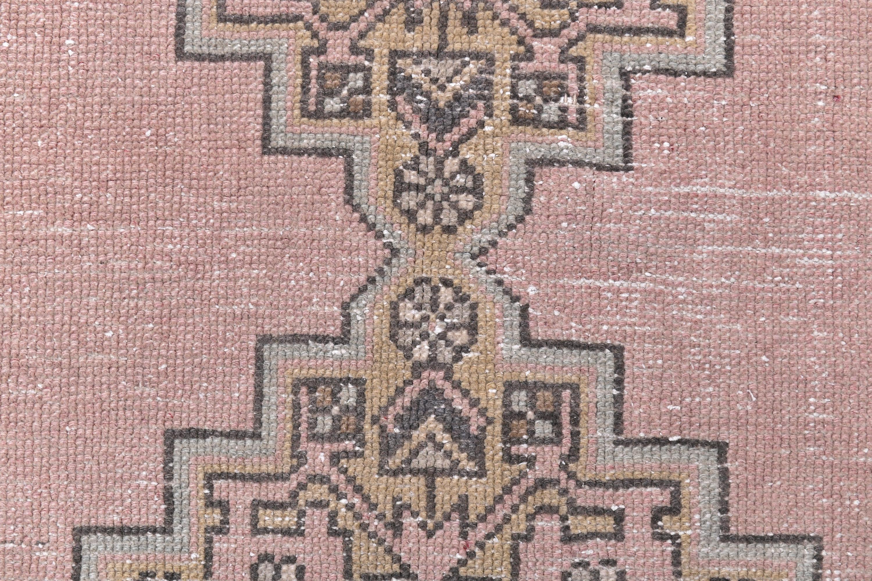 📜📌 Vintage Turkish area rug featuring a bold geometric star medallion on a vibrant coral-salmon field. The hand-knotted wool carpet displays intricate tribal motifs with charcoal gray, olive green, and peachy tones. Decorative zigzag borders frame the central design, complemented by wide floral-patterned side borders in muted olive and cream. The low-pile weave shows authentic vintage wear and natural patina, perfect for small spaces and bohemian interiors.