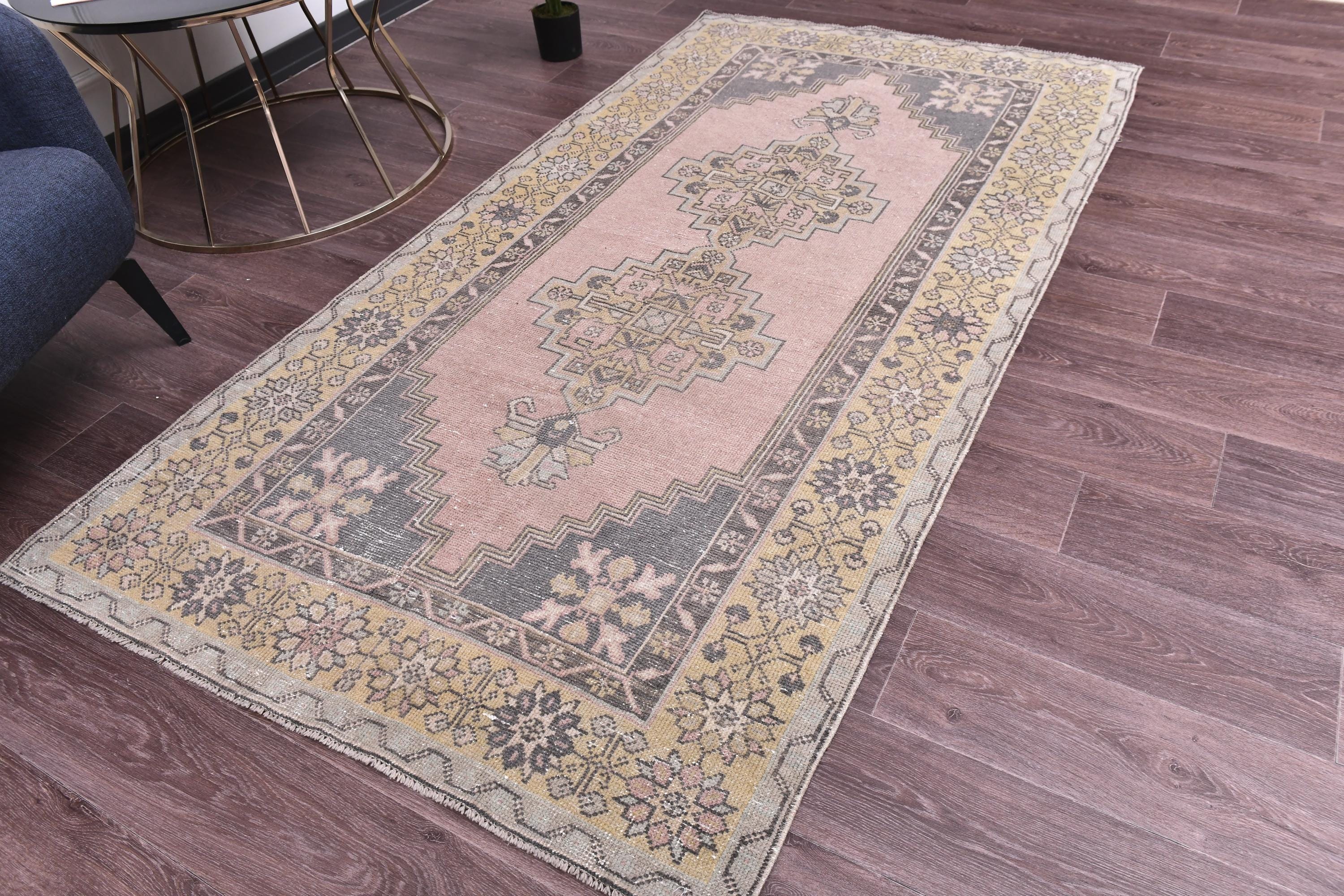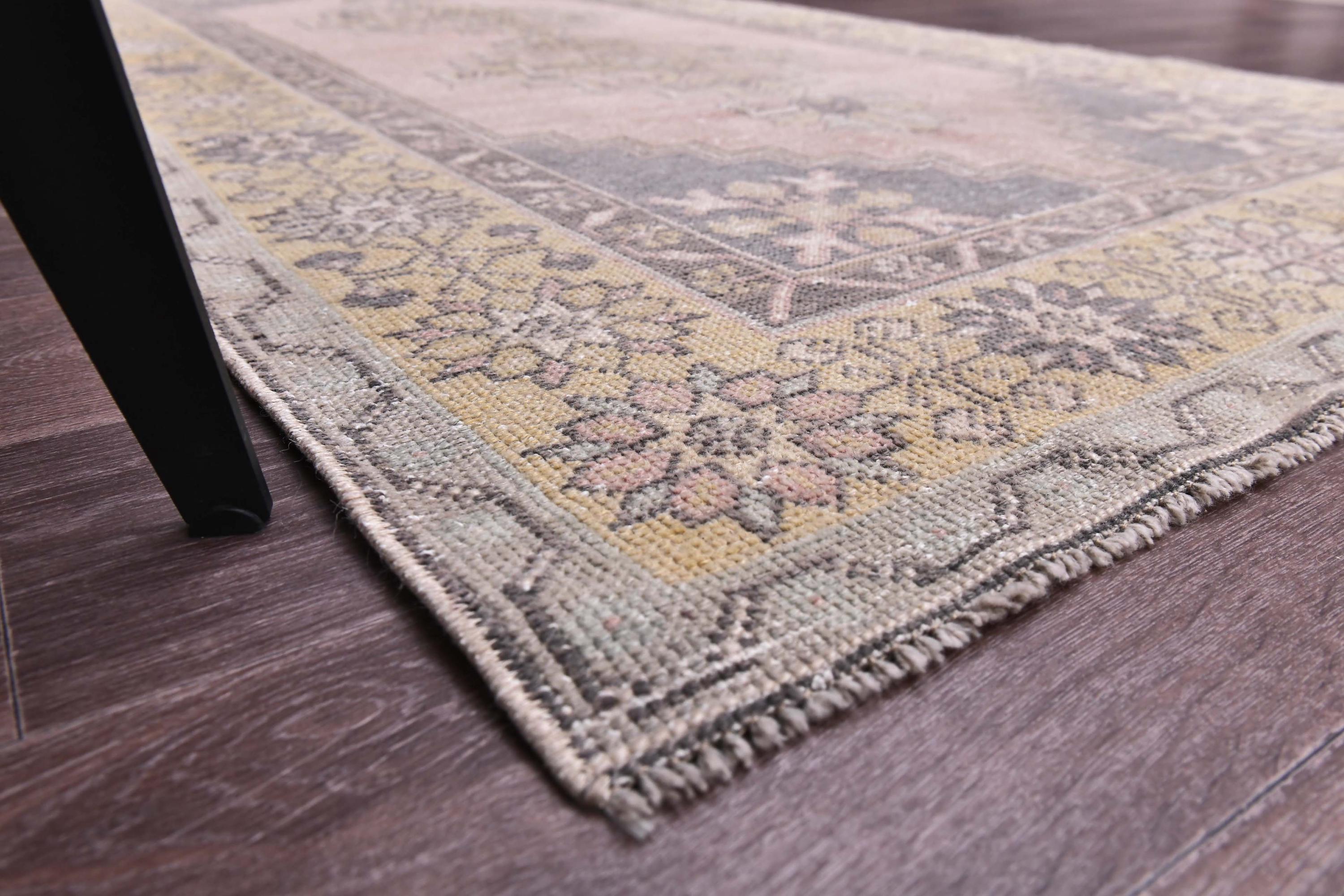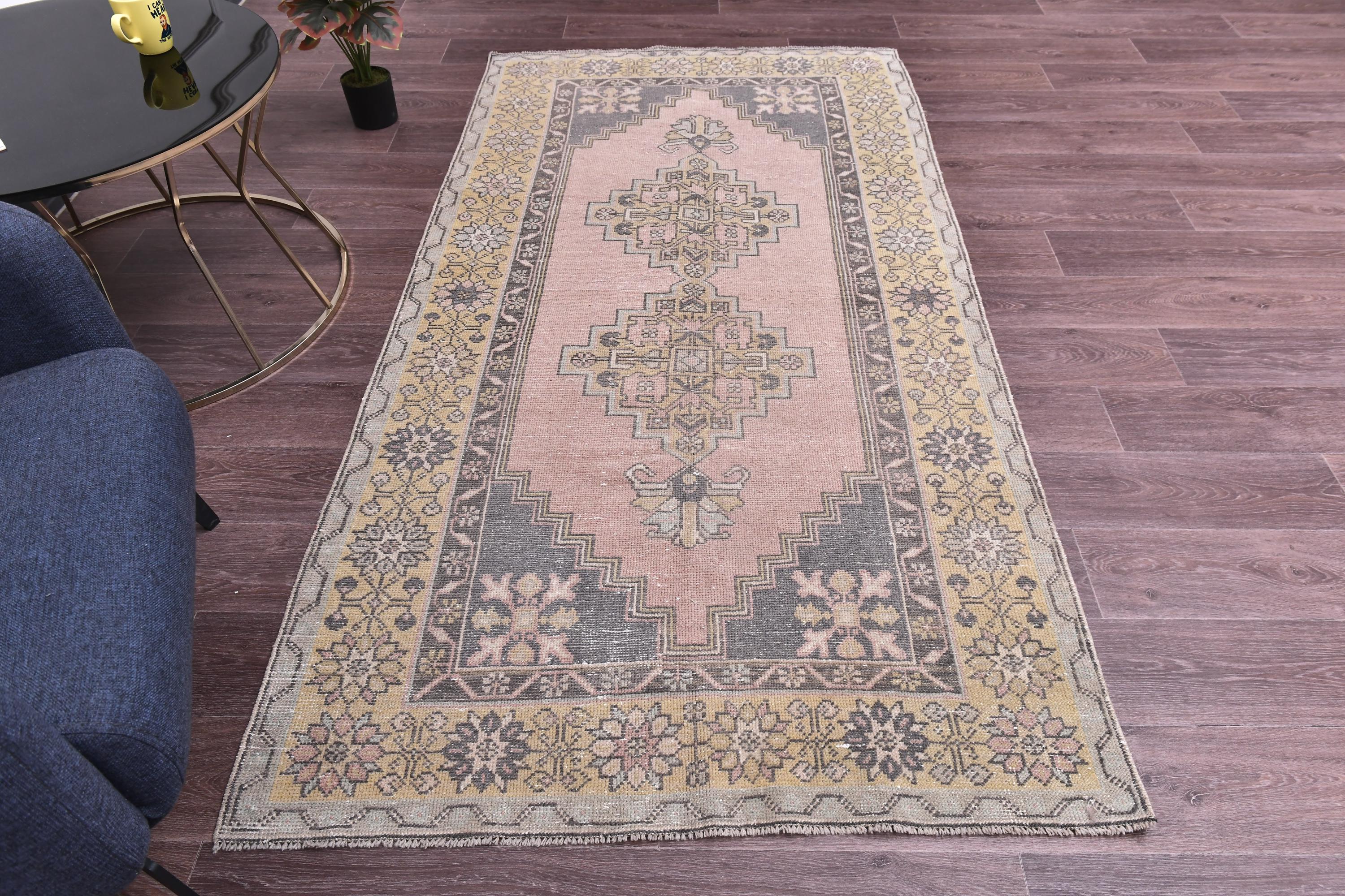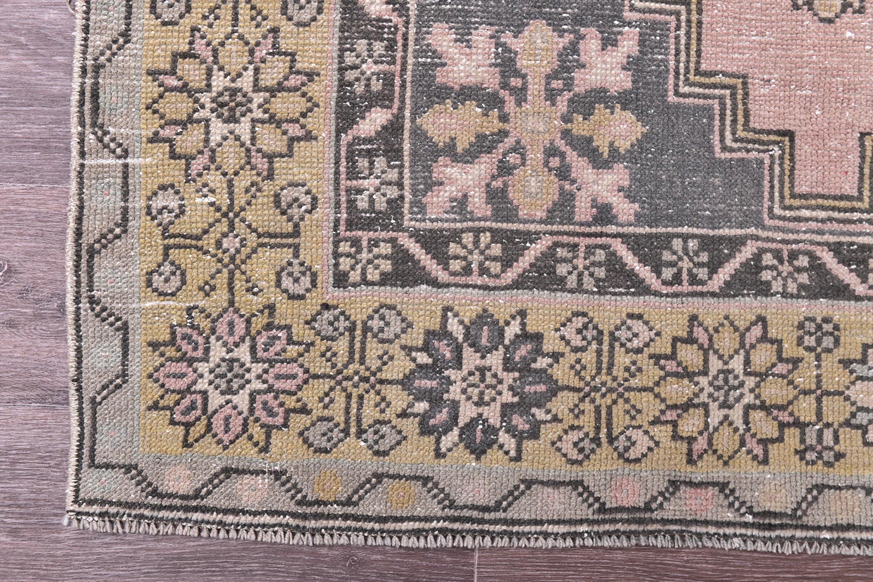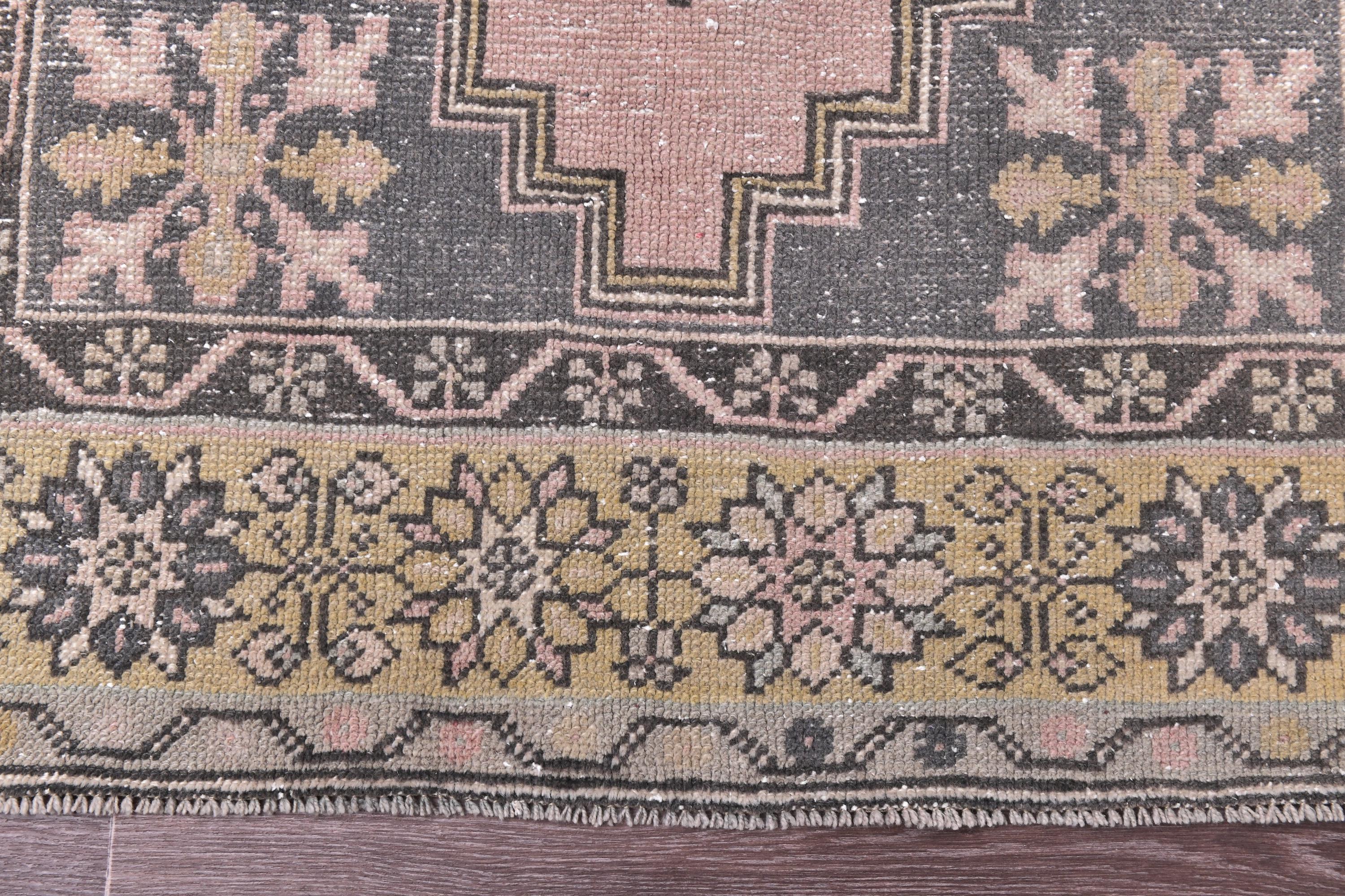 📜📌 Vintage Turkish area rug featuring a bold geometric star medallion on a vibrant coral-salmon field. The hand-knotted wool carpet displays intricate tribal motifs with charcoal gray, olive green, and peachy tones. Decorative zigzag borders frame the central design, complemented by wide floral-patterned side borders in muted olive and cream. The low-pile weave shows authentic vintage wear and natural patina, perfect for small spaces and bohemian interiors.
