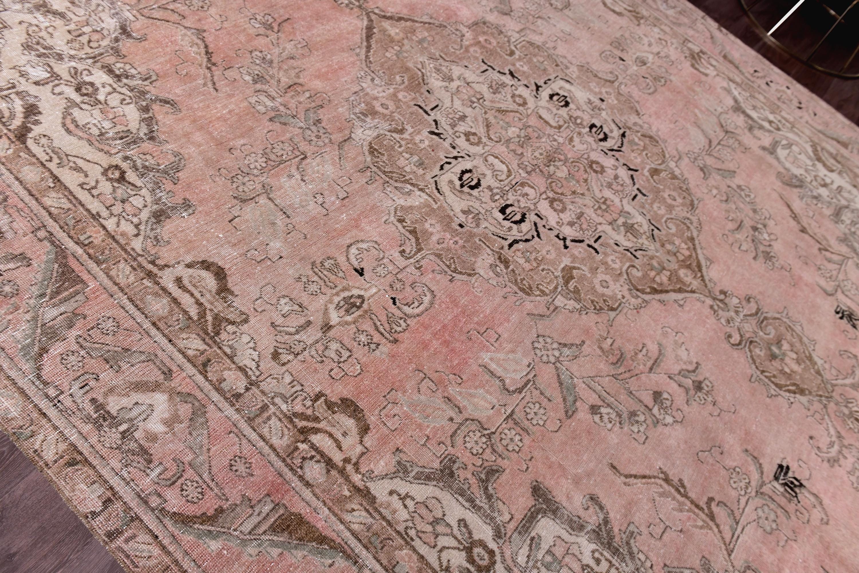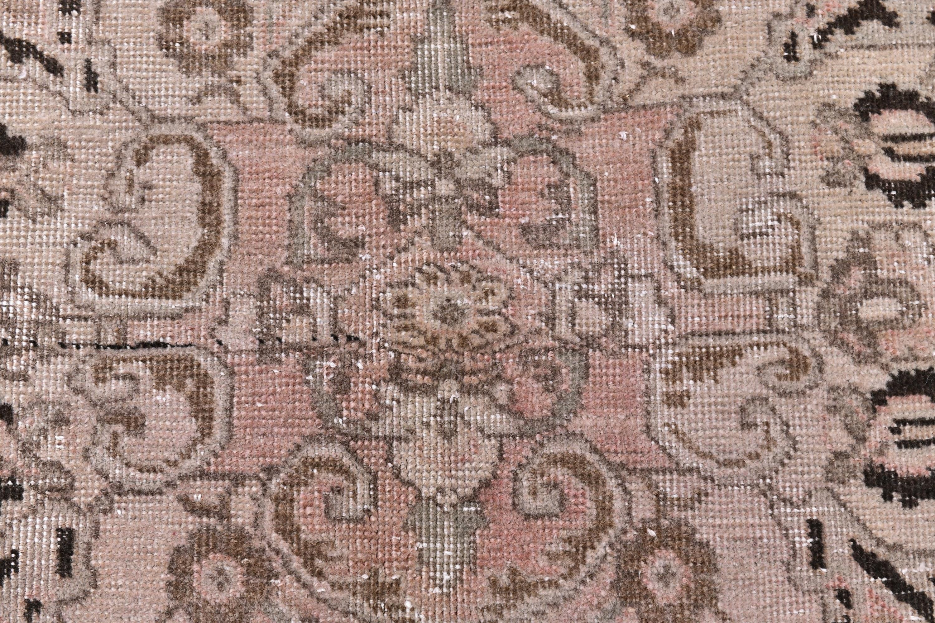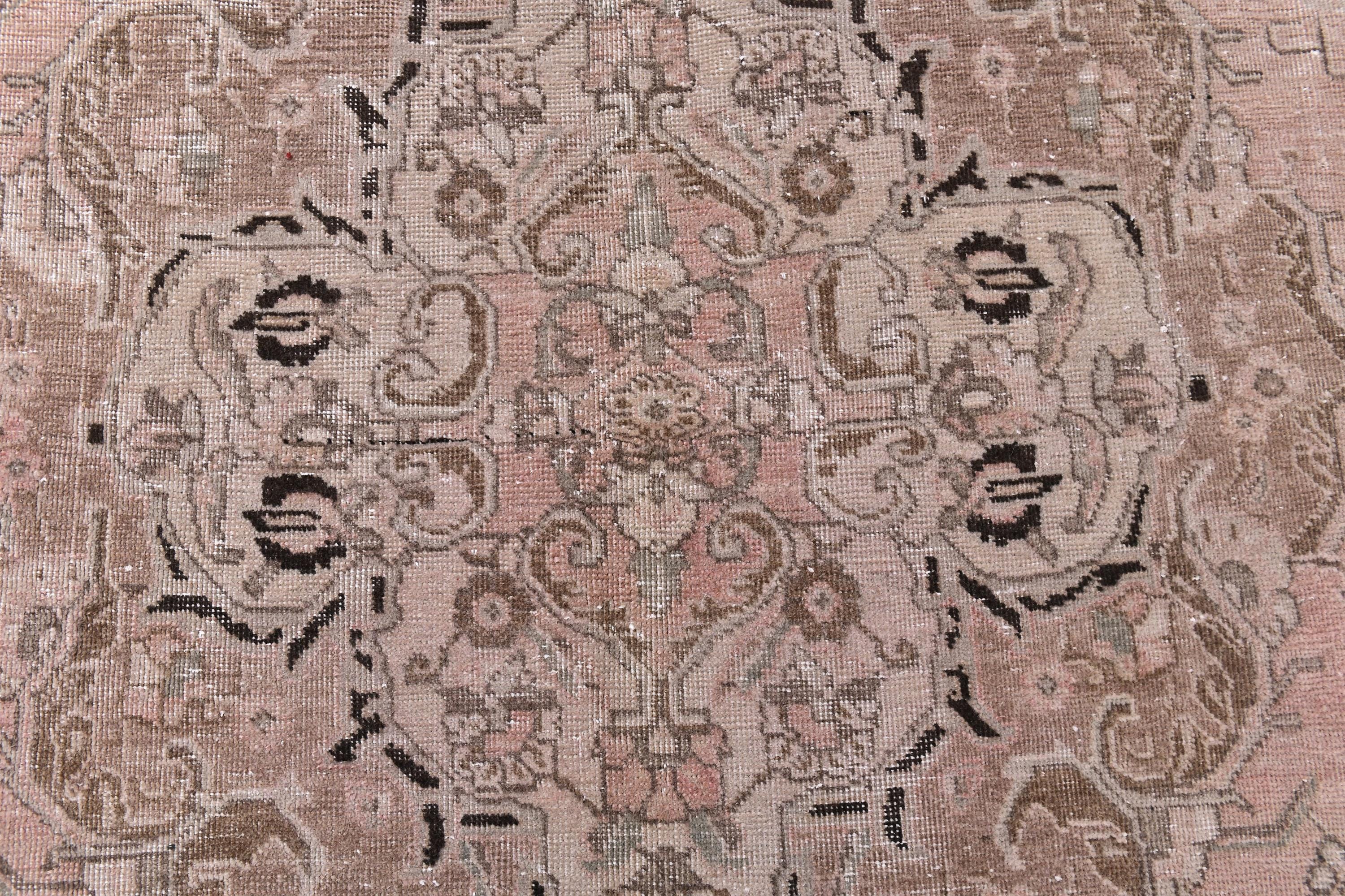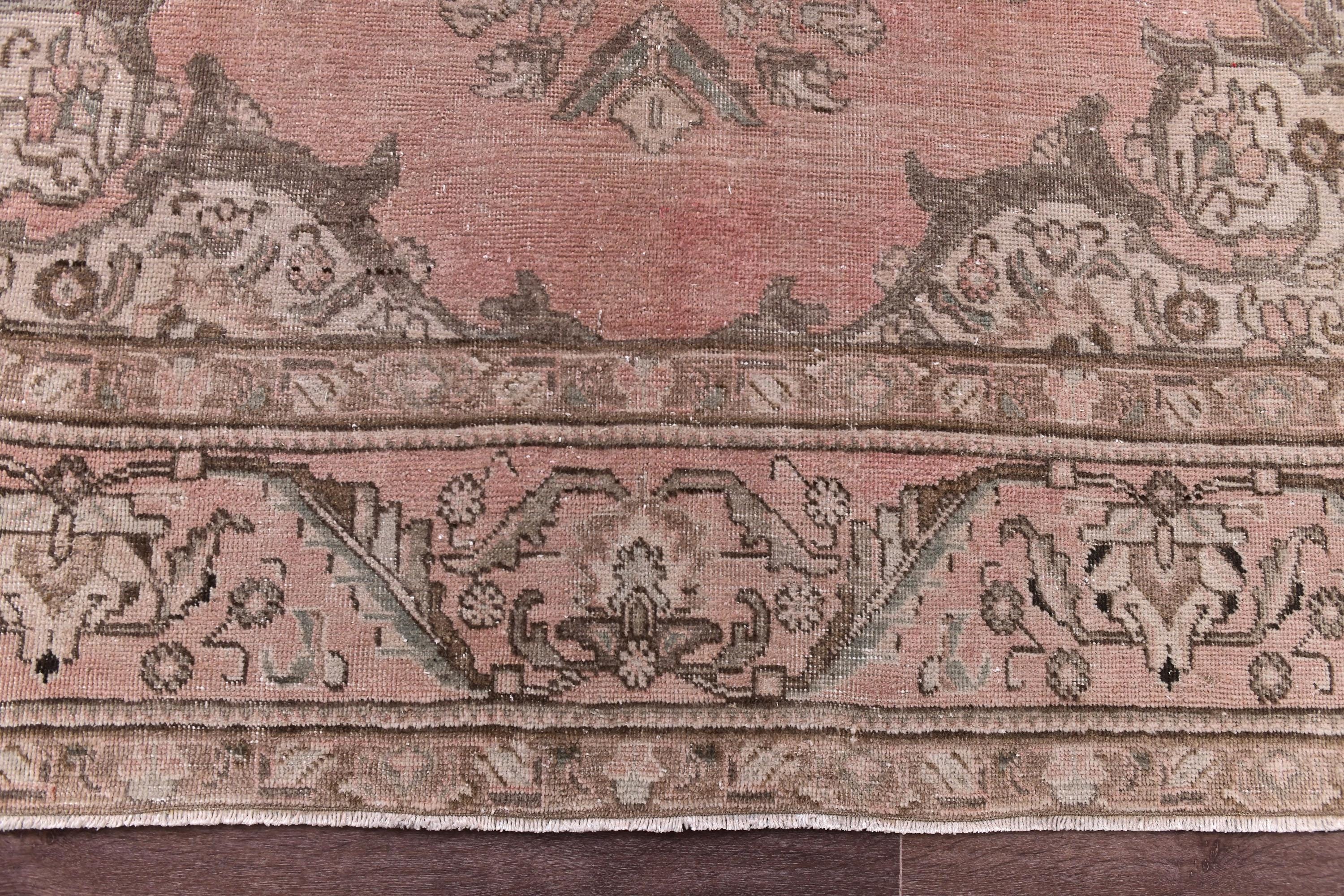 📜📌 Vintage Persian area rug featuring soft blush pink field with faded beige and taupe floral medallion in center, ornate botanical borders with distressed patina, hand-knotted wool construction showing authentic aged character and muted pastel tones