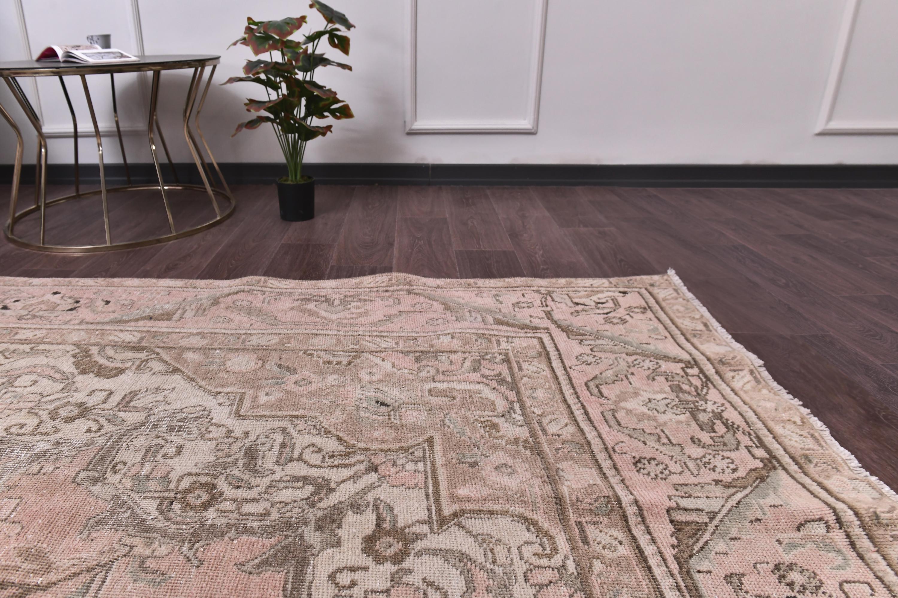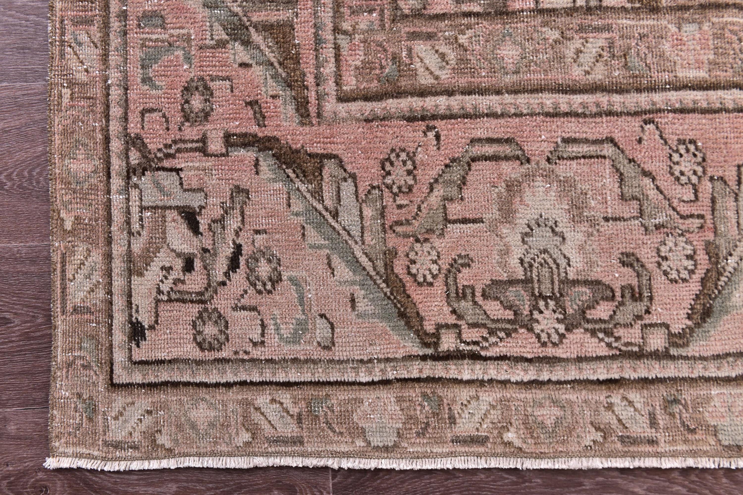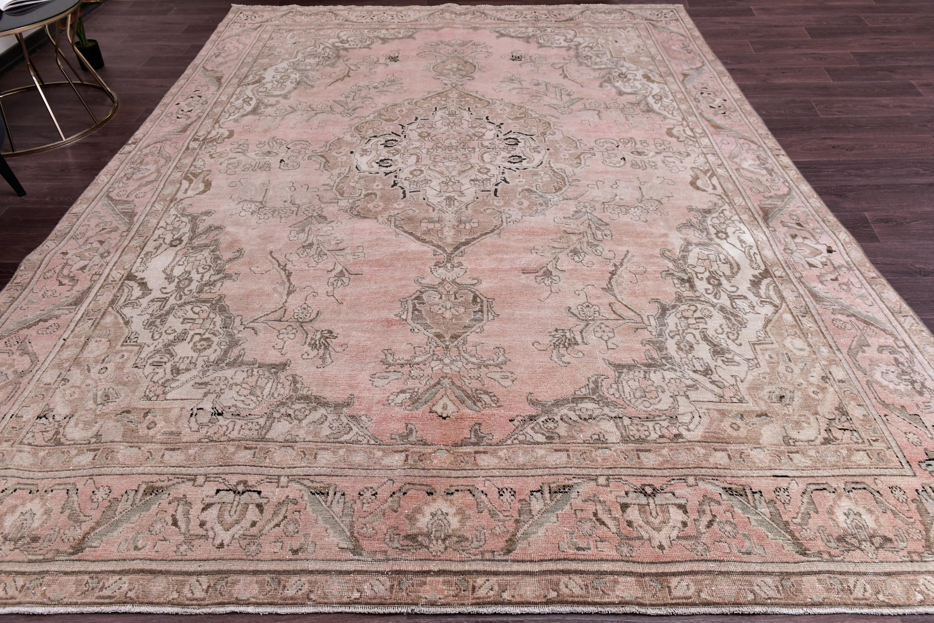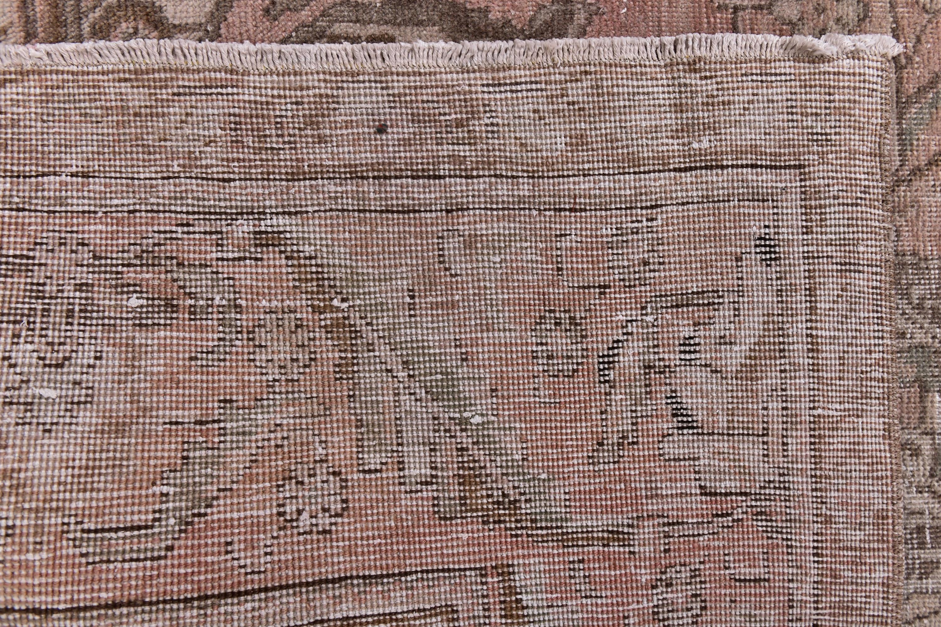 📜📌 Vintage Persian area rug featuring soft blush pink field with faded beige and taupe floral medallion in center, ornate botanical borders with distressed patina, hand-knotted wool construction showing authentic aged character and muted pastel tones