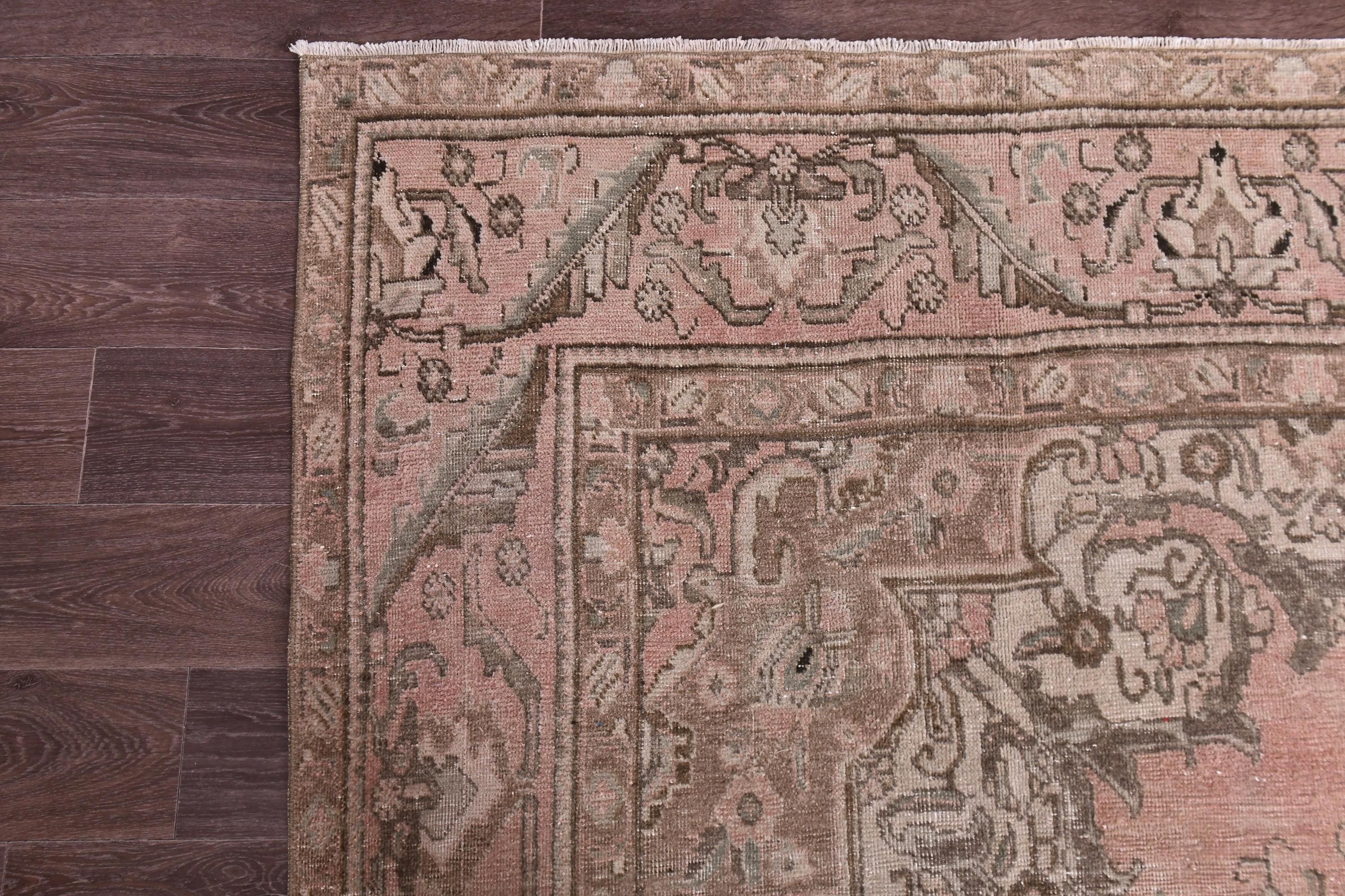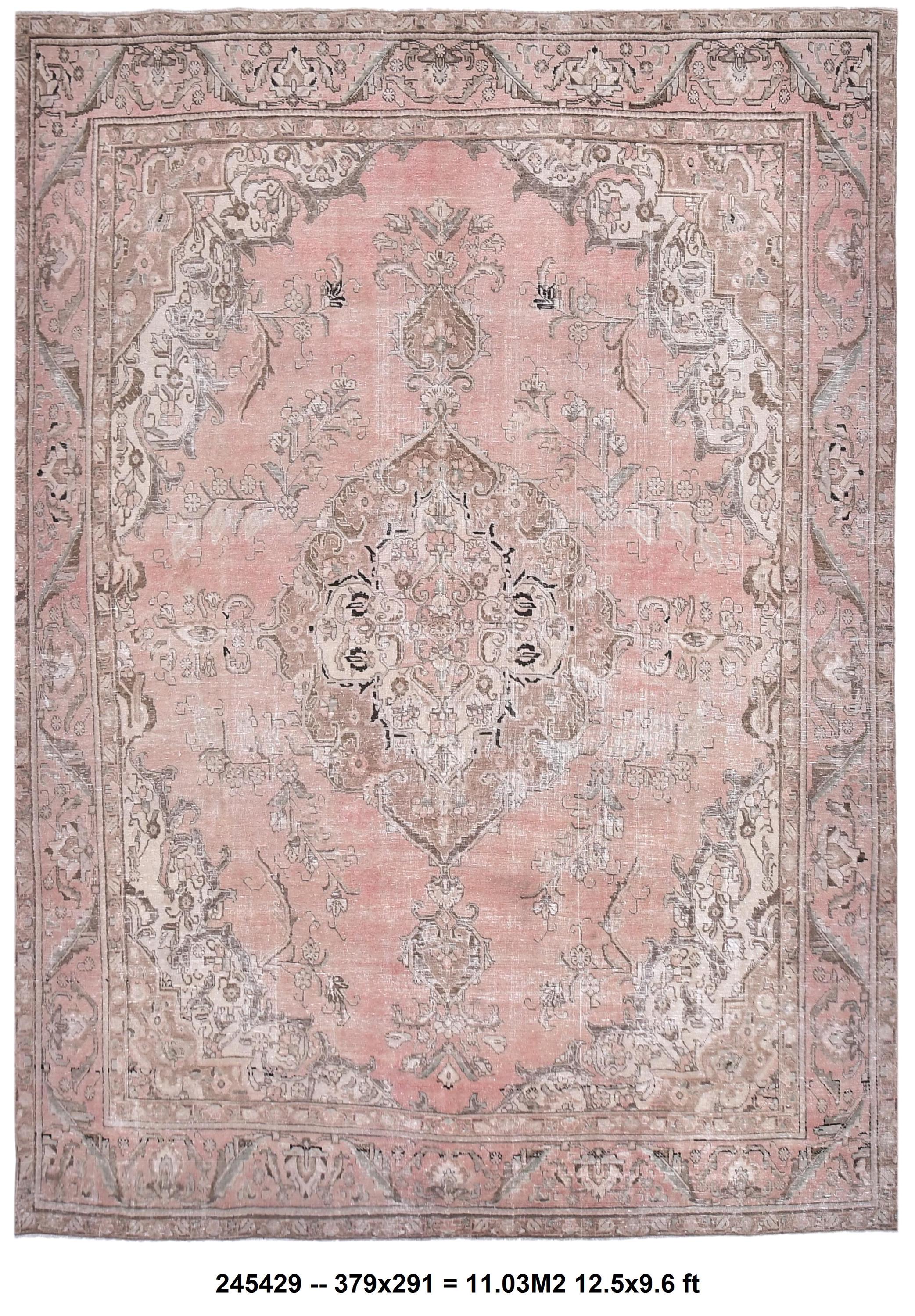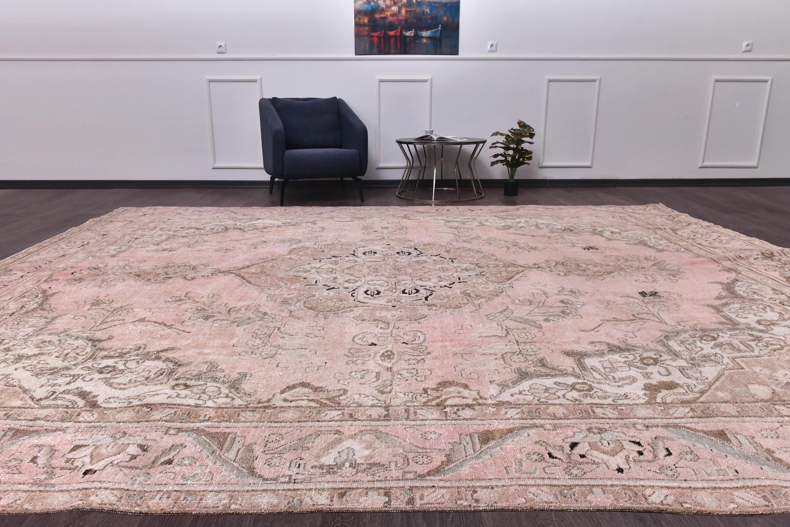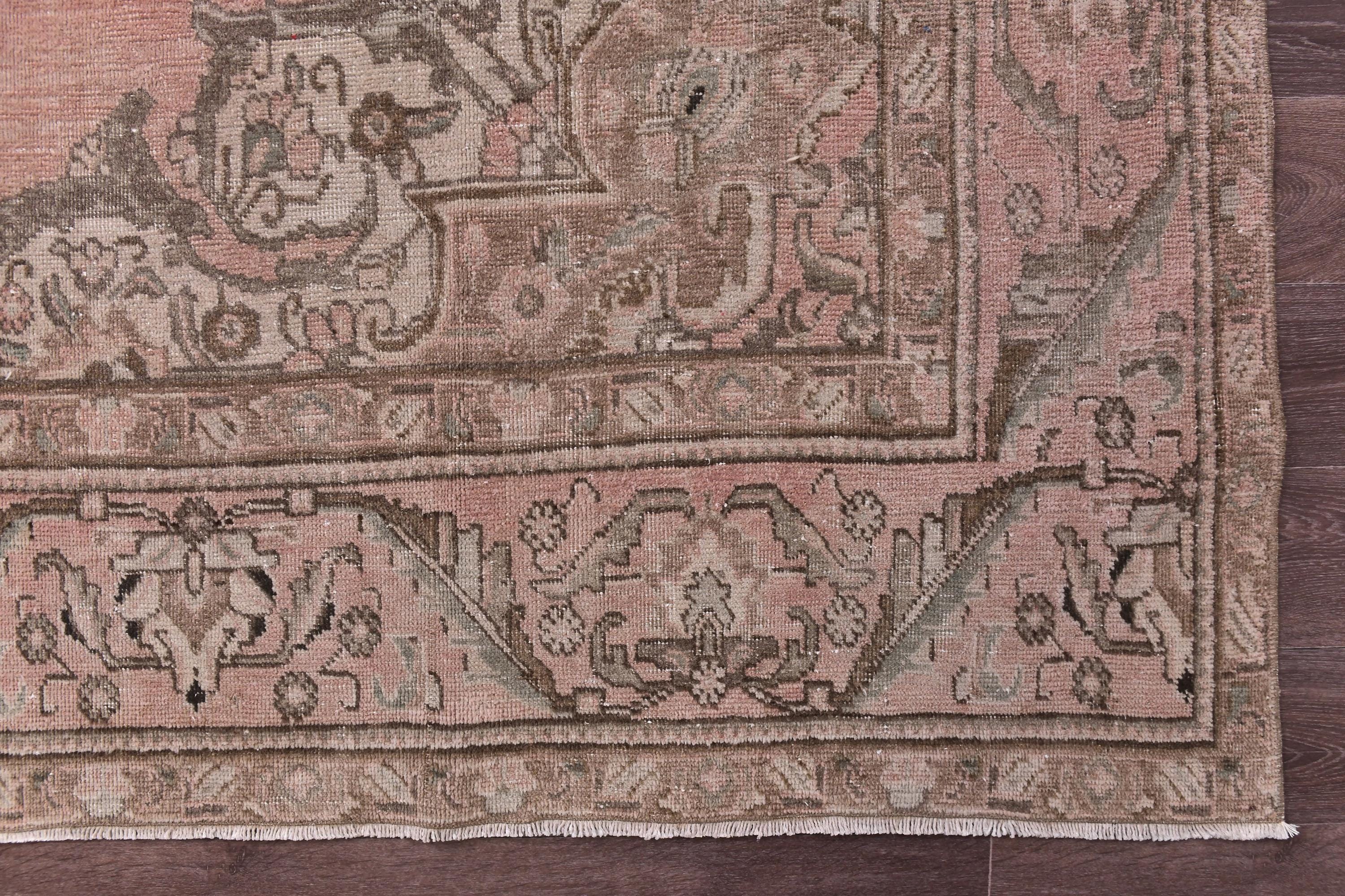📜📌 Vintage Persian area rug featuring soft blush pink field with faded beige and taupe floral medallion in center, ornate botanical borders with distressed patina, hand-knotted wool construction showing authentic aged character and muted pastel tones